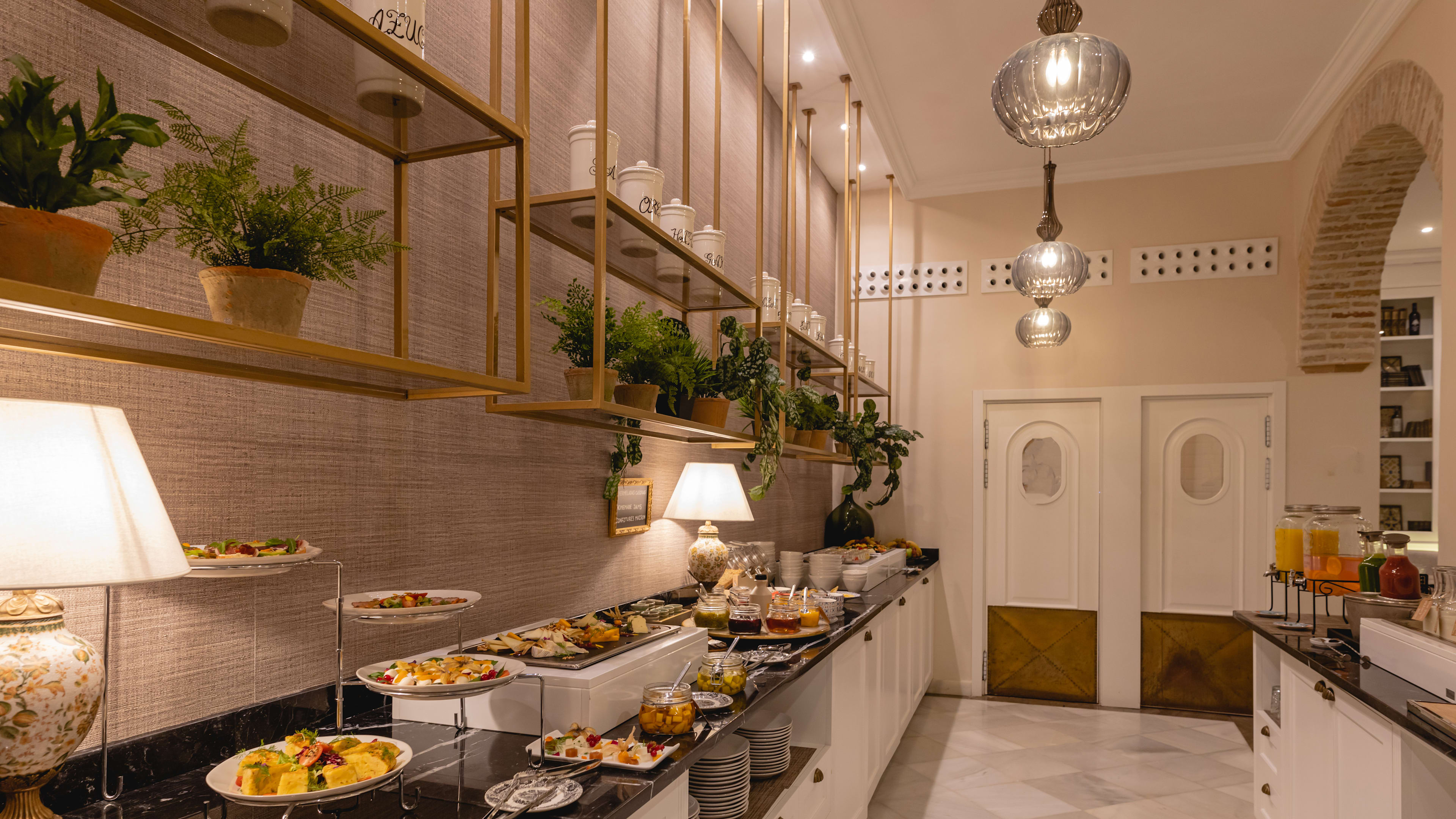Bench-lined tables set against the far wall offer stone arch-framed views back into the breakfast room.