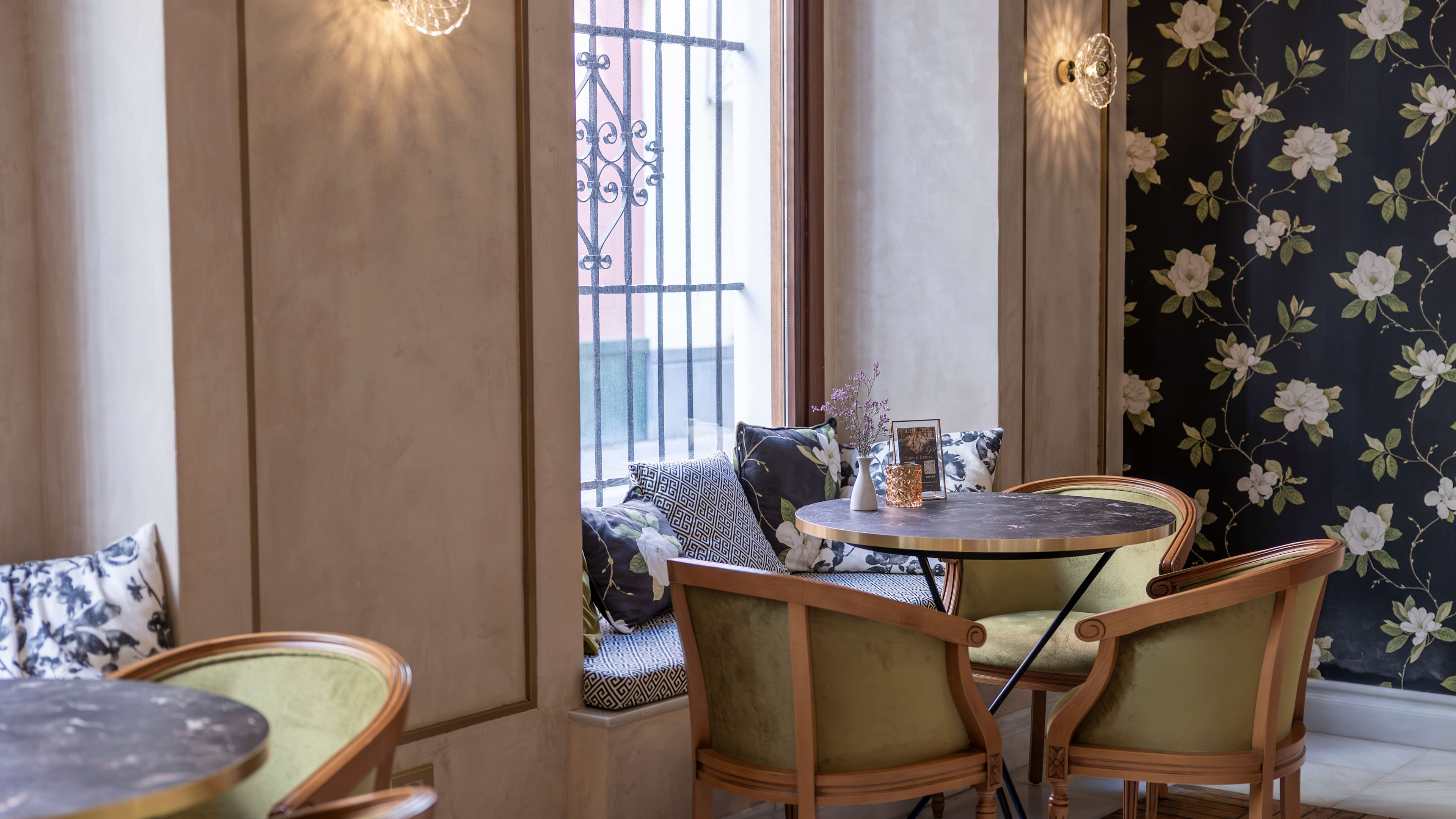 Jade-velvet tub chairs and marble-top tables line up neatly in Bar 51 beside the lobby. An all-day refuge, it serves café and pastries, plus wine, spirits, beer and a small selection of tapas.