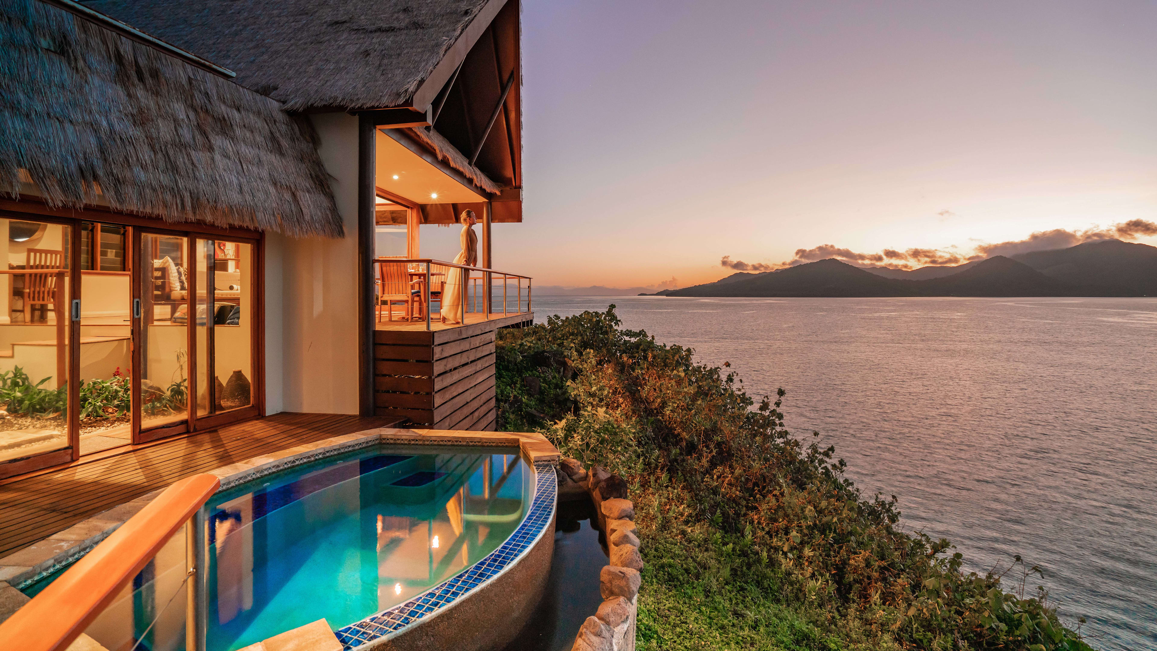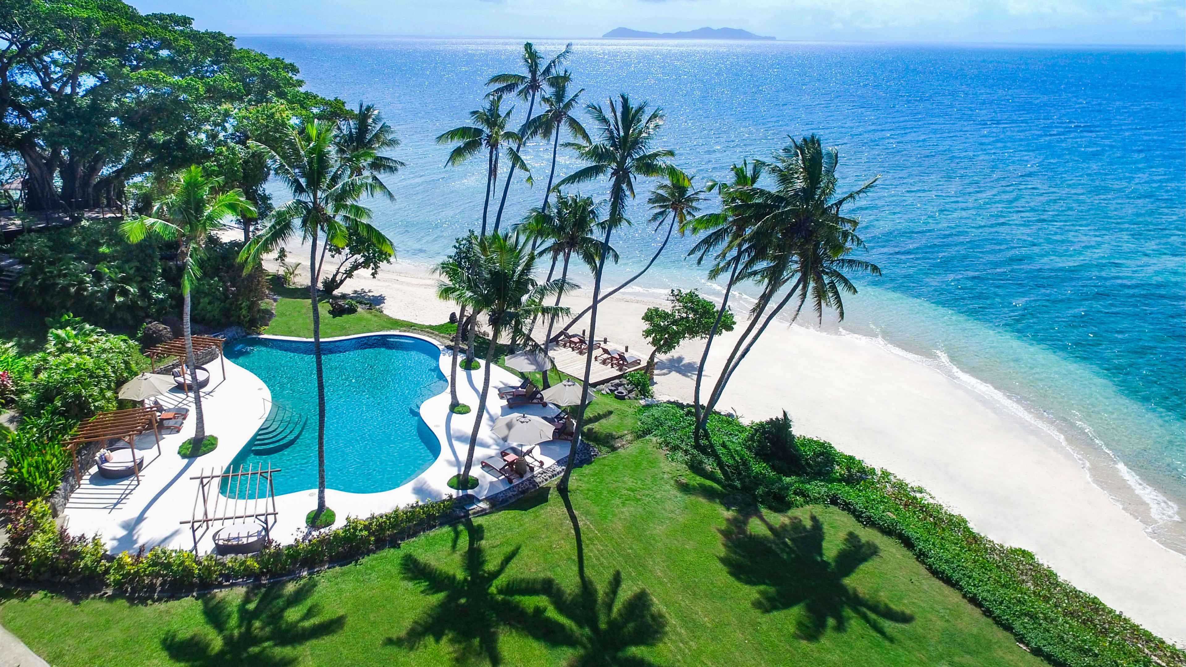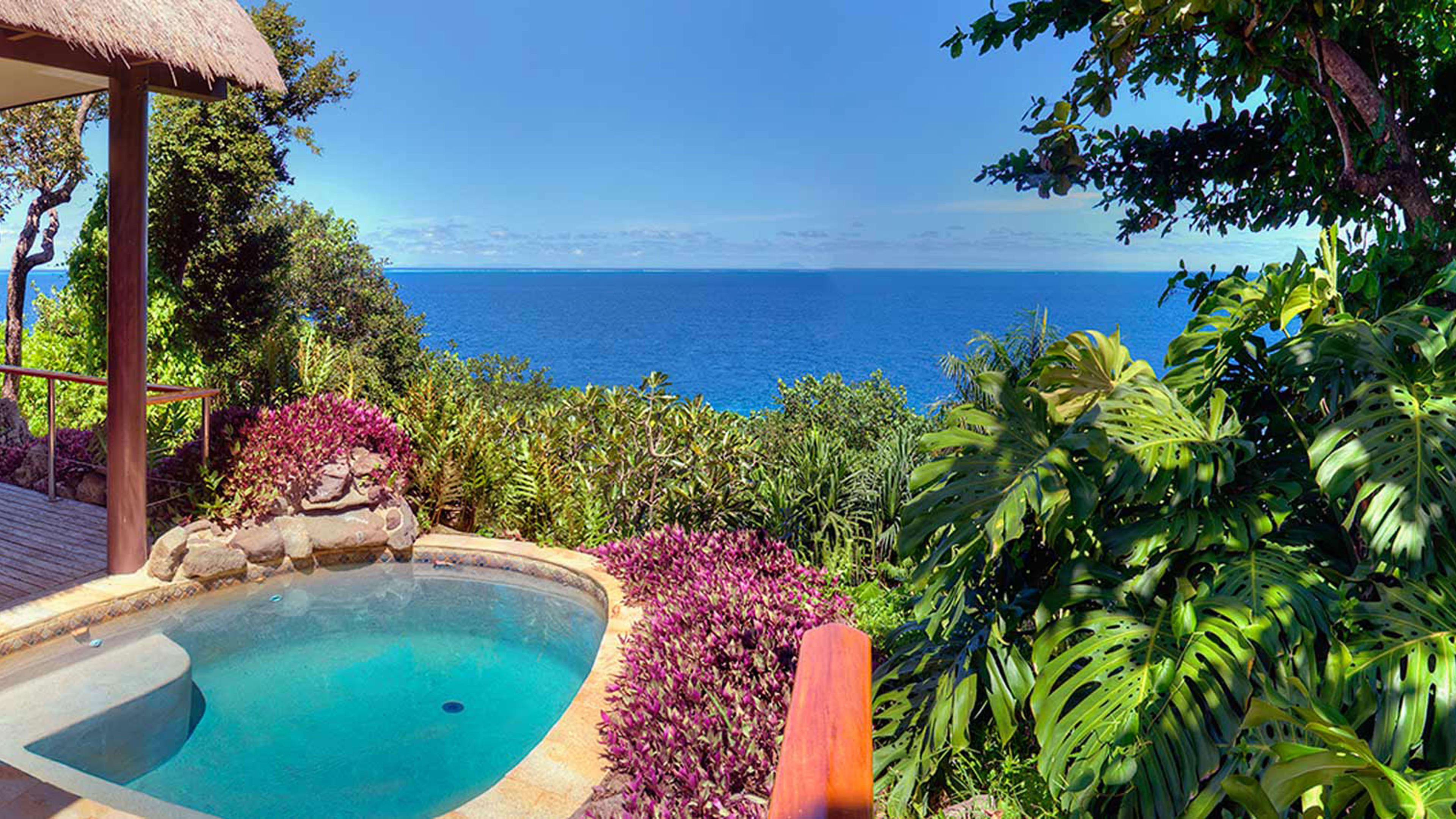 Spa, watersports centre with dive shop, CD and DVD library, boutique, free WiFi in main bar/restaurant and library, gardens. In rooms: iHome music system, pillow menu, minibar with cookies and cakes, Fijian coffee, Jacuzzi spa bath, open-air shower, Pure Fiji toiletries, private deck with plunge pool.