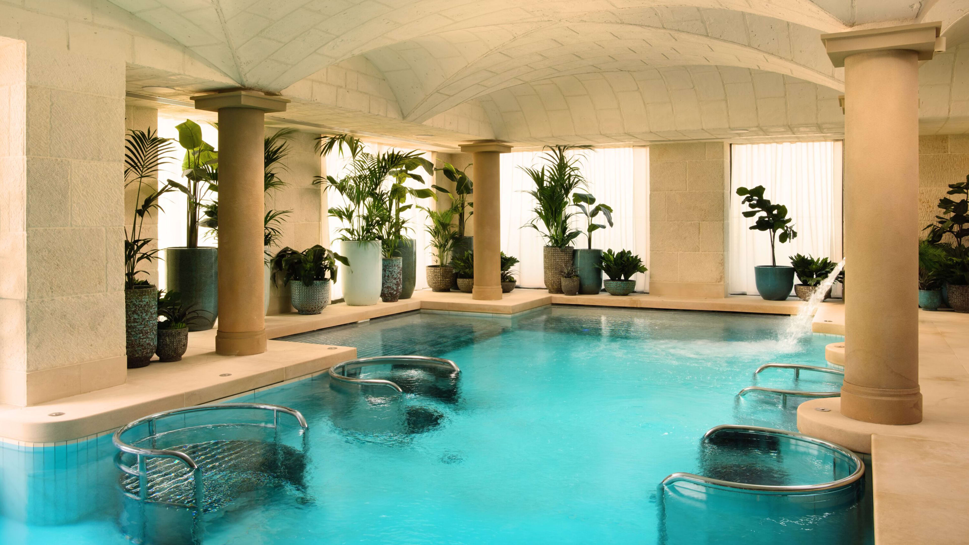 This is no mere pool. It’s more like an enormous Roman bathhouse, thanks to a marble-clad atrium, columns and cloistered ceiling that surround the 18m heated indoor swimming pool lined with heated beds. The second, adults-only pool leads to an outdoor terrace.