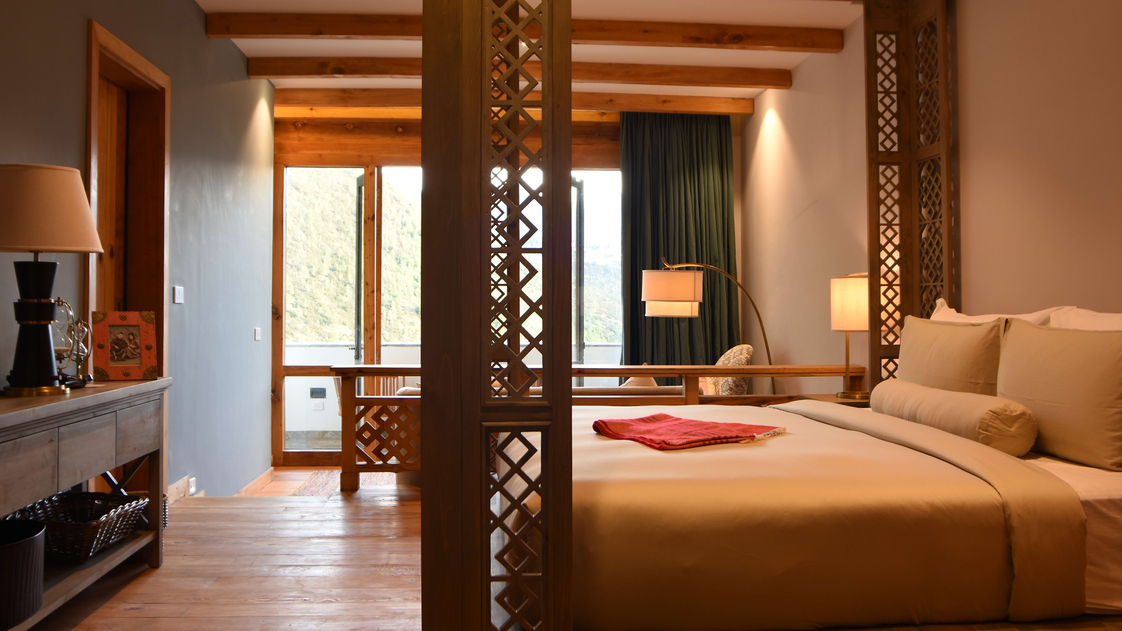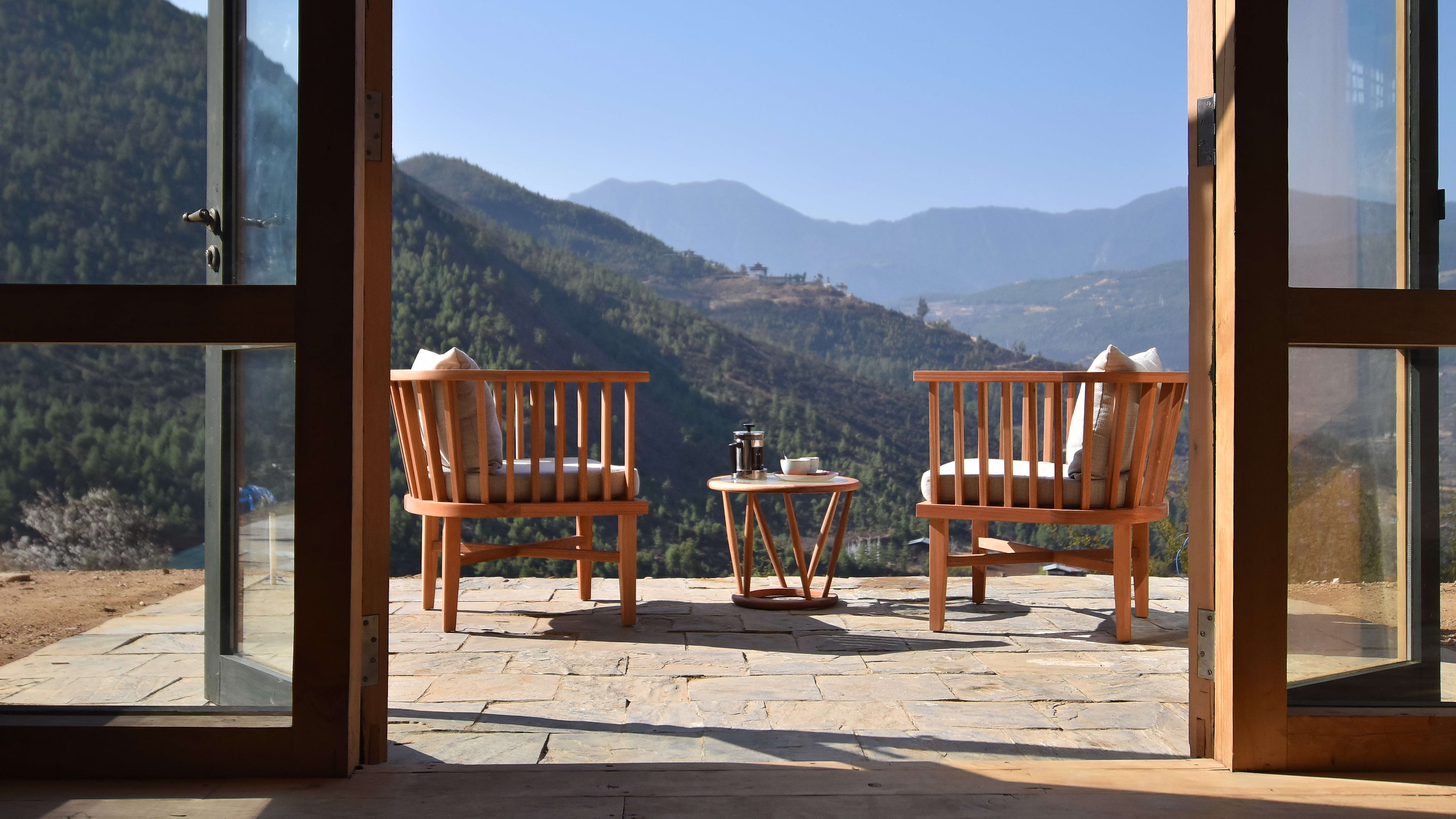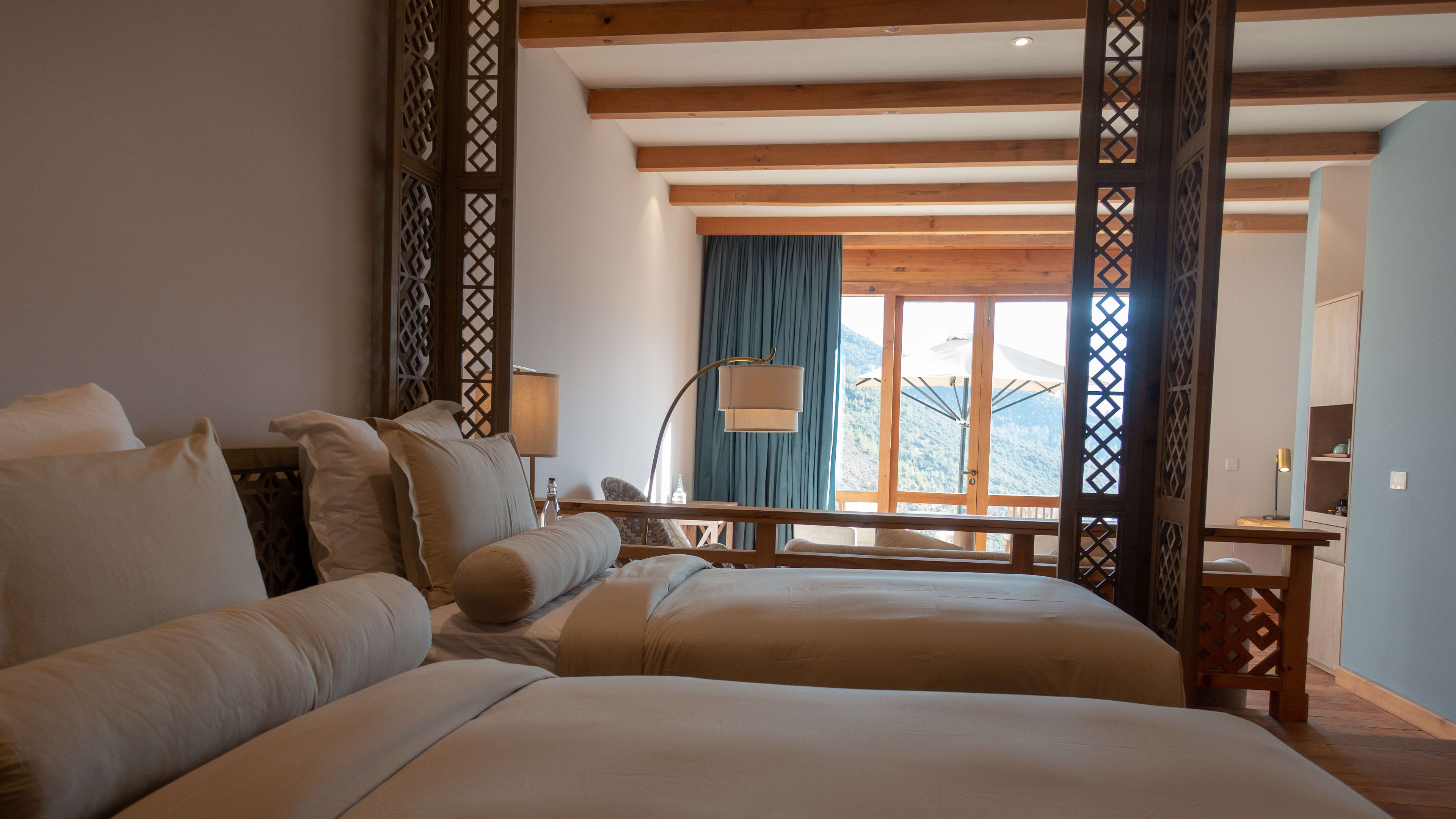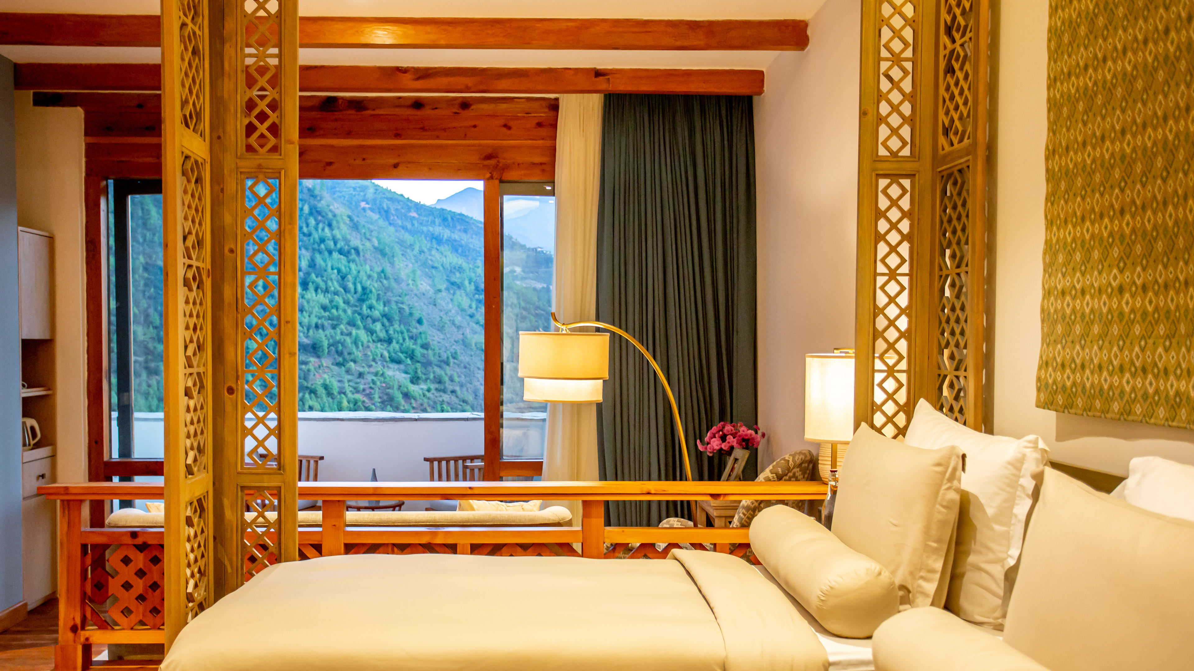 The rooms are full of nods to traditional Bhutanese design – decorative wall hangings, ornate woodwork and cushions dressed in colourful checks and stripes. The furnishings are simple for the most part, but regal touches come in the form of four-poster beds and milky-white marble in the bathroom, which is hidden behind sliding wooden doors. Every room has vast, timber-framed windows with pacifying views of the mountains, opening onto a terrace or balcony (the two namesake room categories).