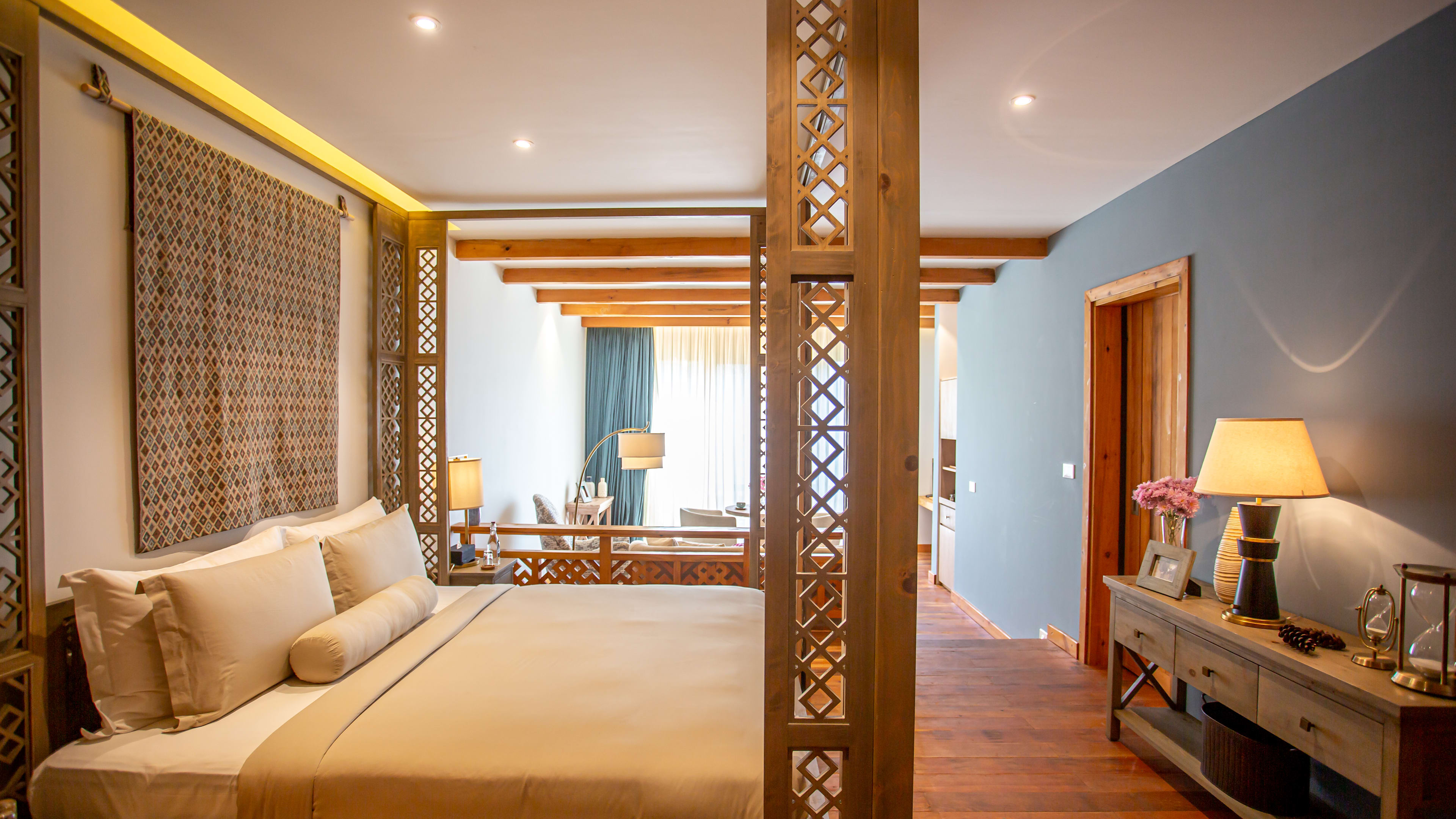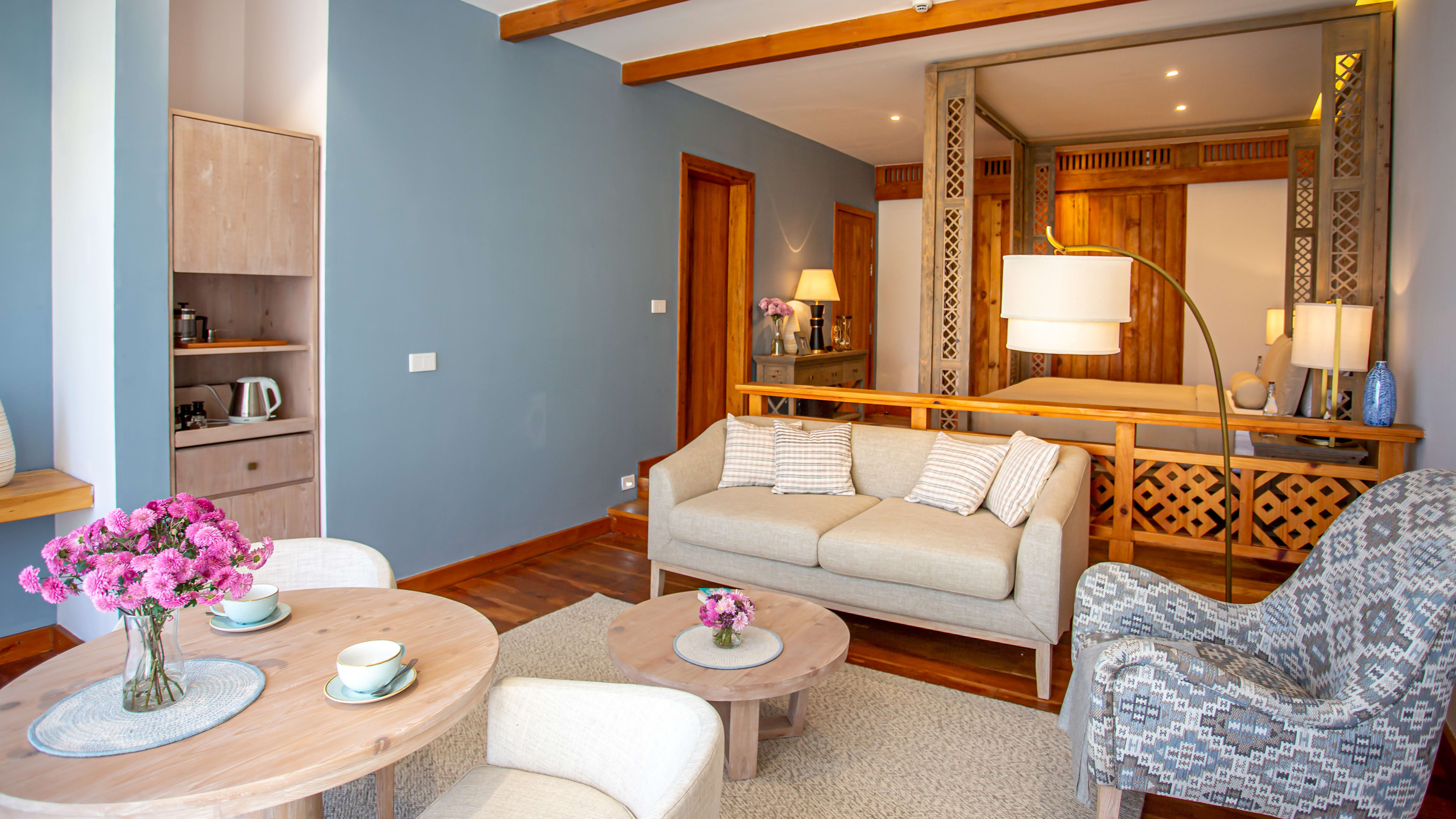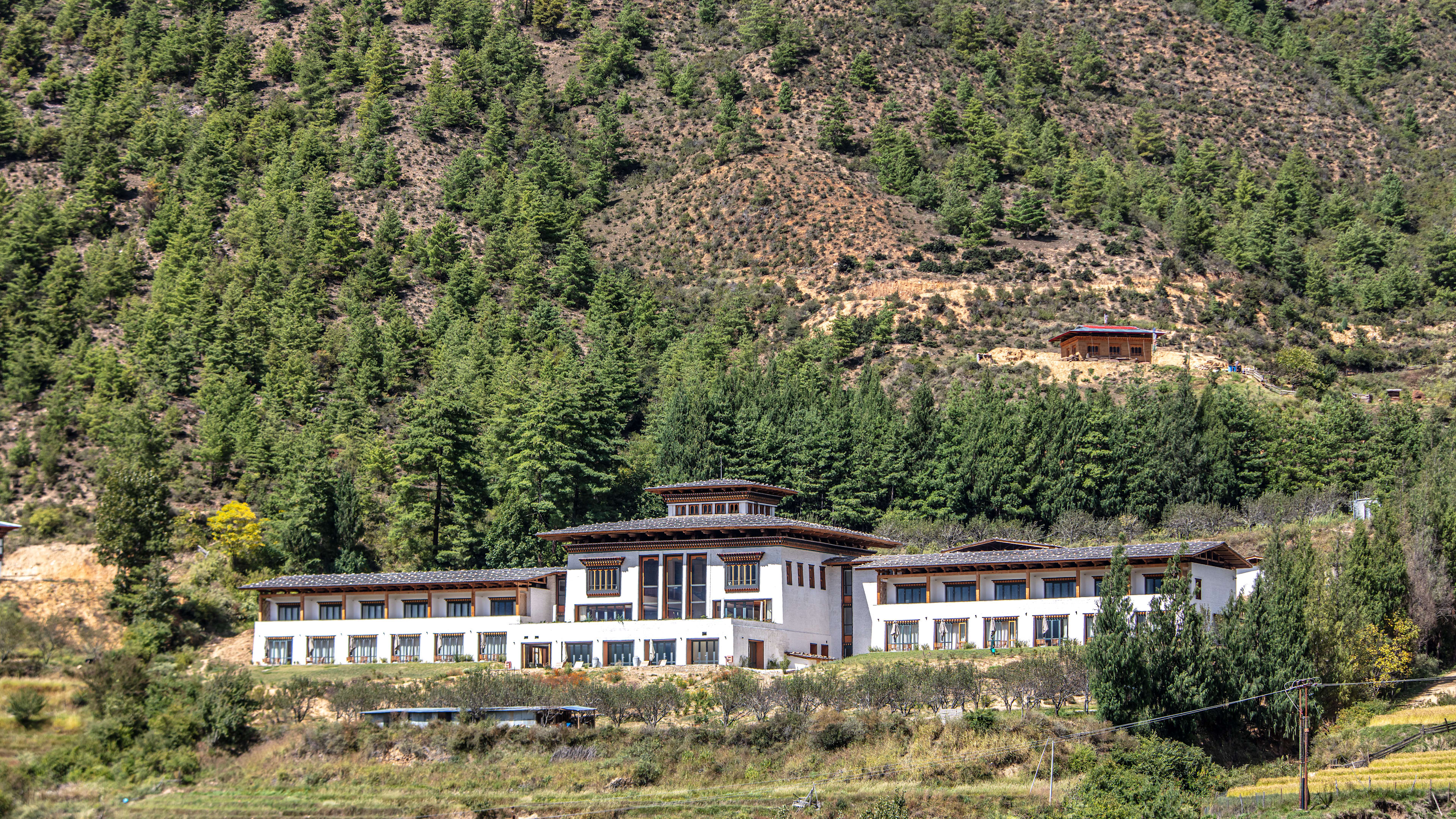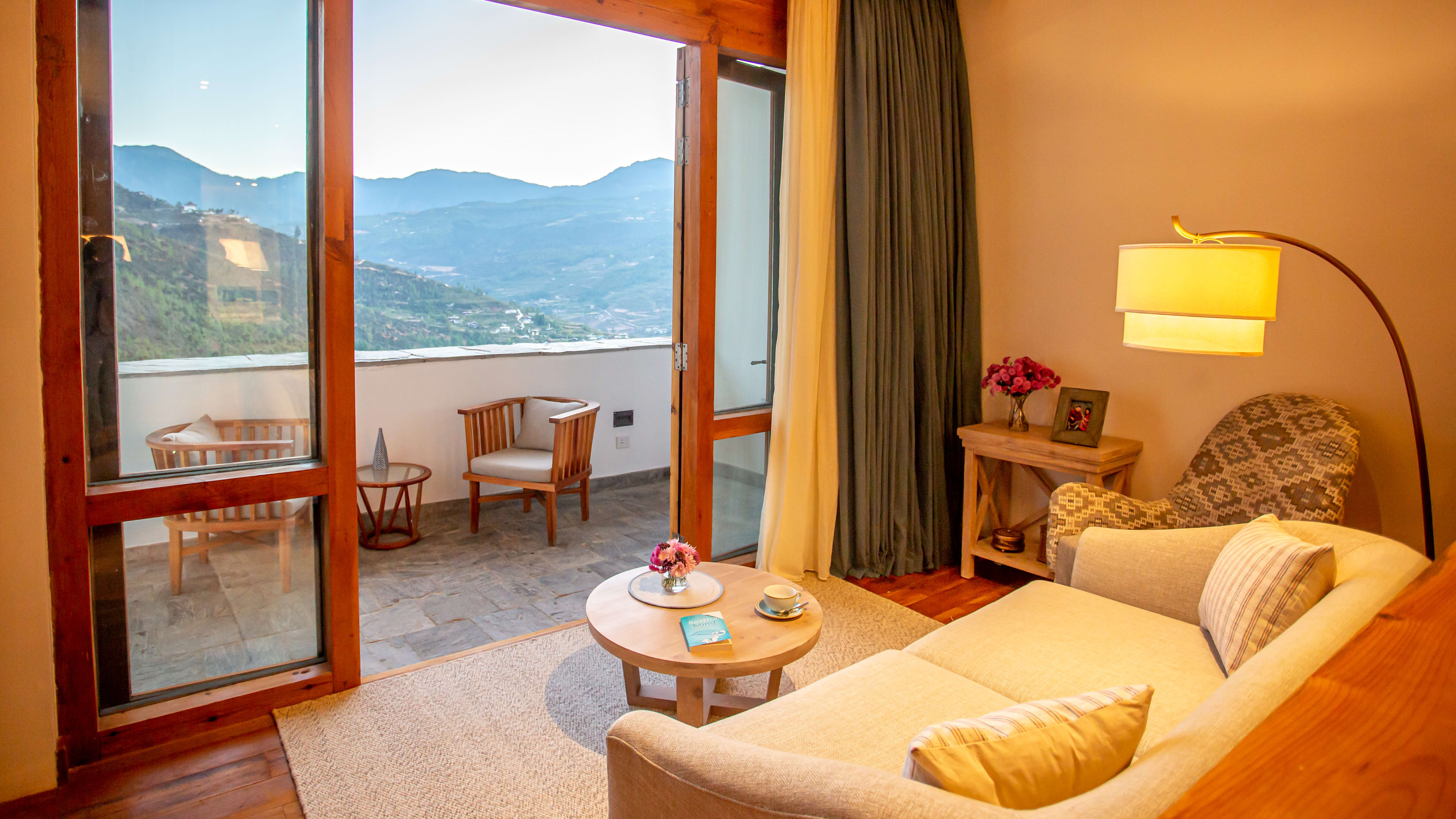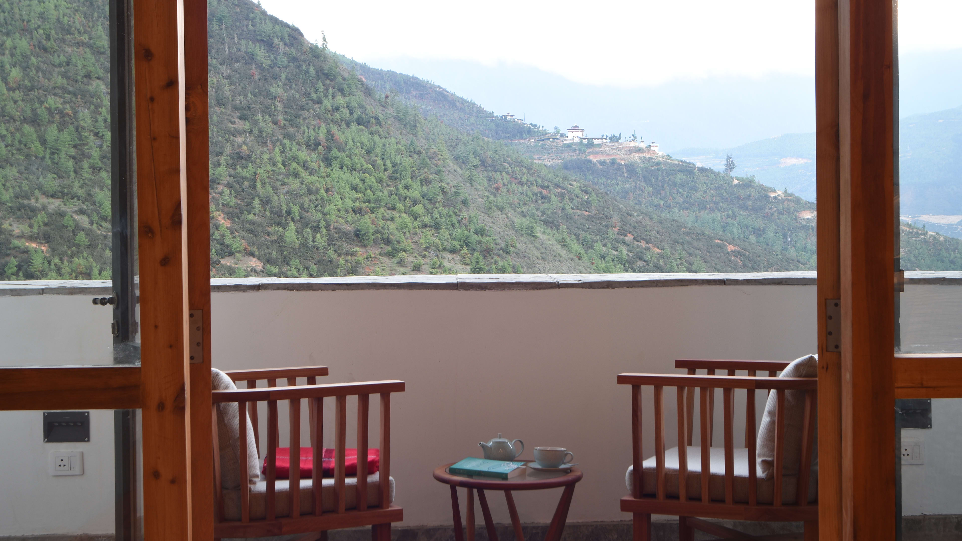 The rooms are full of nods to traditional Bhutanese design – decorative wall hangings, ornate woodwork and cushions dressed in colourful checks and stripes. The furnishings are simple for the most part, but regal touches come in the form of four-poster beds and milky-white marble in the bathroom, which is hidden behind sliding wooden doors. Every room has vast, timber-framed windows with pacifying views of the mountains, opening onto a terrace or balcony (the two namesake room categories).