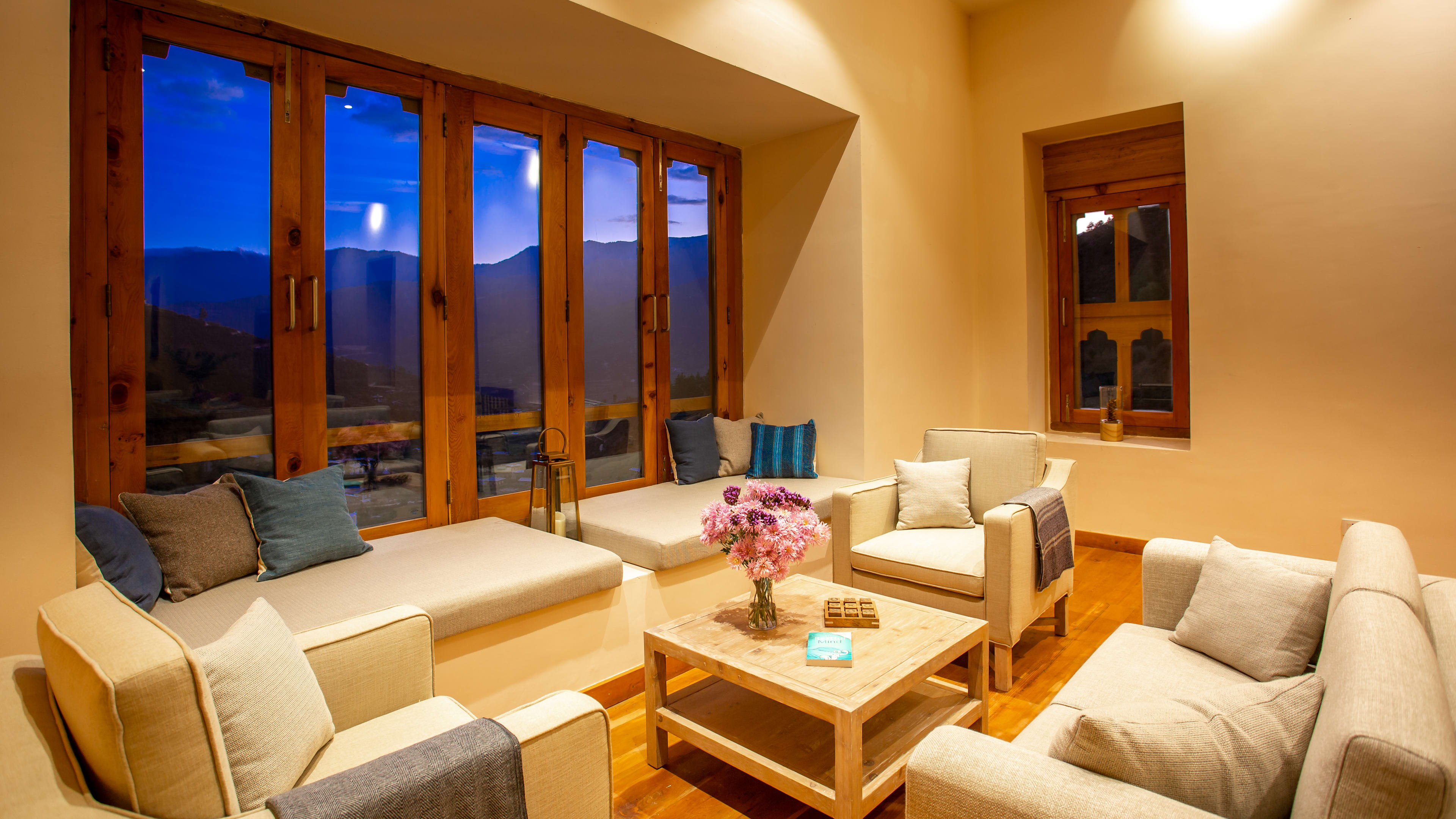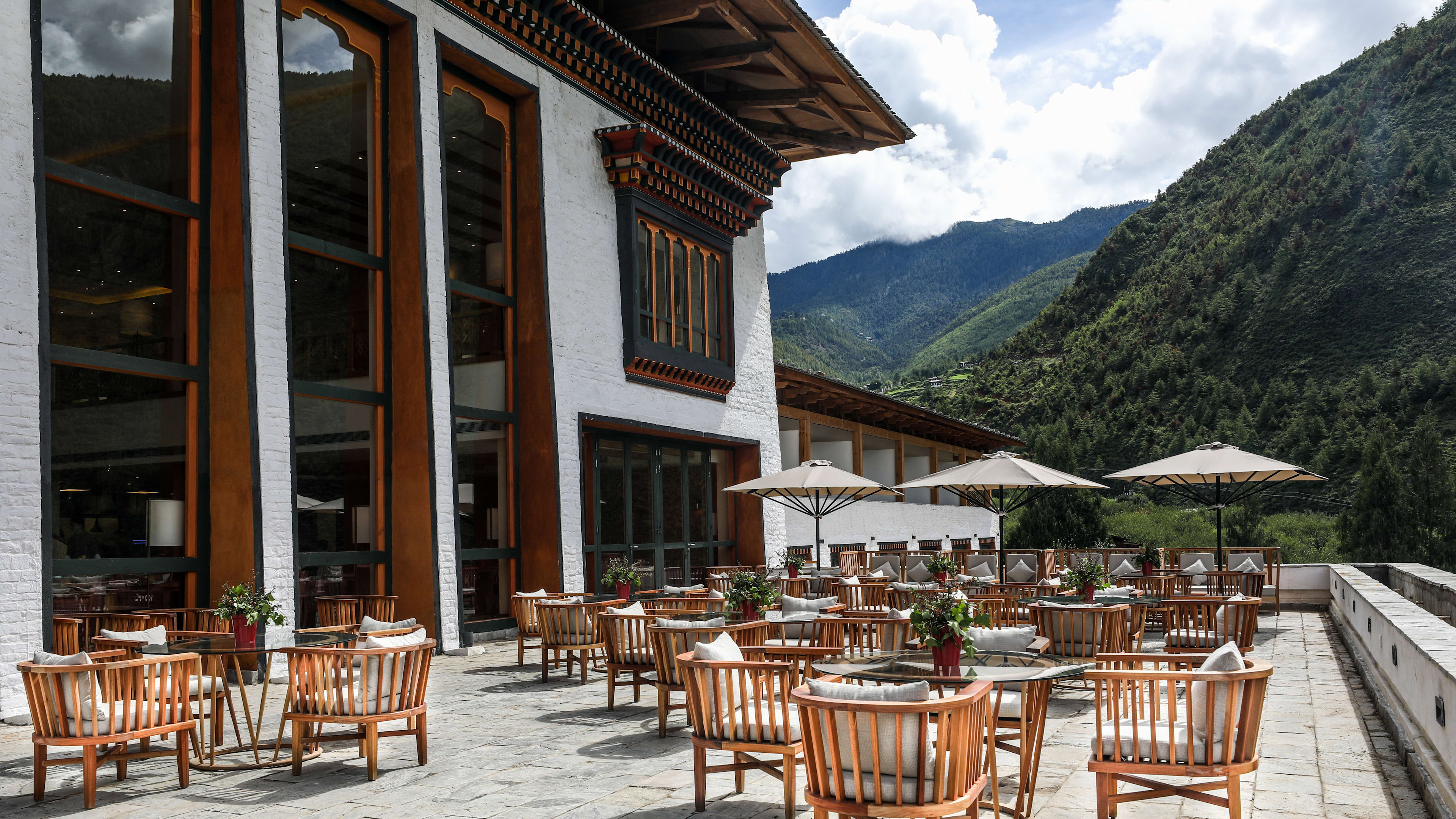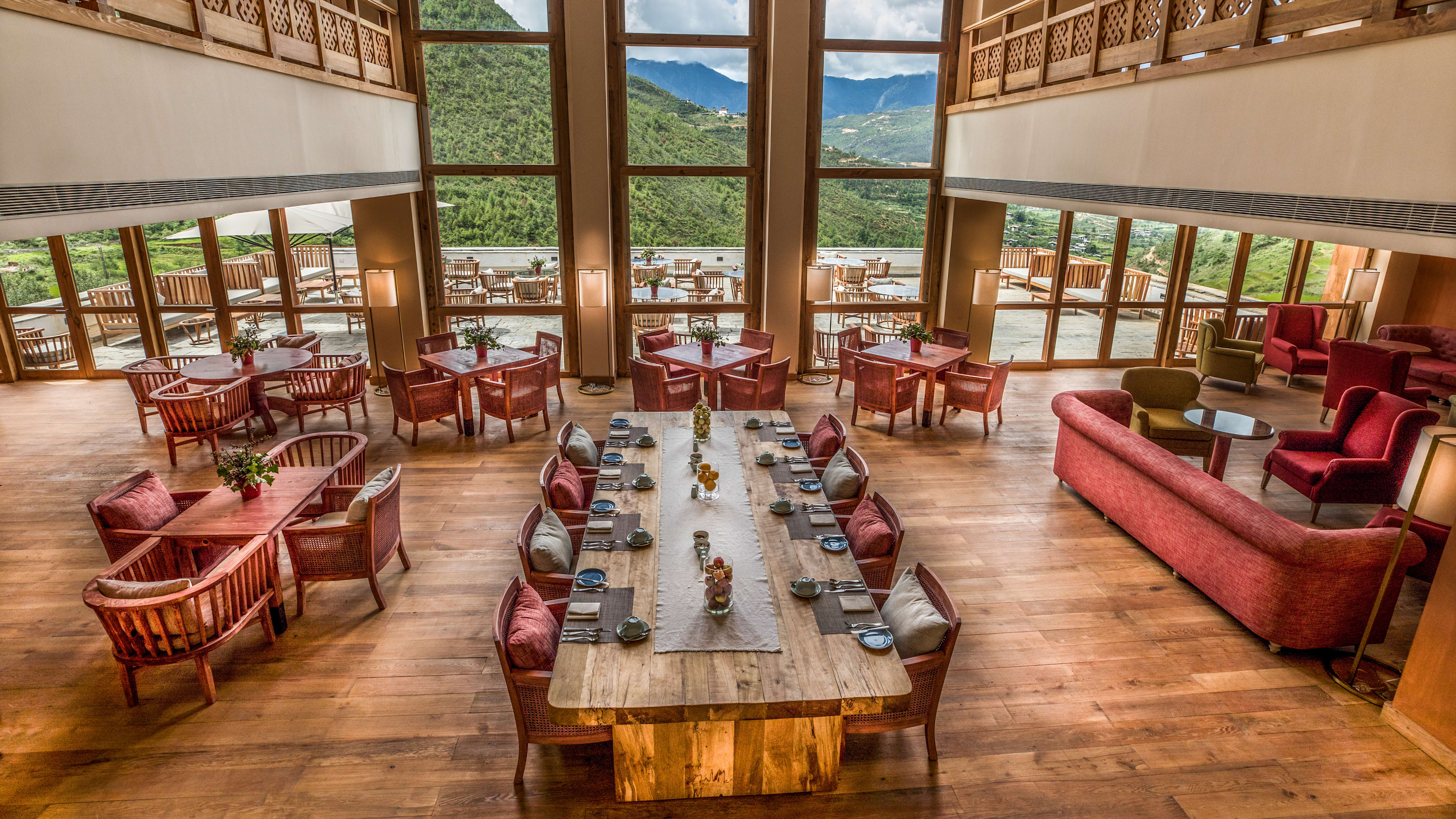 The restaurant shares the same space as the Tea Bar, with vast windows overlooking the valley. Tables spill out onto a large terrace, too, where the views are even more arresting. There are no fixed menus; instead, the chefs create a four-course lunch and six-course dinner each day, drawing from a repertoire of Bhutanese, Asian and Western dishes. Local produce is used as often as possible, including vegetables and herbs from the hotel’s greenhouse and gardens. The dishes are dictated by the seasons and the chefs’ inspiration that day, but they’ll always adapt for dietary requirements and children.