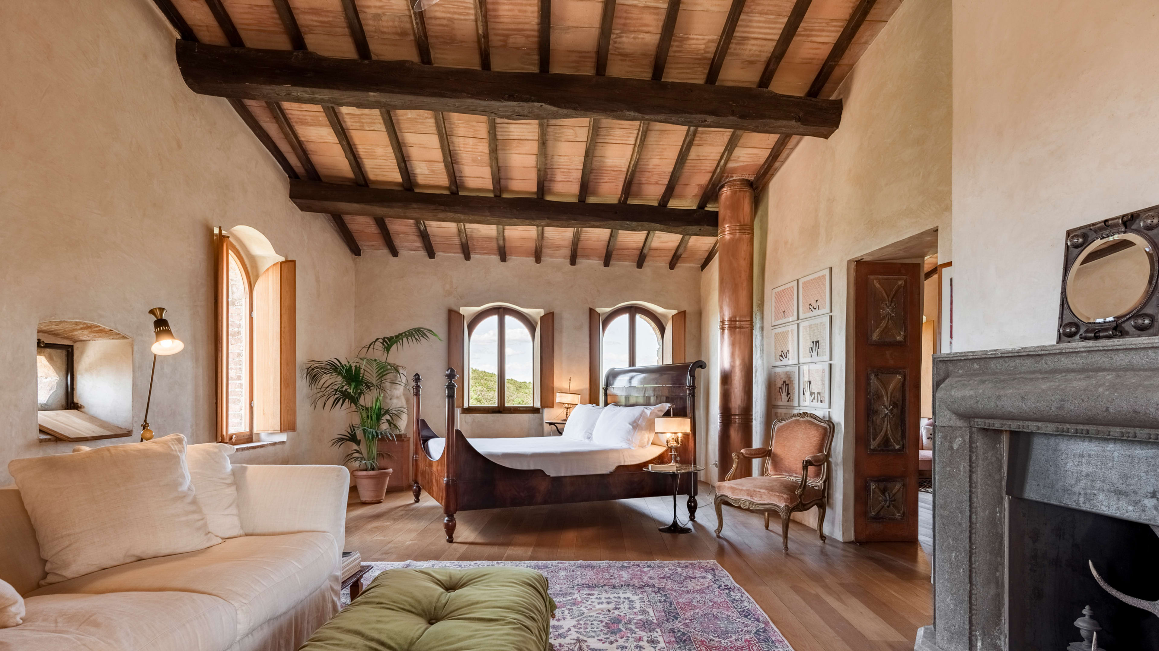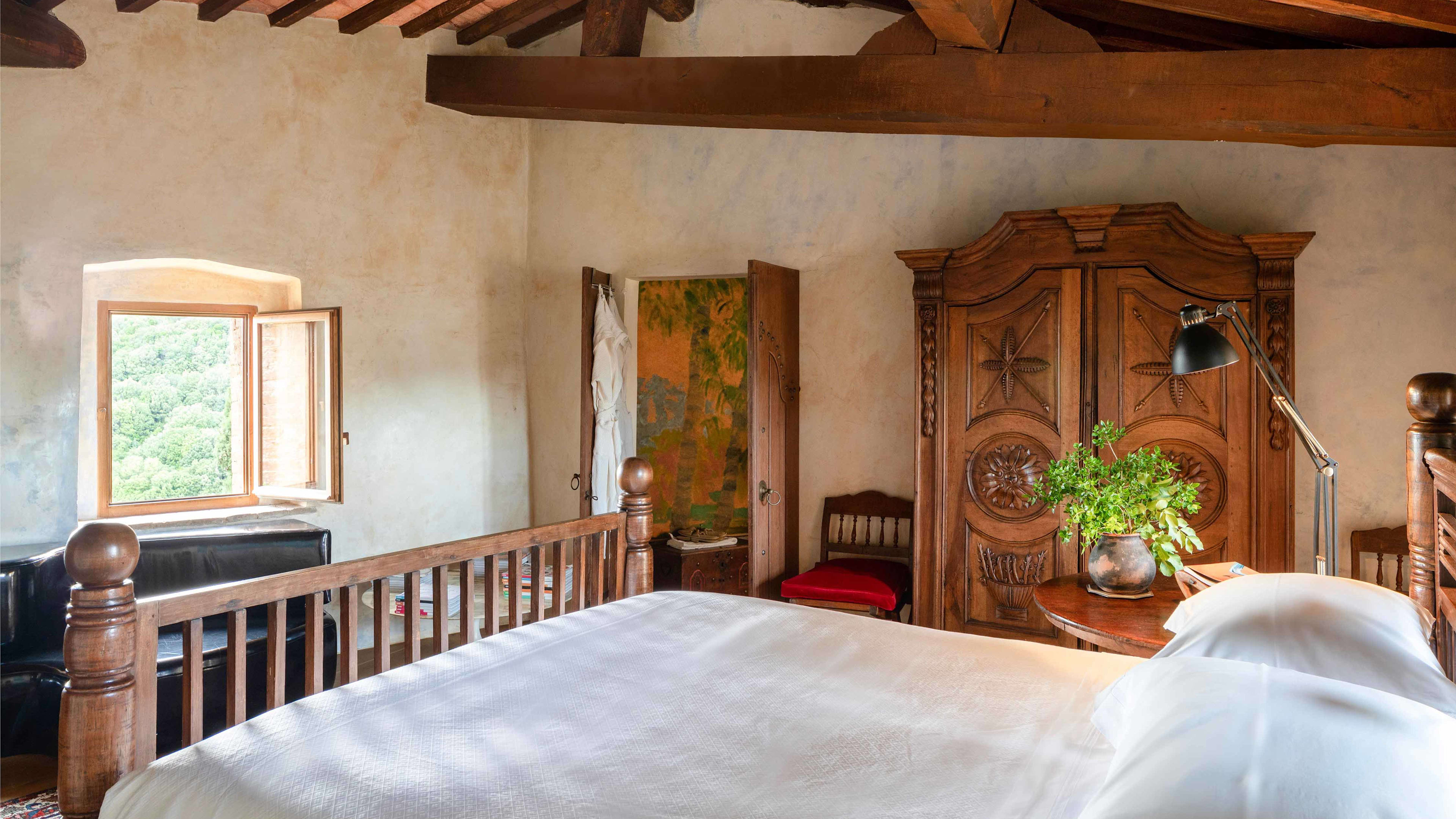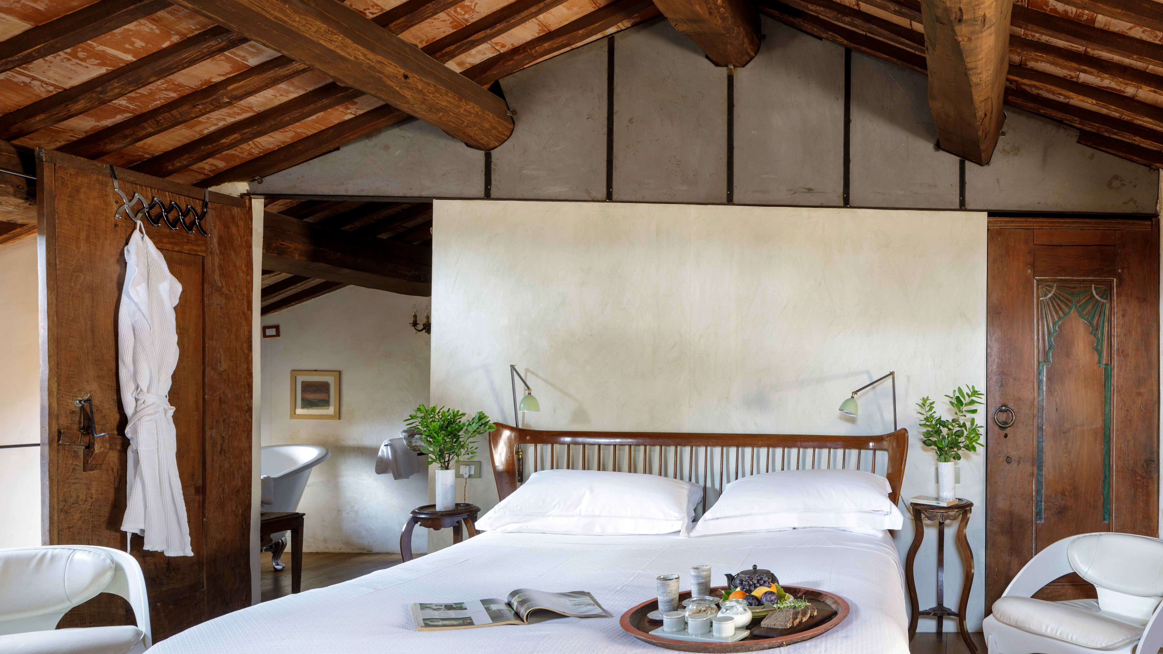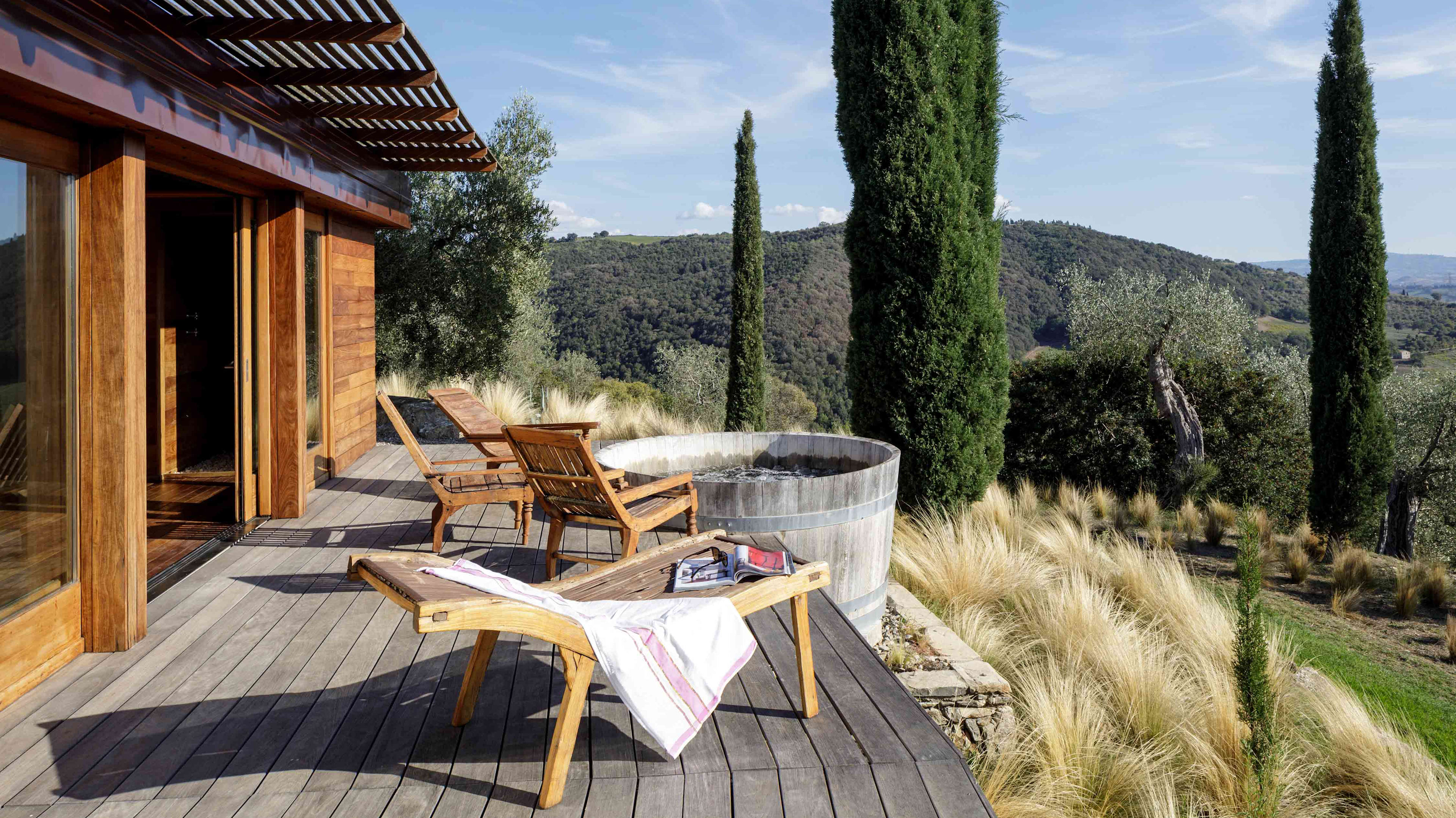 If you’re really looking to indulge, book the secluded Spa Suite, which is a short walk from the main castle. This modern, chalet-style suite has teak-clad interiors and floor-to-ceiling windows that look out across the Ombrone valley and river at the bottom of the hill. There’s an indoor hammam and sauna, and a wooden ‘barile’ hot tub on the sun deck, which has been positioned to perfectly catch the Tuscan sunset.