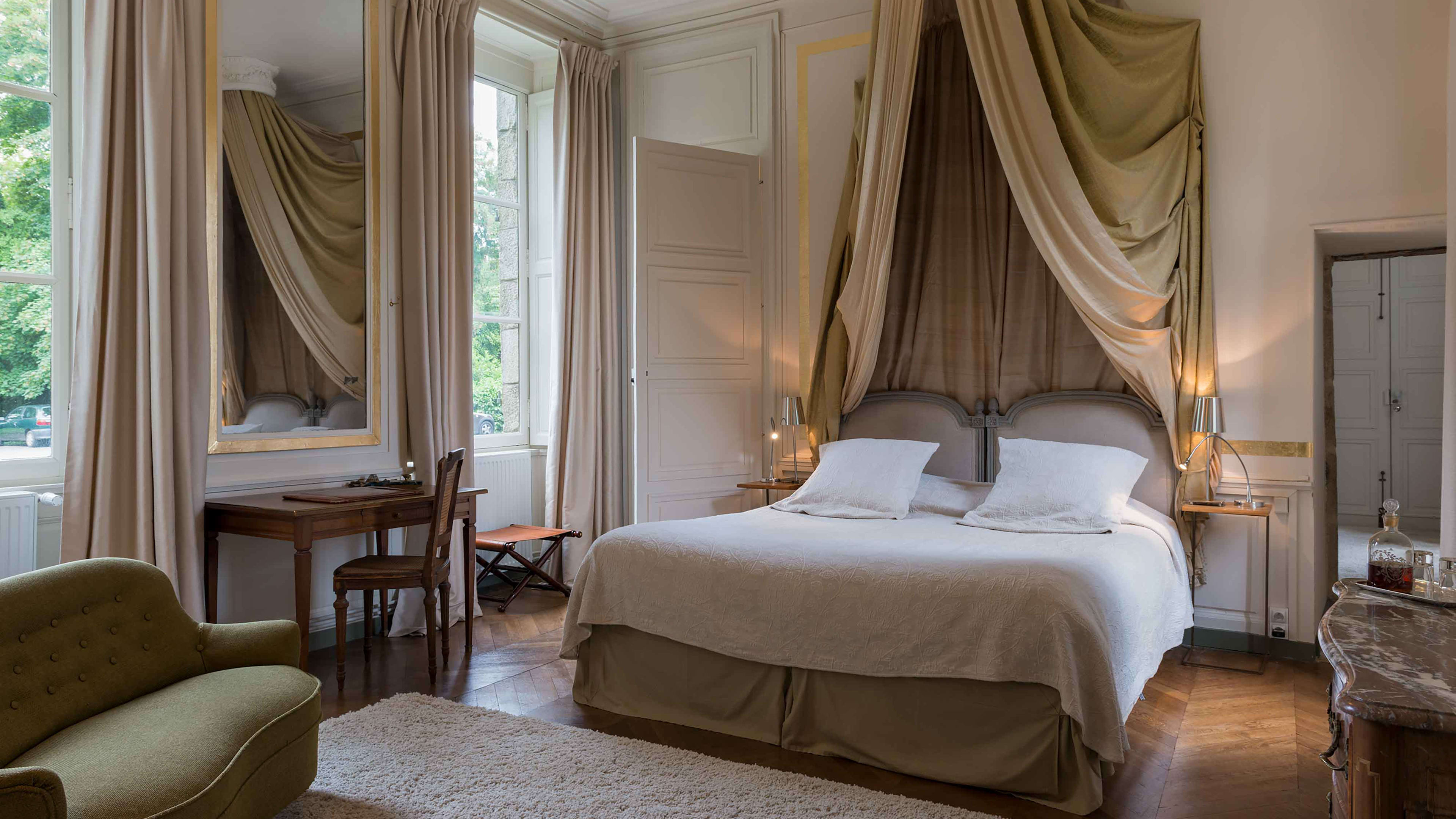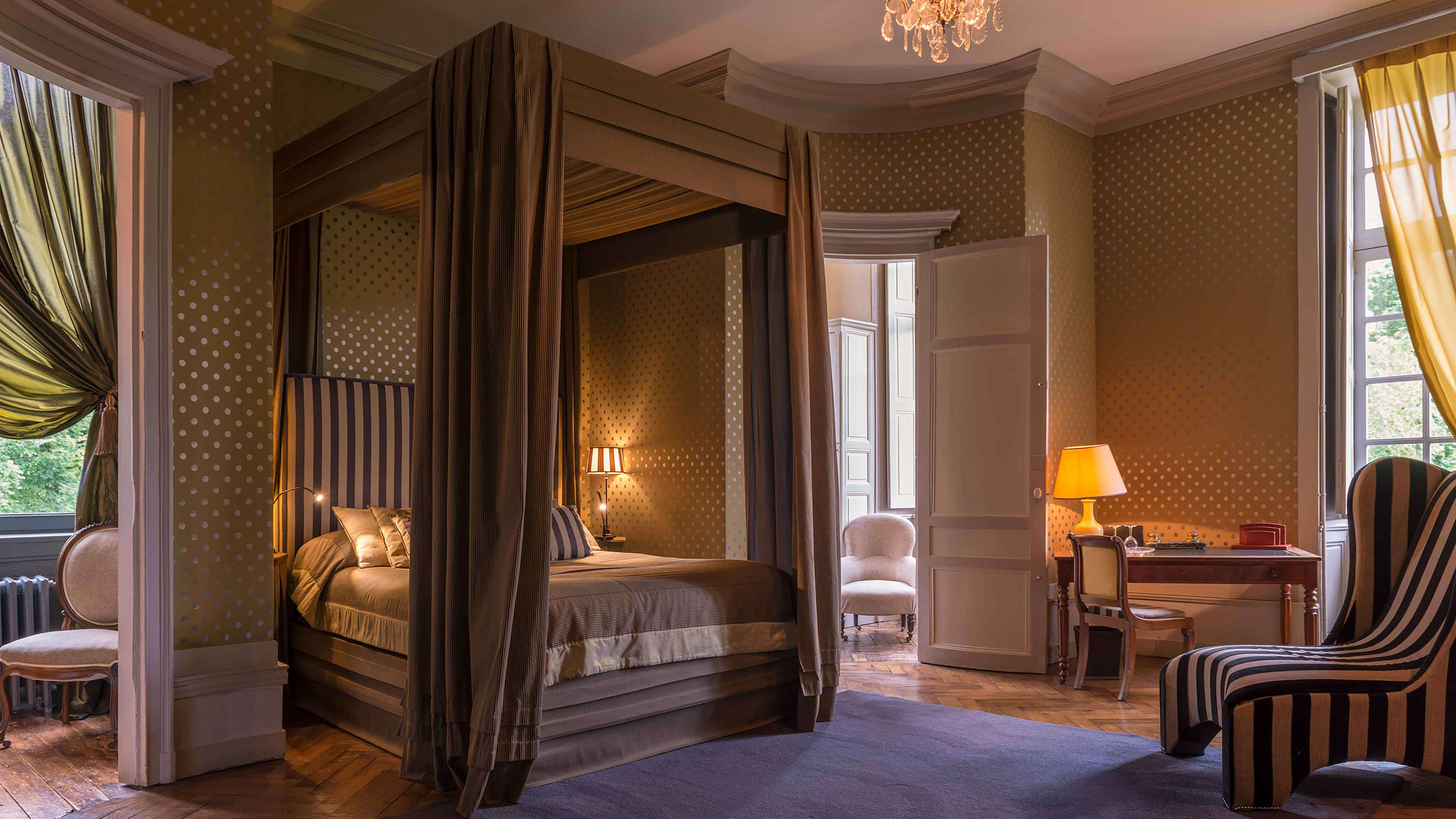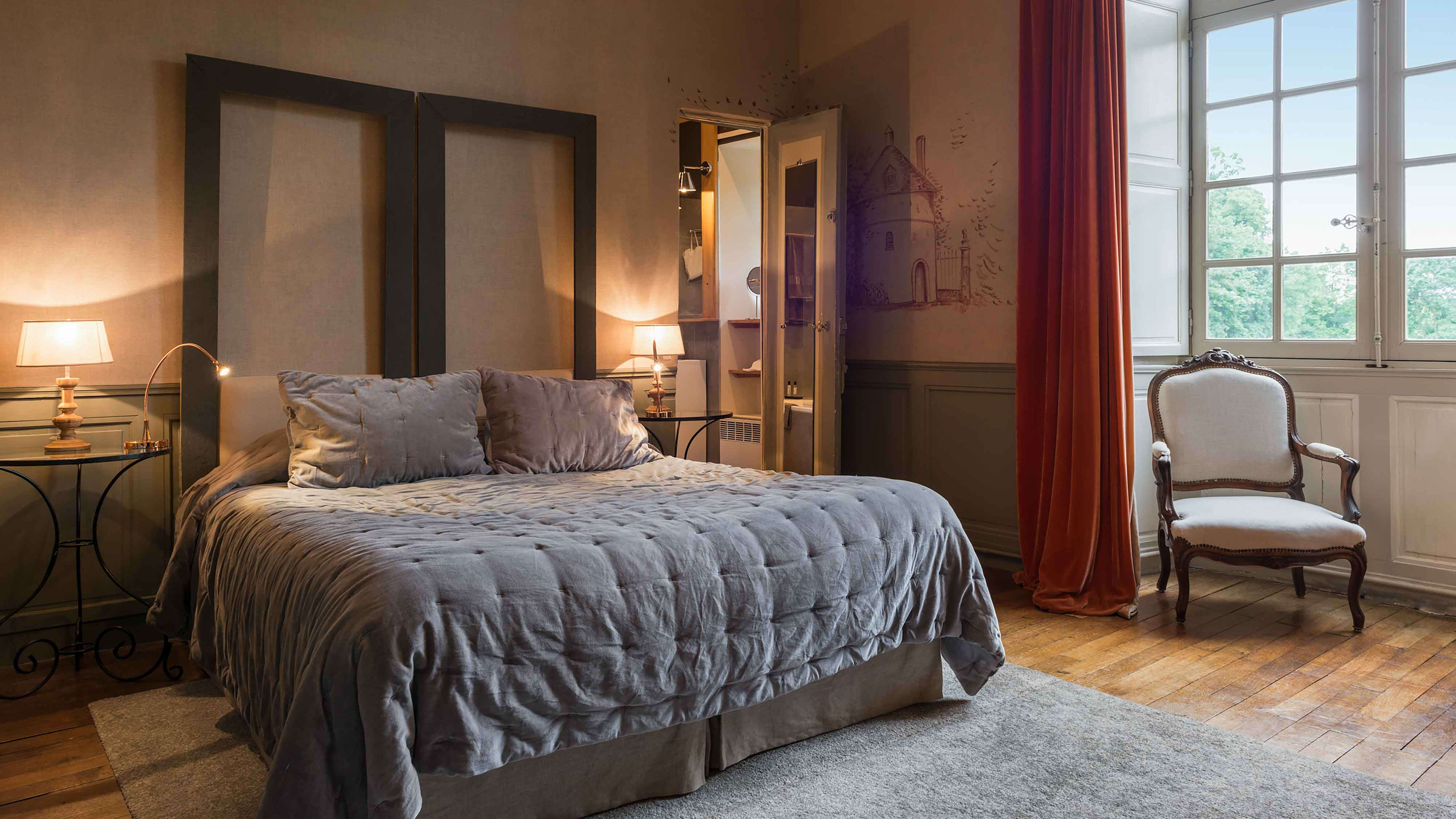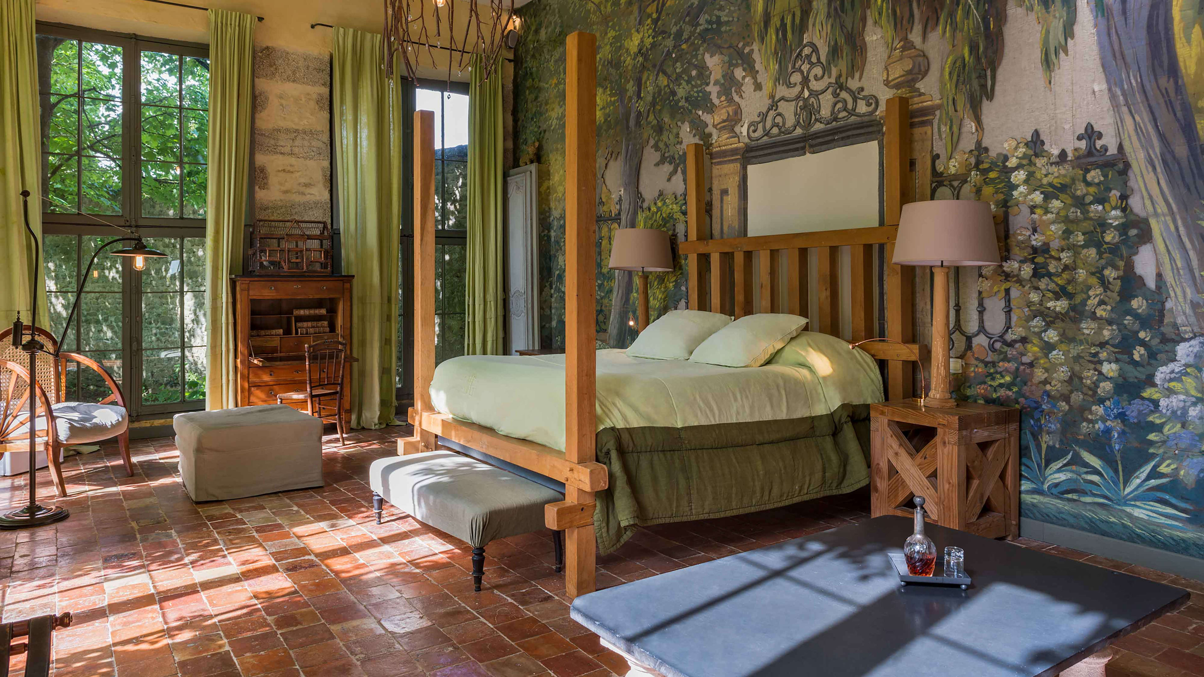 L’Orangerie is set apart from the château, a huge, self-contained suite with an open bathroom, vast wooden bed and one wall made from a 19th-century backdrop found in a Barcelona theatre. The château’s most modern room is the Chambre des Mystères, romantically secluded up two narrow flights of winding stairs (52 in total, if you're counting…). It’s chocolate-coloured, with bold red accents. For a stay that’s steeped in history, go for the Chambre d’Henri IV, where France’s first Bourbon king kipped. Chambre de Madame may have been the bedroom of owner Charles-Henry's grandmother, but these days is prized for its four-poster bed and panoramic pool-and-park views.