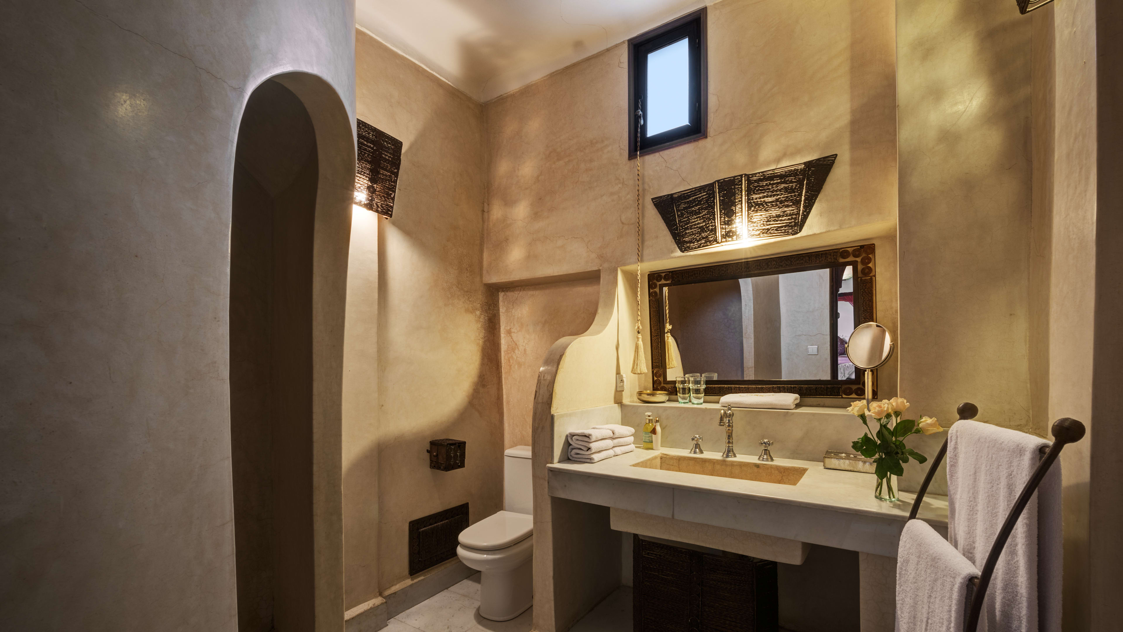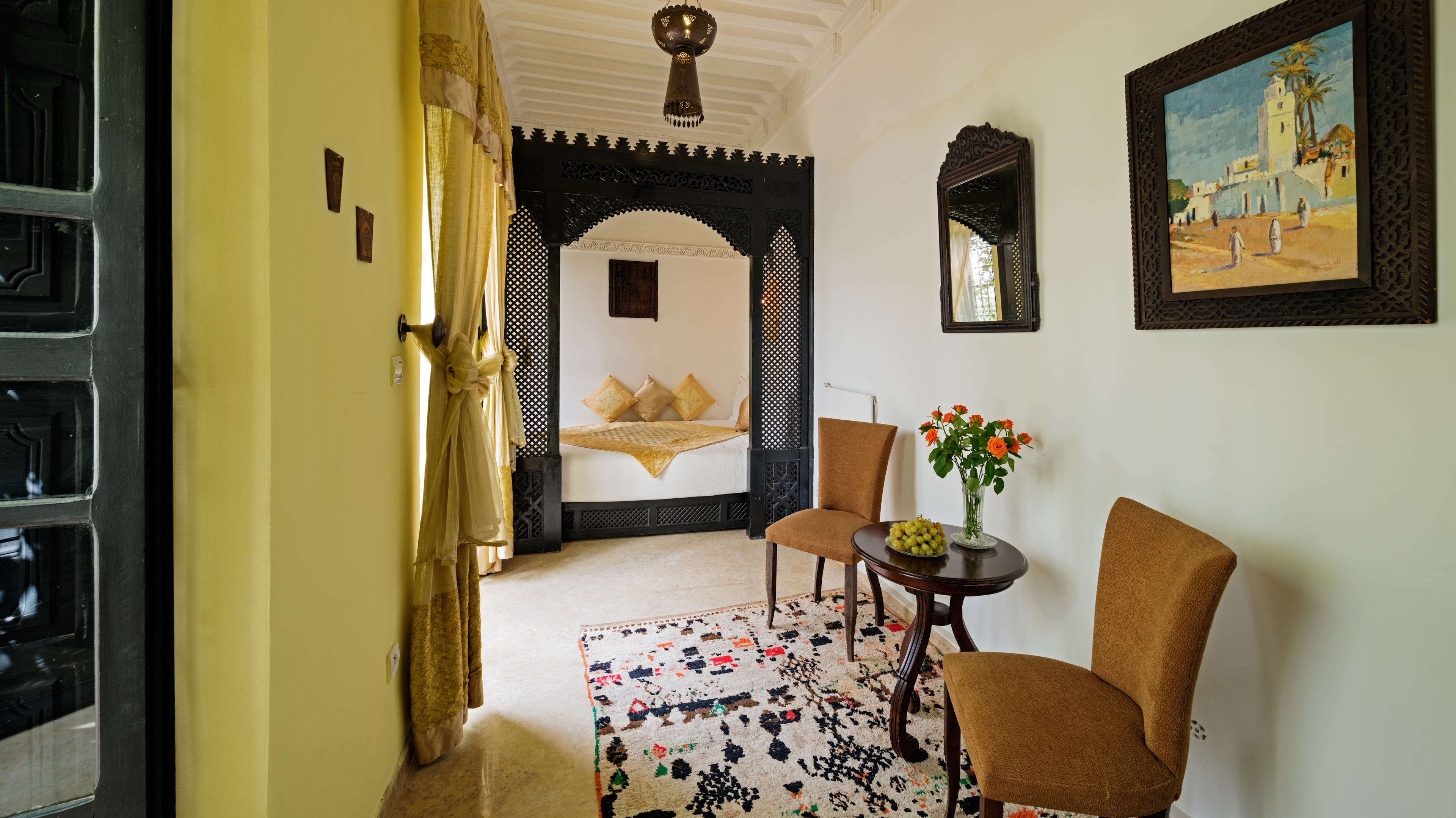 Suite Zemmour is the riad’s most romantic, with deep purple soft furnishings and a traditional, alcove-set Morrocan bed. On the first floor, Suite Taznarth has an hand-carved cedar balcony fitted with a violet banquette, as well as a fireplace and a pristine tadelakt bathroom. Suite Zayan also has a functioning fireplace, together with ornate wood-pannelled walls and a wispily draped four-poster. The rooms on the ground floor, although without air-con, are still pleasantly cool.
