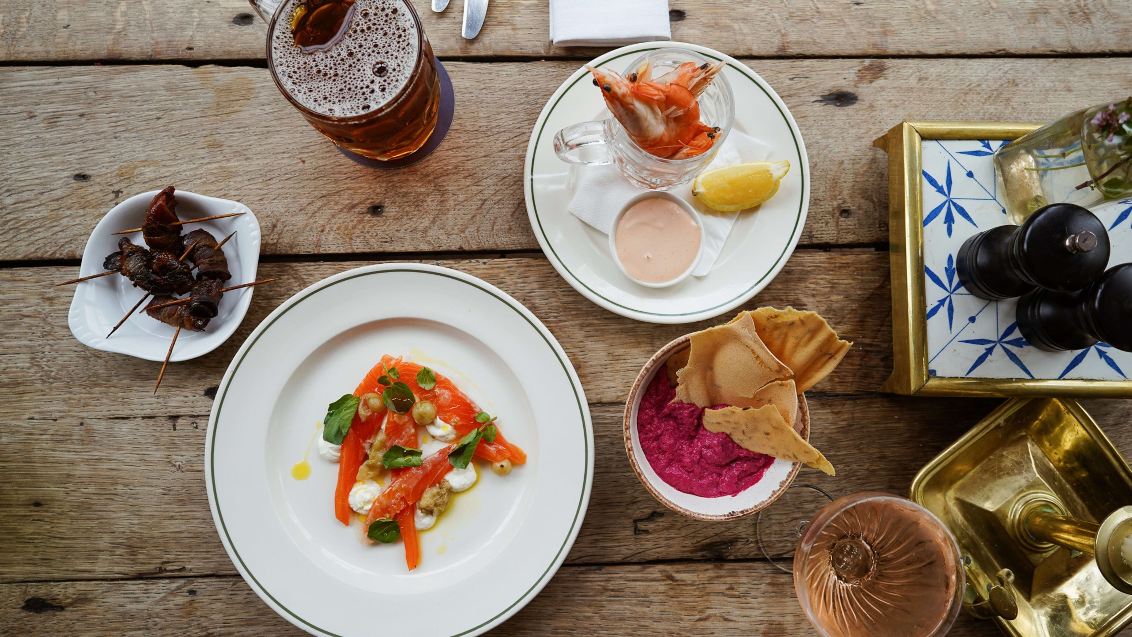 Choose according to your mood; tables in the pub make for a sociable and relaxed setting, the sitting room is the place for a DVD-dinner, and the conservatory is bright and airy, with its pale wood panelling, gilt-framed mirrors and garden views.