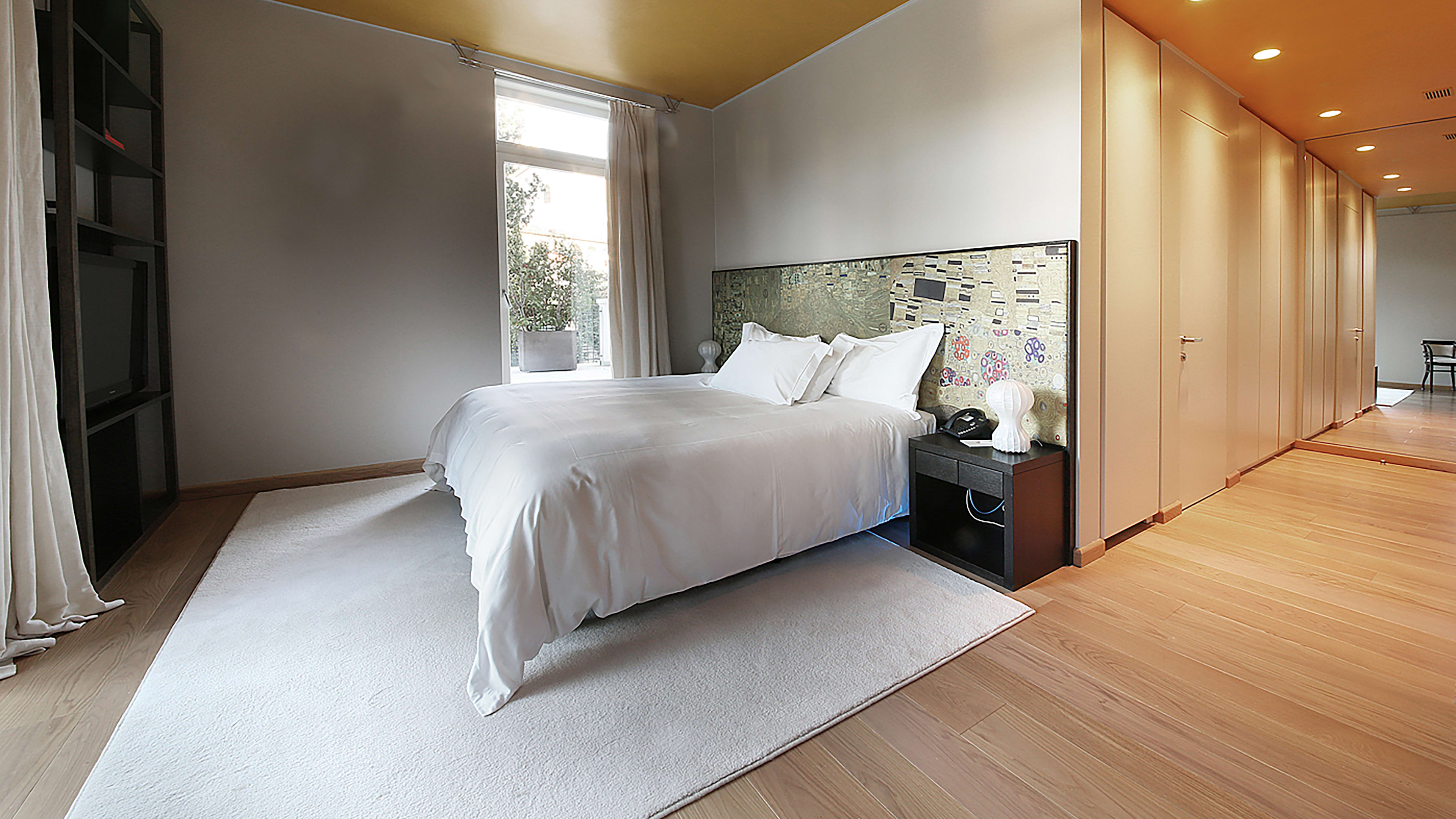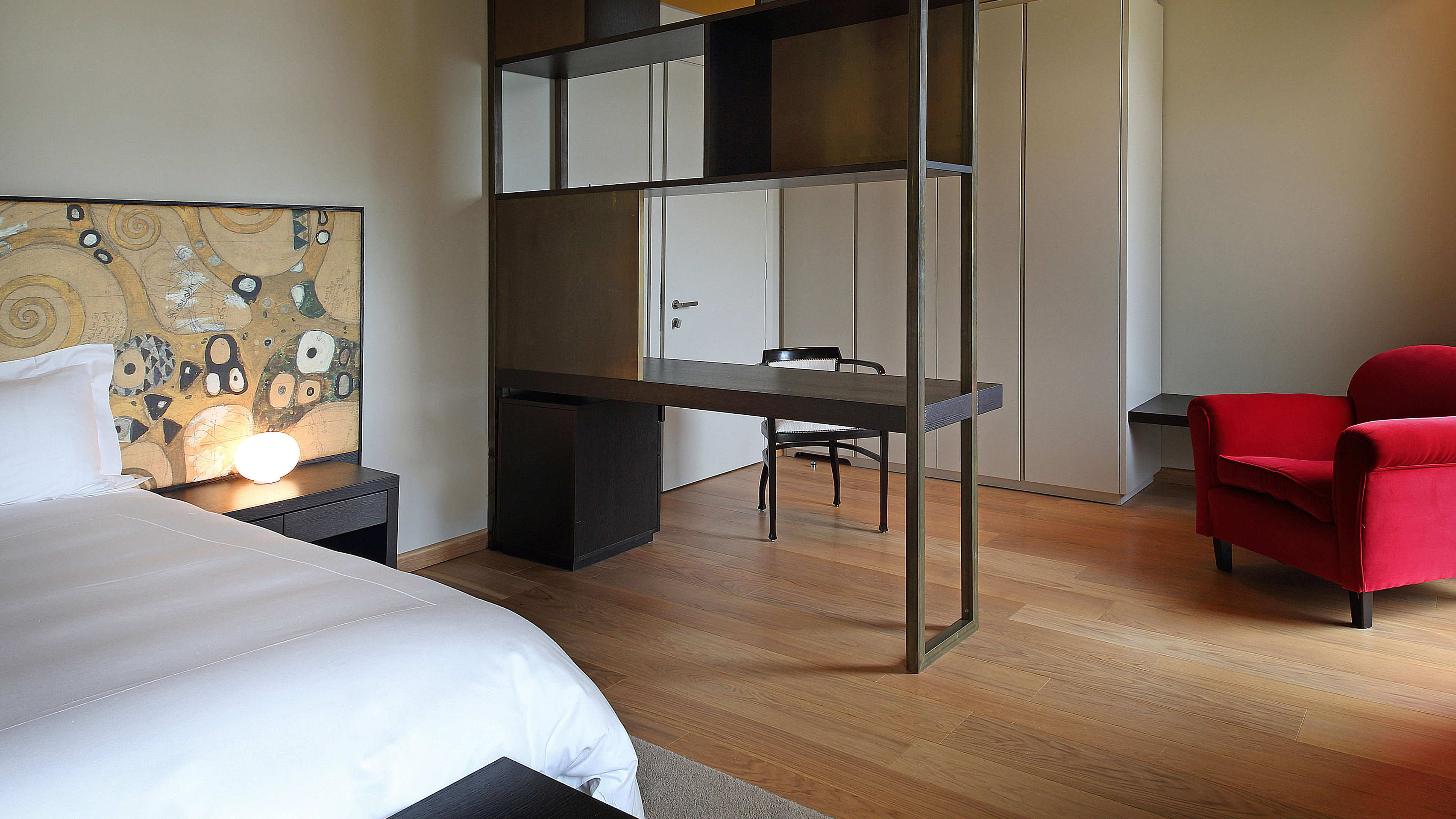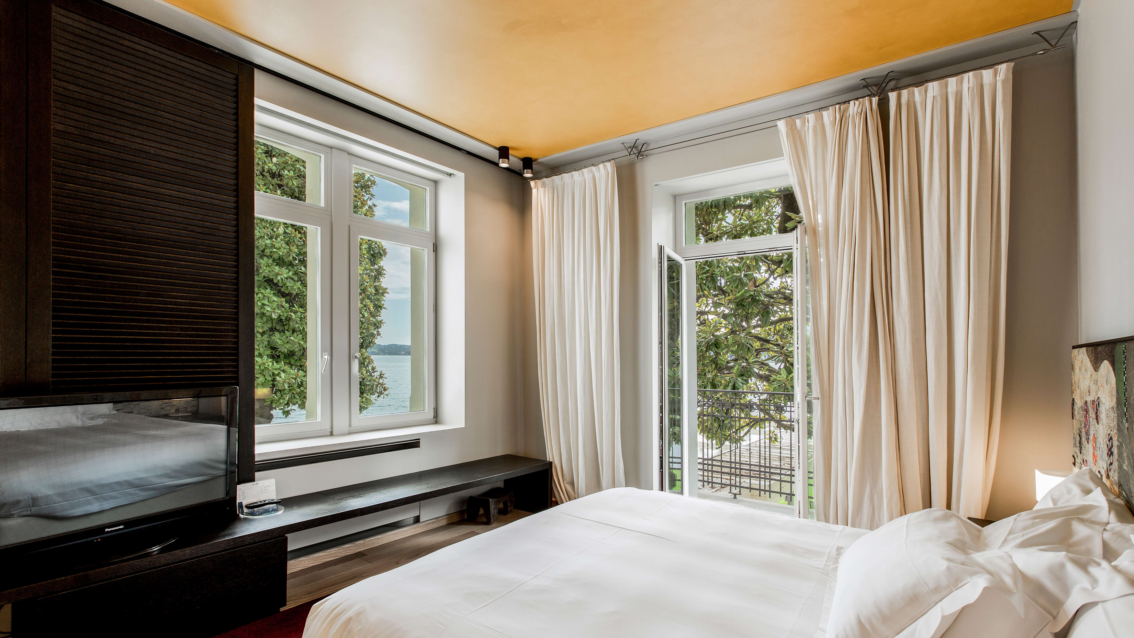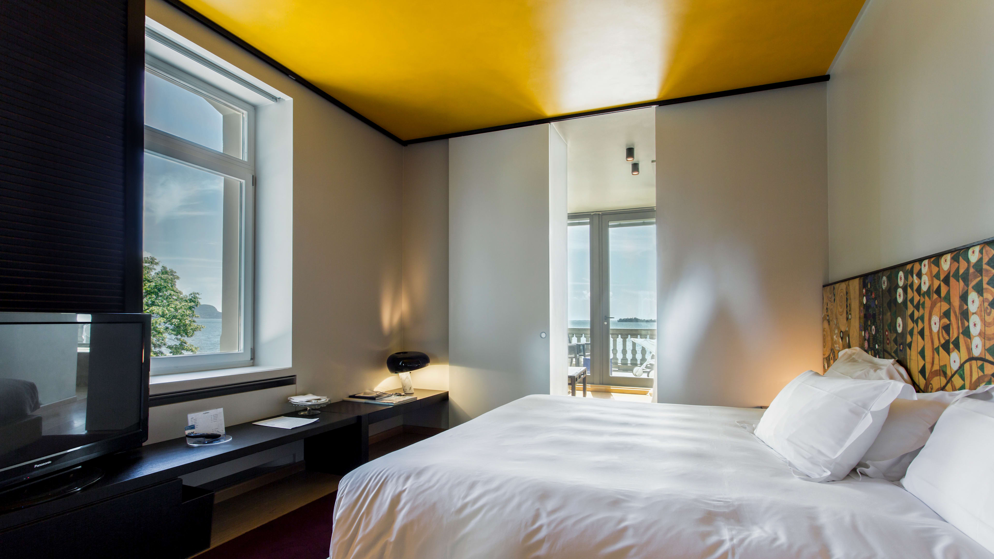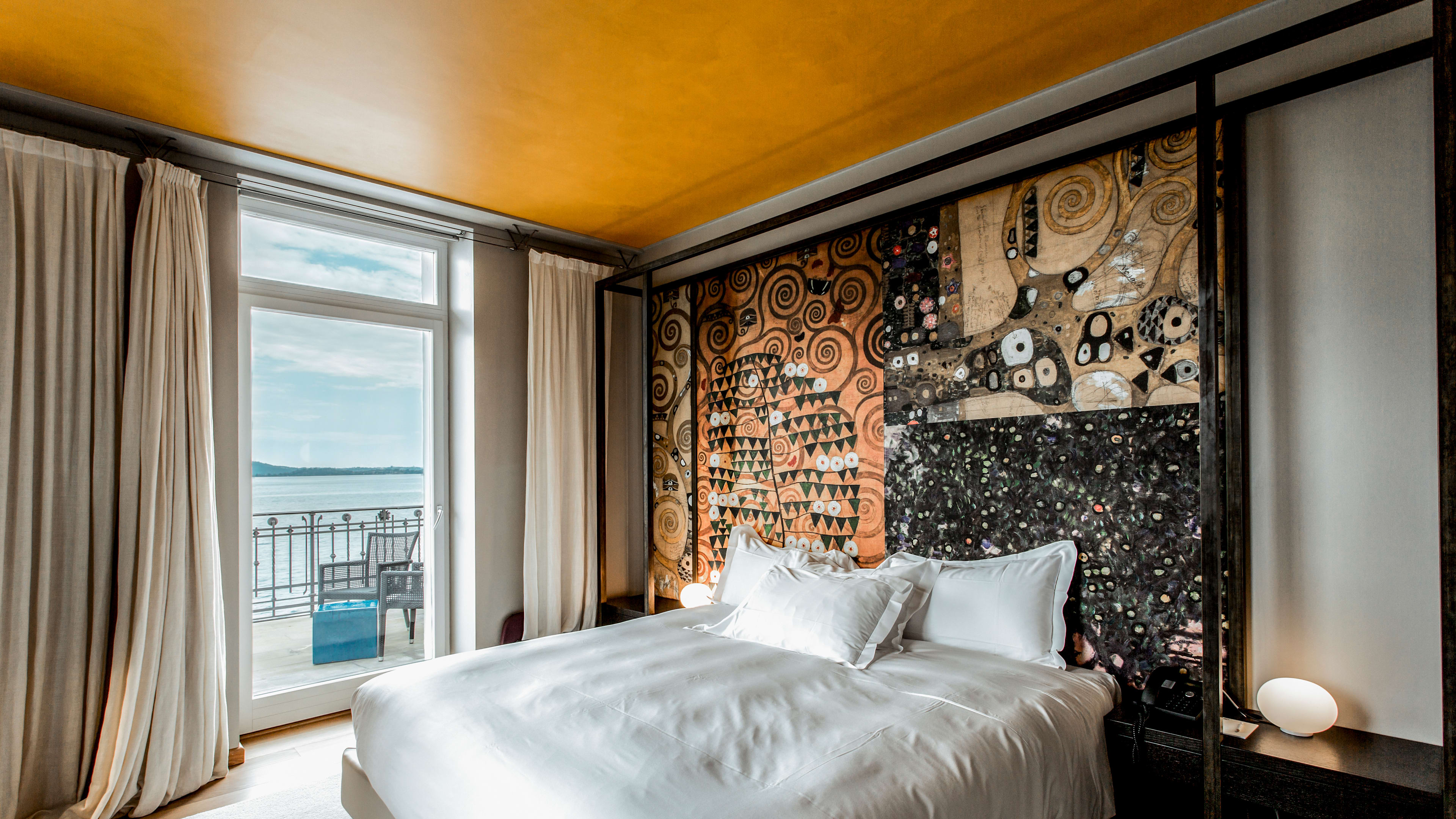 Rooms are simply decorated, with dark wood, beautifully soft white linens, and Klimt-patterned bedheads. The dazzling lake view is the real show-stealer here, so plump for a room with a balcony or terrace to make the most of it. Balcony Room 303 is spacious and light, with two floor-to-ceiling glass doors and striking vistas of the gardens and lake. We love View Suite 302’s bathroom, with a big freestanding tub for long soaks and the same spectacular outlook.