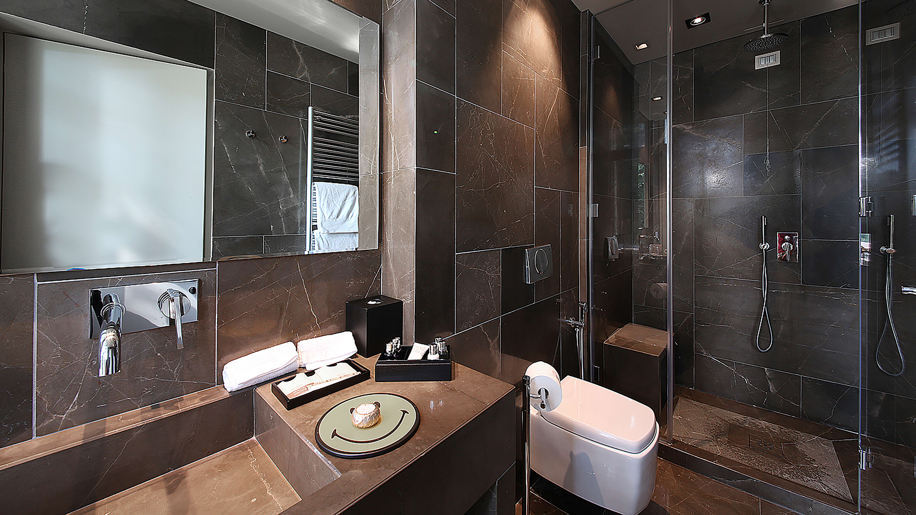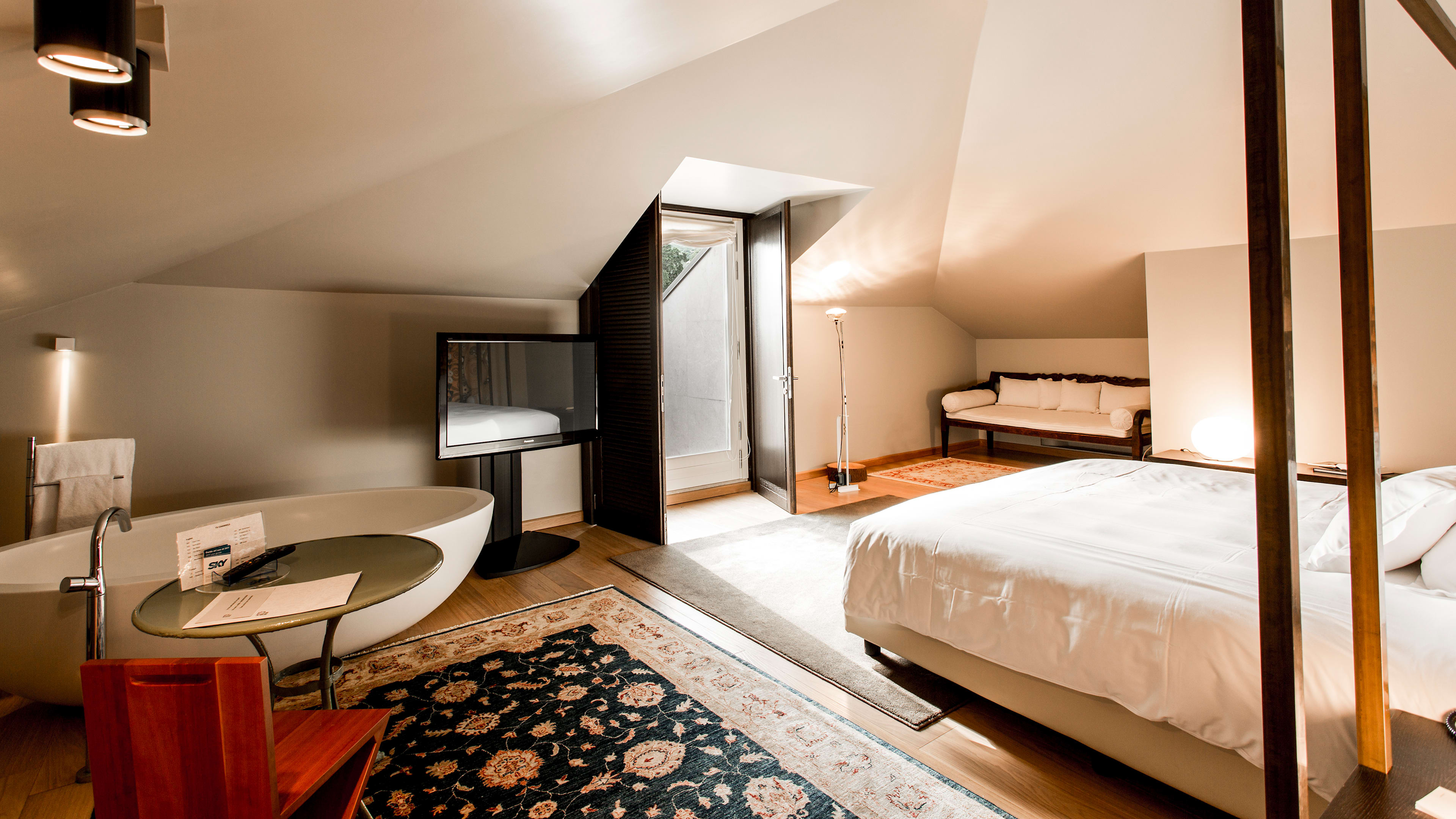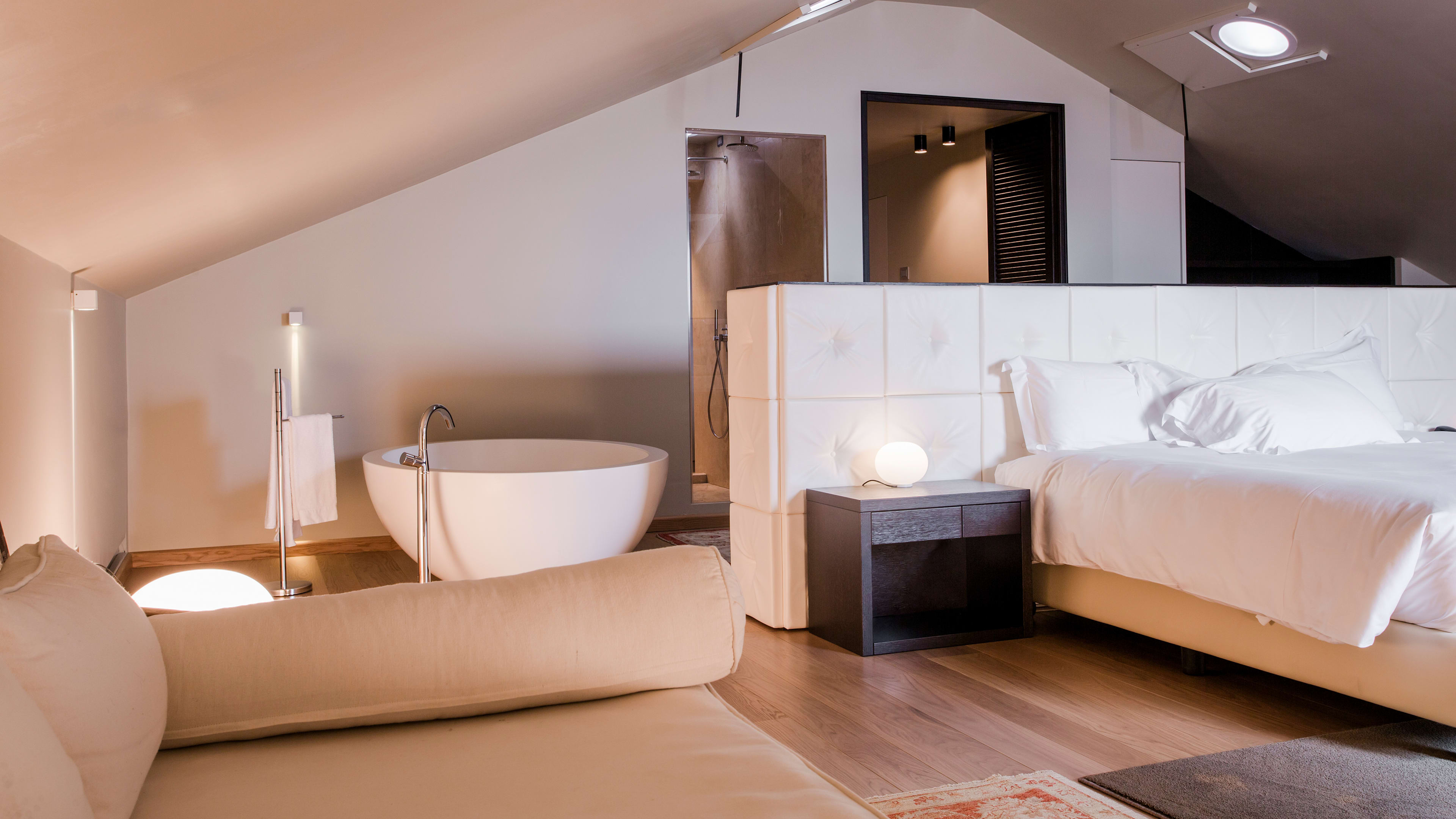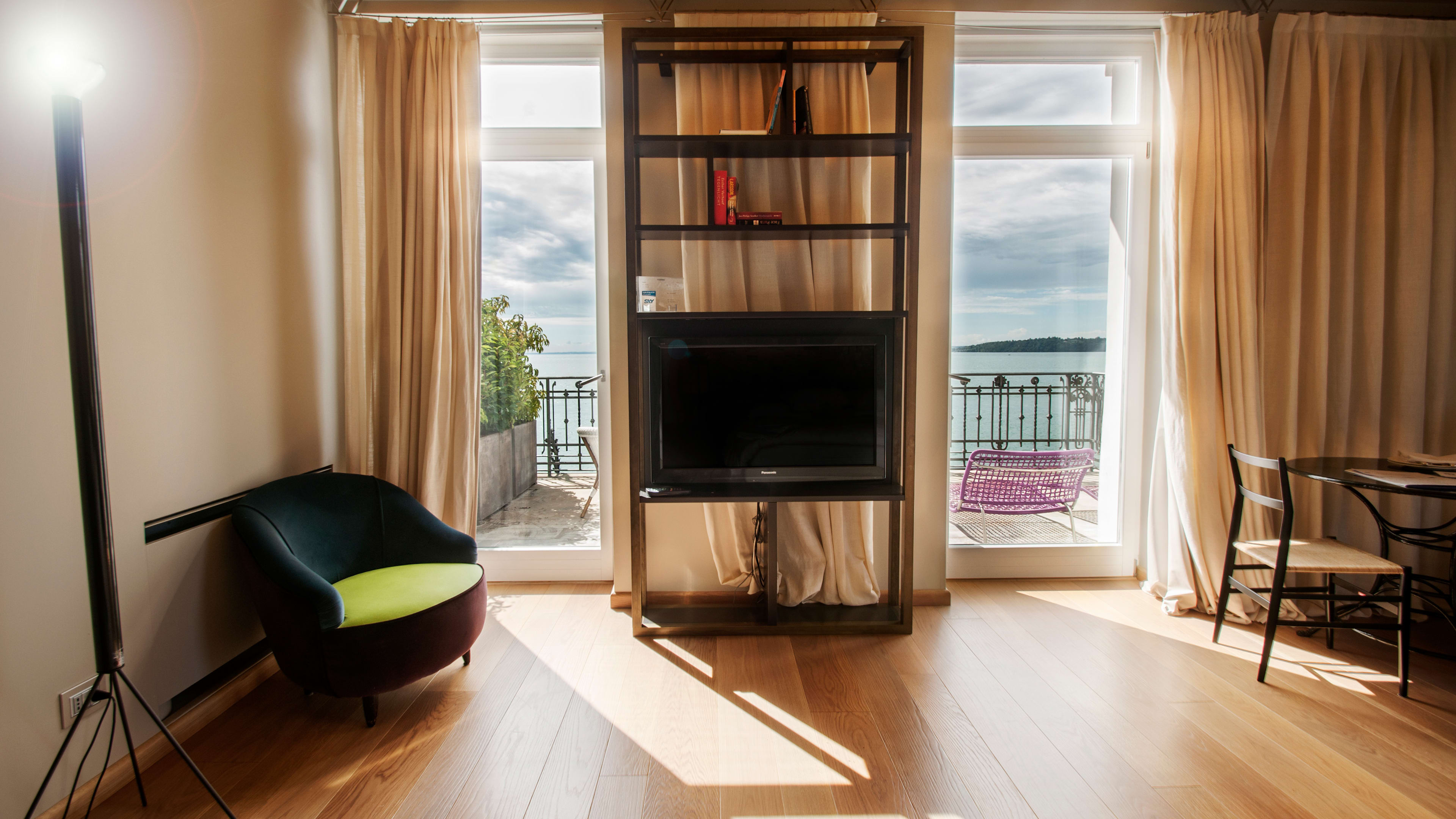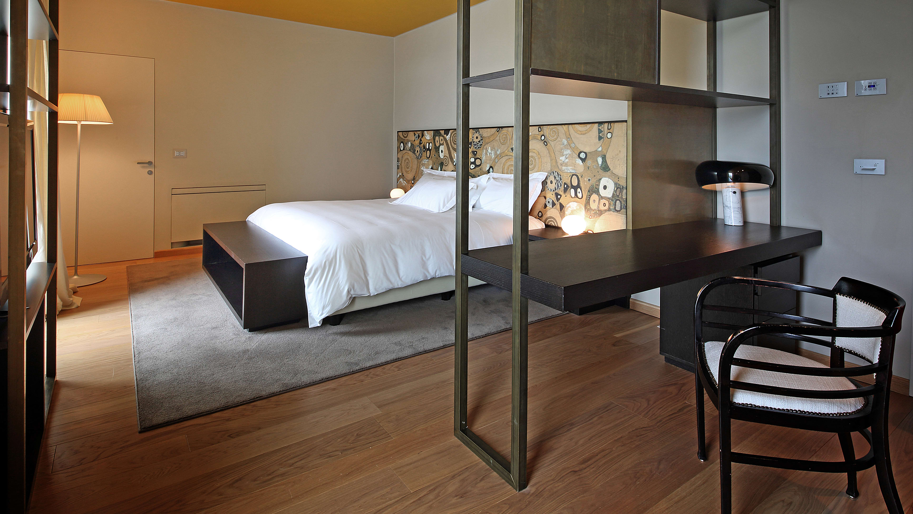 Rooms are simply decorated, with dark wood, beautifully soft white linens, and Klimt-patterned bedheads. The dazzling lake view is the real show-stealer here, so plump for a room with a balcony or terrace to make the most of it. Balcony Room 303 is spacious and light, with two floor-to-ceiling glass doors and striking vistas of the gardens and lake. We love View Suite 302’s bathroom, with a big freestanding tub for long soaks and the same spectacular outlook.