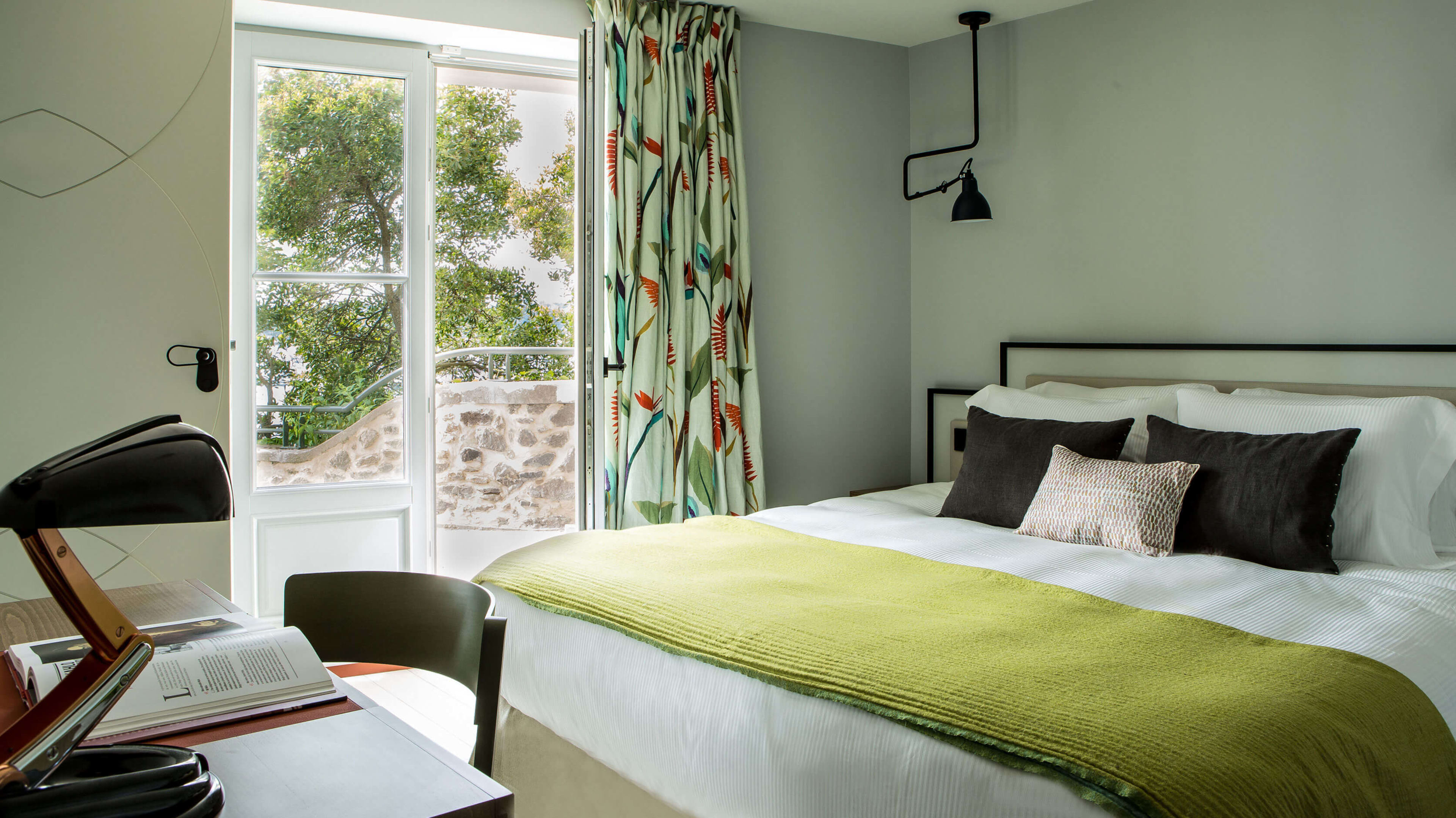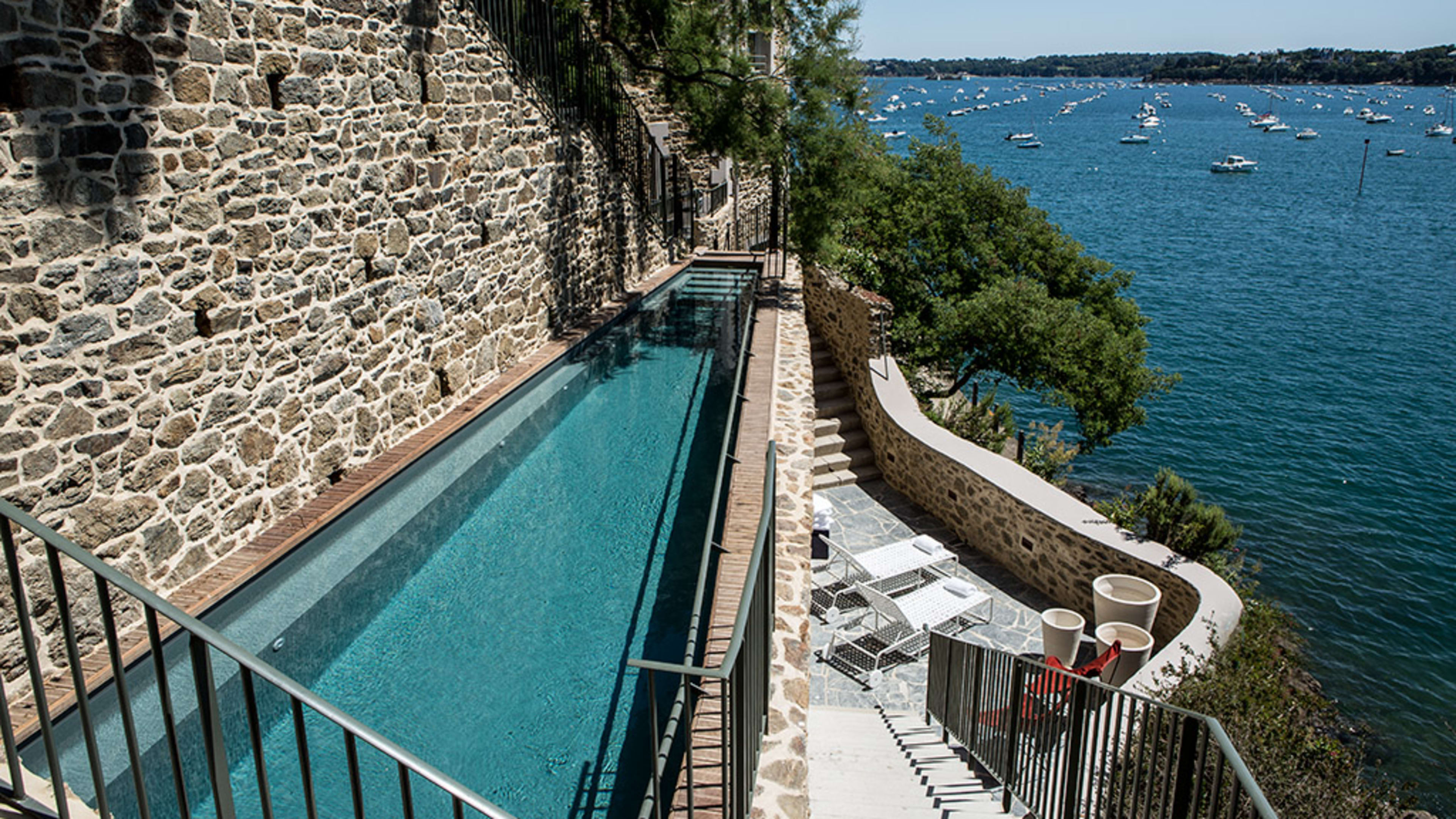 The heated, narrow stone pool (best suited for lazy laps) is exclusively for guests’ use. It’s cleverly worked into the hotel’s higgledy-piggledy structure, reached by a secluded staircase, and positioned for beautiful bay views and surveying the Claire de Lune promenade. To one side, there’s a little solarium with loungers for post-swim sunbathing.