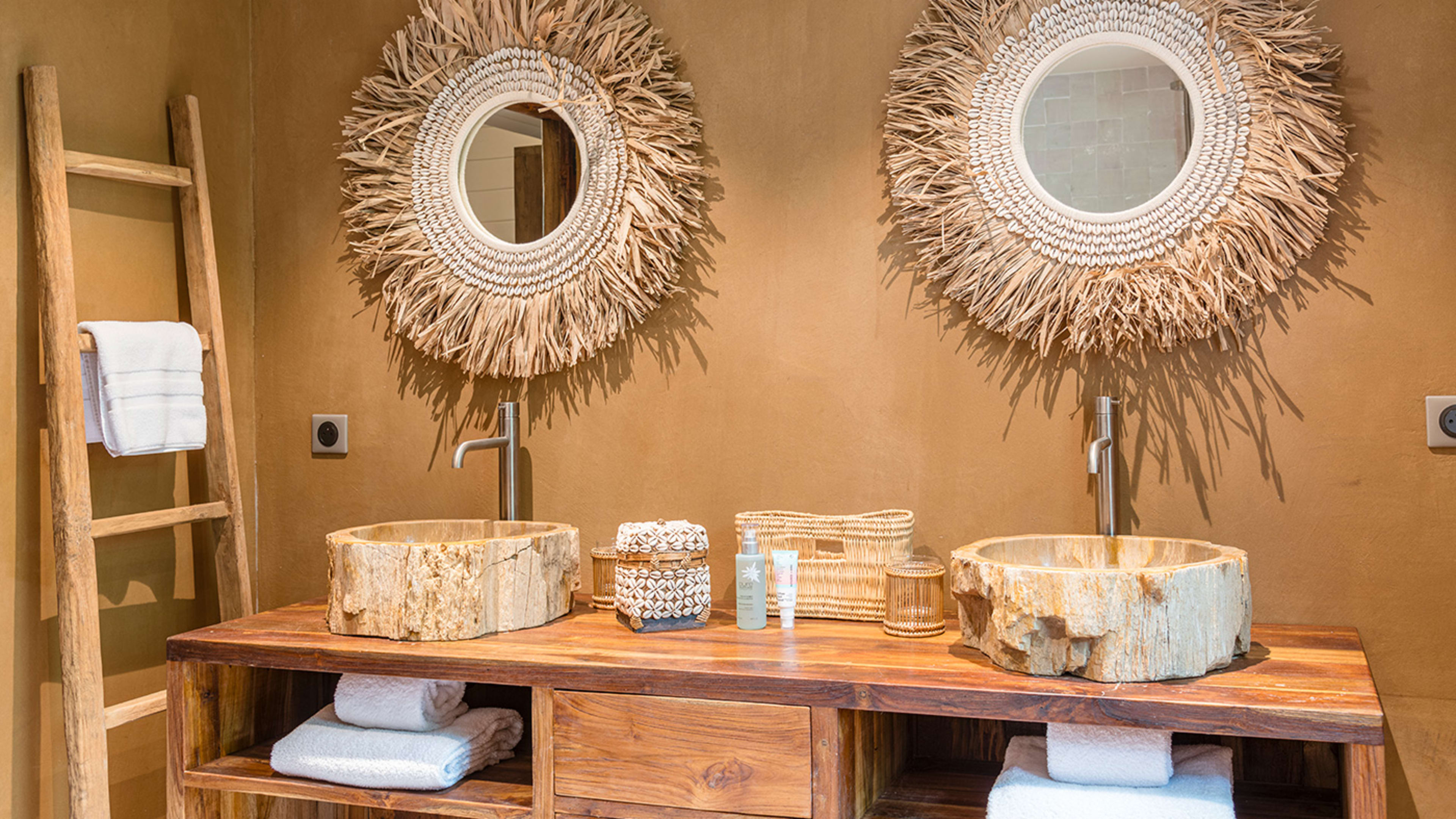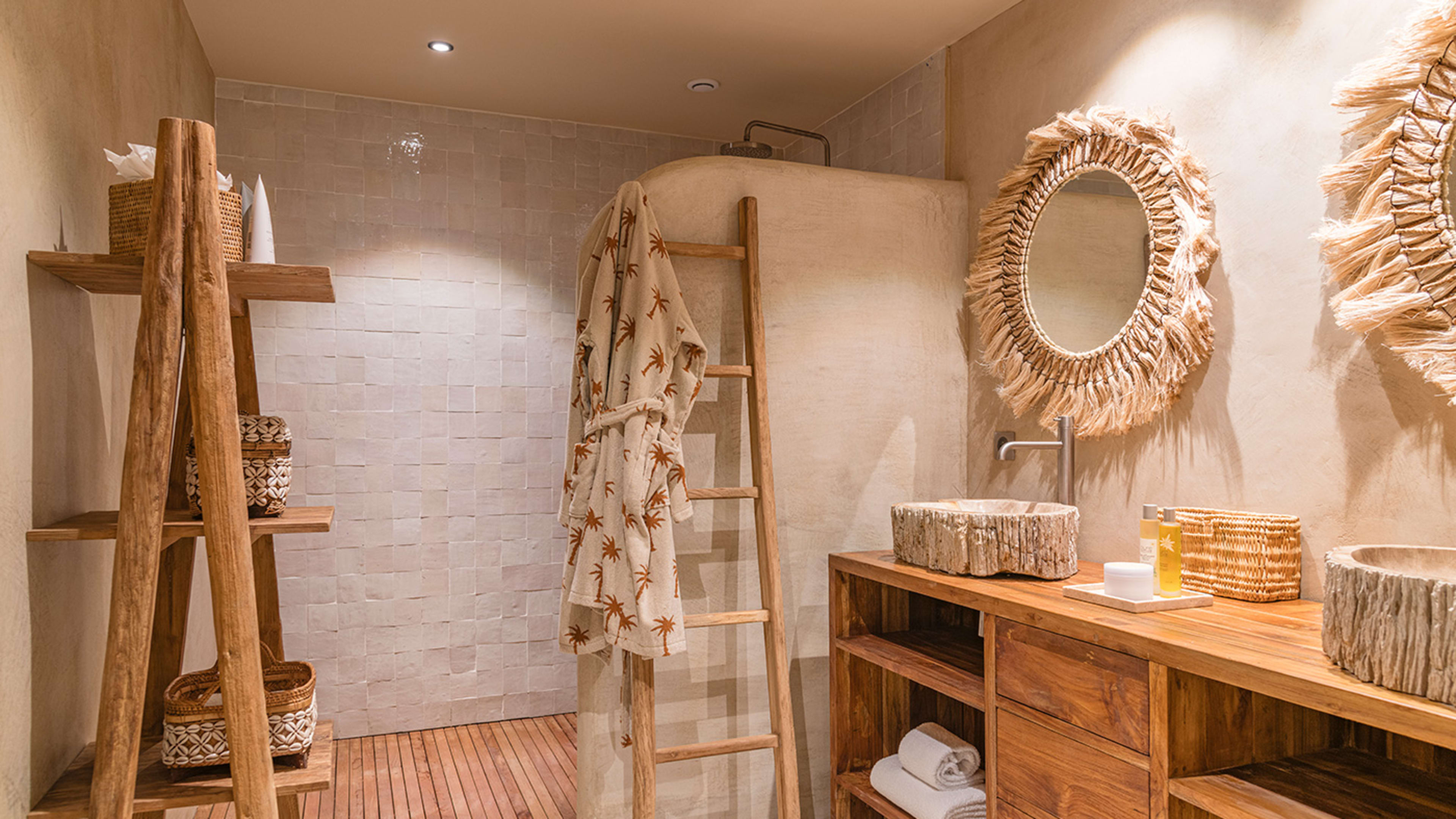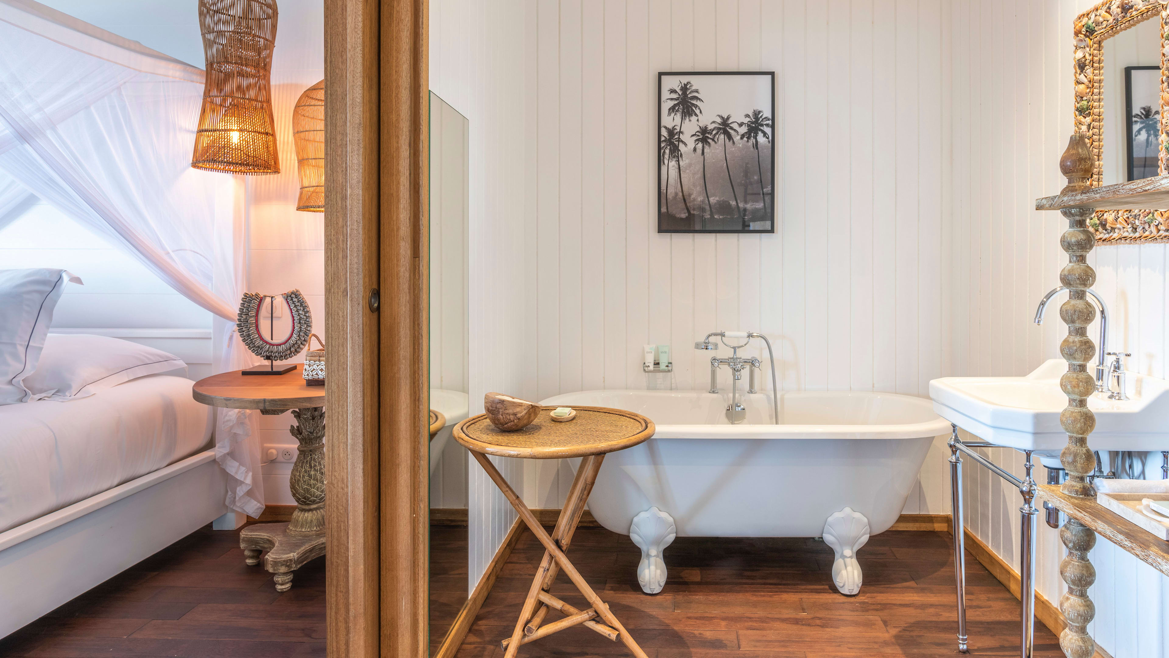 All Gyp Sea’s rooms have beautiful views of either the gardens or ocean, but none compare to the paradisiacal panoramas of the Master Villas. The two double bedrooms, indoor lounge area and ensuite bathrooms have the same bohemian take on colonial style as the rest of the hotel; brightly-patterned cushions lie on white wicker chairs, handmade Indonesian seashell mirrors hang opposite a classically elegant roll-top bath tub and artisanal furnishings stand next to upscale upholstery. Outside, there’s a private 10-meter swimming pool, deck with a dining area and ample sunloungers with sun-kissed views.