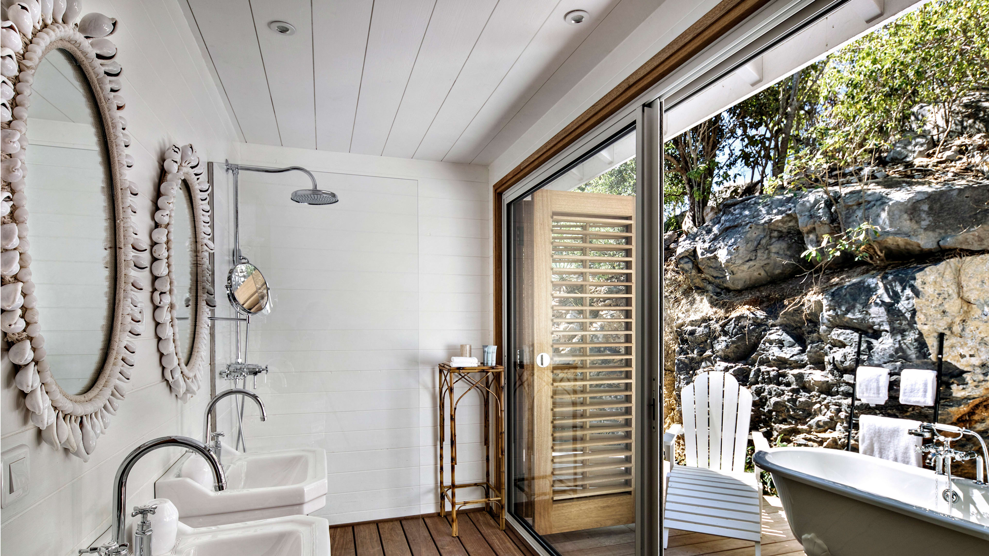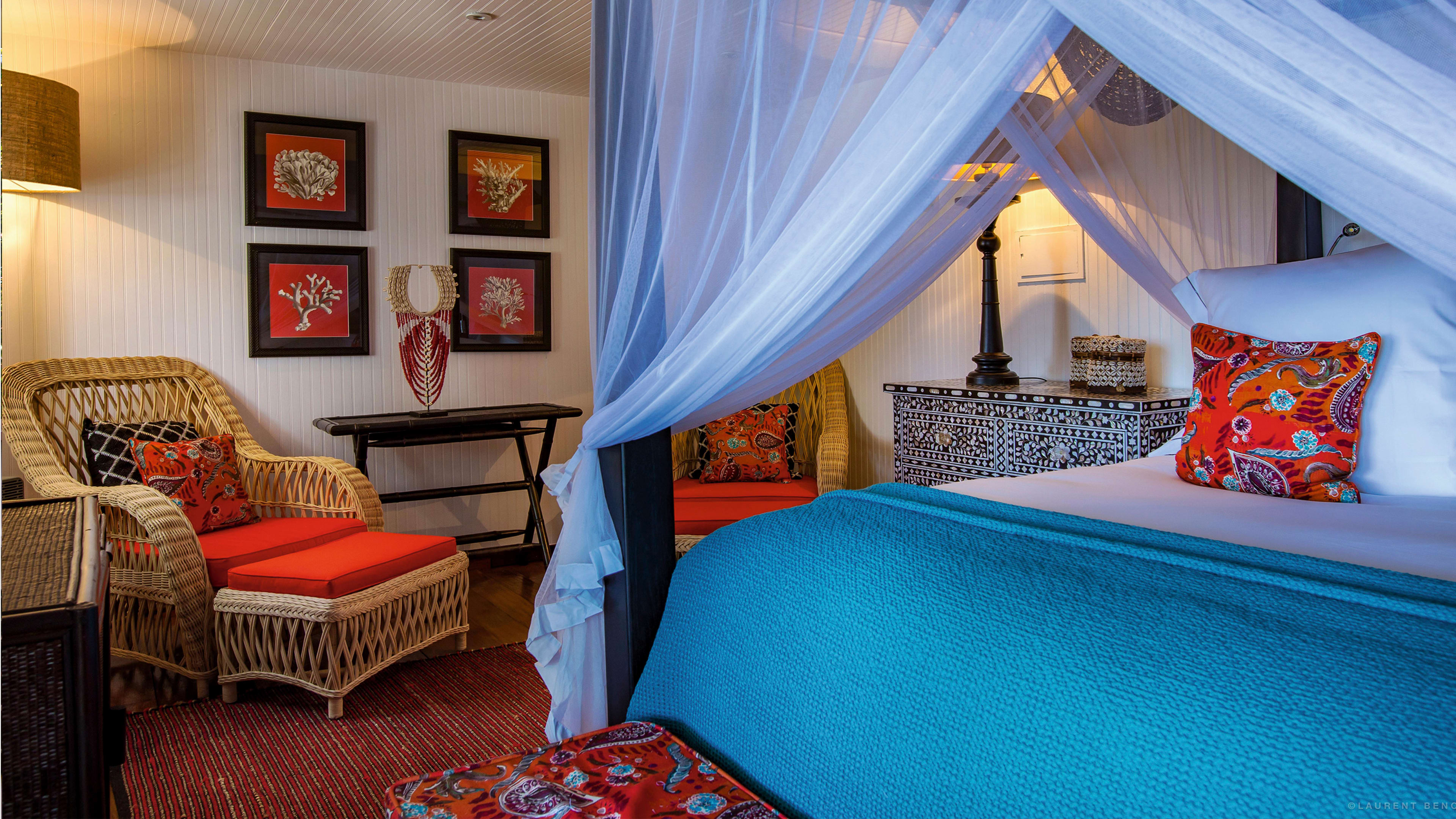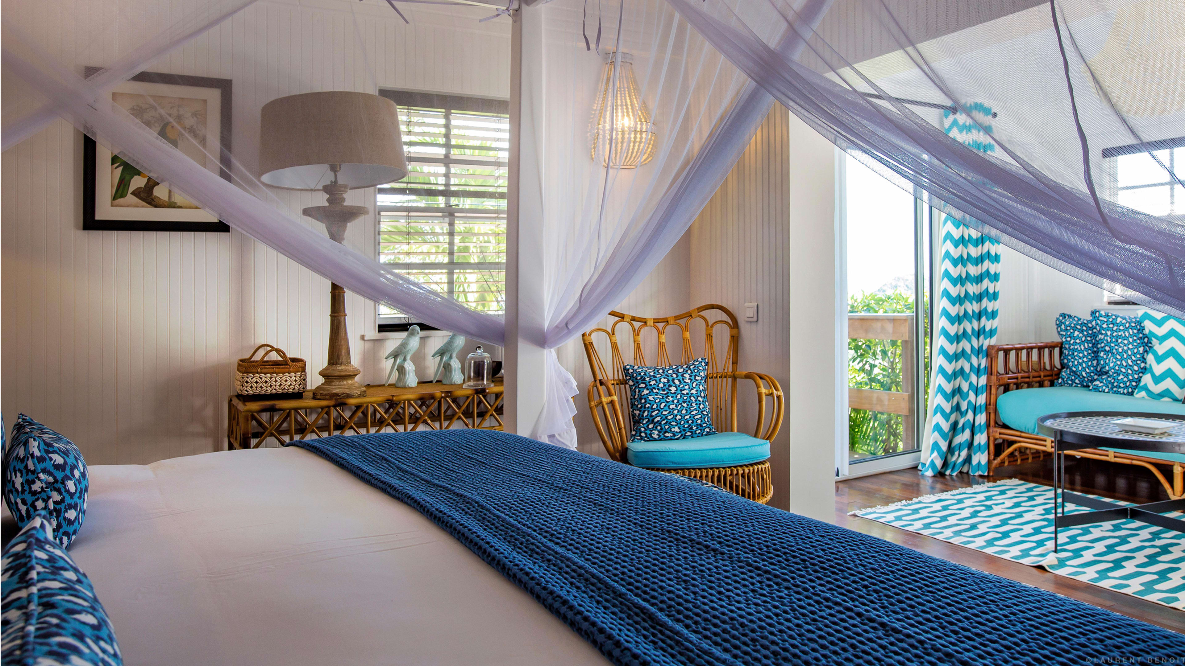 All Gyp Sea’s rooms have beautiful views of either the gardens or ocean, but none compare to the paradisiacal panoramas of the Master Villas. The two double bedrooms, indoor lounge area and ensuite bathrooms have the same bohemian take on colonial style as the rest of the hotel; brightly-patterned cushions lie on white wicker chairs, handmade Indonesian seashell mirrors hang opposite a classically elegant roll-top bath tub and artisanal furnishings stand next to upscale upholstery. Outside, there’s a private 10-meter swimming pool, deck with a dining area and ample sunloungers with sun-kissed views.