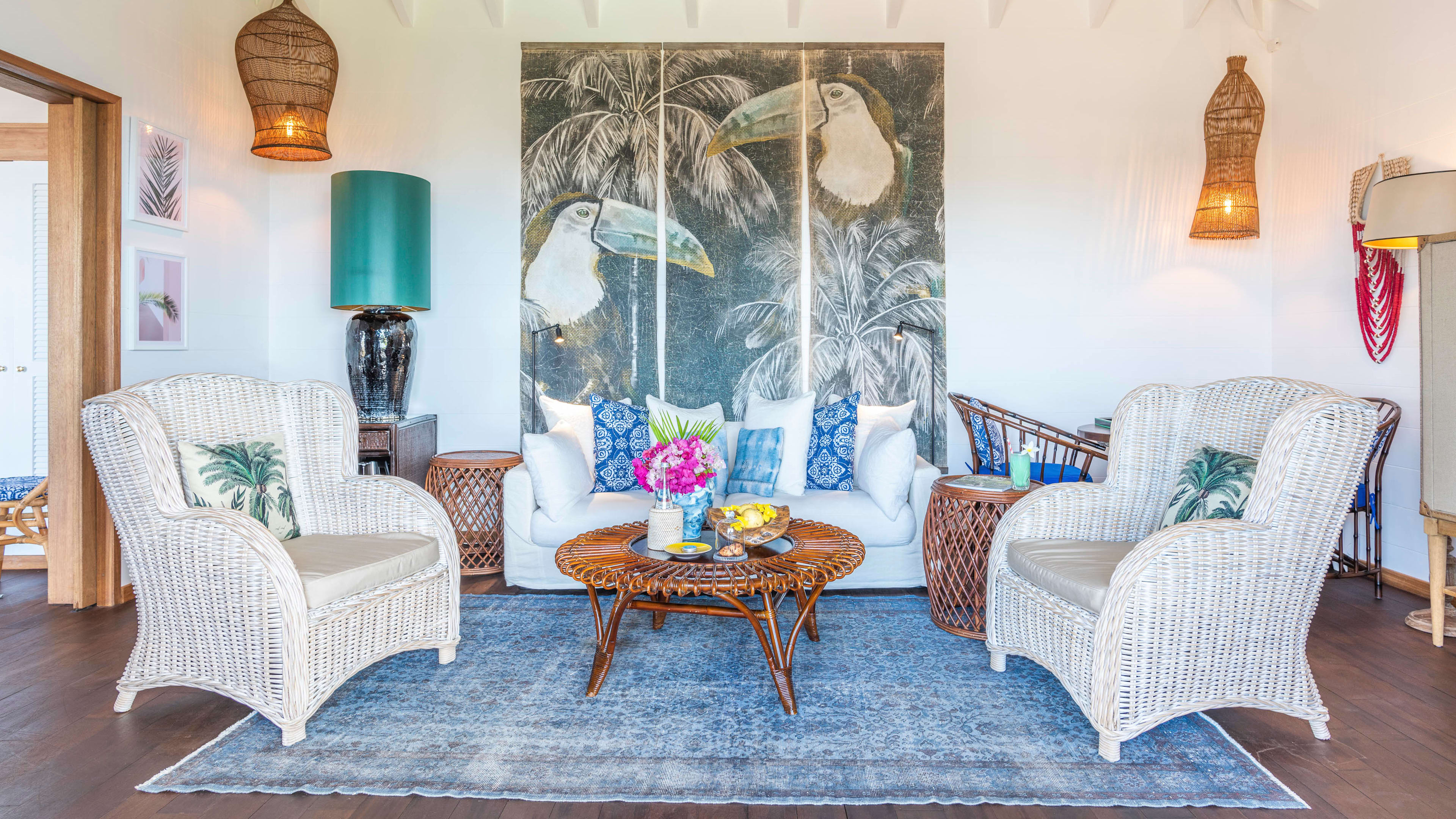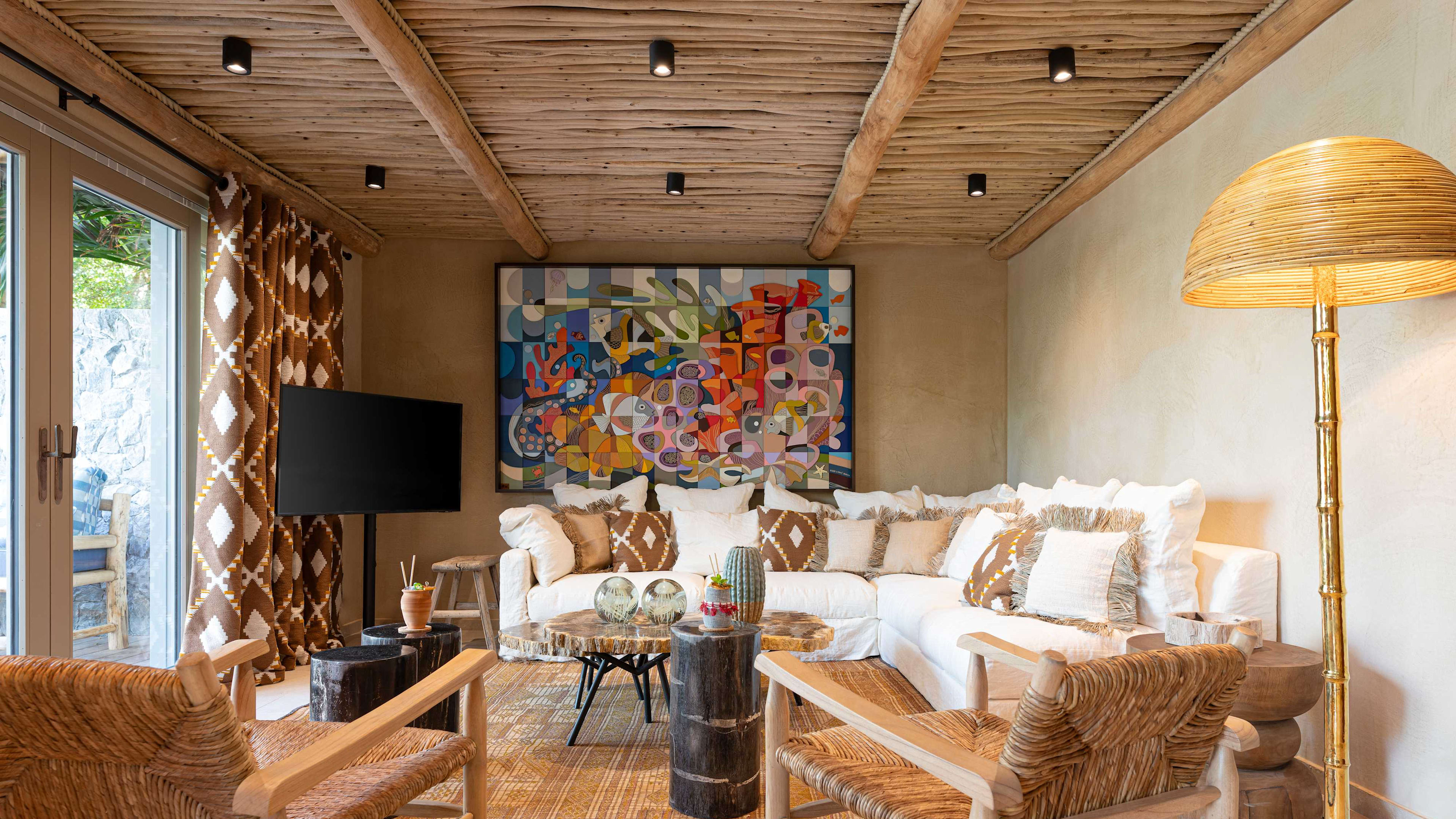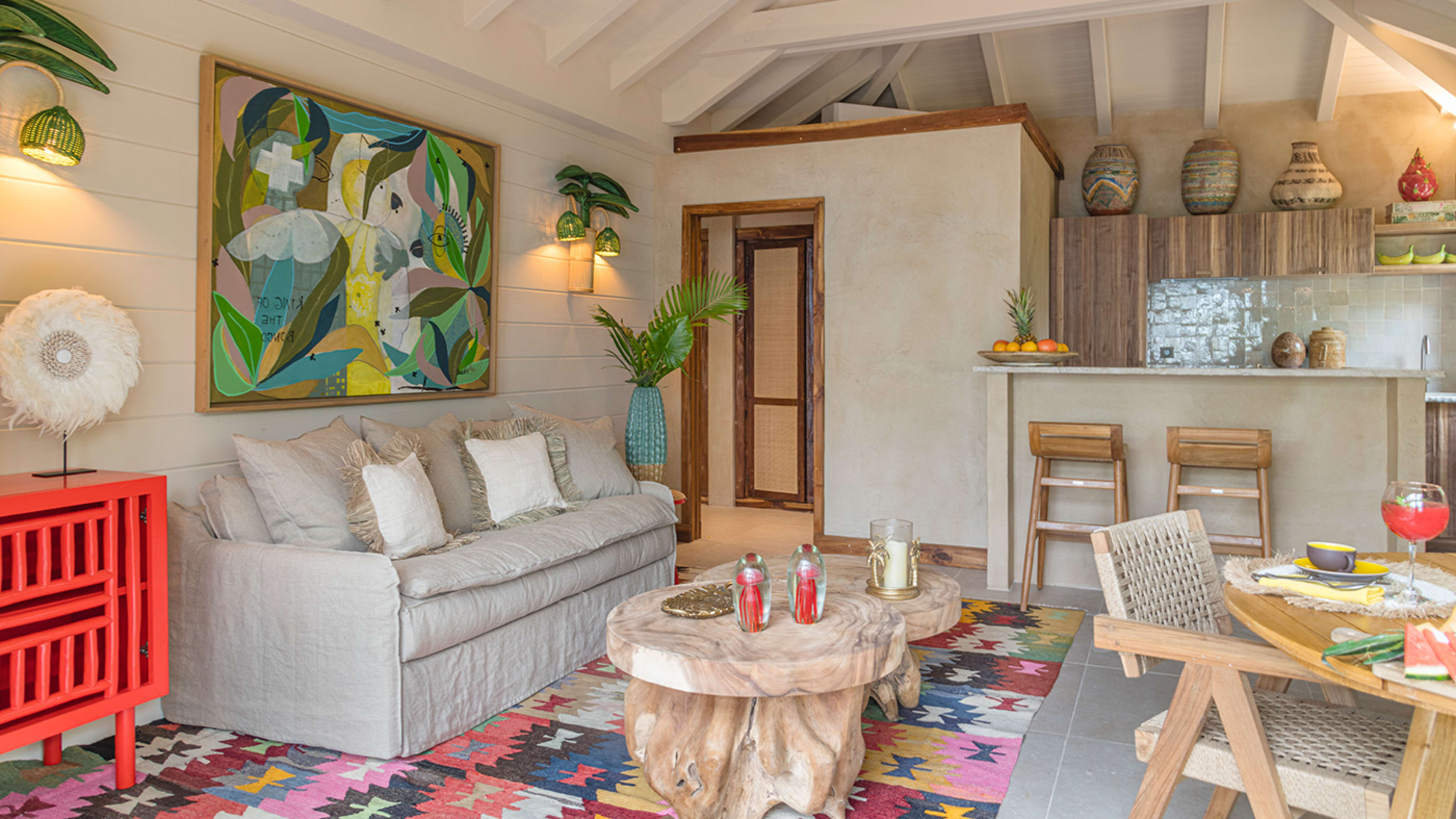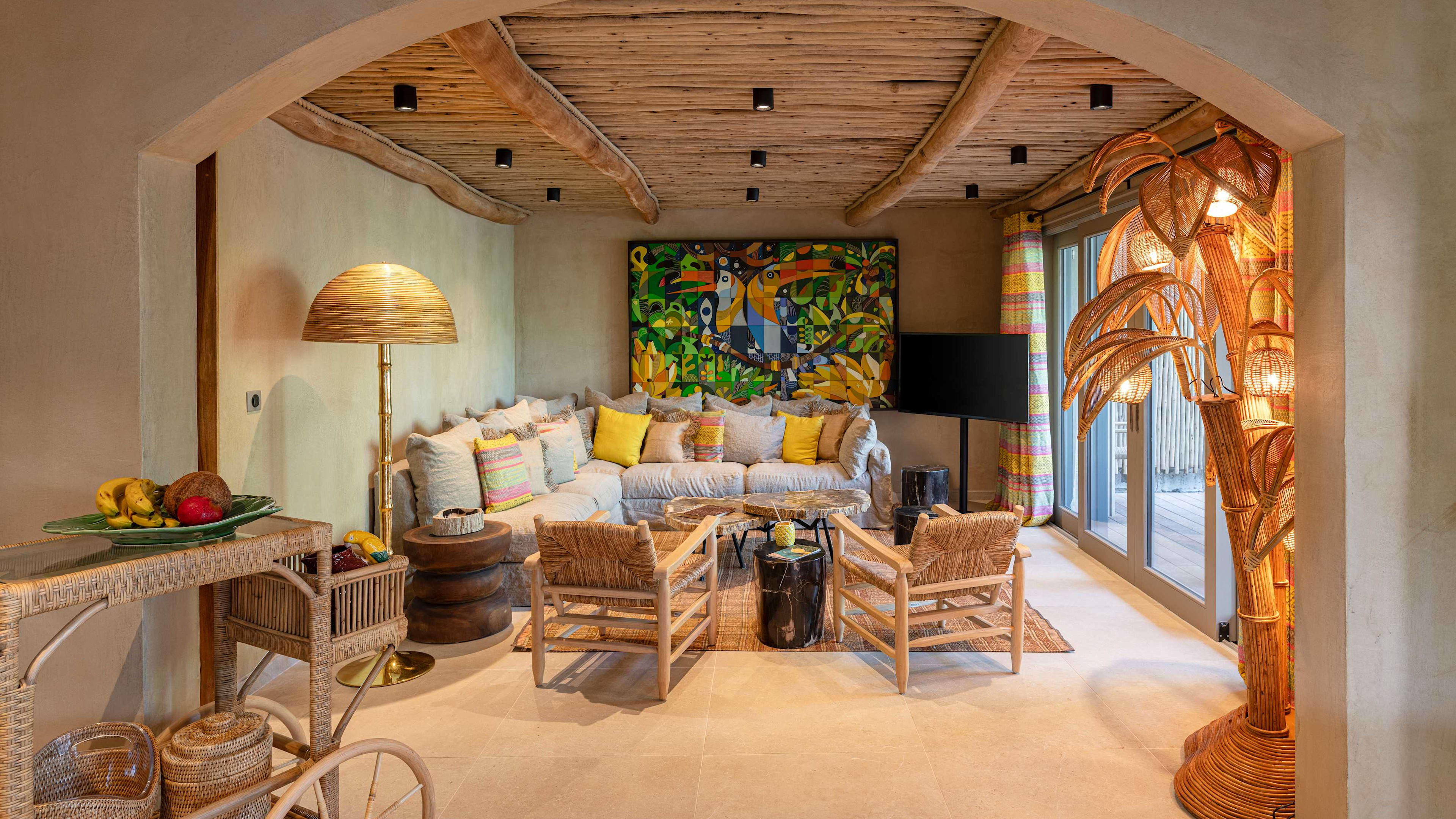 Cacti, mango trees and blooming bougainvillea surround the outdoor pool area that’s more vivid than a Pantone colour guide. Take a refreshing dip in the heated turquoise pool, then let the sun shine down on you as you recline below a lemon-yellow parasol, gazing up at clear-blue skies and lush green foliage; set beneath towering palm and banana trees, there’s always a shaded spot for some sunbathing.