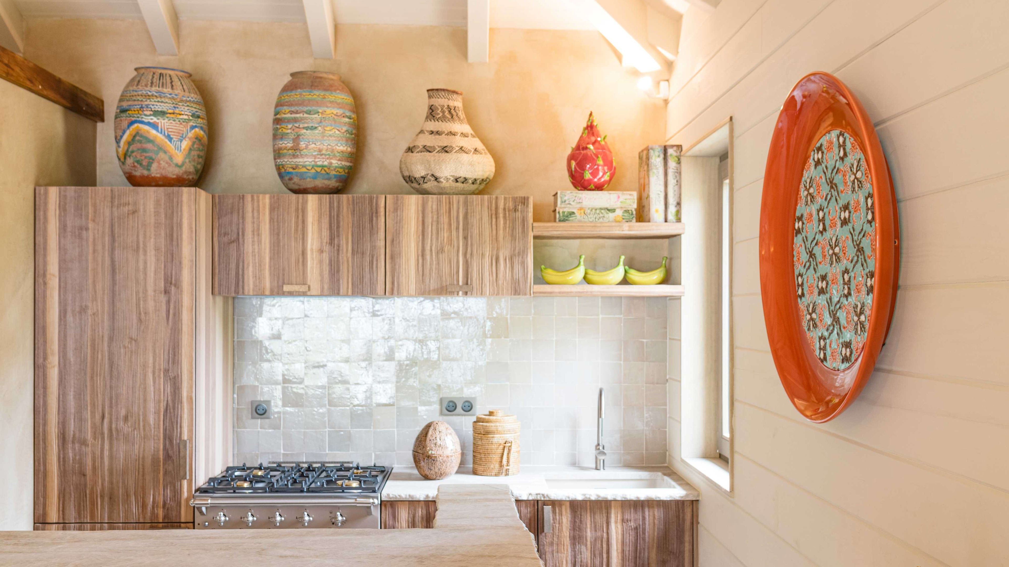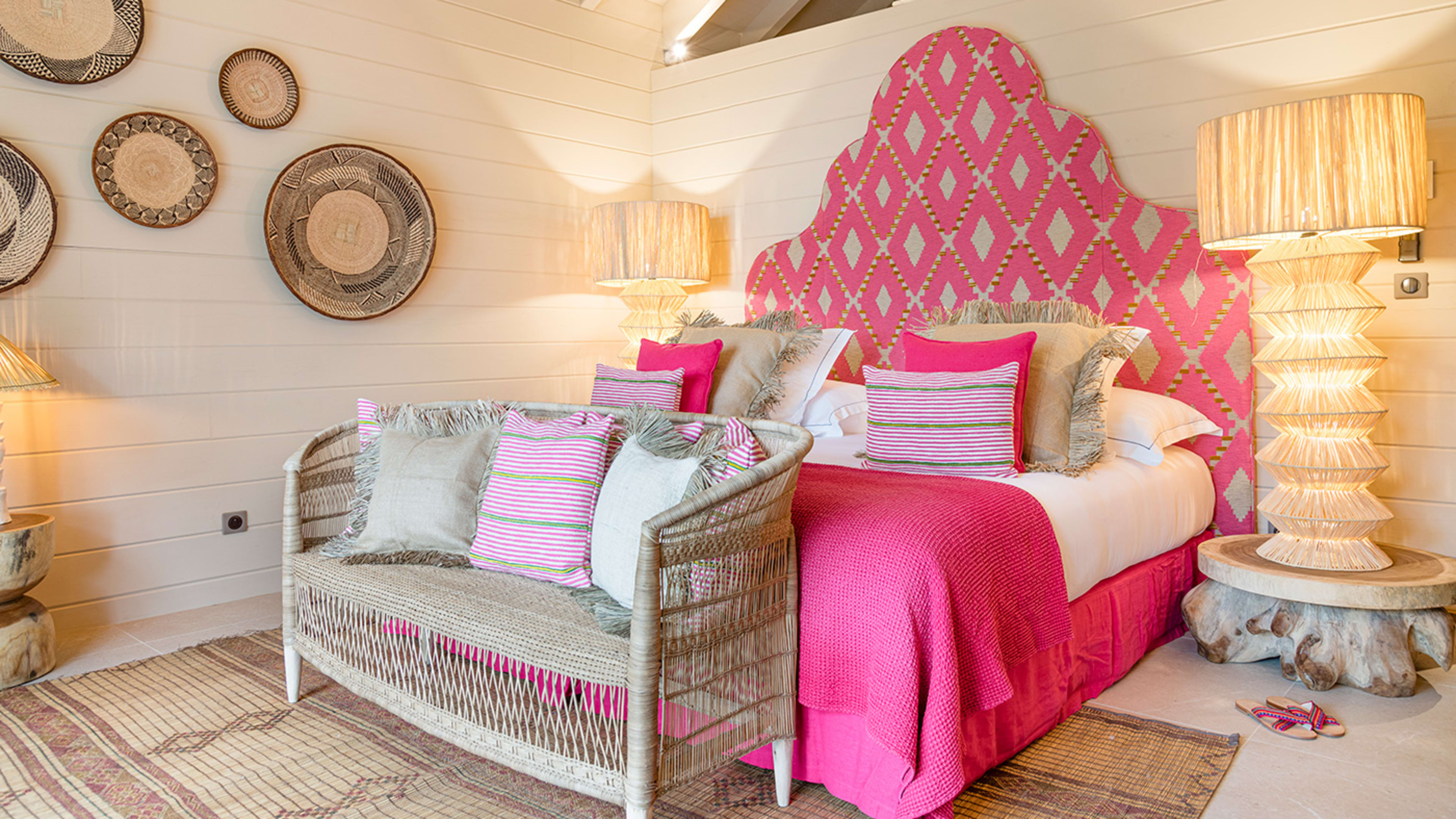 Interiors were designed by design doyenne Jocelyne Sibuet and her daughter, Marie; the furnishings and fabrics come from destinations near and far, with chests of drawers from Jaipur, tables from Indonesia and fabrics from Peru, Pakistan and Tunisia.