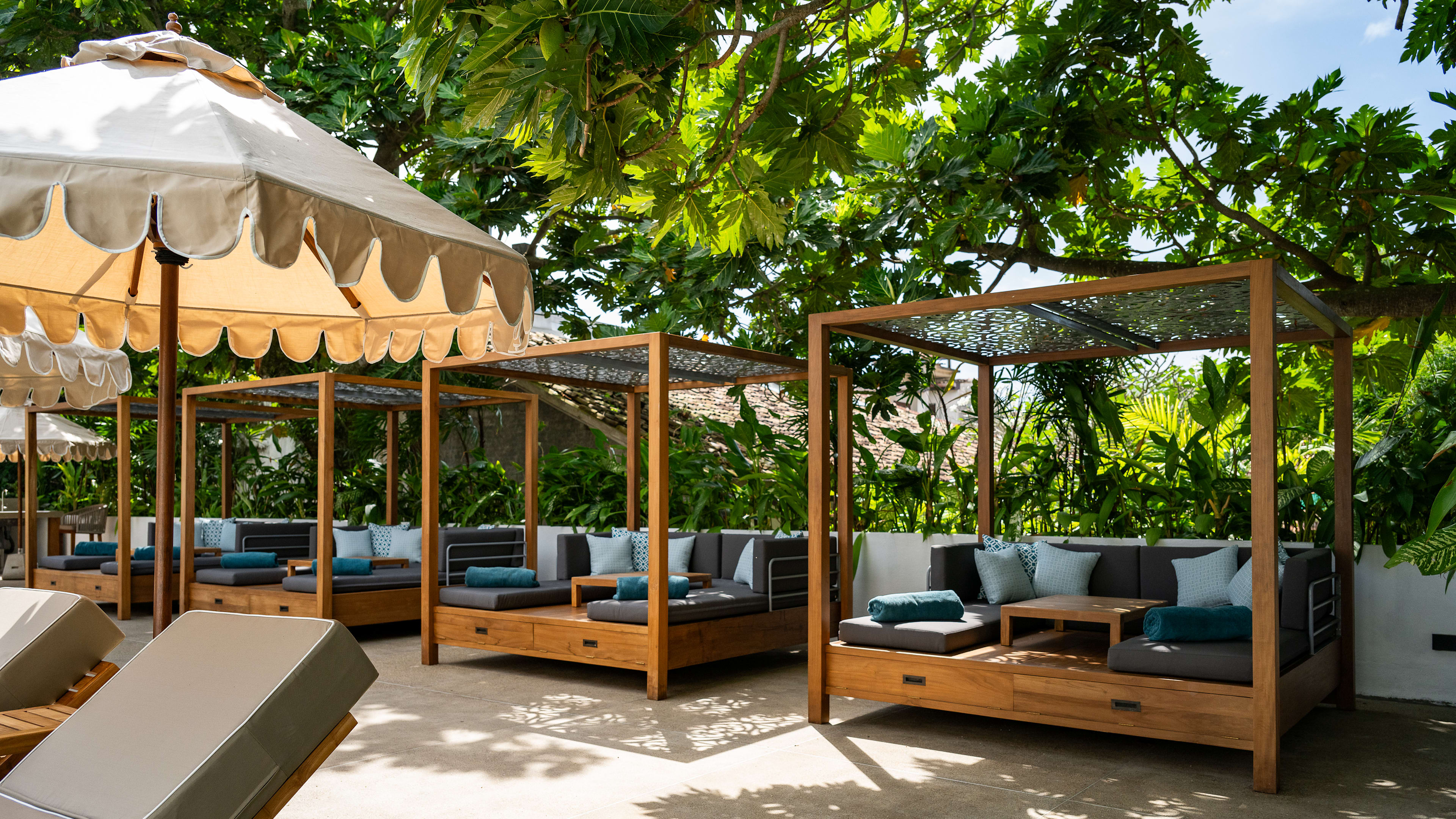 Set in lush gardens there's a L-shaped pool flanked by sunloungers and shaded daybeds.