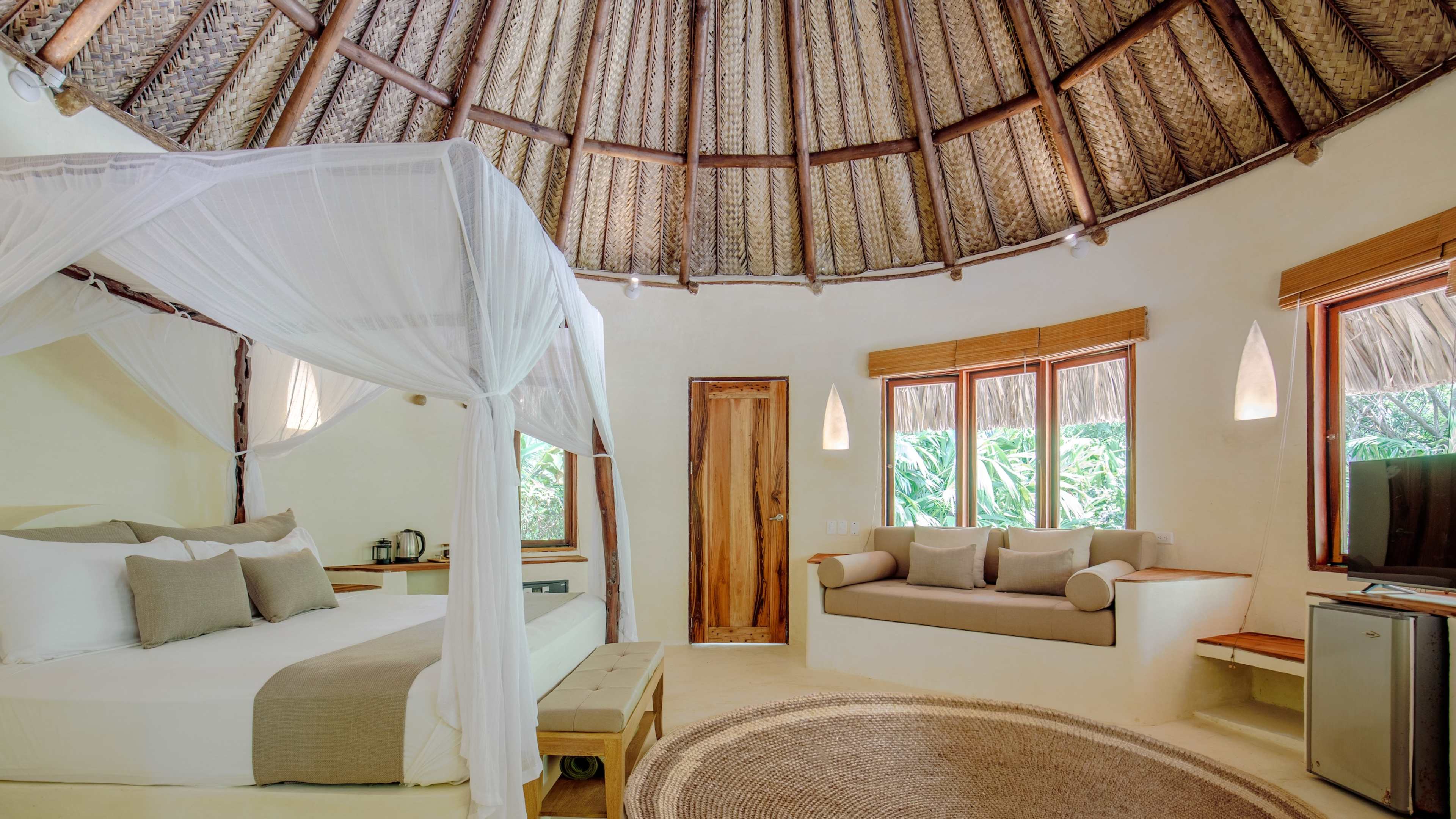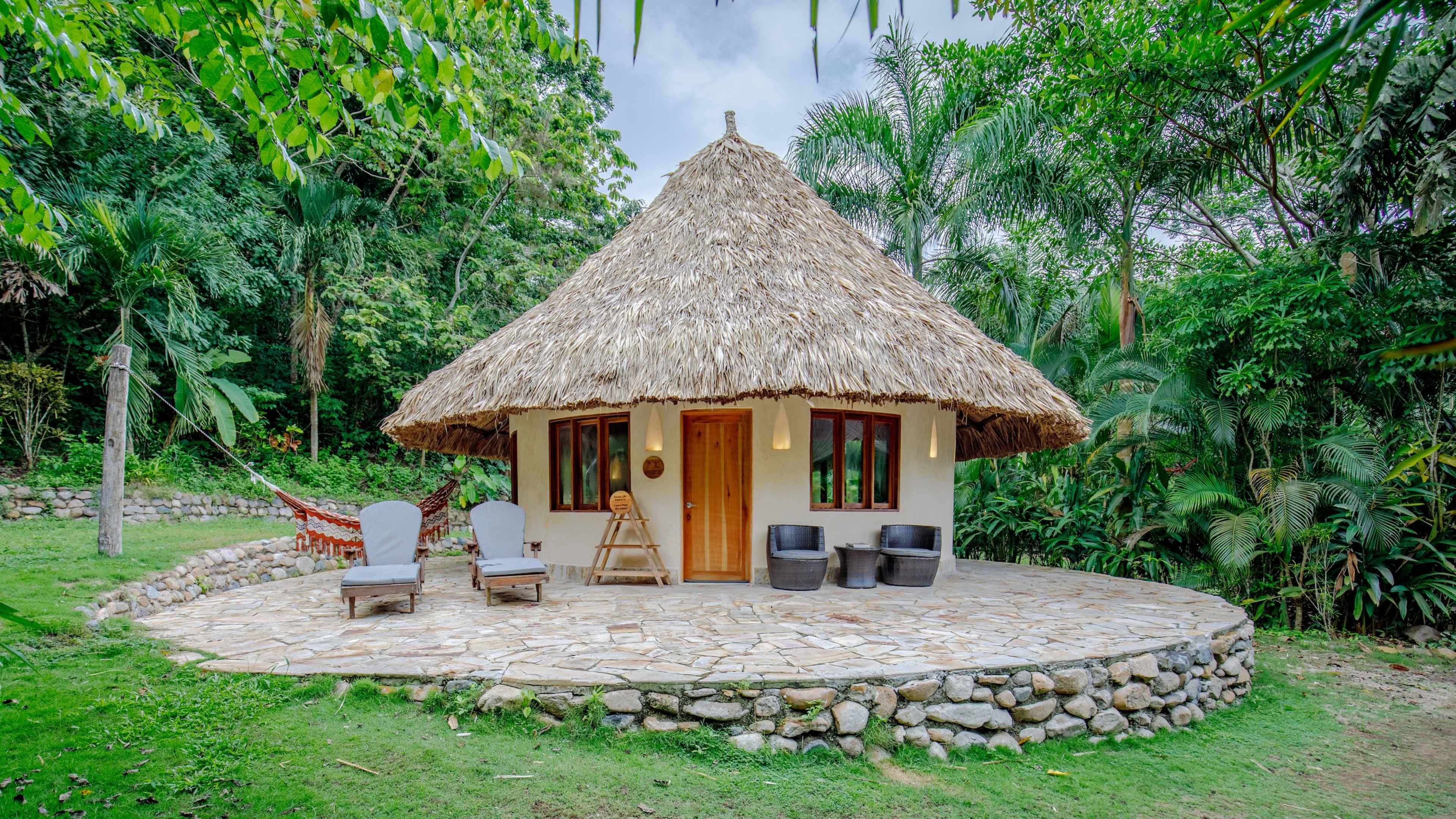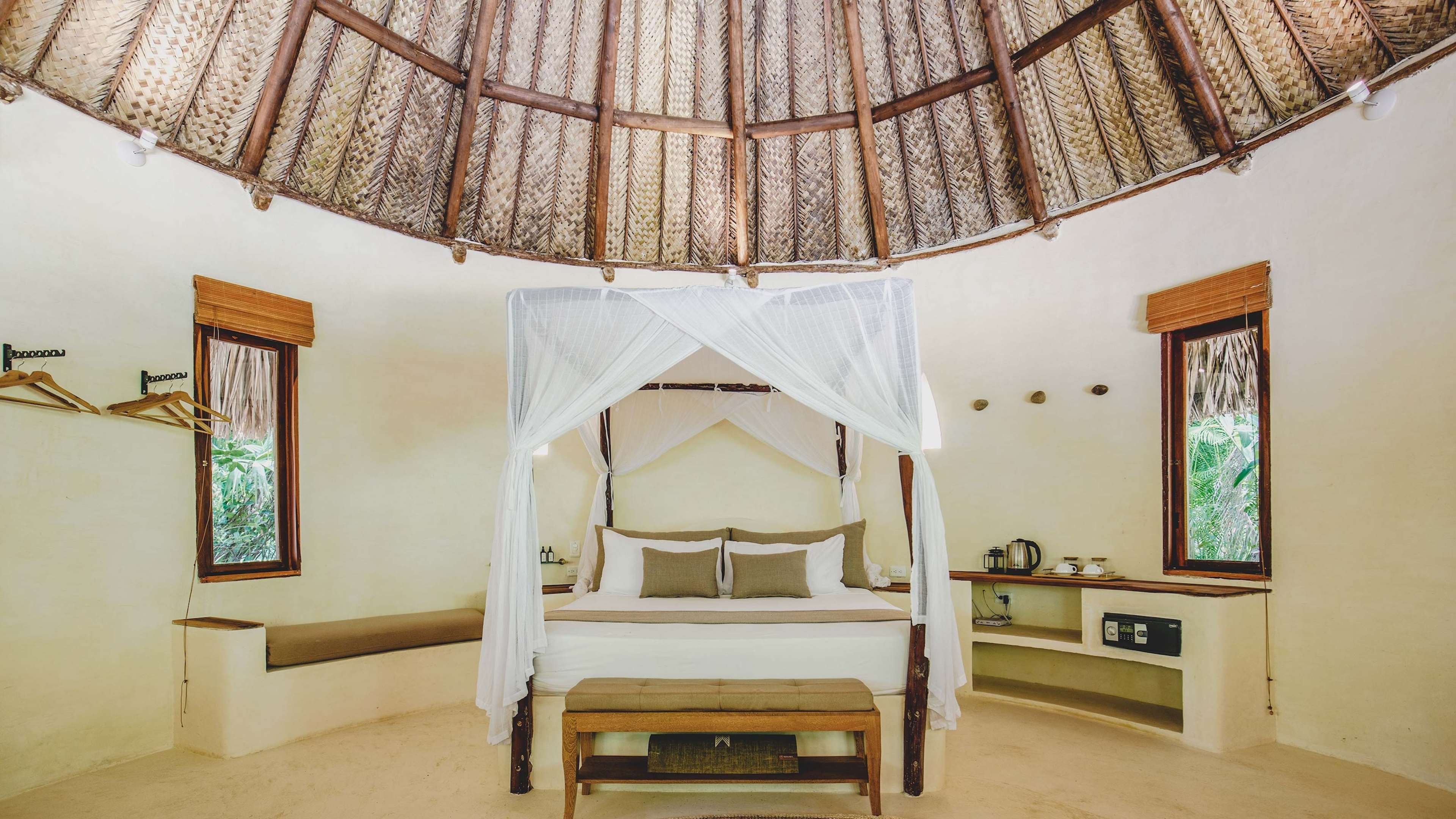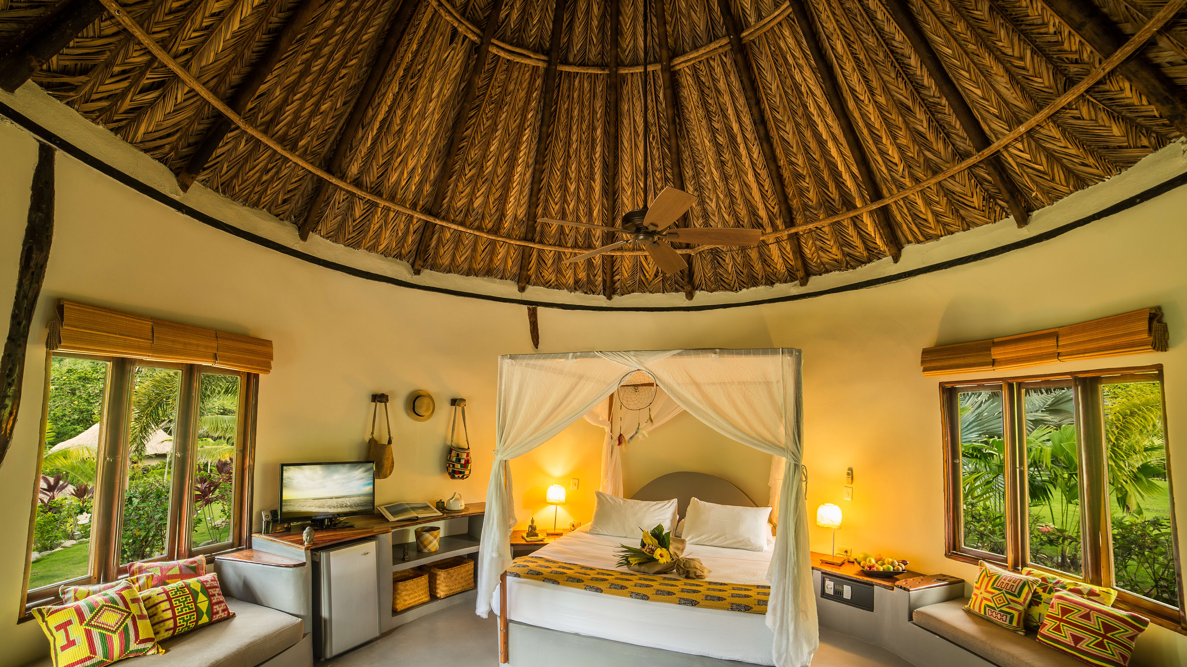 Each thatched, Bilbo Baggins-approved bolthole has a similar design, with ceiling fans, a circular shape, and a mosaic-lined hot tub, shower, and some hammocks and sunloungers outside. The main difference is whether you want one king-size bed or two queens. For the most privacy, book the room at the furthest end of the plot.