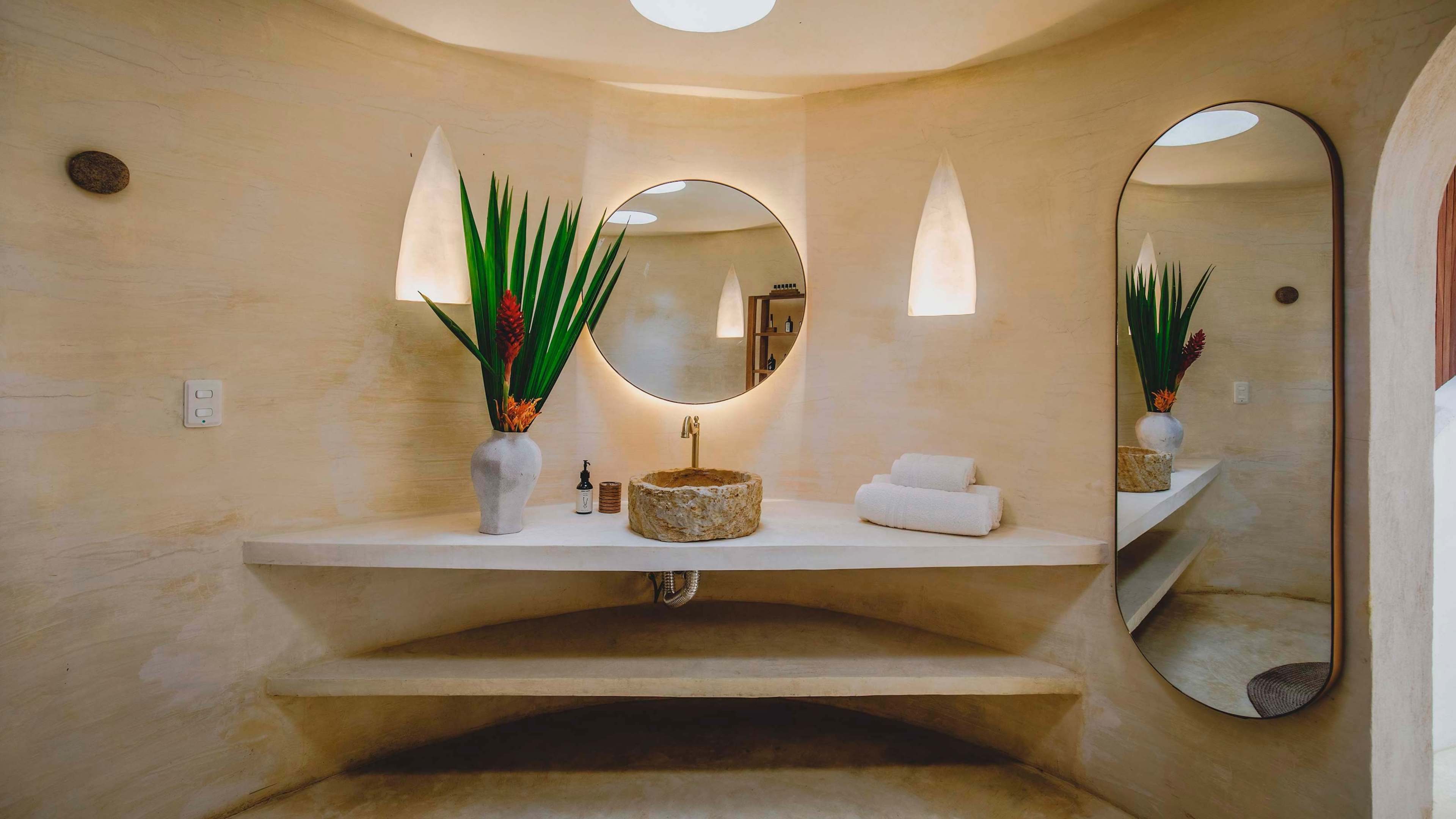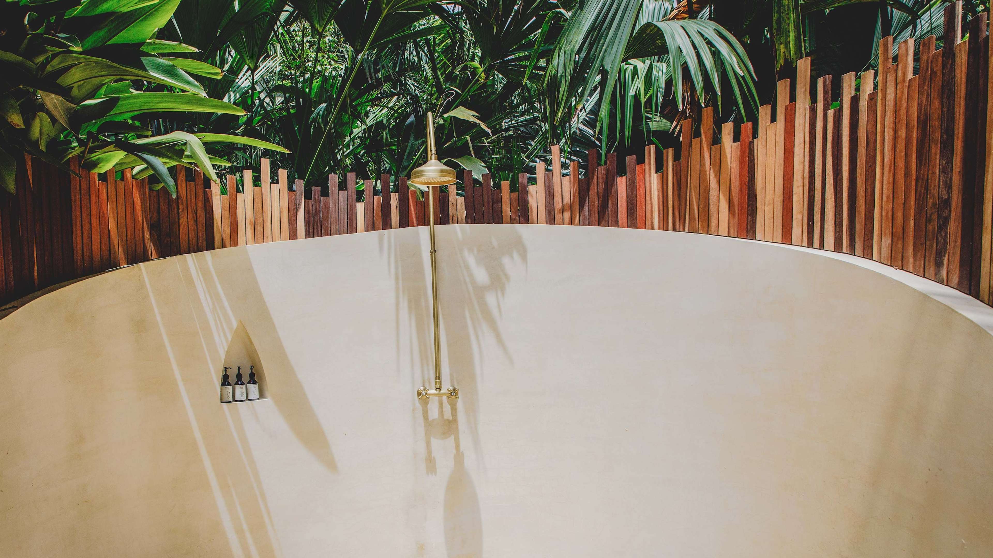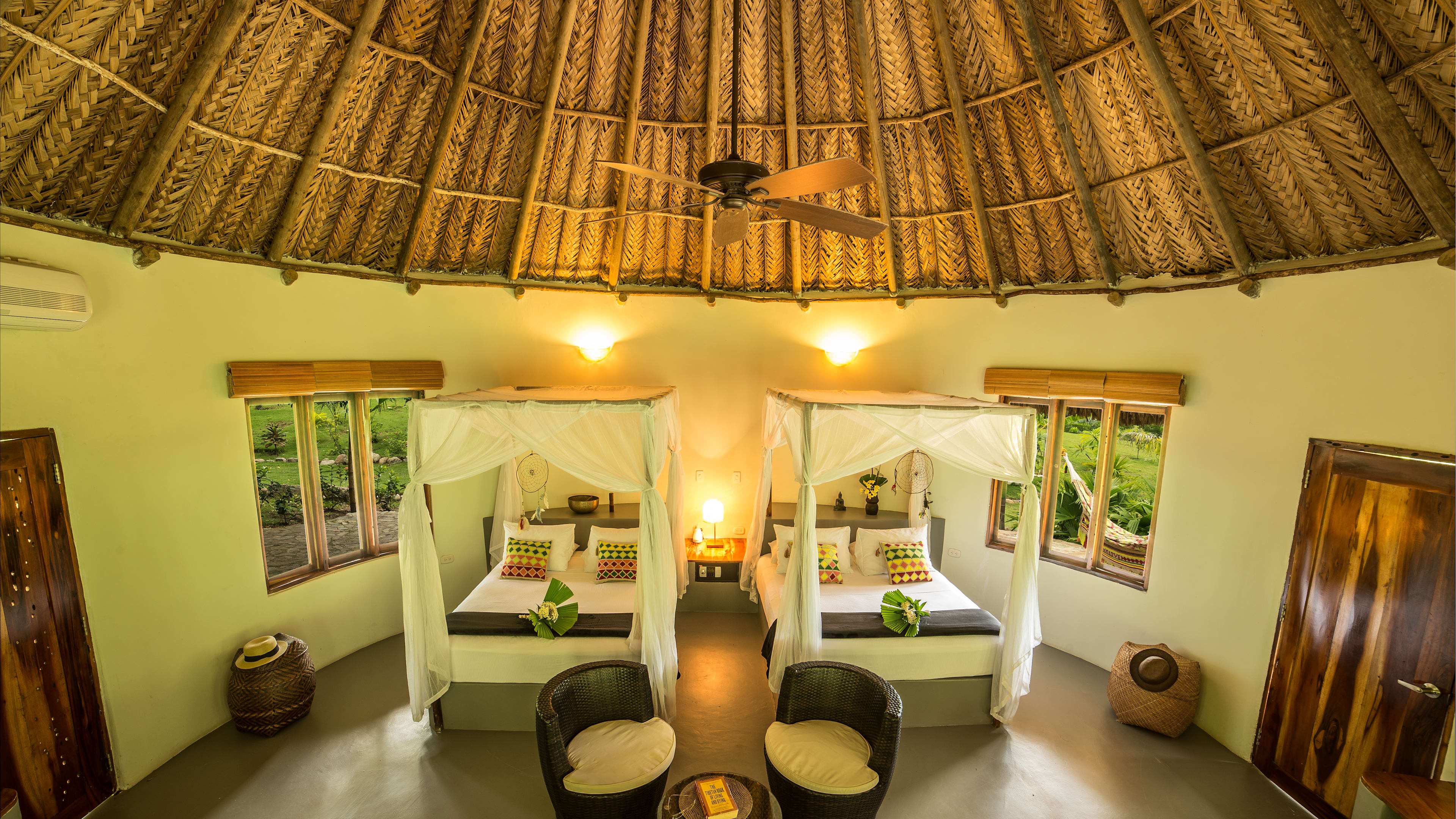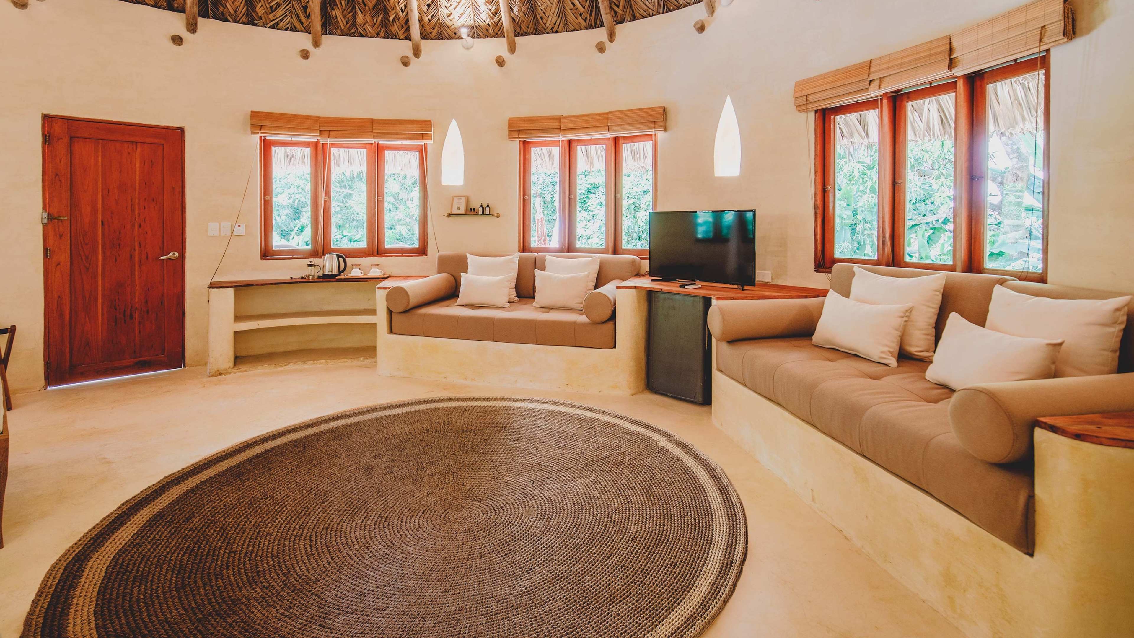 Each thatched, Bilbo Baggins-approved bolthole has a similar design, with ceiling fans, a circular shape, and a mosaic-lined hot tub, shower, and some hammocks and sunloungers outside. The main difference is whether you want one king-size bed or two queens. For the most privacy, book the room at the furthest end of the plot.