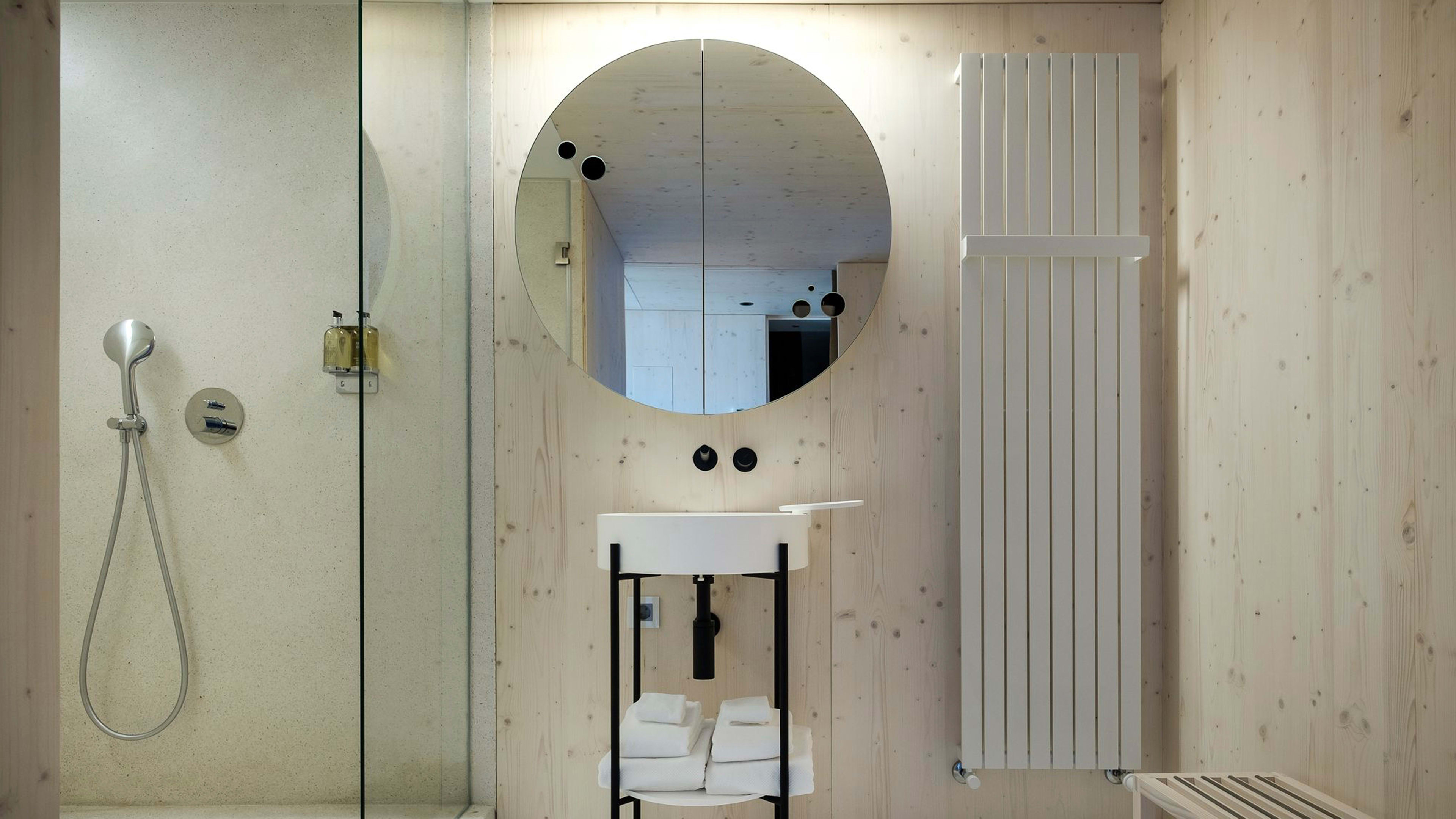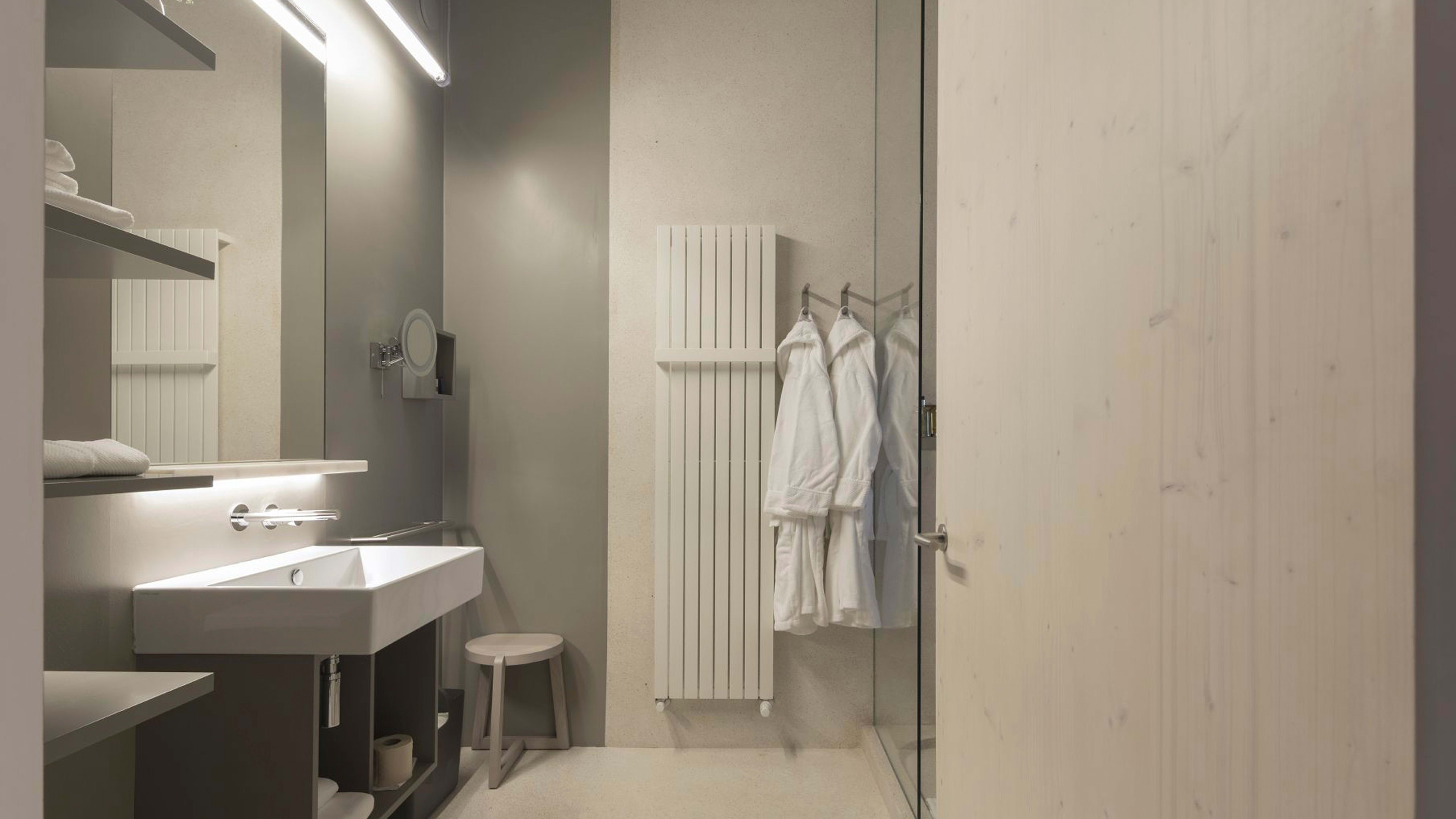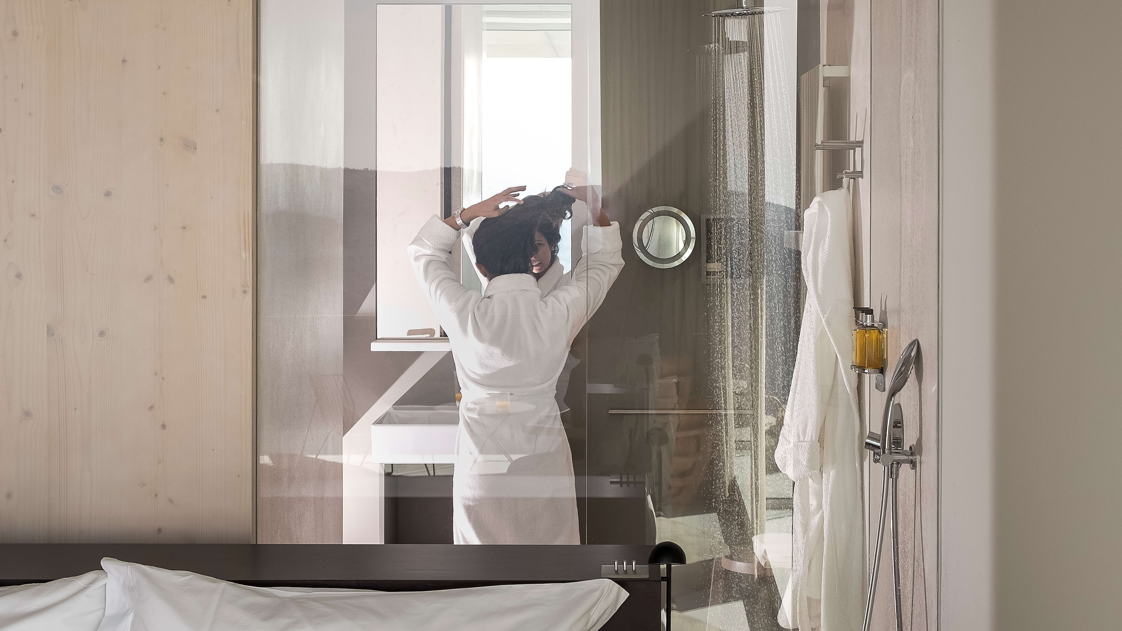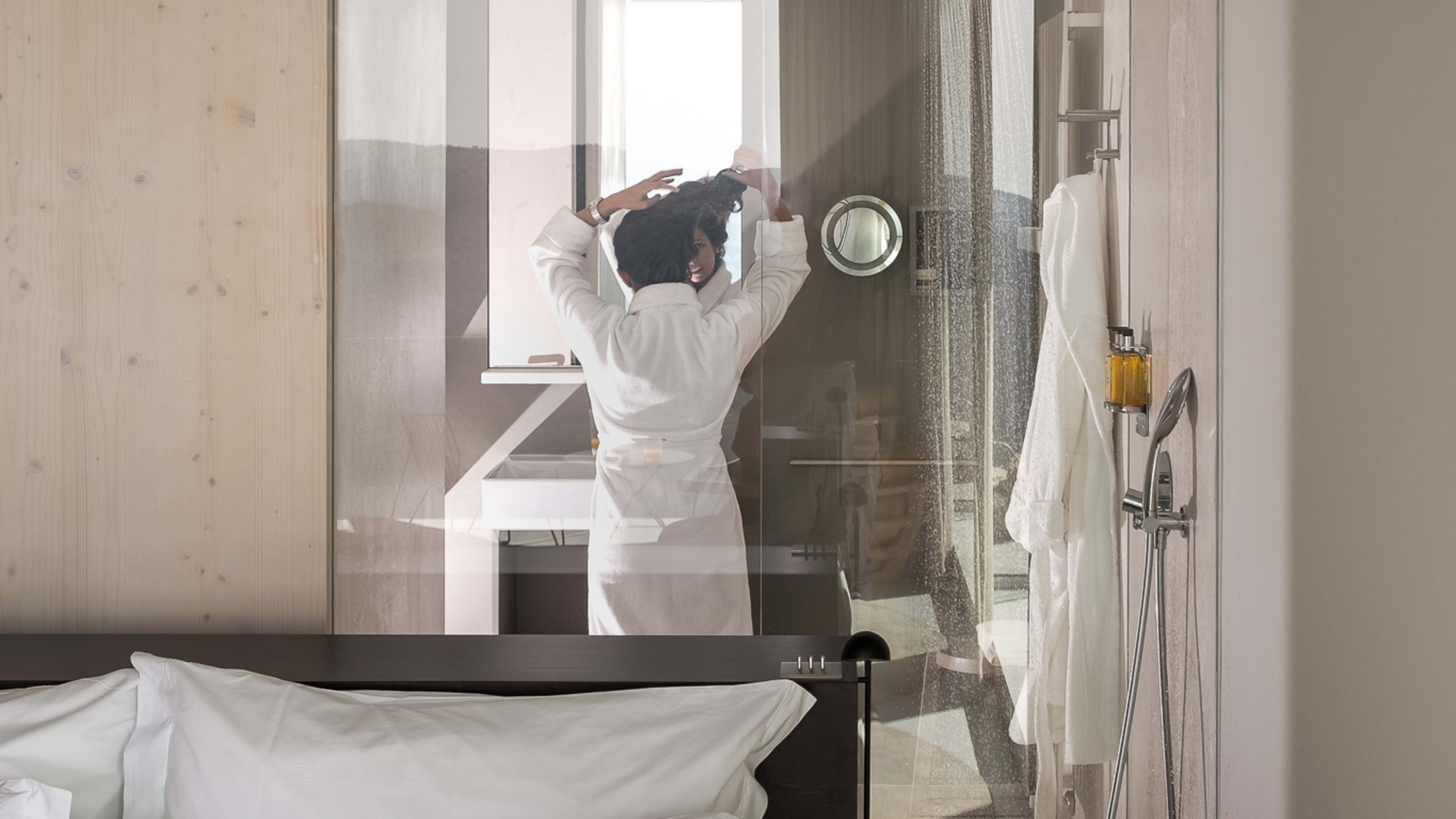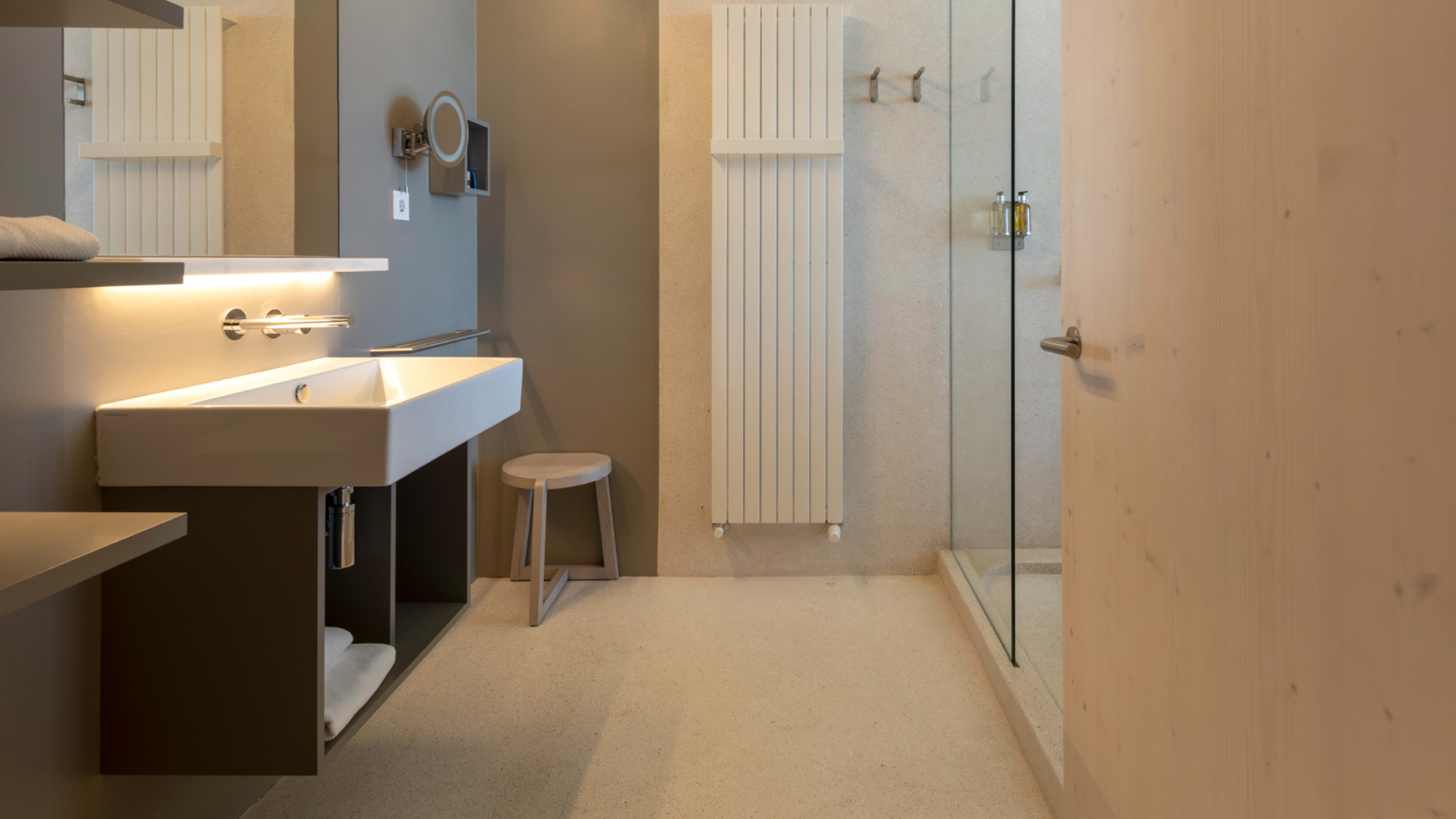 The heated swimming pool is fed by a natural spring and surrounded by floor-to-ceiling windows that look out over meadows and mountains in summer or swathes of snow in winter. You can swim between the indoor and outdoor areas to feel the crisp mountain air or lie supine on a sunlounger with a good book. The pool is open from 8am to 8pm daily. Children are welcome in the pool until 6pm – it’s adults-only after that.