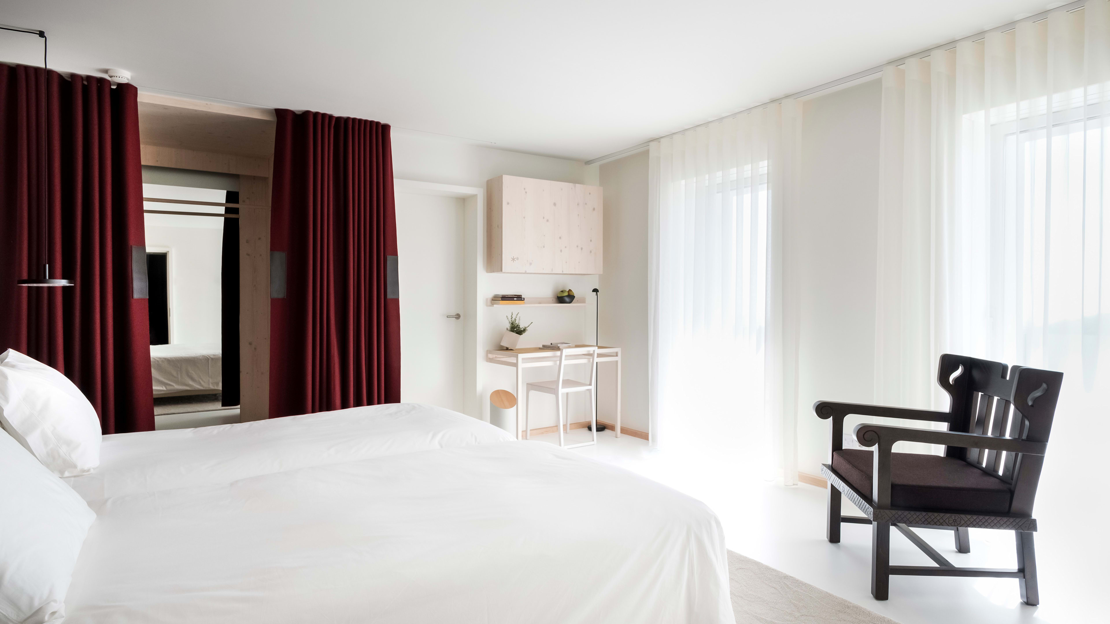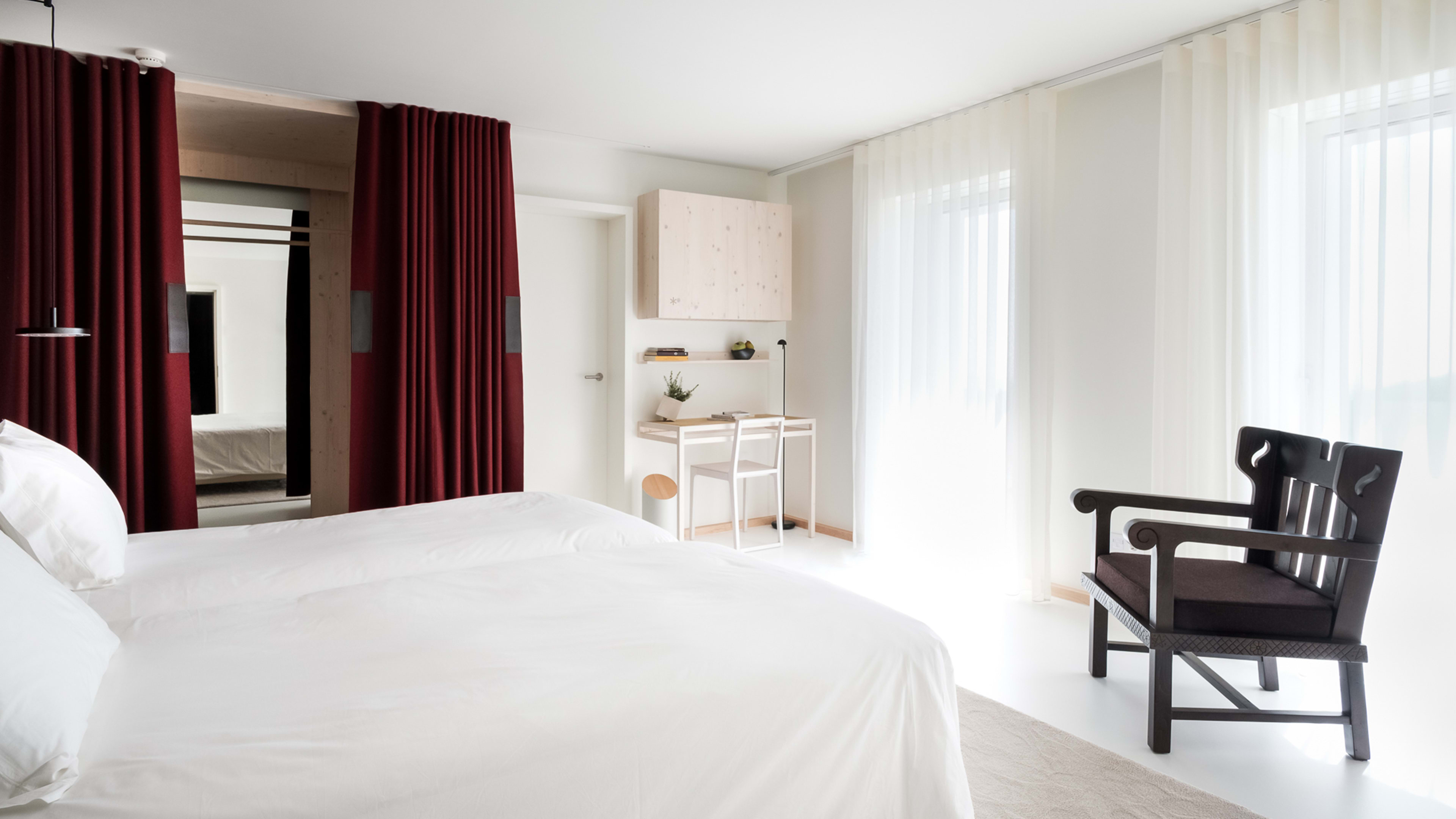 Just off the restaurant, the lounge has comfy armchairs positioned around a roaring central fireplace. This is the spot for curling up with a book or chatting to fellow guests in the evenings. The bar serves an inventive menu of cocktails made with herbal and mineral mountain ingredients. There are excellent bar snacks, too – choose from gamey sausages with apple purée, ham and goat’s cheese sandwiches or fresh salads.