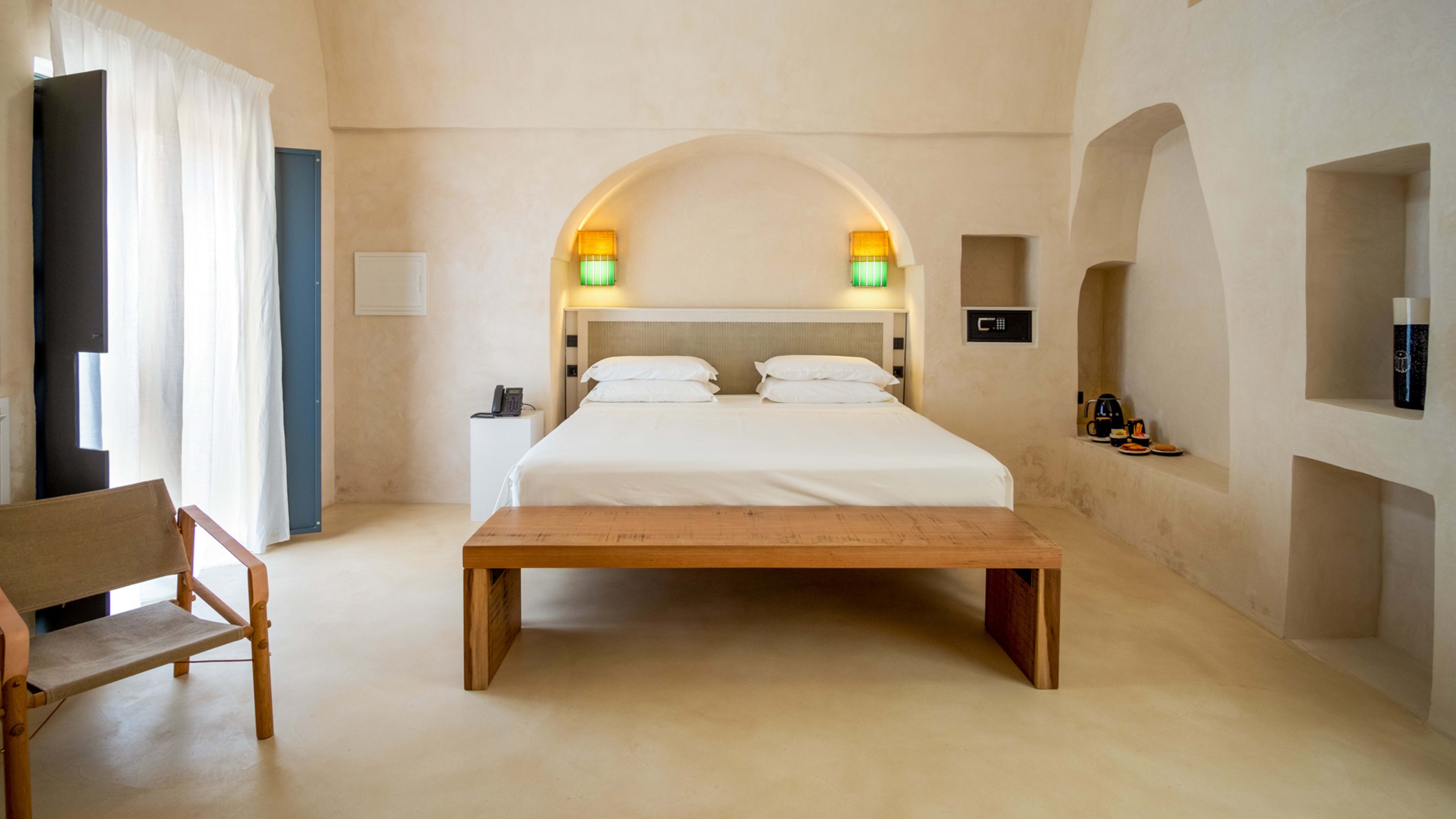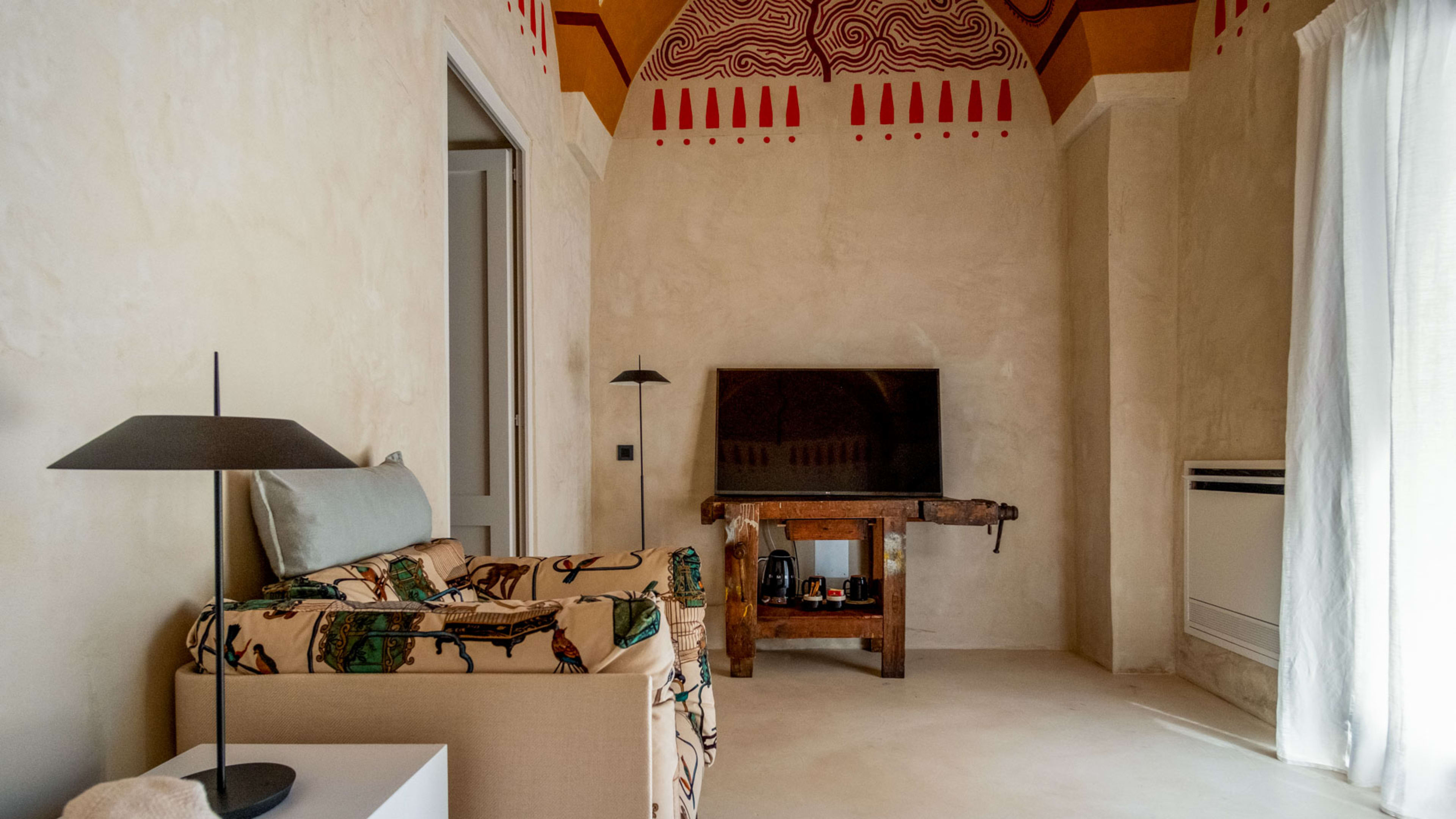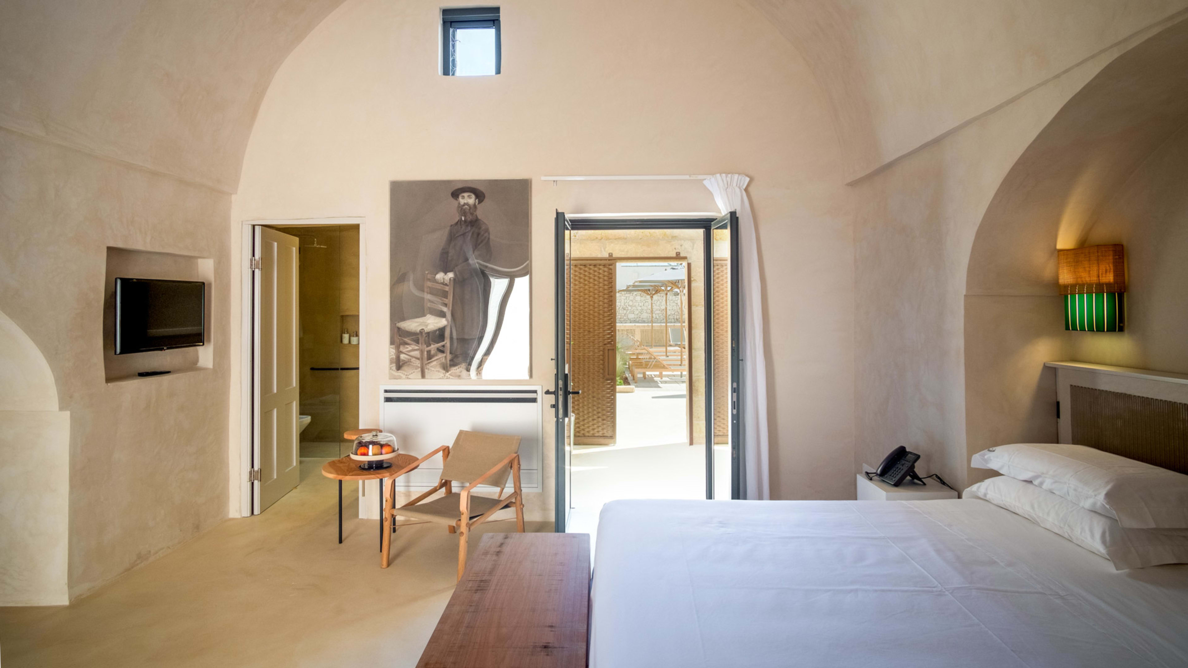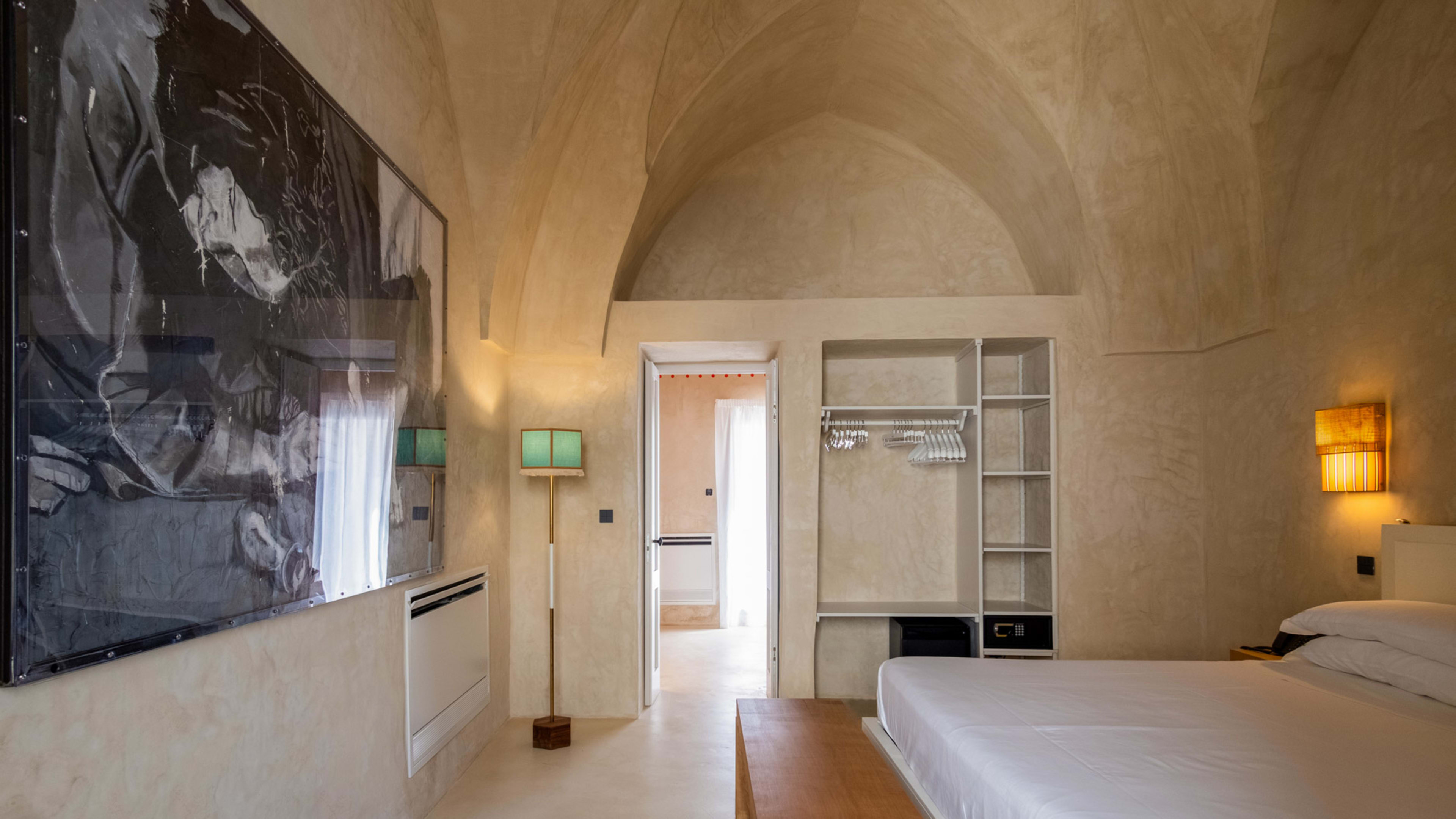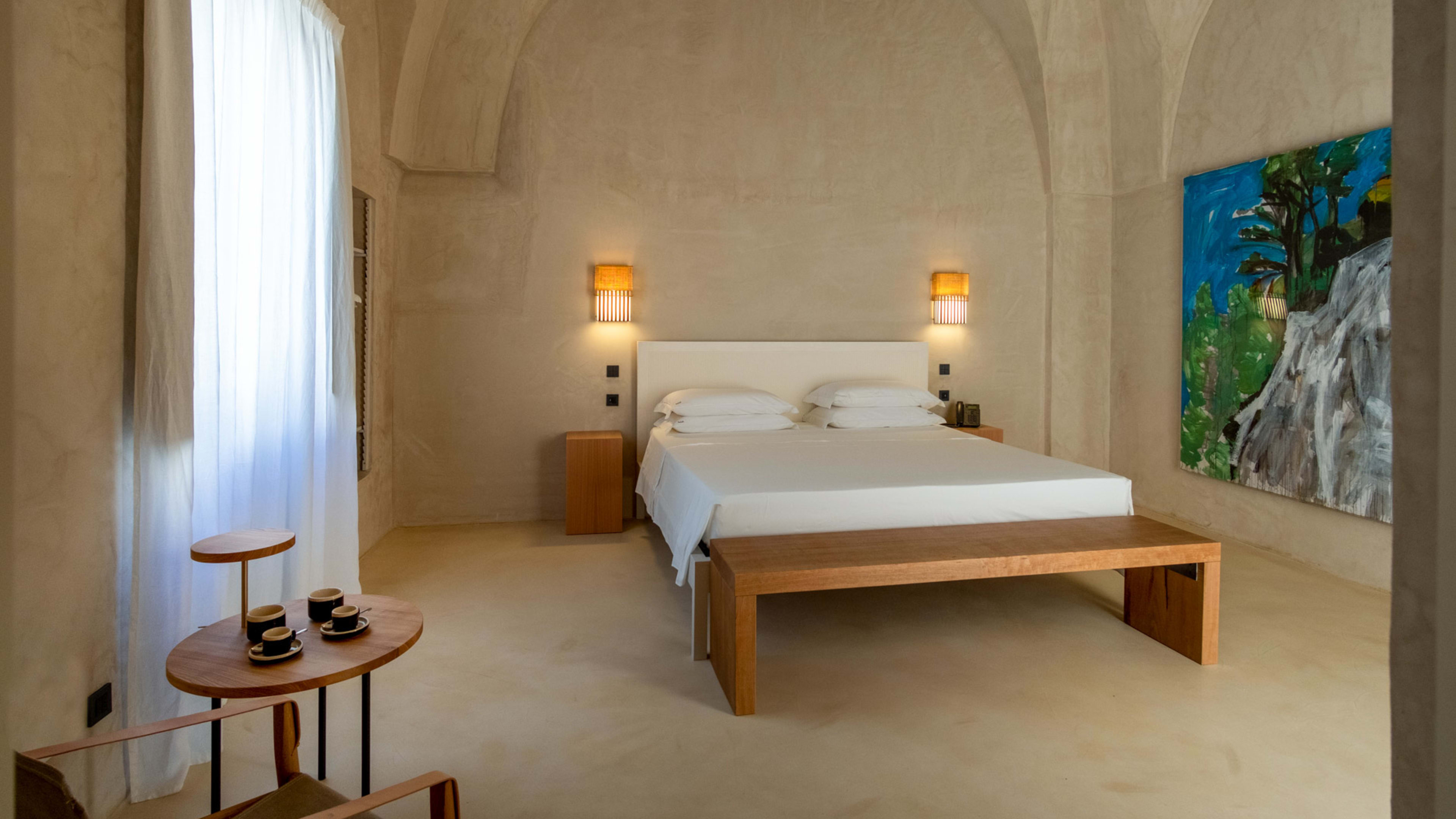 Paying homage to ancient Roman building techniques, most of the bedrooms at I Tre Bacili have high vaulted ceilings and all use traditional cocciopesto rendering techniques. Sizable works of contemporary art create colourful focal points against clean, minimalist interiors. If you really want to live like a Caesar, go for the vast Barone Suite. Big enough to get lost in, it includes a star-vaulted parlour room that fairly pops with colour, from the designer armchair’s striking menagerie motif to the incredible ceiling fresco by artist Vincenzo d’Alba, all turmeric yellows, chilli reds and sunset oranges.