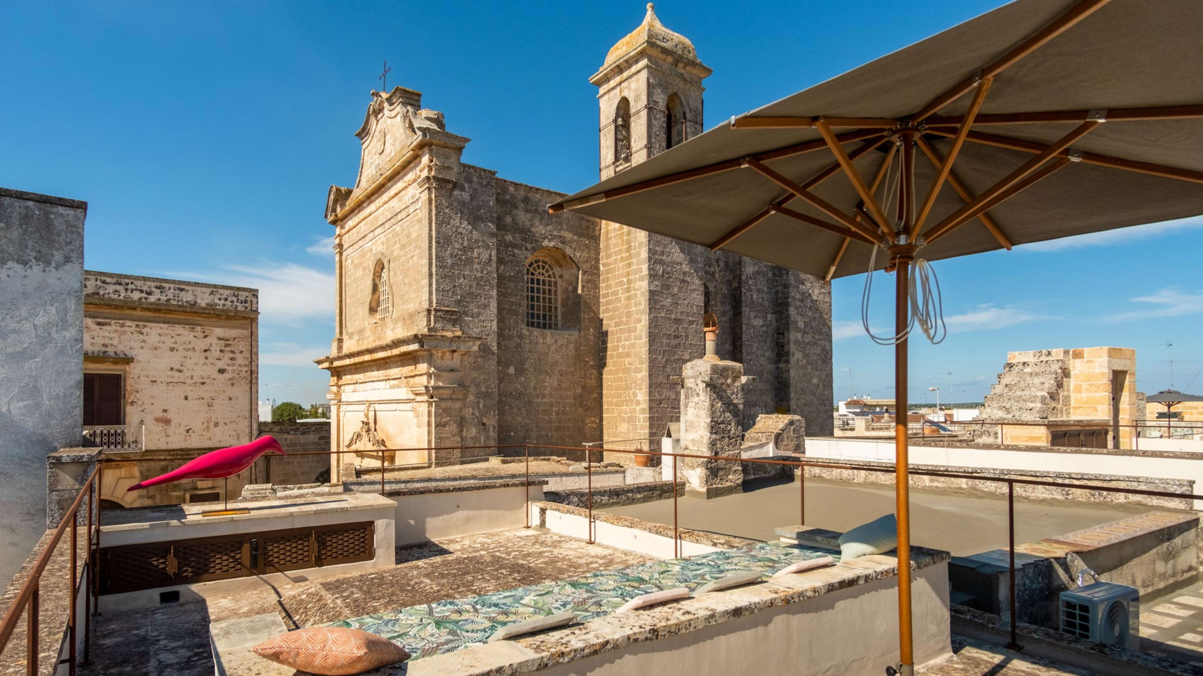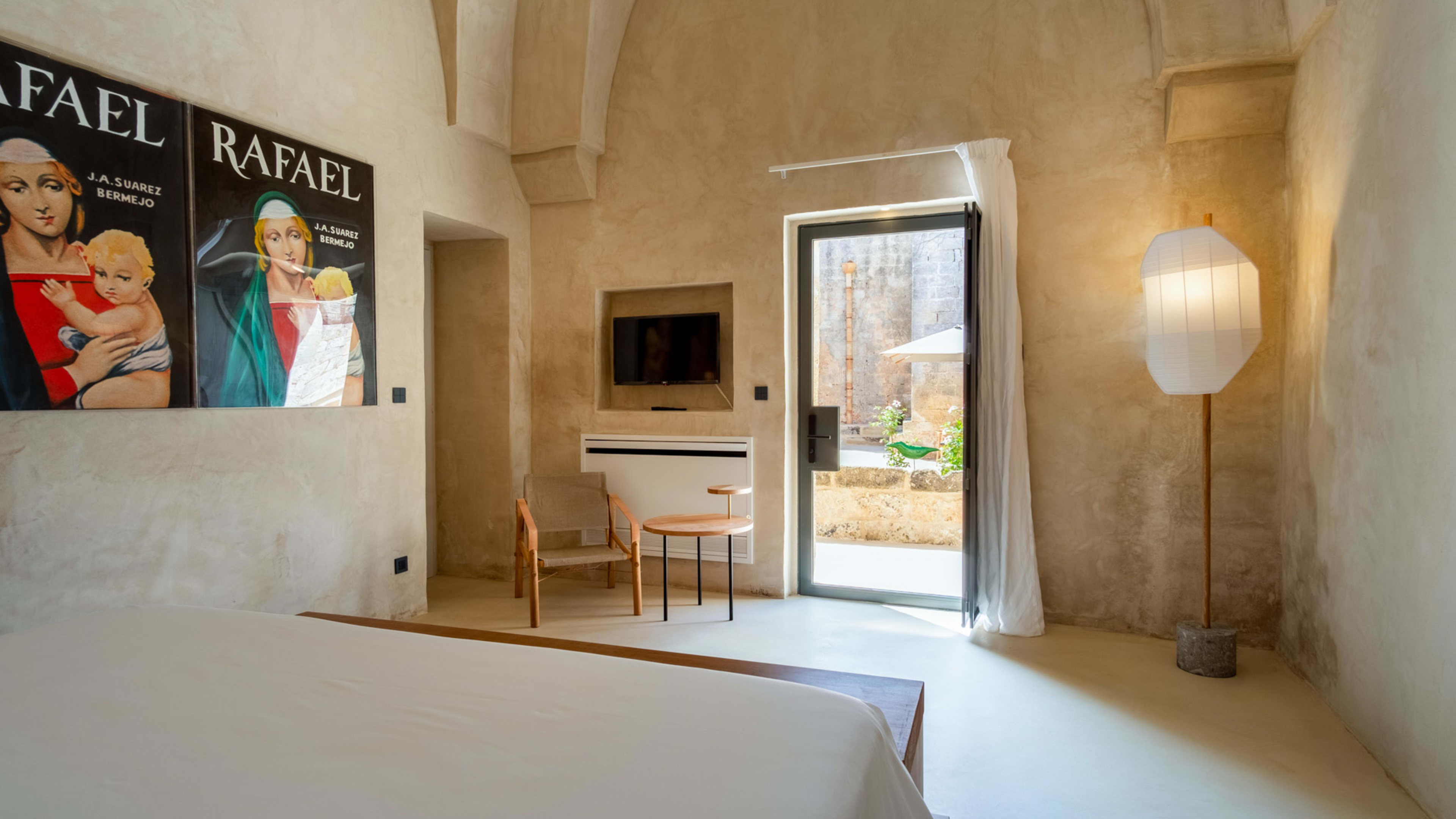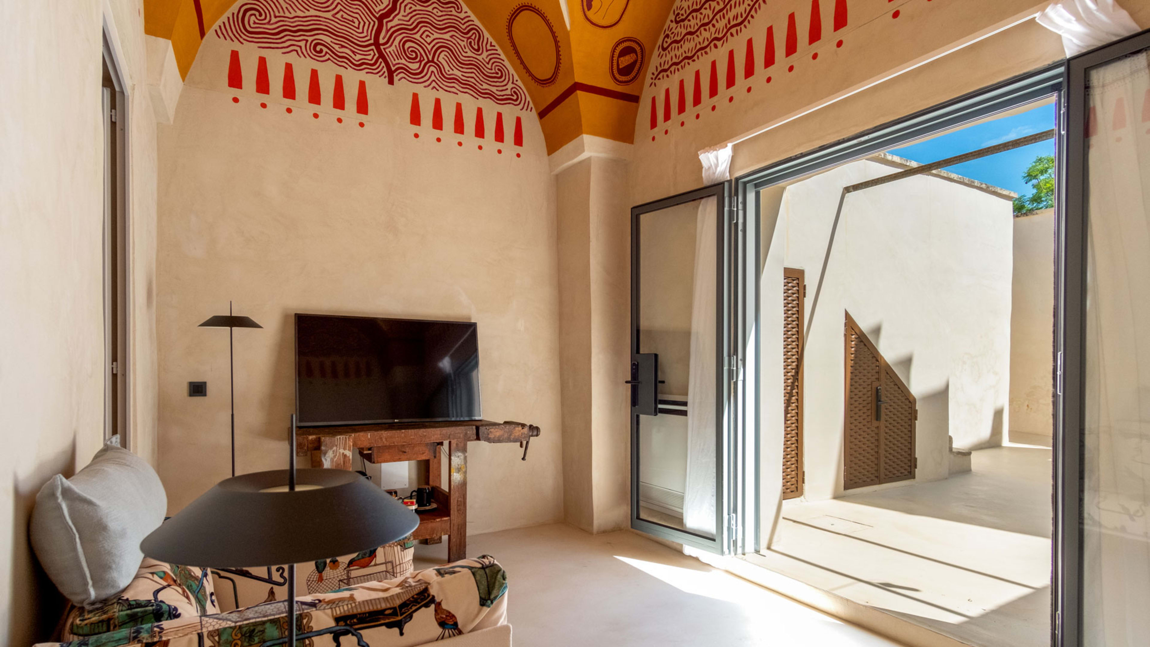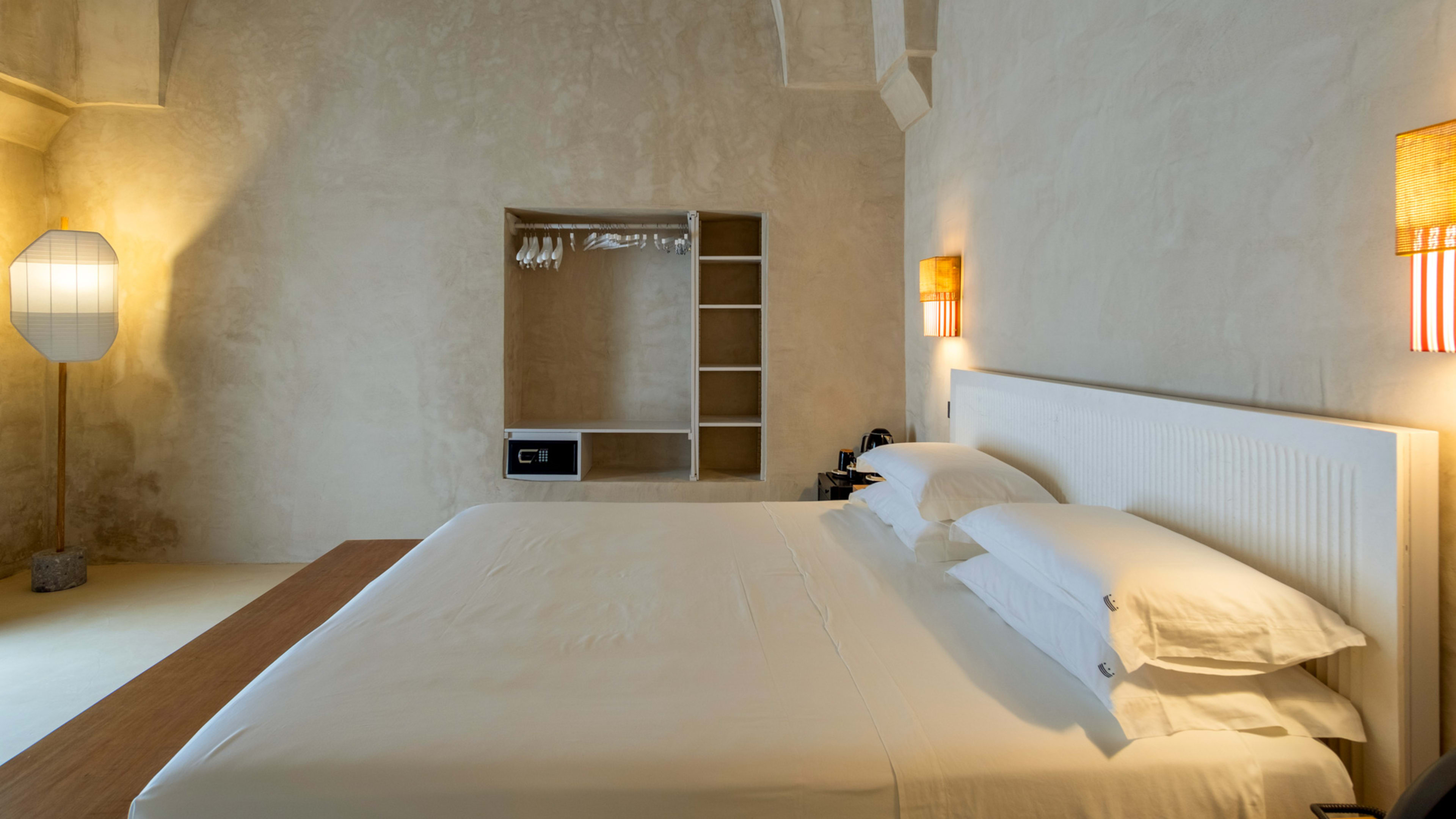 Paying homage to ancient Roman building techniques, most of the bedrooms at I Tre Bacili have high vaulted ceilings and all use traditional cocciopesto rendering techniques. Sizable works of contemporary art create colourful focal points against clean, minimalist interiors. If you really want to live like a Caesar, go for the vast Barone Suite. Big enough to get lost in, it includes a star-vaulted parlour room that fairly pops with colour, from the designer armchair’s striking menagerie motif to the incredible ceiling fresco by artist Vincenzo d’Alba, all turmeric yellows, chilli reds and sunset oranges.