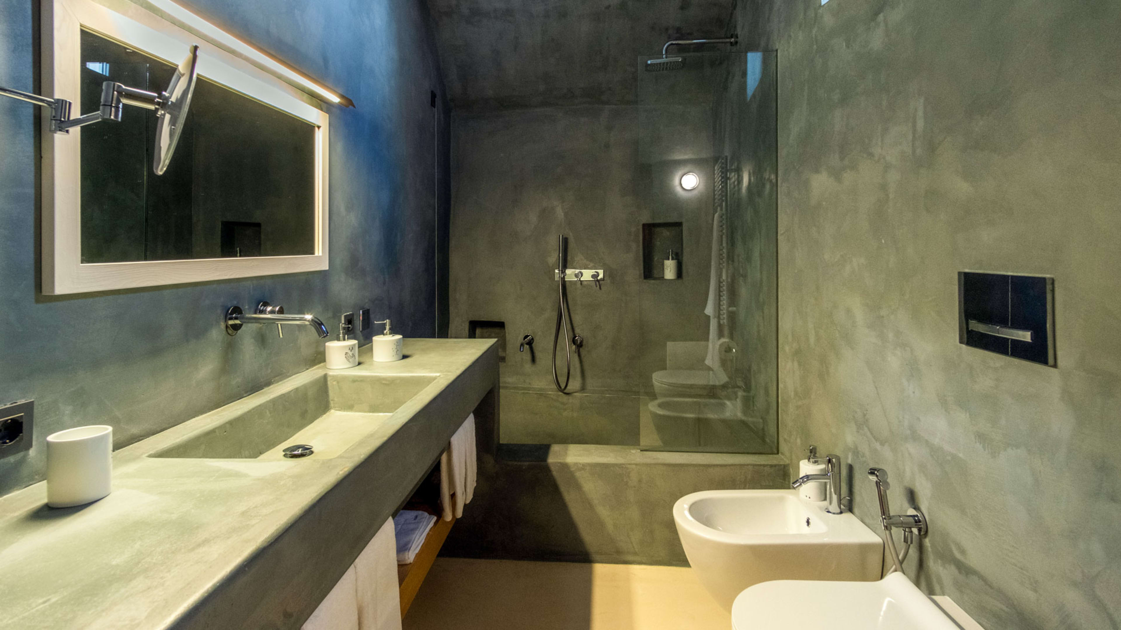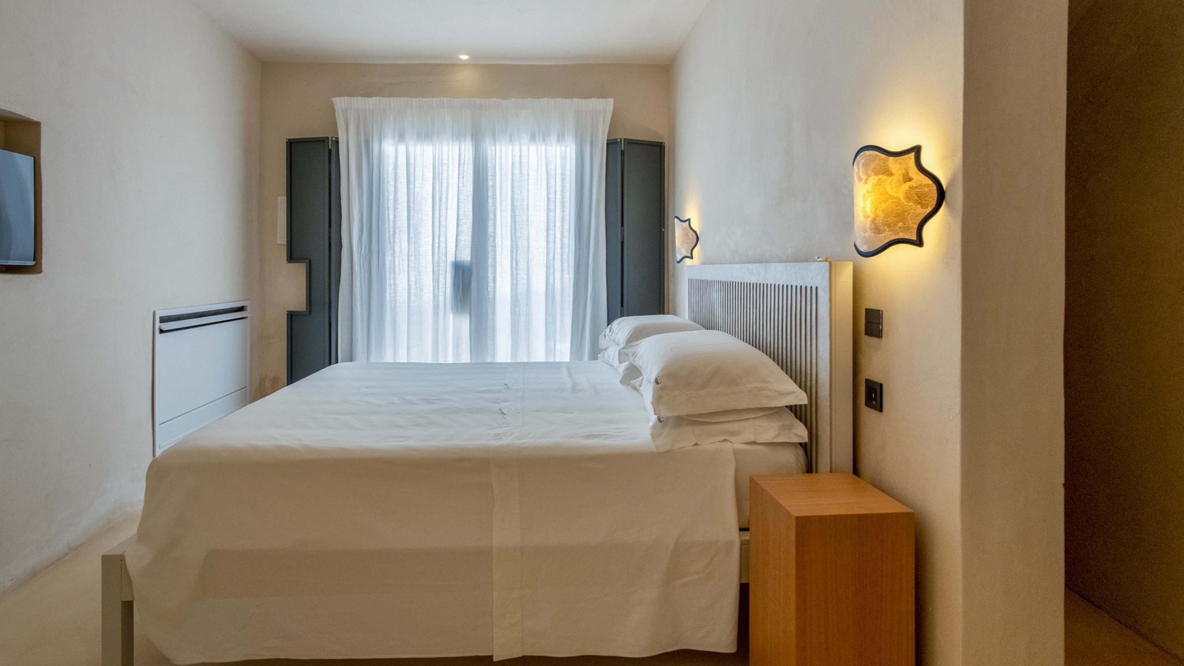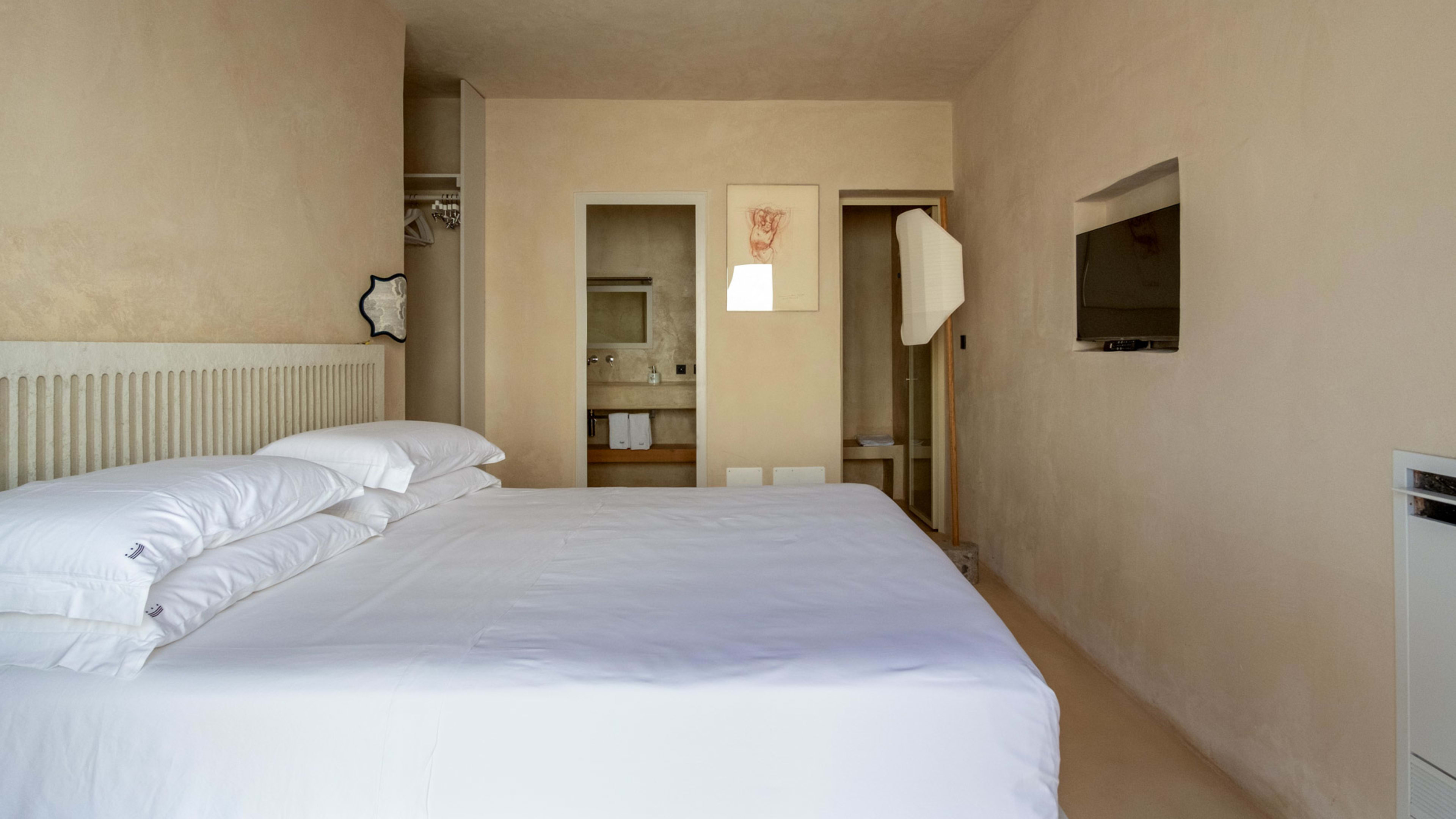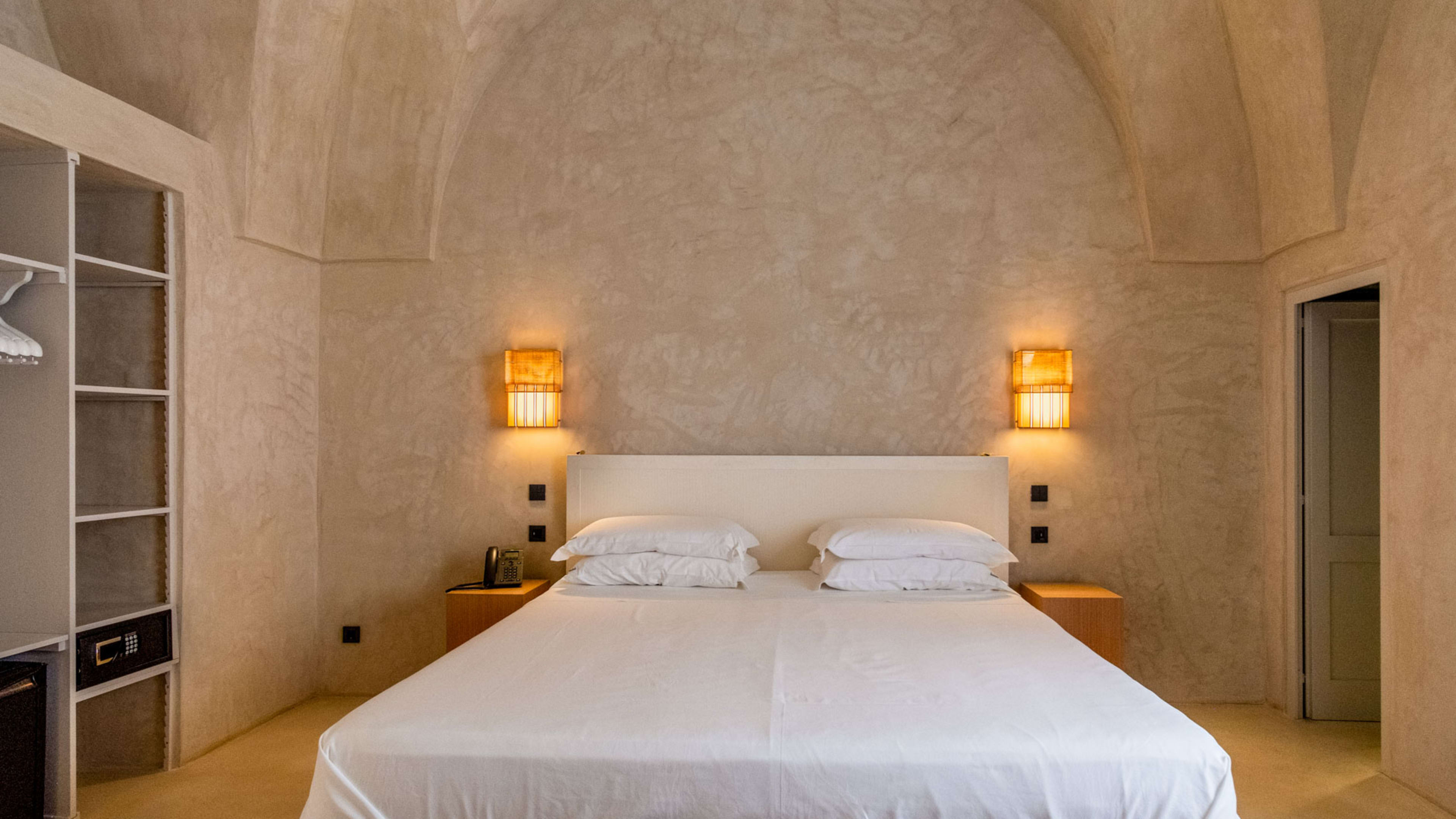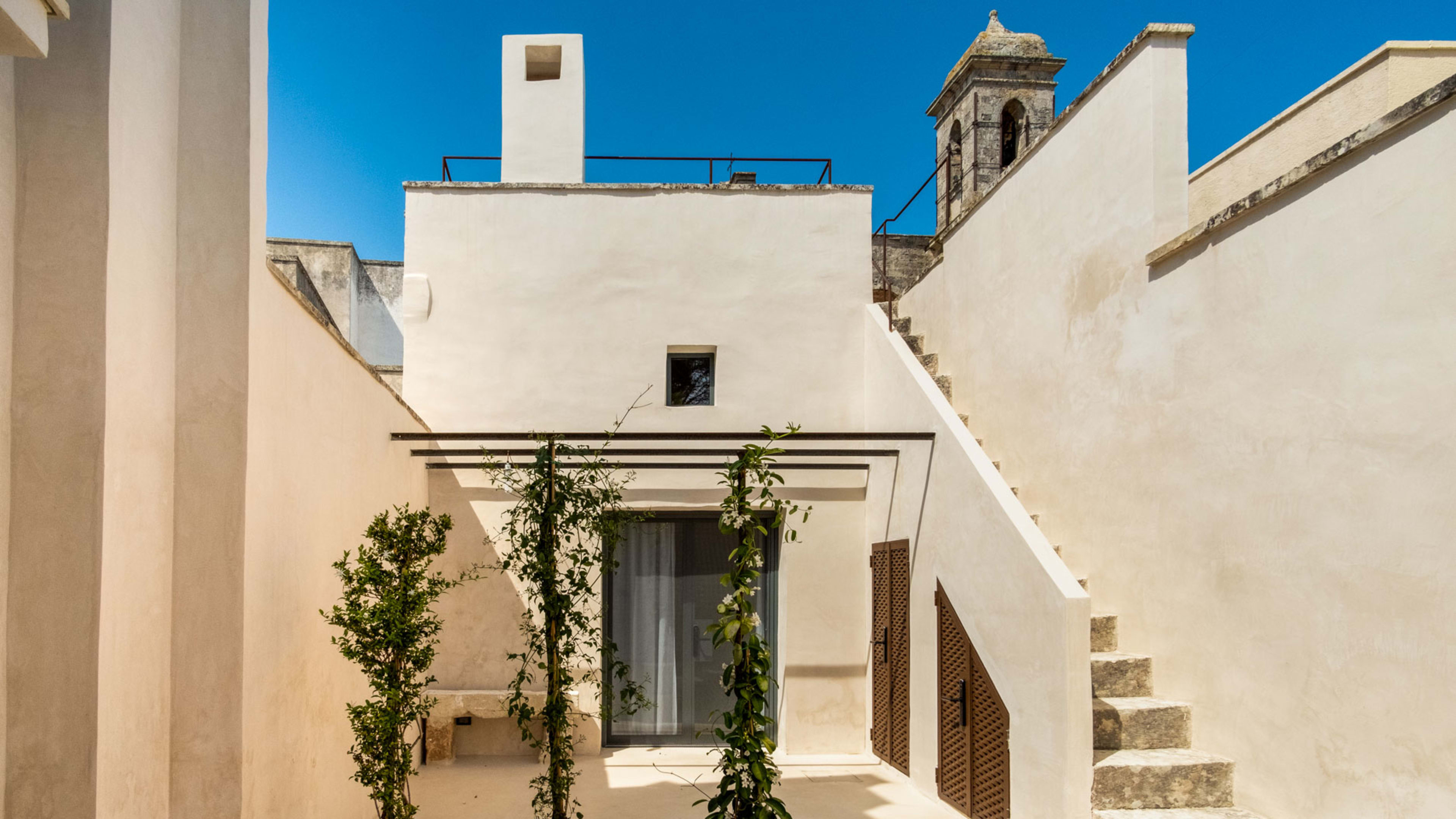 Paying homage to ancient Roman building techniques, most of the bedrooms at I Tre Bacili have high vaulted ceilings and all use traditional cocciopesto rendering techniques. Sizable works of contemporary art create colourful focal points against clean, minimalist interiors. If you really want to live like a Caesar, go for the vast Barone Suite. Big enough to get lost in, it includes a star-vaulted parlour room that fairly pops with colour, from the designer armchair’s striking menagerie motif to the incredible ceiling fresco by artist Vincenzo d’Alba, all turmeric yellows, chilli reds and sunset oranges.