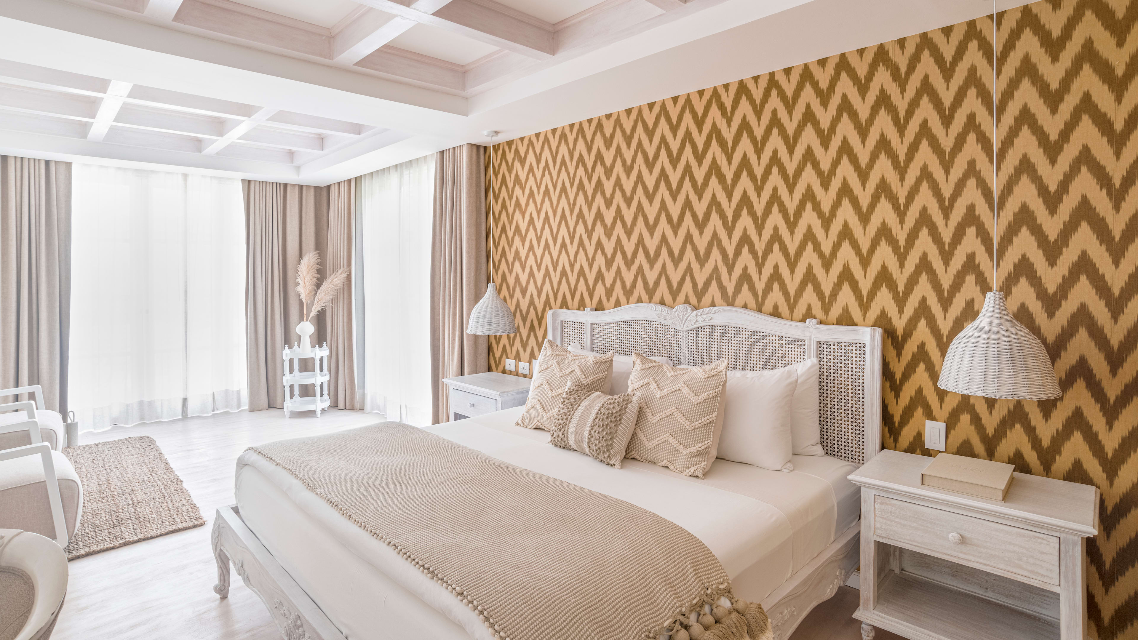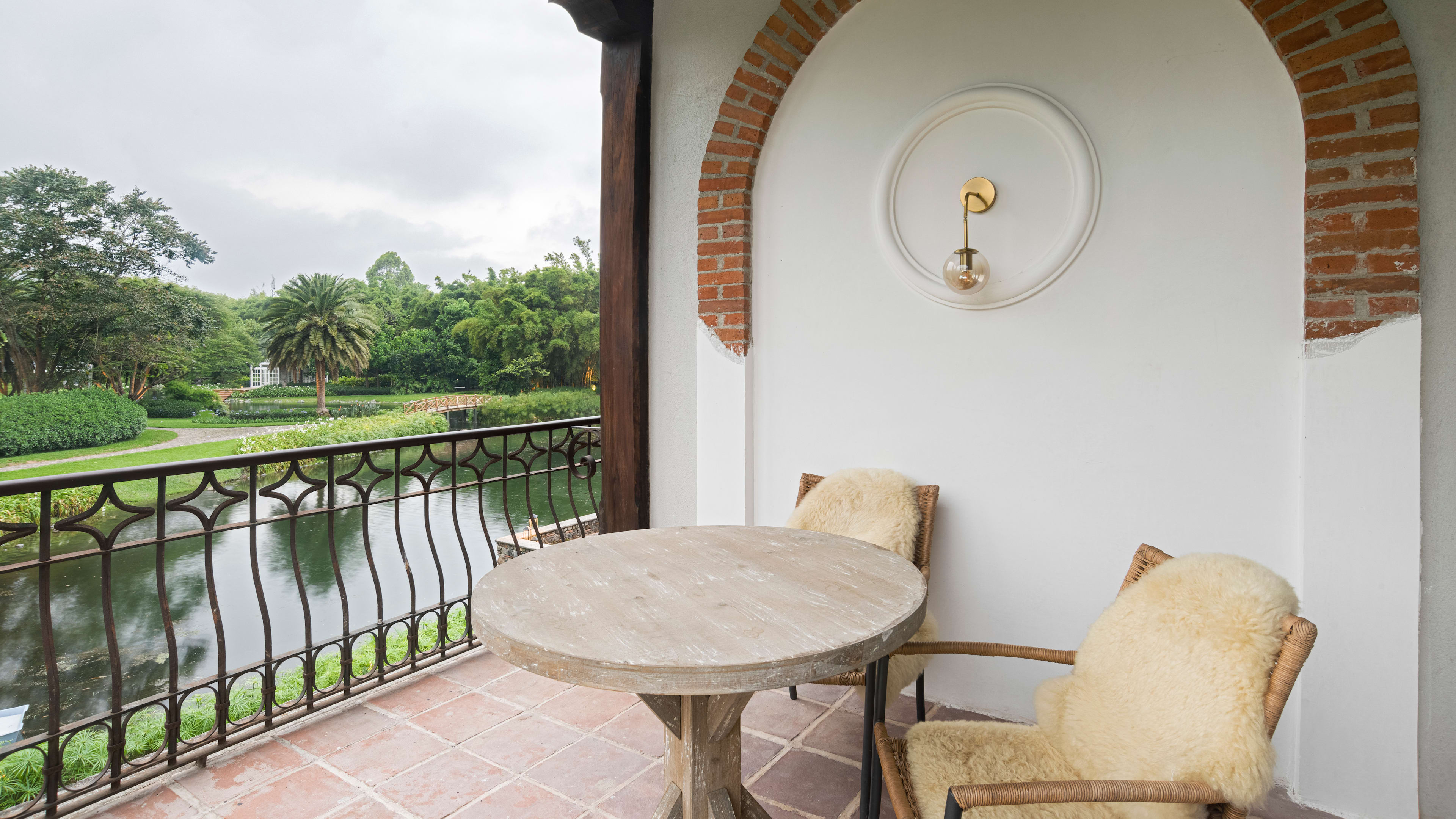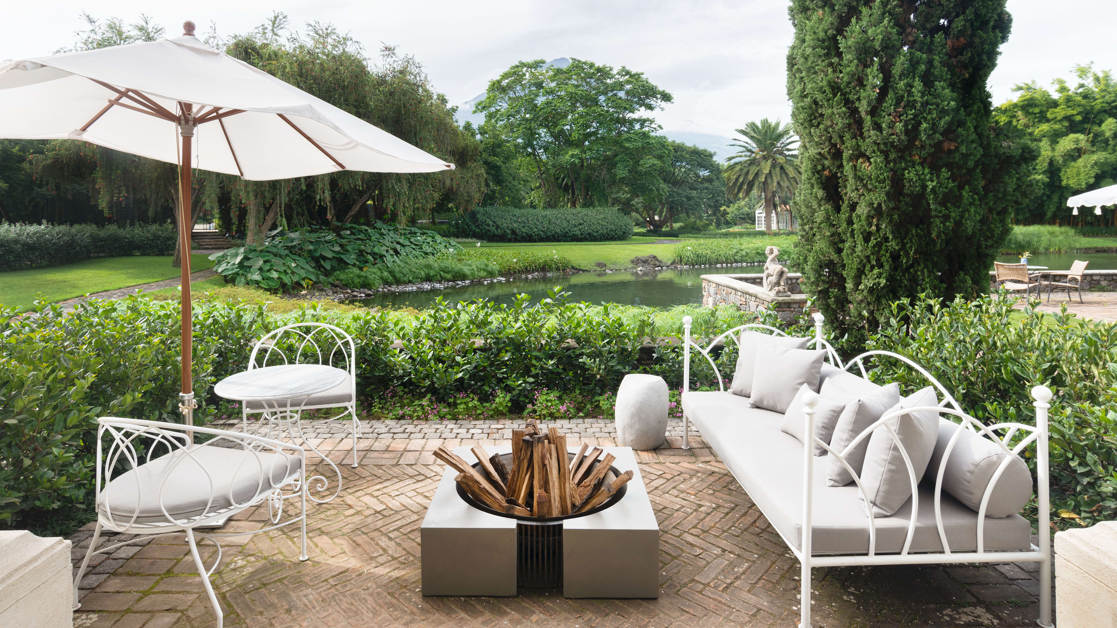 Villa Bokéh’s polished terracotta-tiled floors and red pantile rooftops sandwich a gleaming white colonial hacienda complete with fairy-tale turrets and lofty cypress trees out front. Follow the meandering lakeside path to the turquoise outdoor pool with its blue-and-white parasols, or wander the extensive gardens where intoxicating scents of lilies, purple agapanthus, and vibrant bird of paradise flowers are accompanied by a symphony of birdsong. If even a gentle wander seems like an unnecessary exertion, retreat to the vine-draped verandah, where marshmallow-soft sofas provide perfect vantage points for daydreaming as fluffy white clouds drift across the volcano – don’t worry, it hasn’t erupted in over 80,000 years, so you’re quite safe.