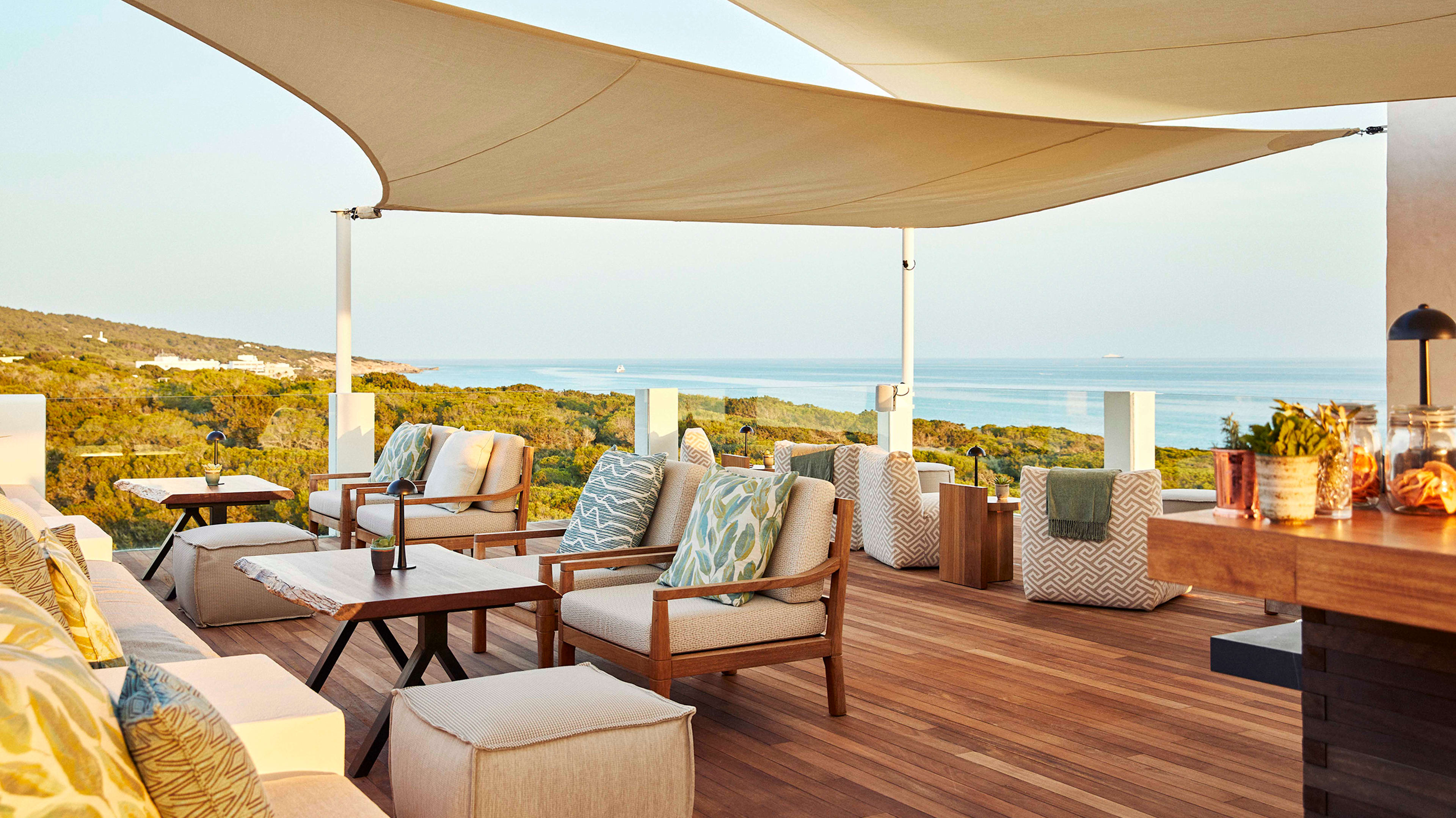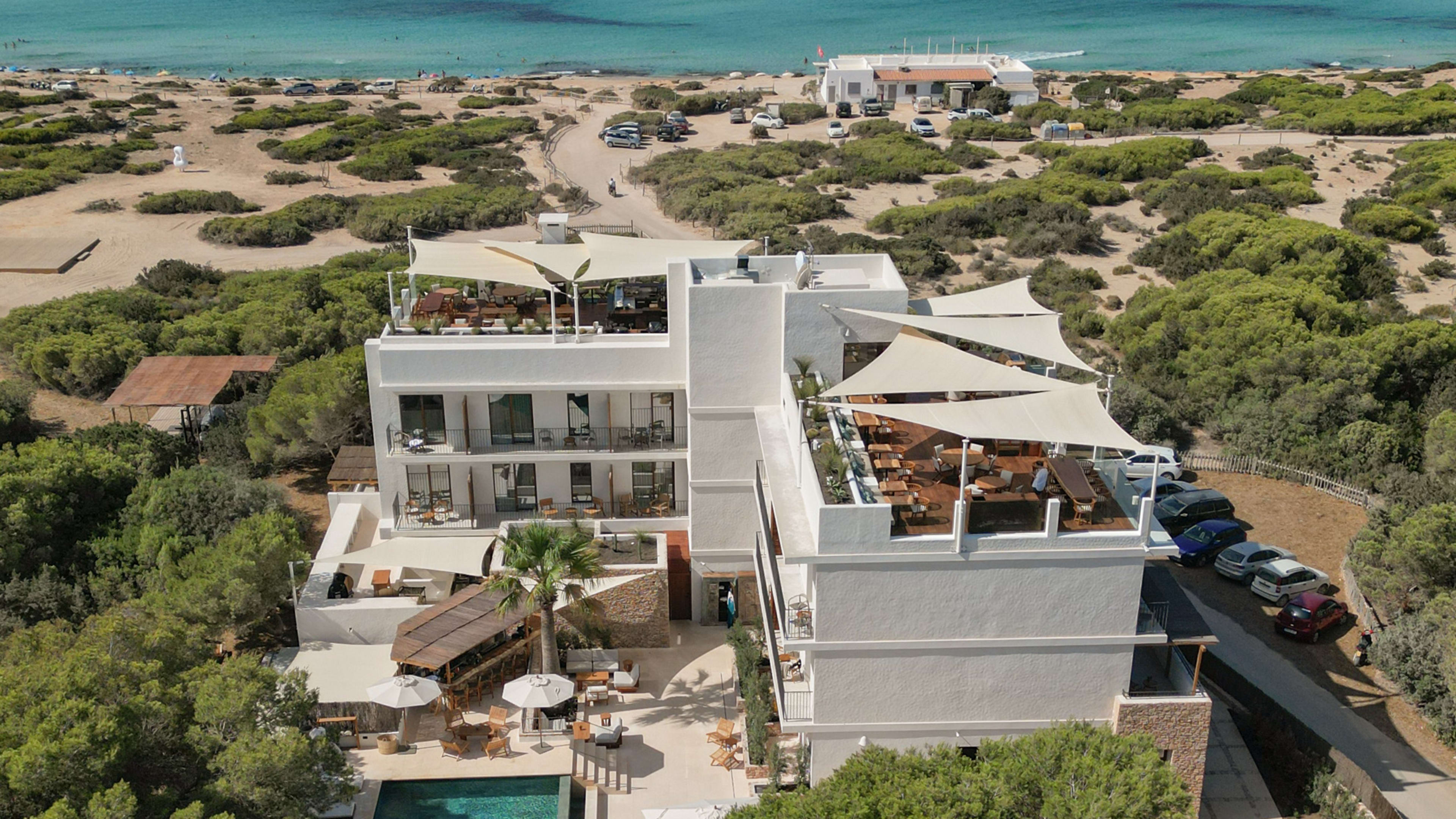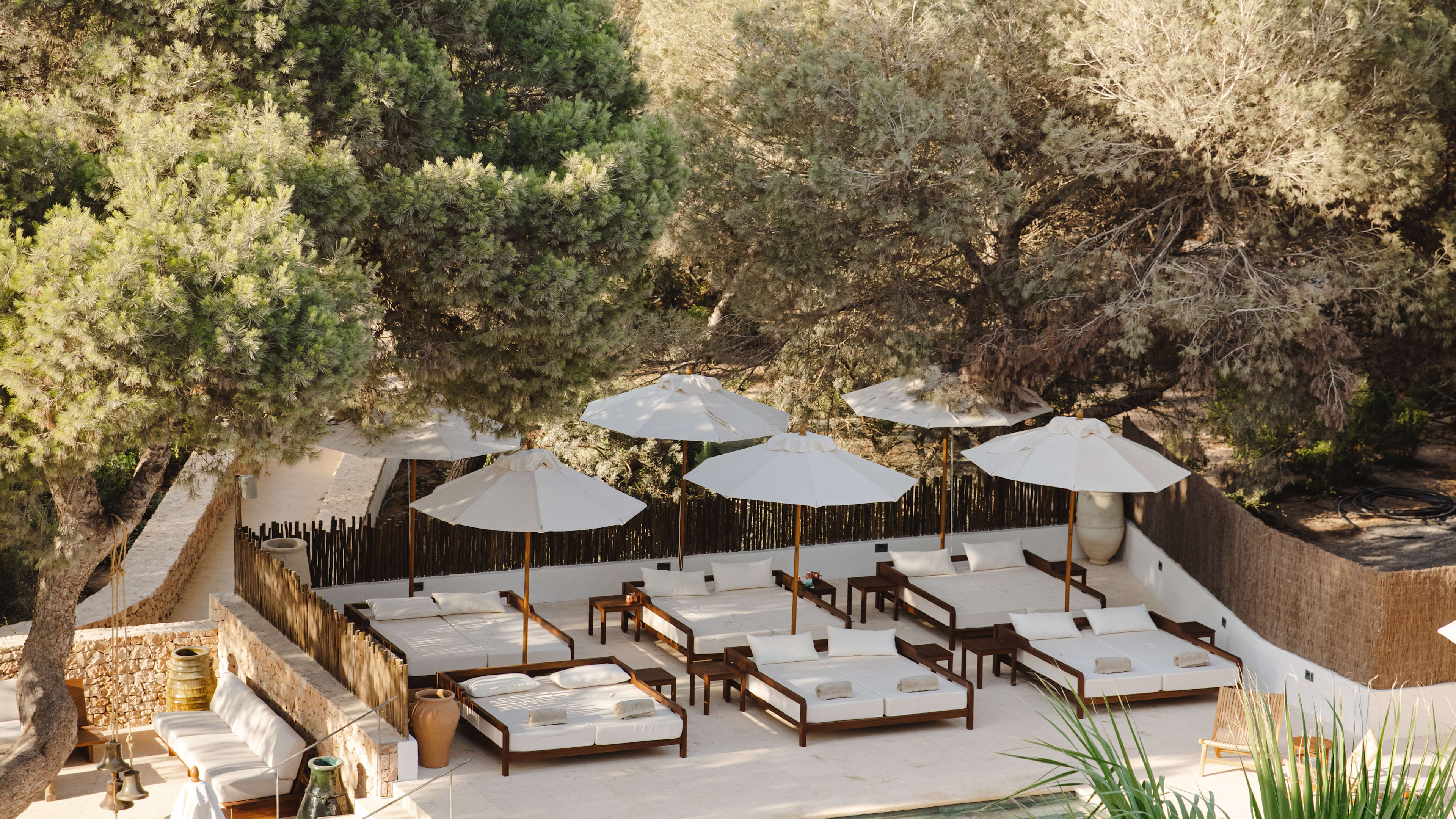 For sundowners, you’ll be hard pressed to find a better spot than the L-shaped bar three floors up, with a 360-degree panorama stretching from the azure blues of the ocean, across the canopy of pine forest and out to the highest point on the island – La Mola peninsula. Try the signature Terankini, or choose from the dizzingly long cocktail menu. You can order tapas and crudos to your sky-high perch, too. Post-dinner drinks are best enjoyed at the ground-floor bar, with a pool table on one side and lounge with comfy sofas to cosy into on the other.