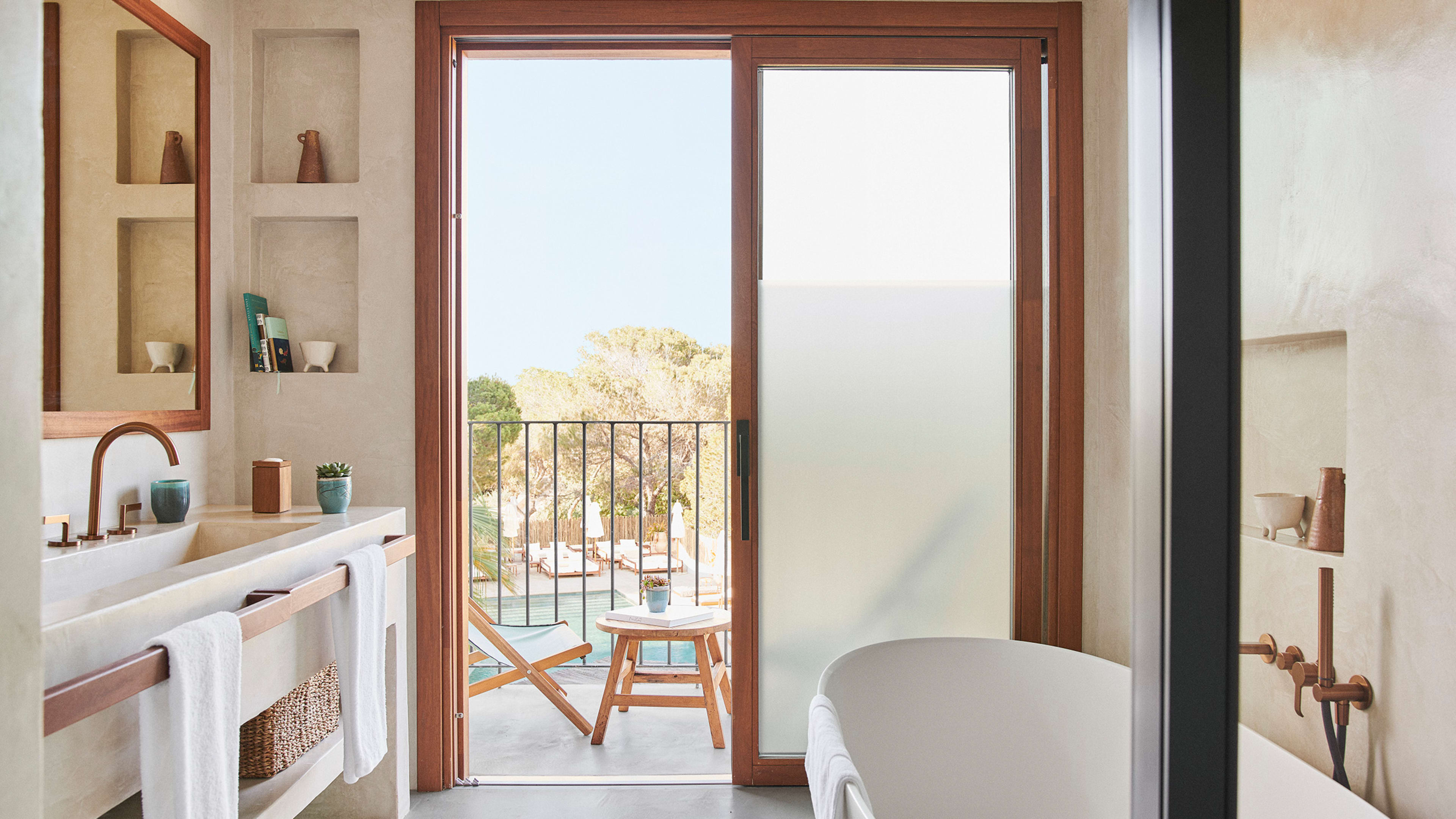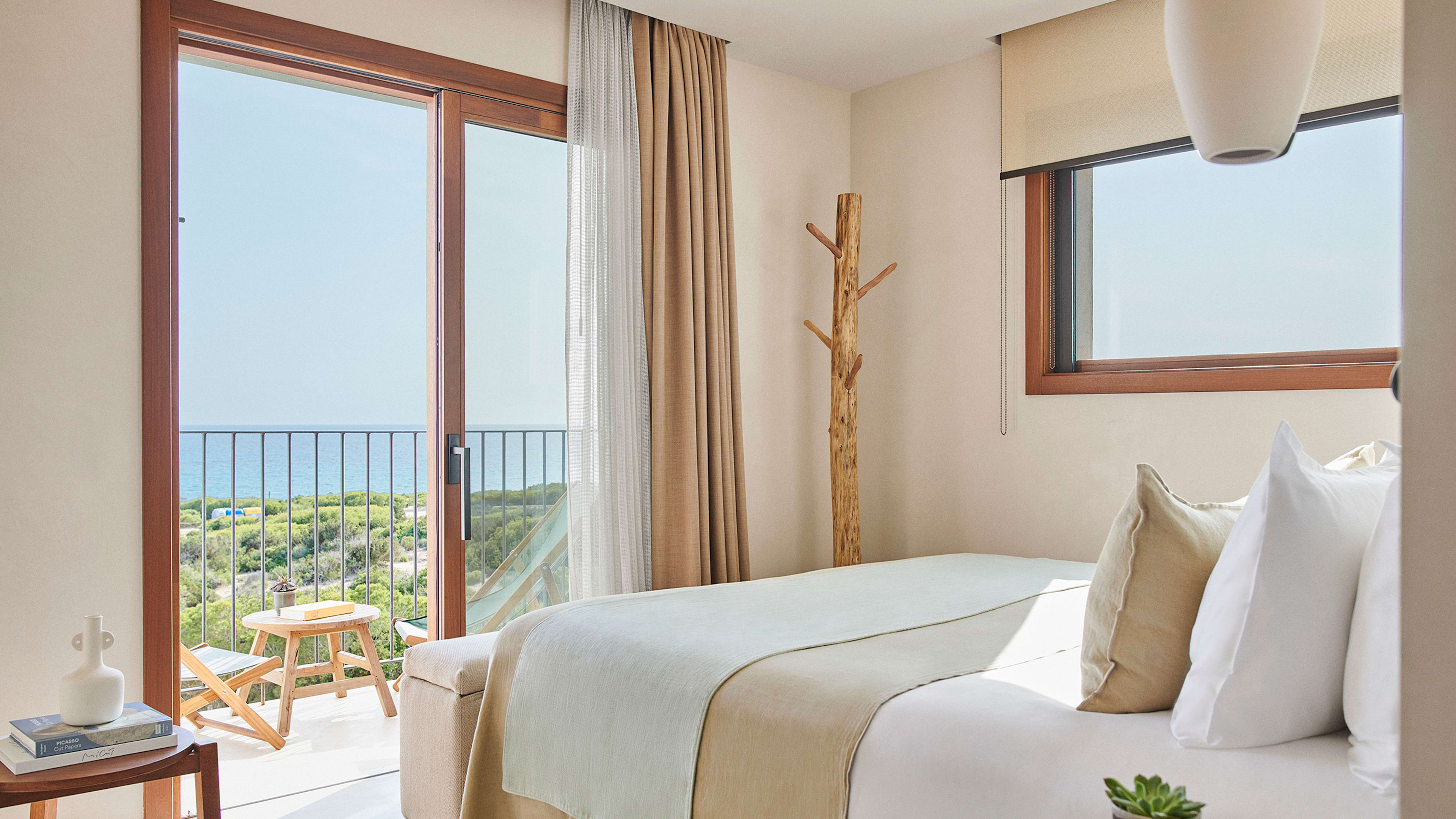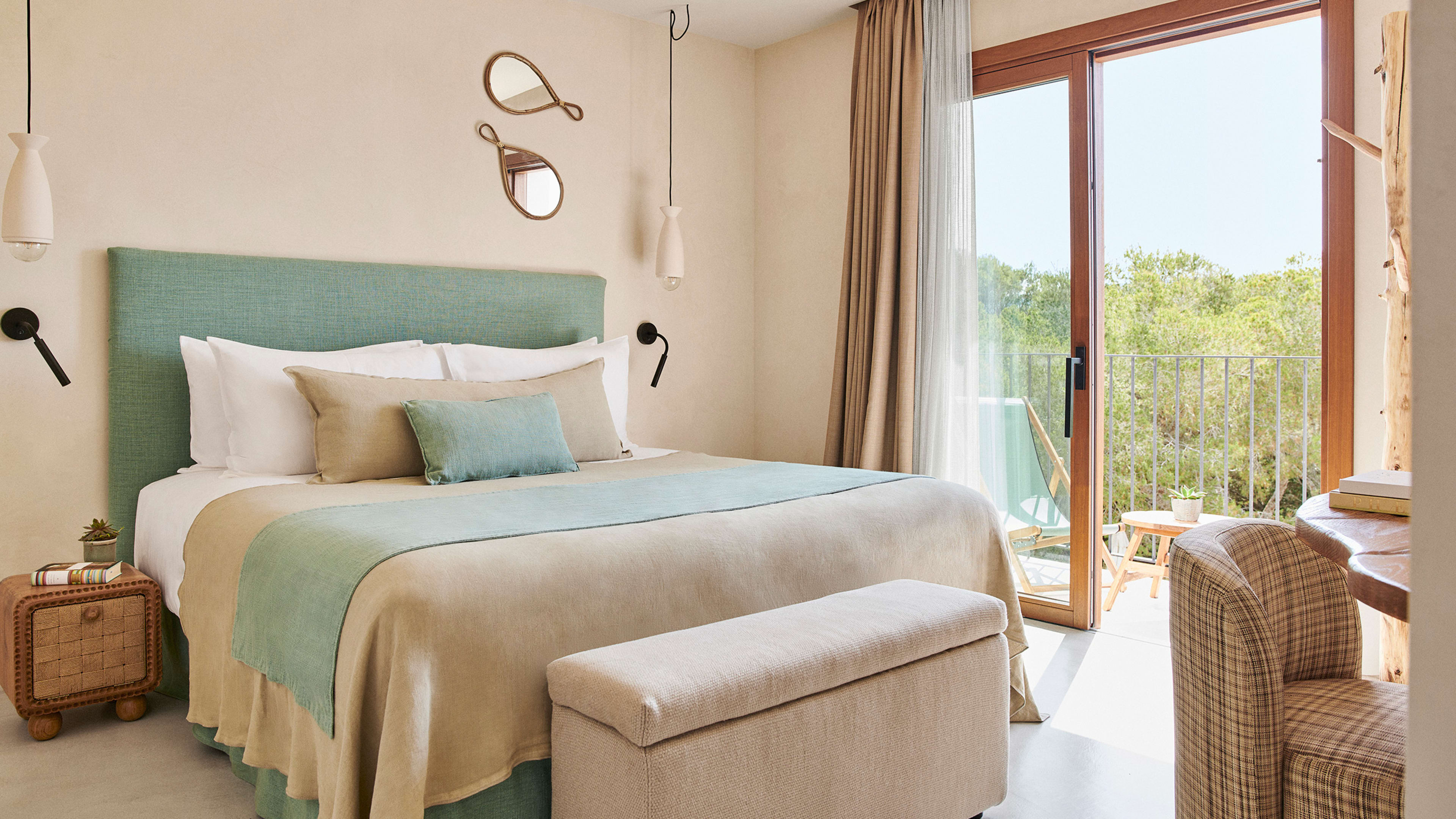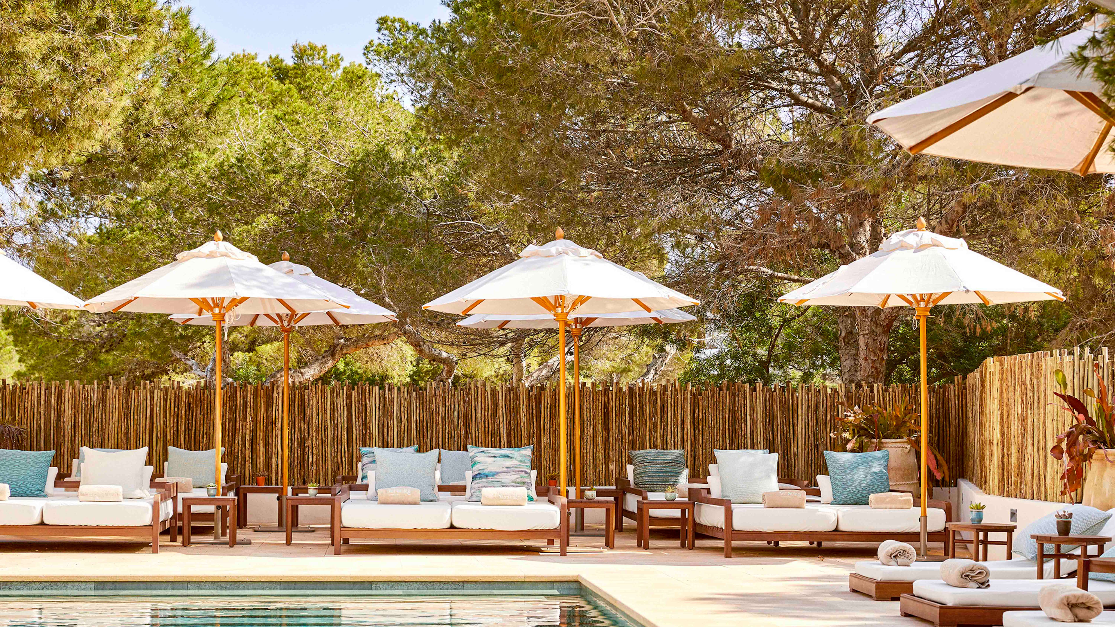 For sundowners, you’ll be hard pressed to find a better spot than the L-shaped bar three floors up, with a 360-degree panorama stretching from the azure blues of the ocean, across the canopy of pine forest and out to the highest point on the island – La Mola peninsula. Try the signature Terankini, or choose from the dizzingly long cocktail menu. You can order tapas and crudos to your sky-high perch, too. Post-dinner drinks are best enjoyed at the ground-floor bar, with a pool table on one side and lounge with comfy sofas to cosy into on the other.