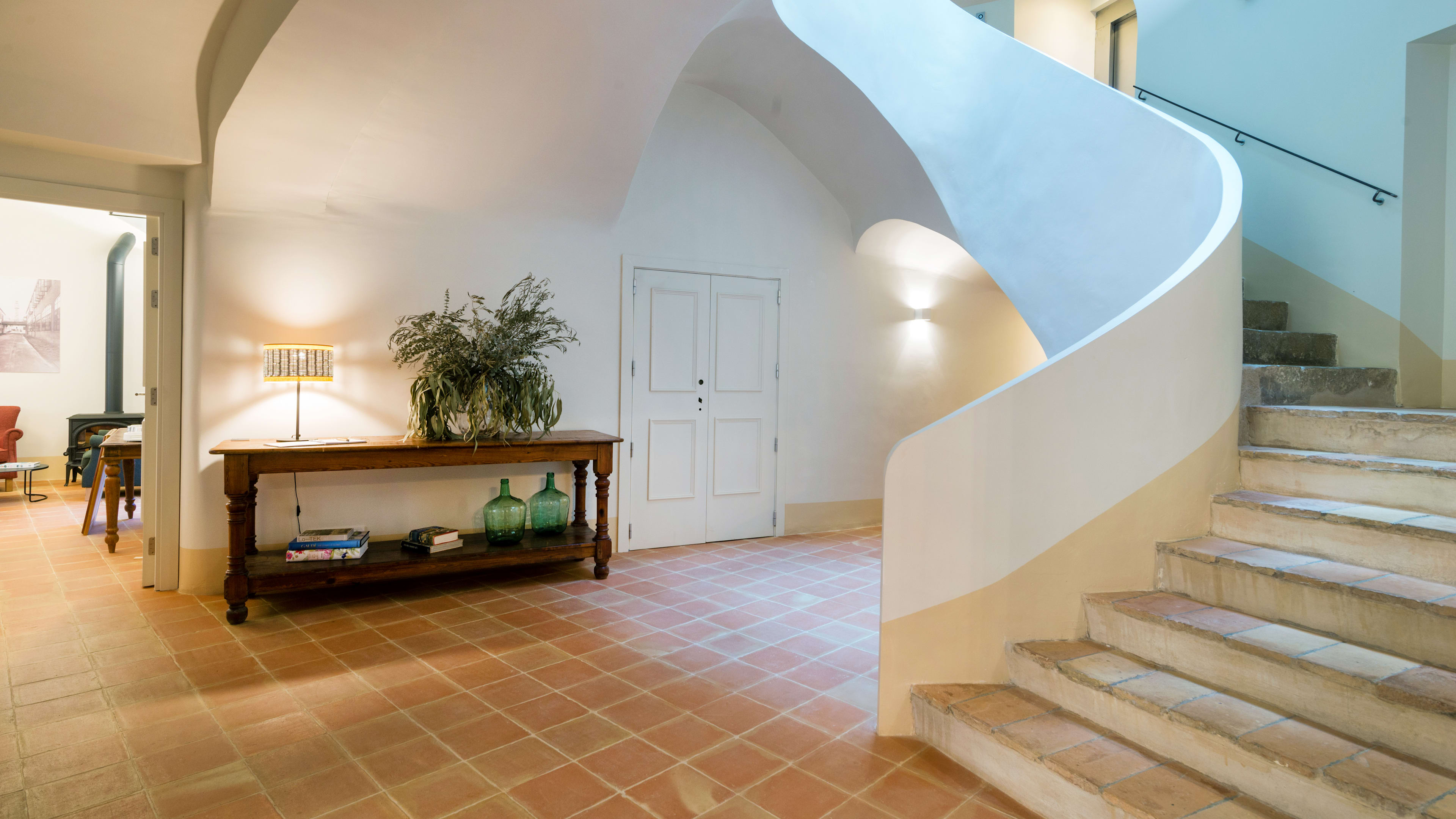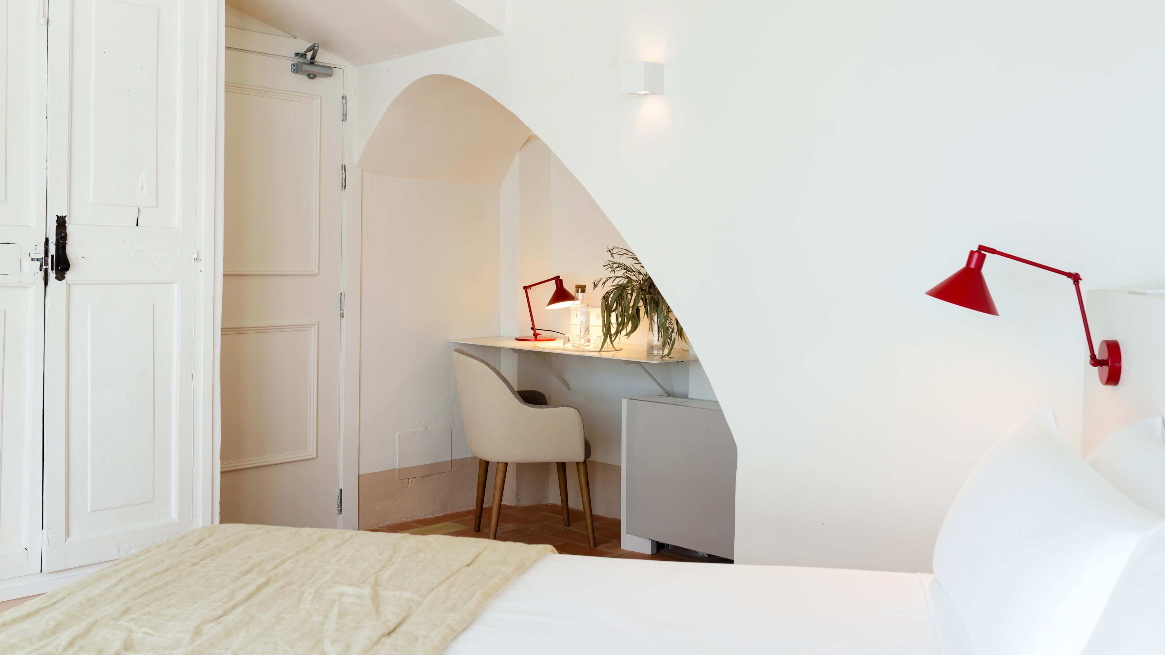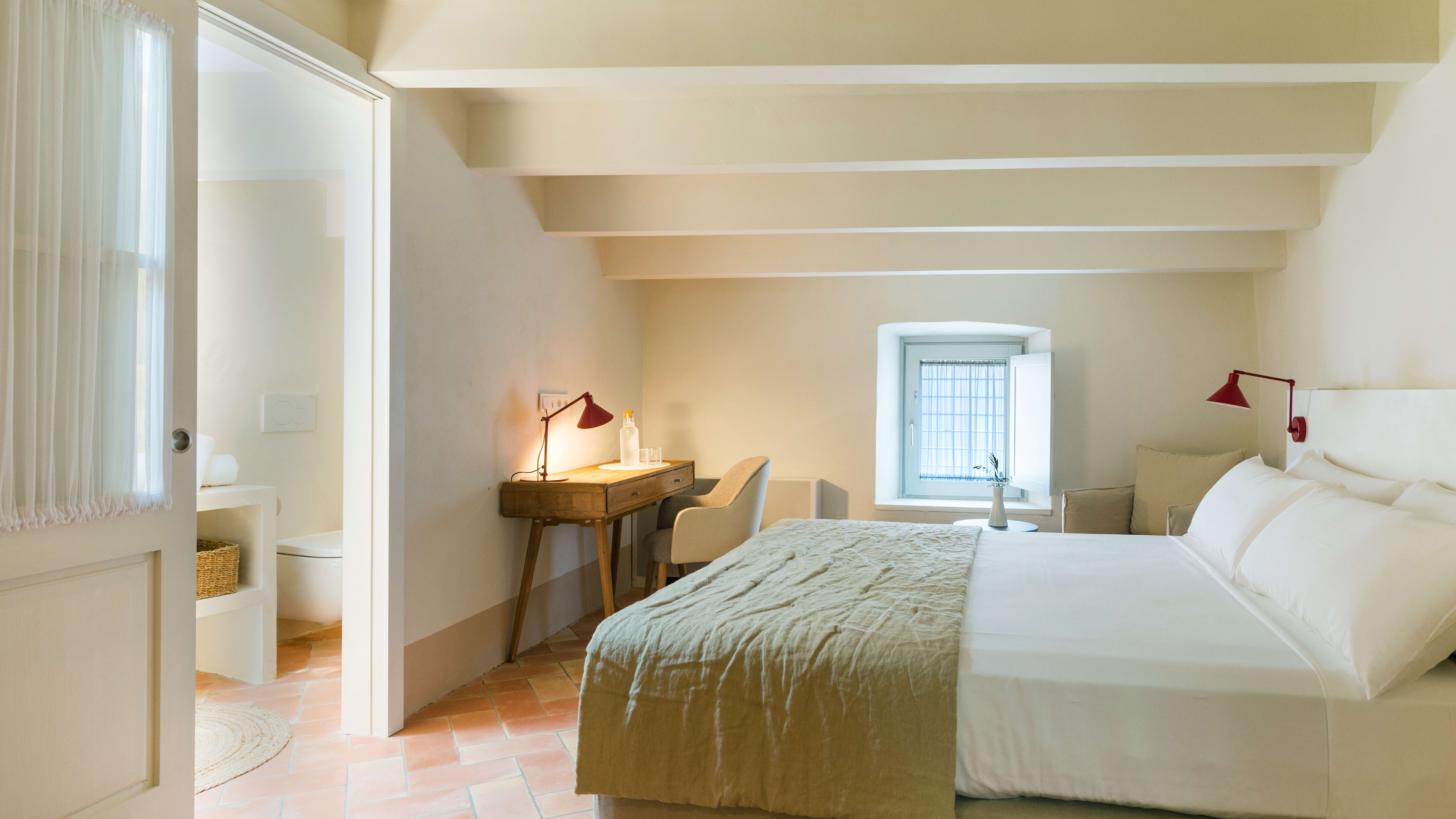 Rooms have a coolly spartan feel, with their white walls, rouged concrete tiles and wood and wicker furnishings, with no TVs (you’re here to relax) and little embellishment. The effect is indeed calming, but it’s not to say they’re devoid of character – each has a little something unique, such as Ermedàs, which has a section of original staircase under which there’s a cosy nook; or the Junior Suites most of which have original stone arches or sloping beamed ceilings. And, to keep things light and help you up those vitamin-D levels, skylights have been added where possible.