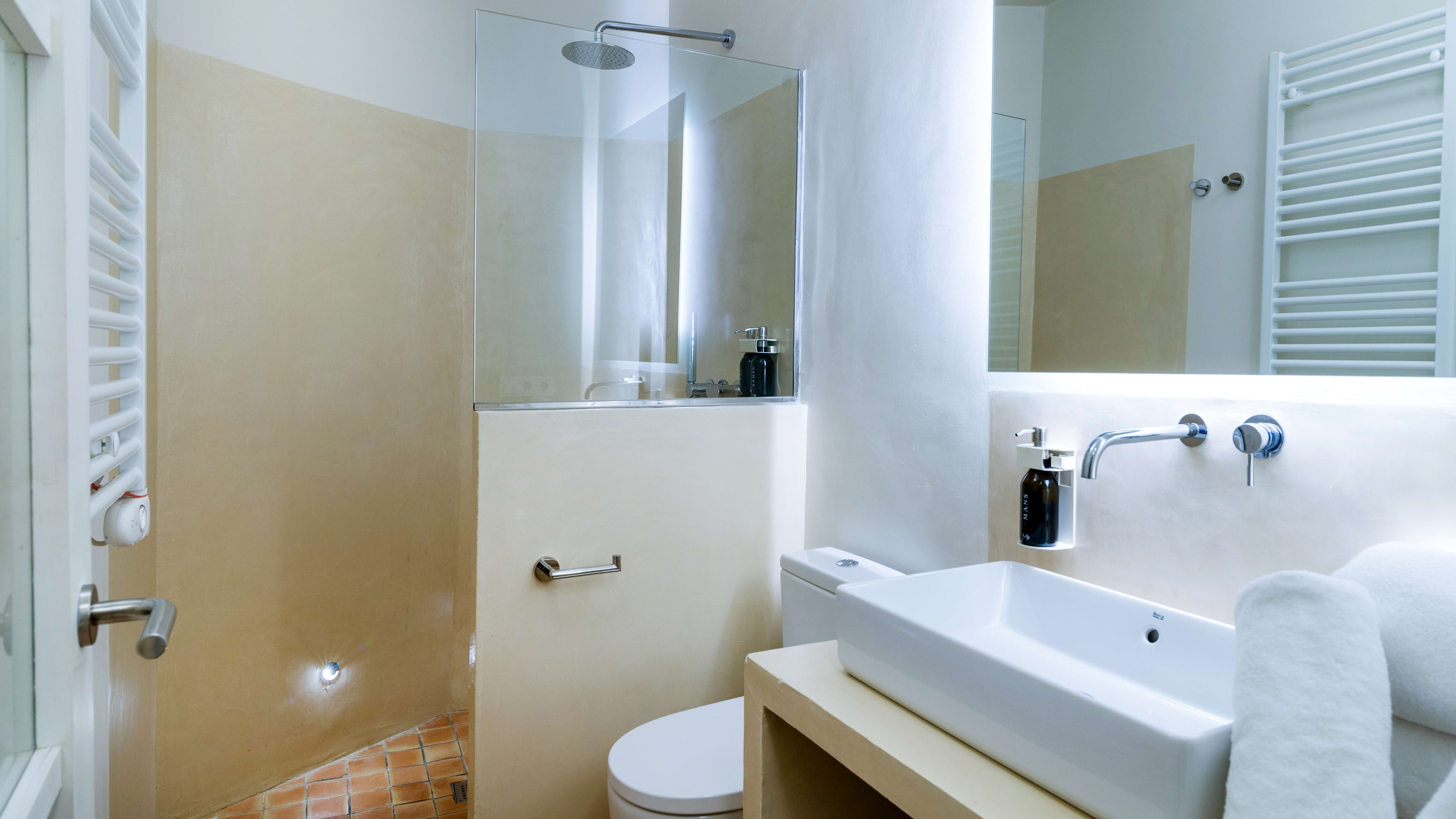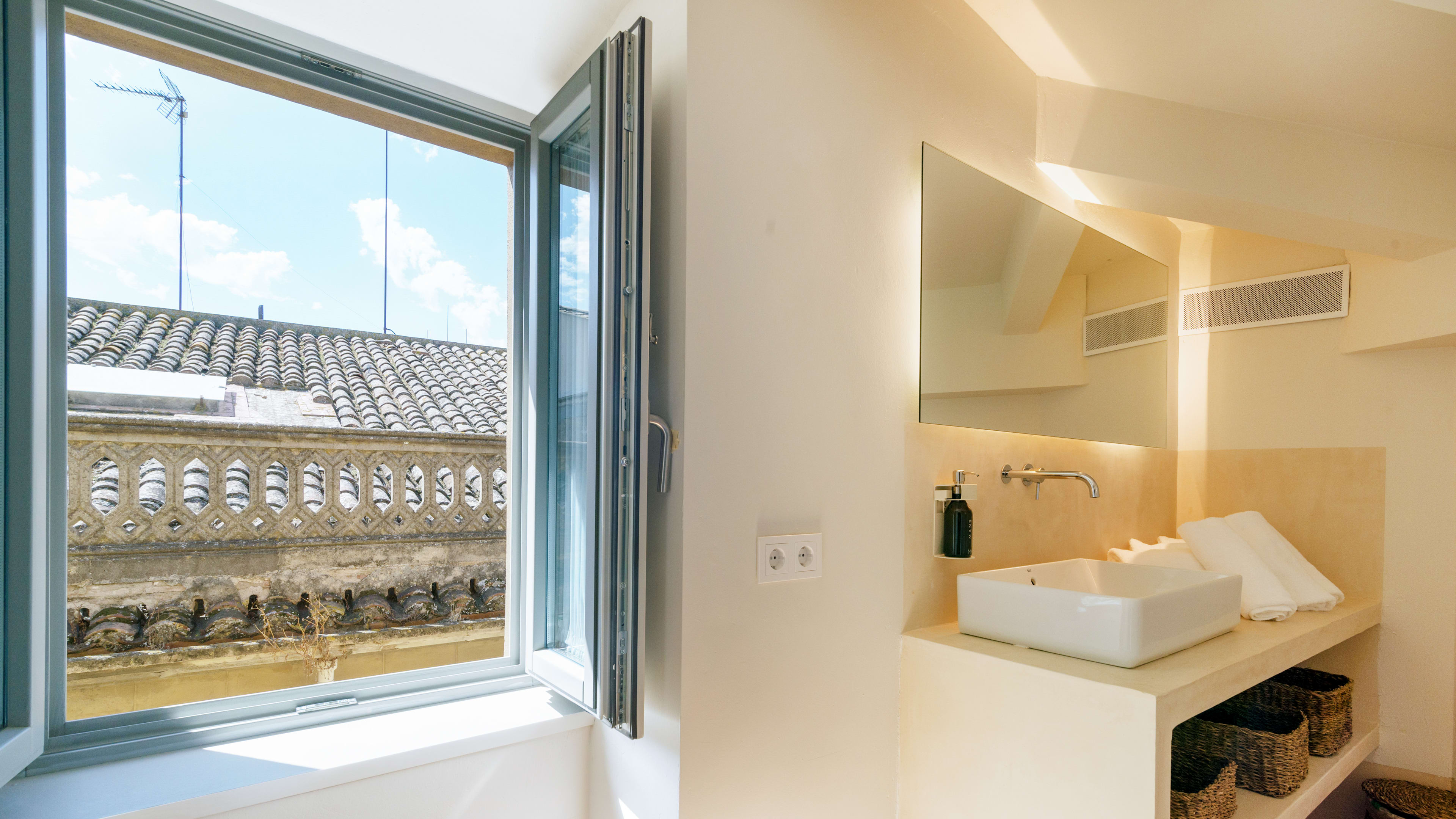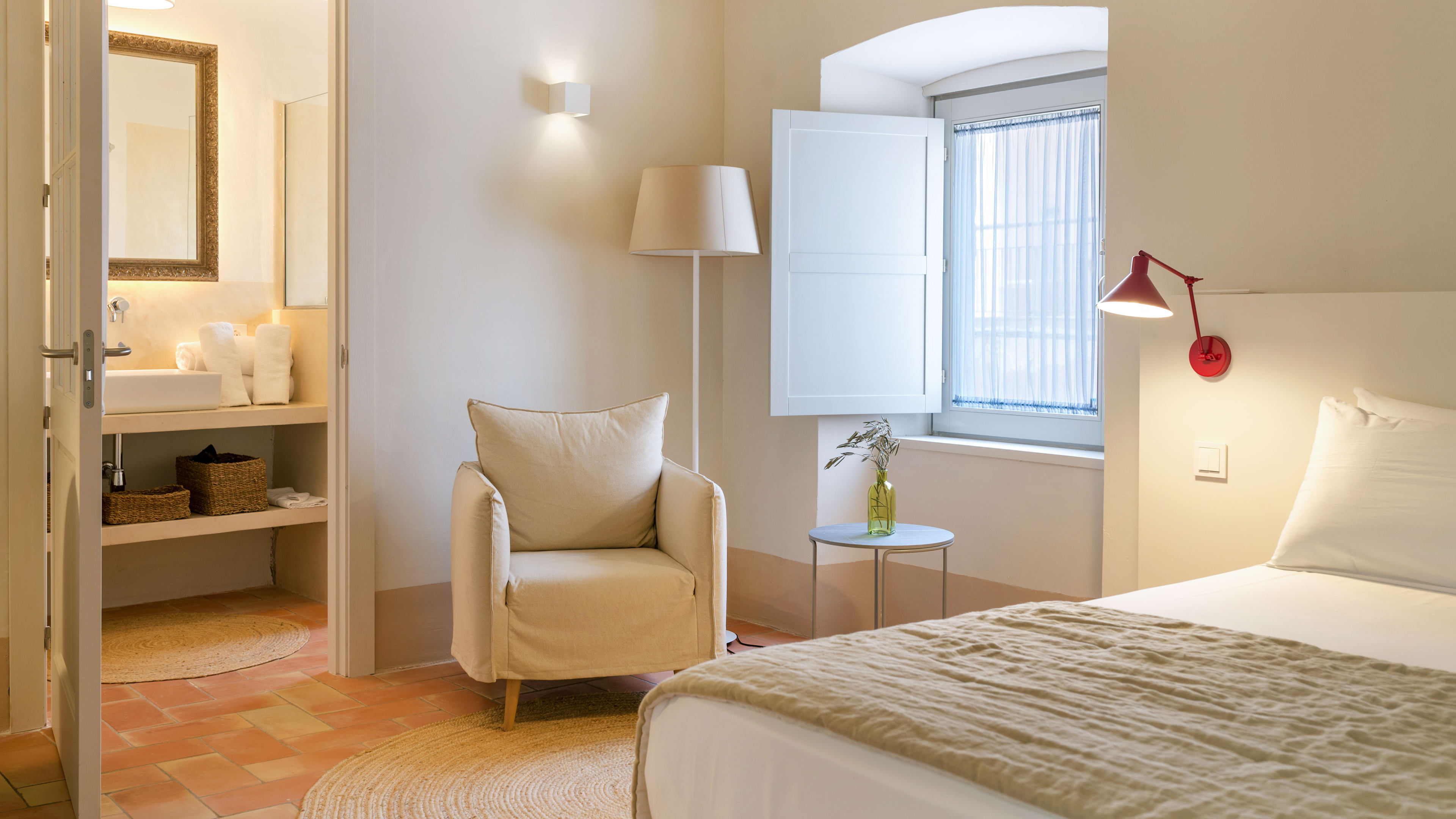 Rooms have a coolly spartan feel, with their white walls, rouged concrete tiles and wood and wicker furnishings, with no TVs (you’re here to relax) and little embellishment. The effect is indeed calming, but it’s not to say they’re devoid of character – each has a little something unique, such as Ermedàs, which has a section of original staircase under which there’s a cosy nook; or the Junior Suites most of which have original stone arches or sloping beamed ceilings. And, to keep things light and help you up those vitamin-D levels, skylights have been added where possible.