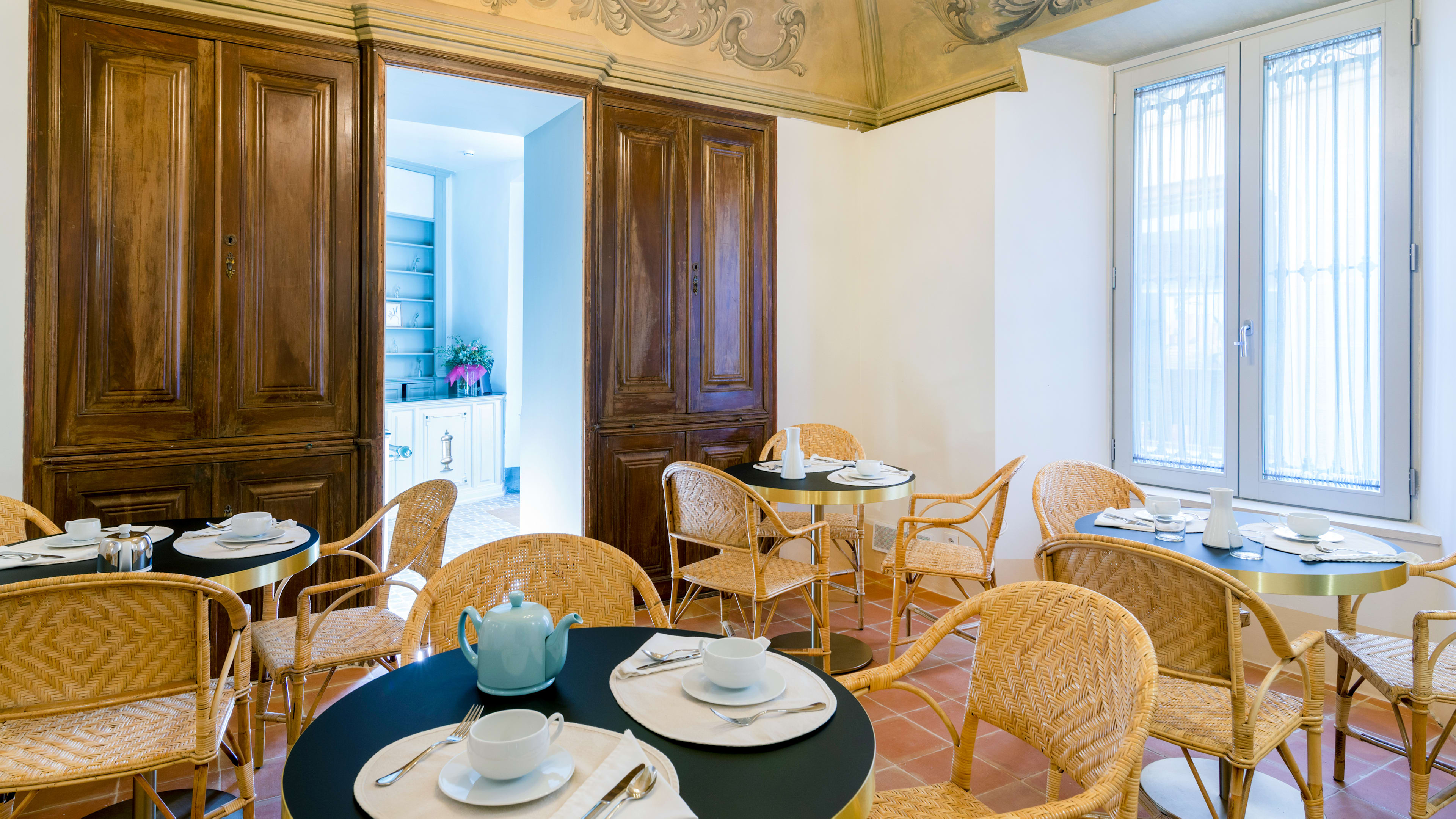 The solarium terrace has wicker loungers, chairs and pouffes to perch on, a fragrant herb and flower garden, and views over the historic centre’s shingled rooftops and cobbled alleys.