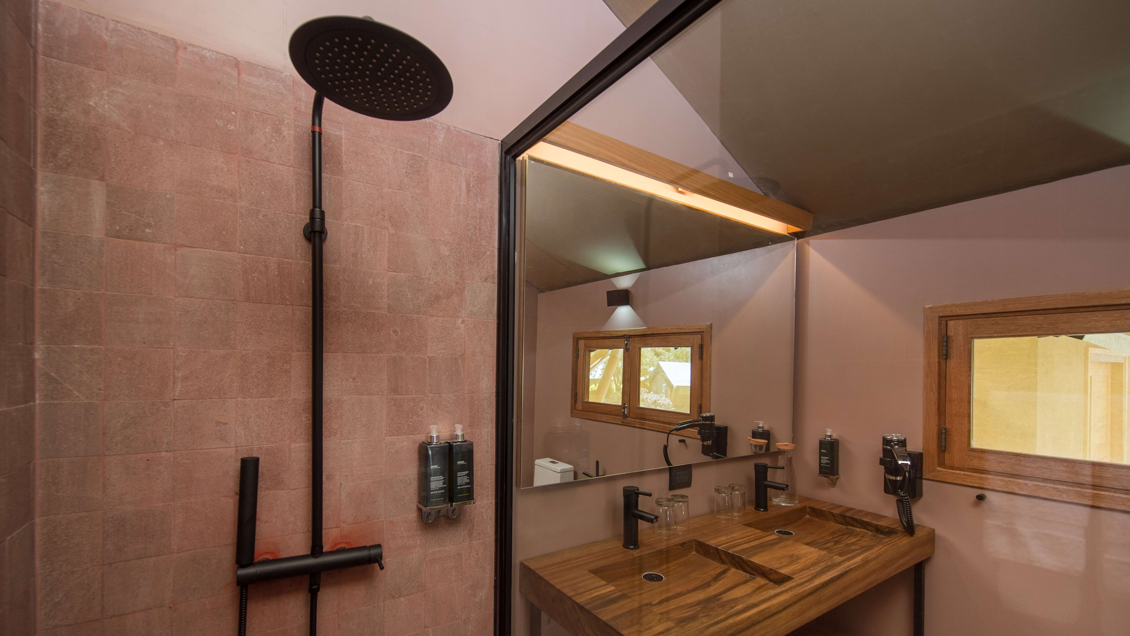 Botanical gardens, organic vegetable garden, fire pit, sauna, outdoor onsen, geodesic wellness dome, lounge, boutique, charged laundry service, and free WiFi. In rooms: private terrace, wood-burning stove (in twin and family tents), electric heater, minibar stocked with organic, local produce, herbal tea-making kit, flashlight, and eco-friendly Anyah bath products.