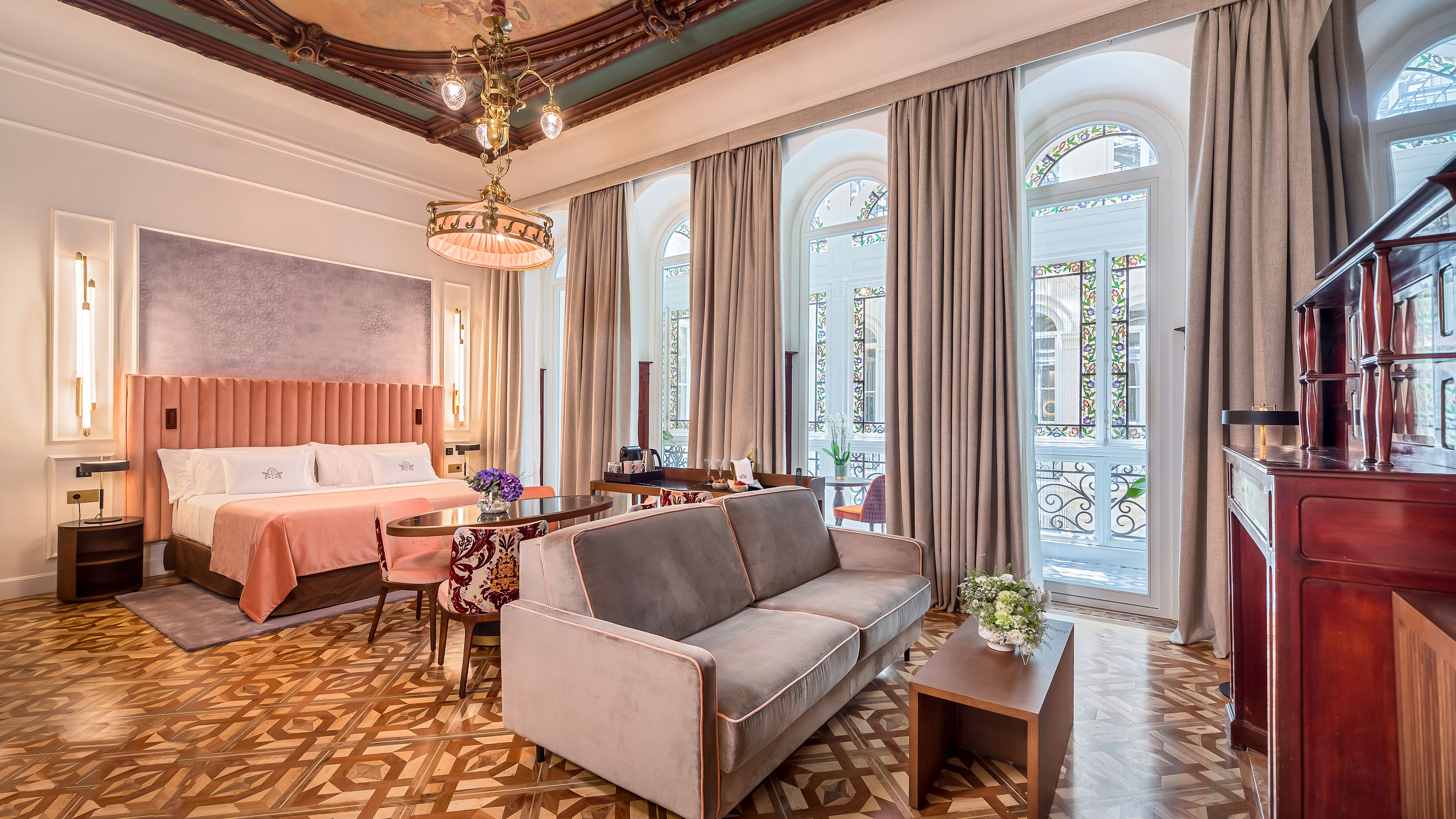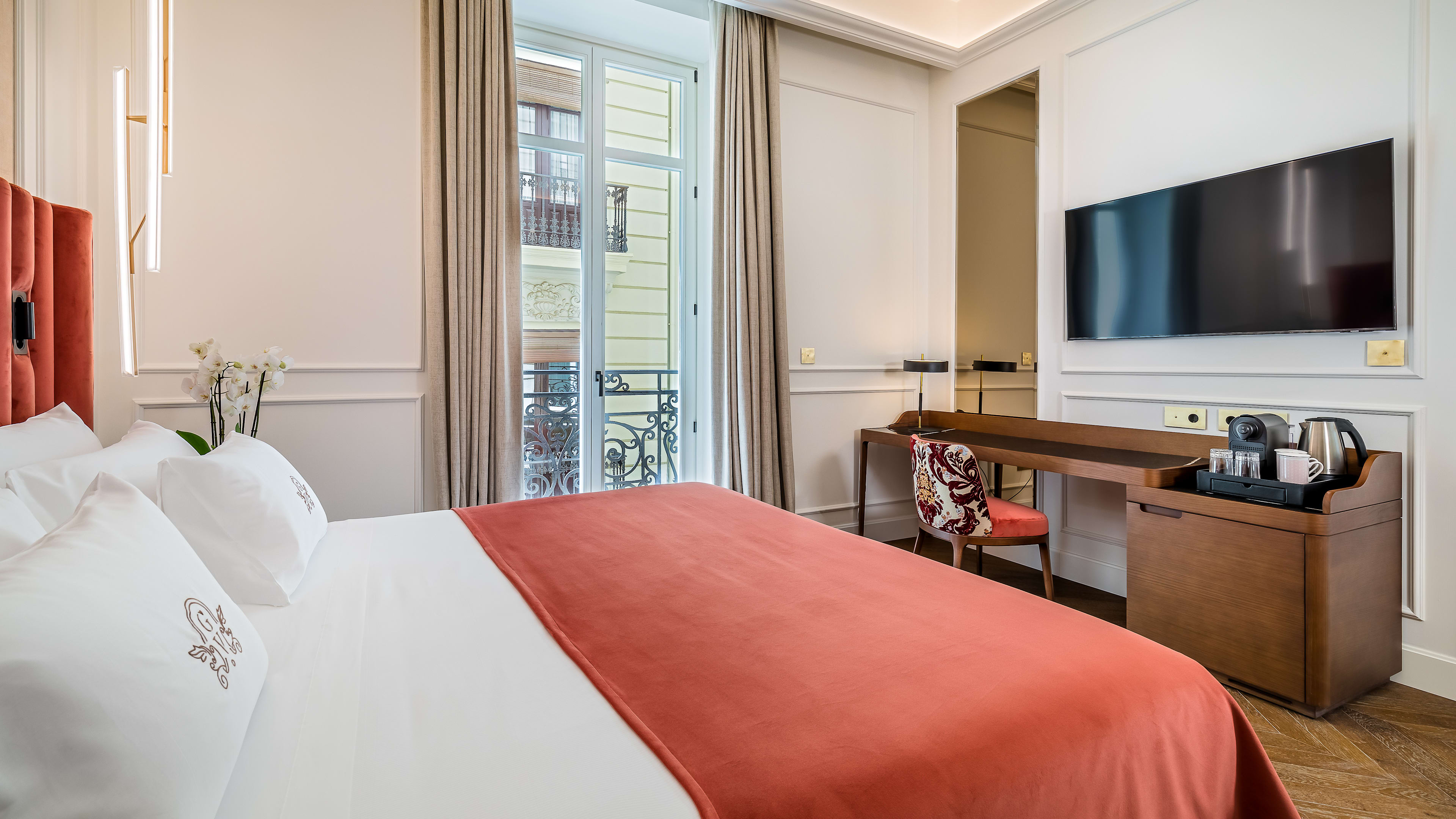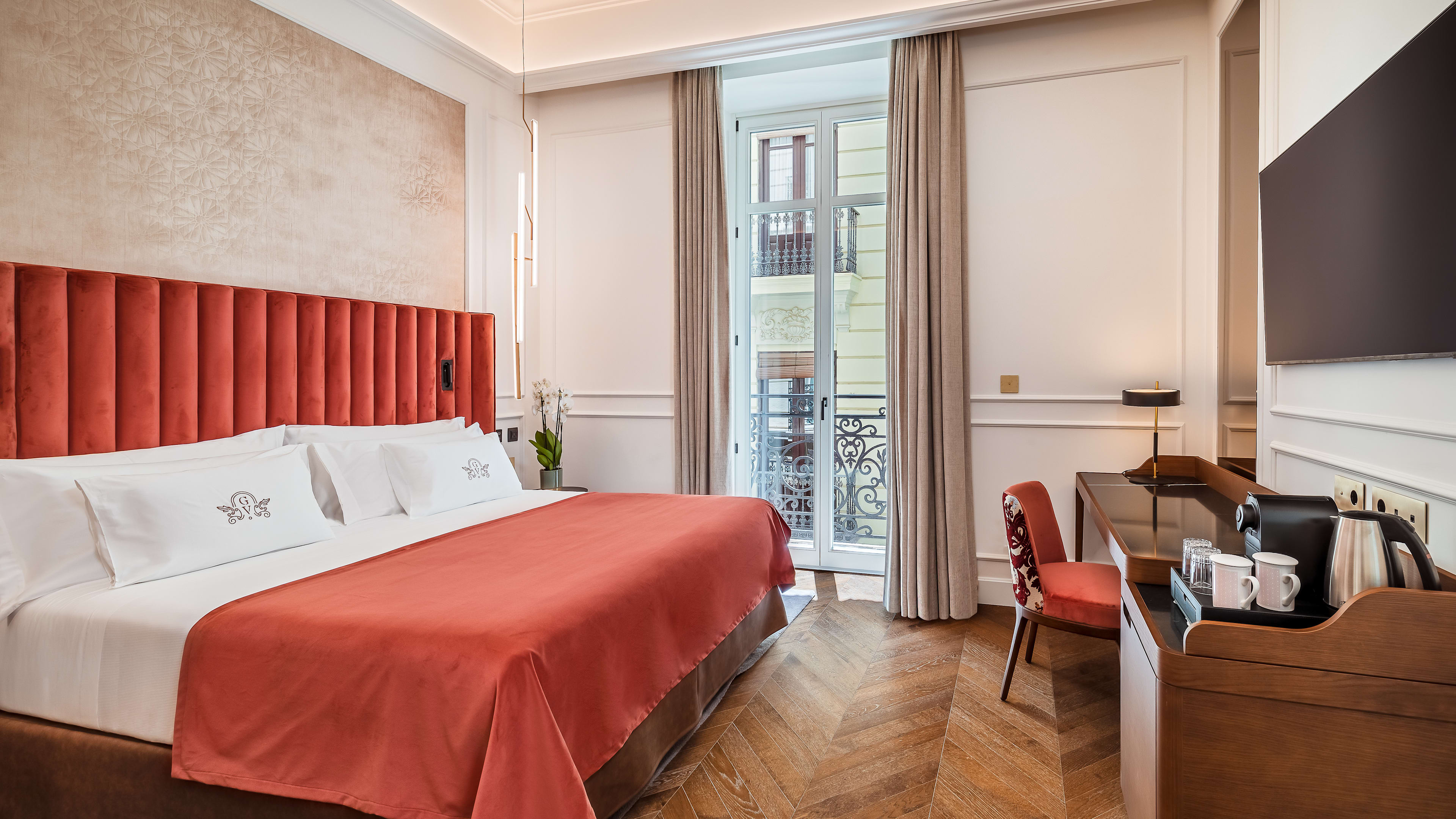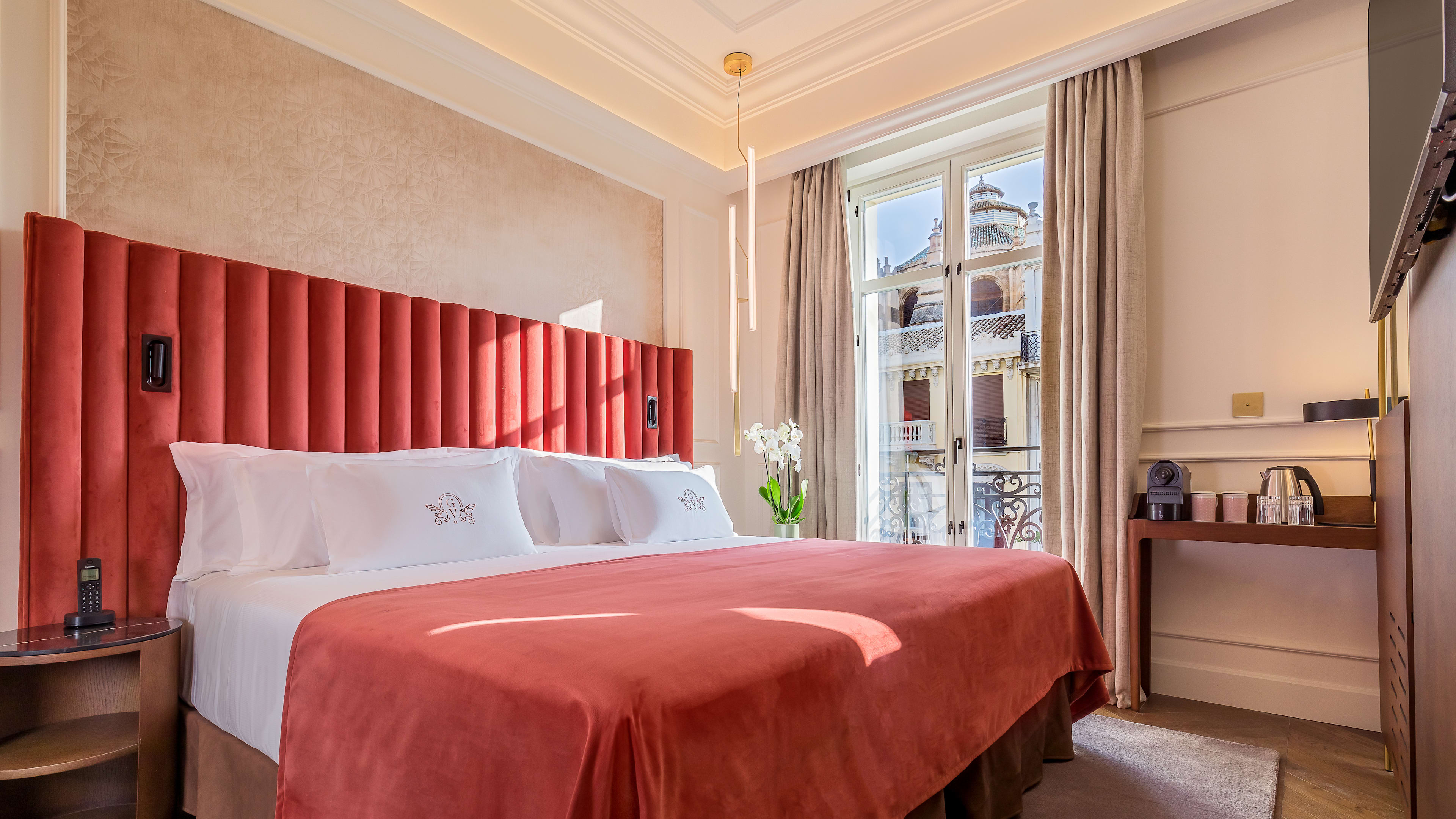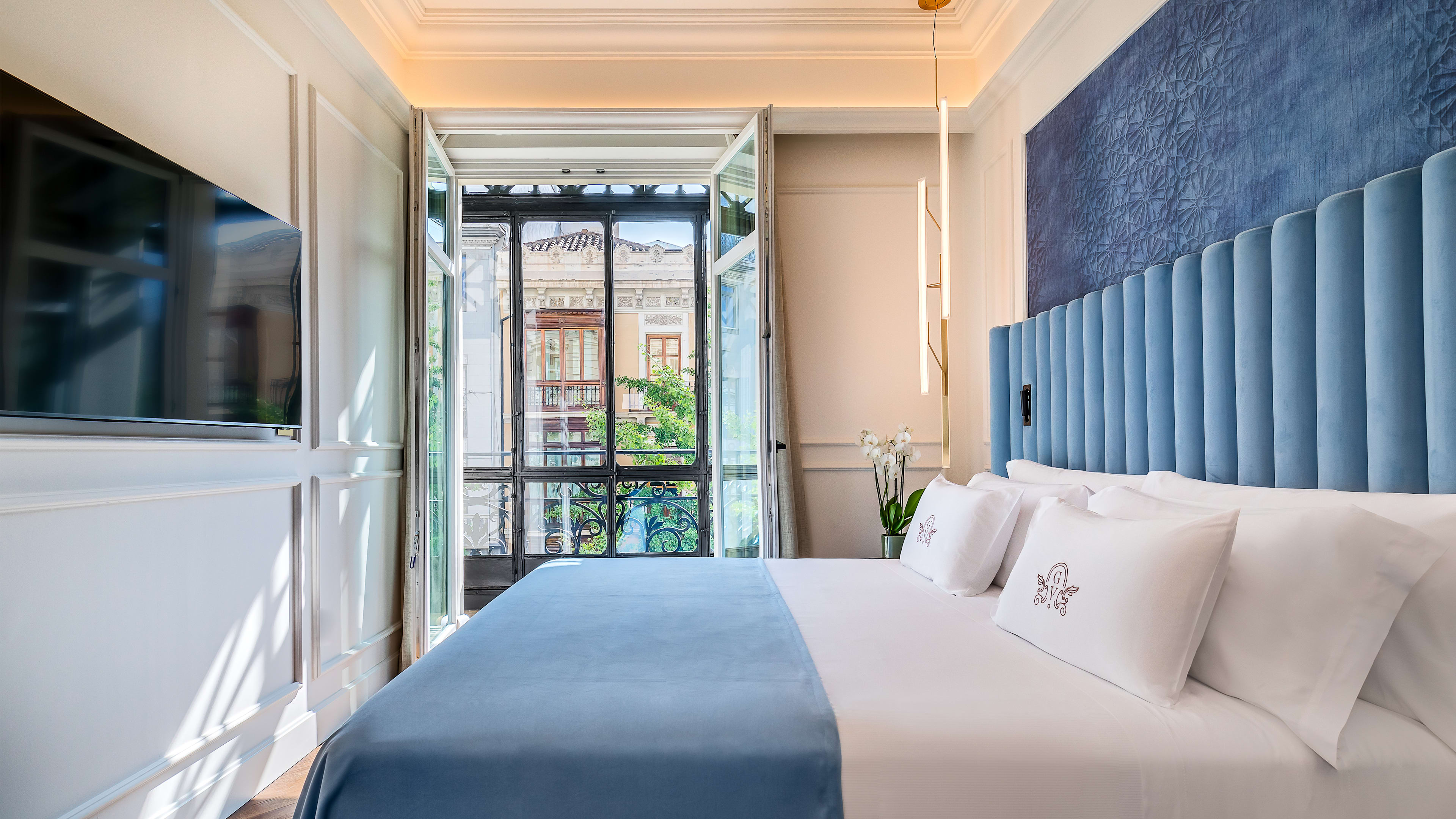 Unless you’re watching a Kubrick movie, hotel corridors aren’t normally something to shout about, but each floor here has a different style of gloriously colourful and detailed tiling. And more nods to the Alhambra are found in the room names, with each named after a flower you’ll find in the complex’s lush gardens. Each is elegantly outfitted, but we like the Suite, which hoards more original features than most and has the city’s knack for flair; it has a gallery with stained-glass windows, an ornate ceiling, flouncy mouldings and more. And the Deluxe Room with Balcony gives you dual-aspect views of the Gran Vía.