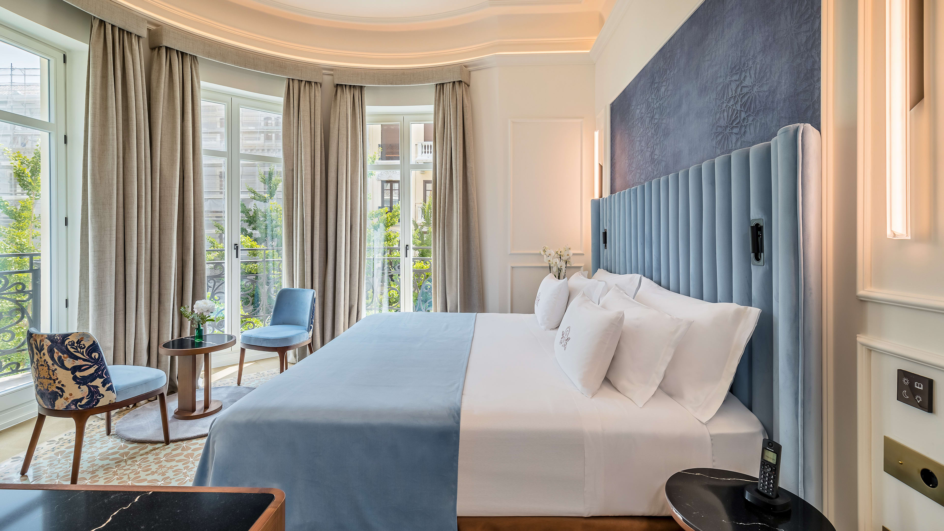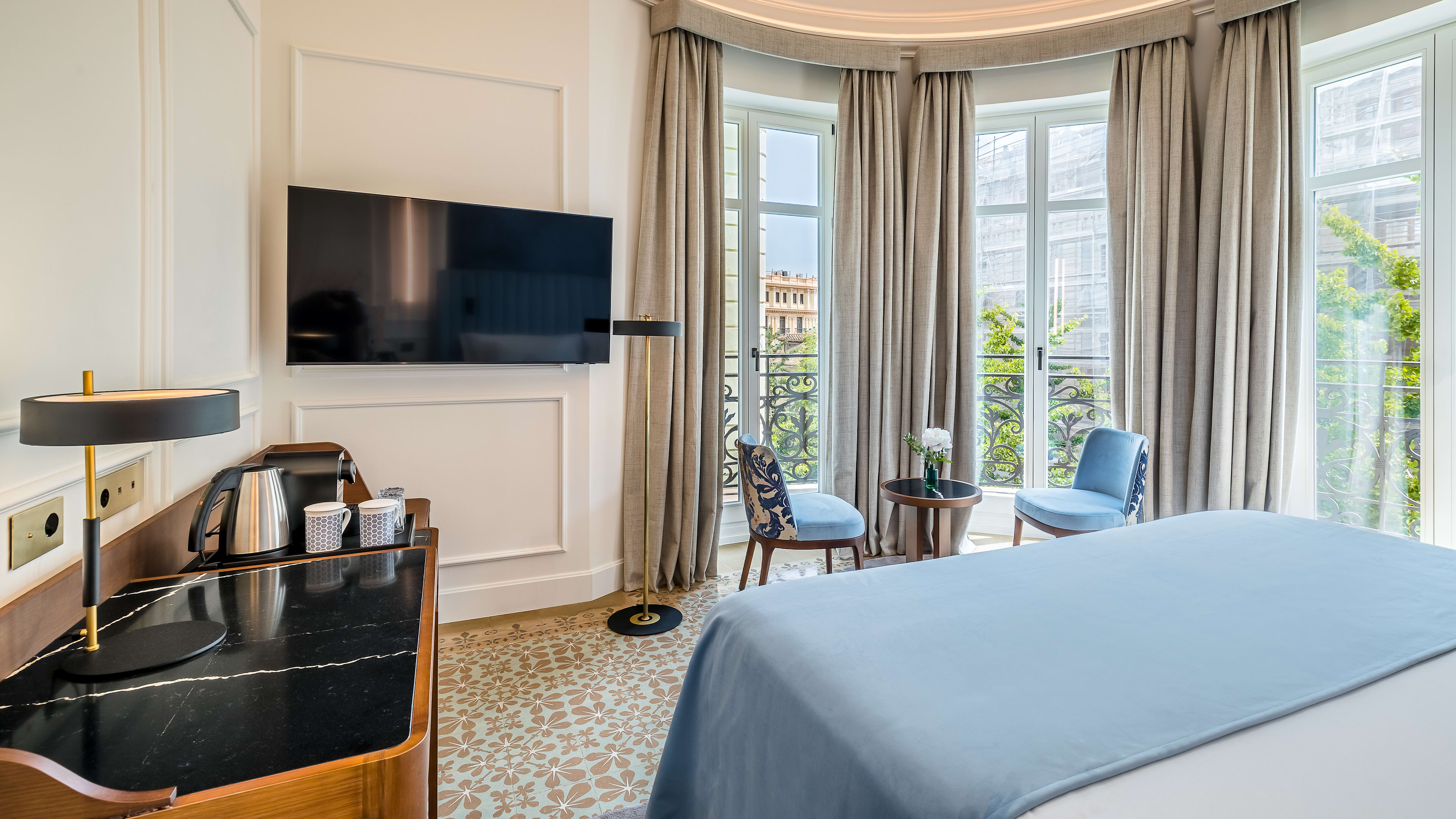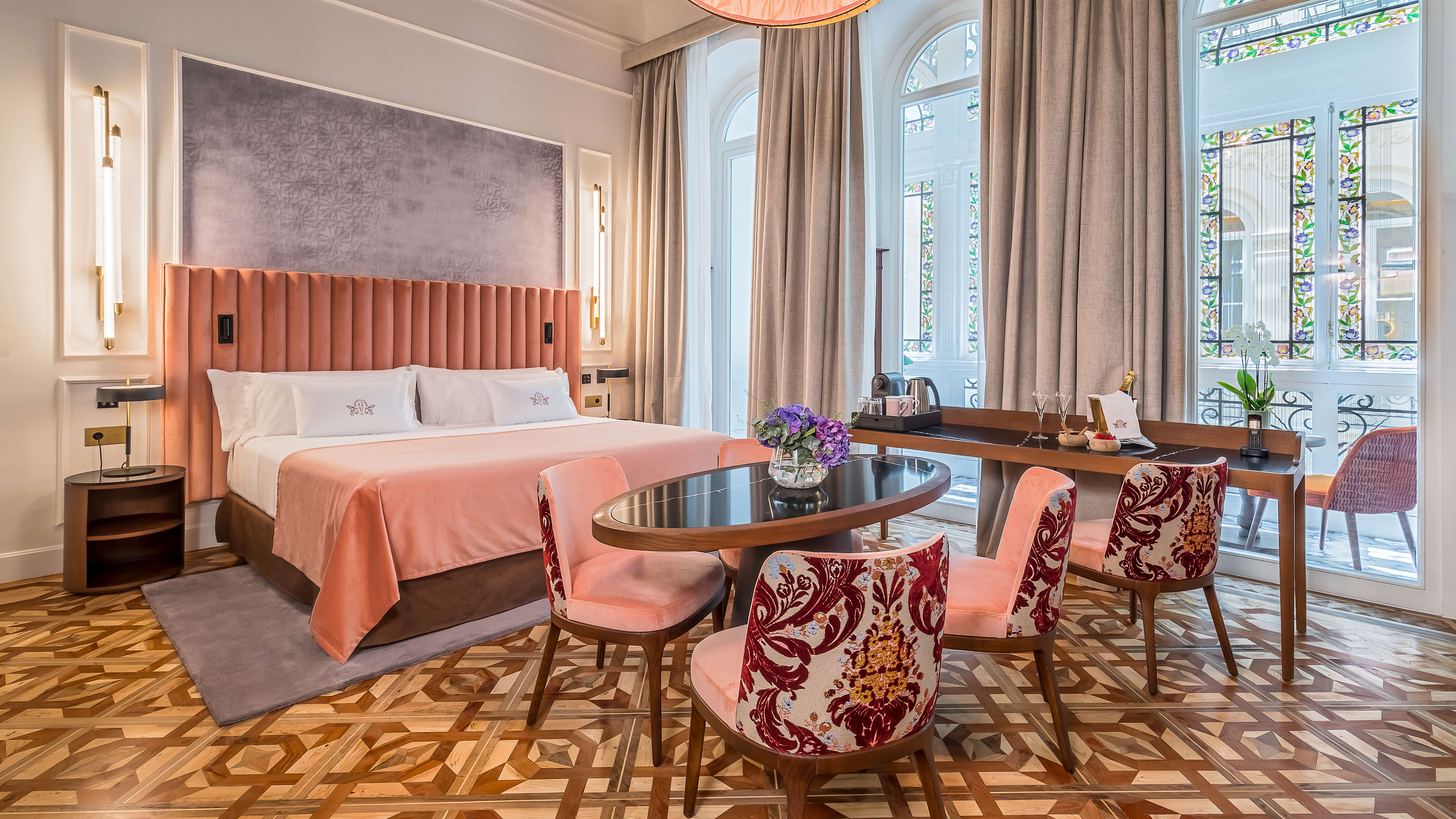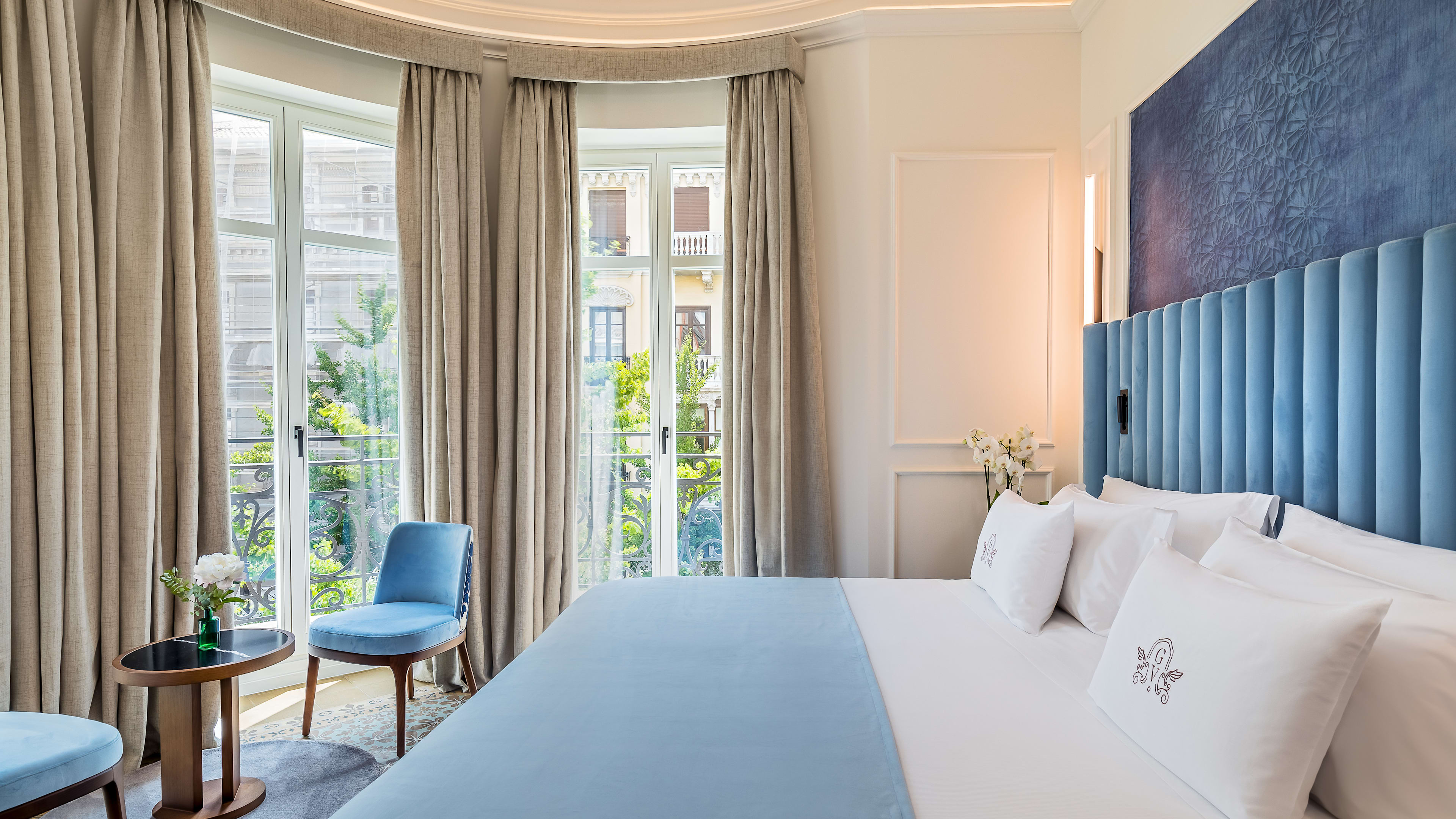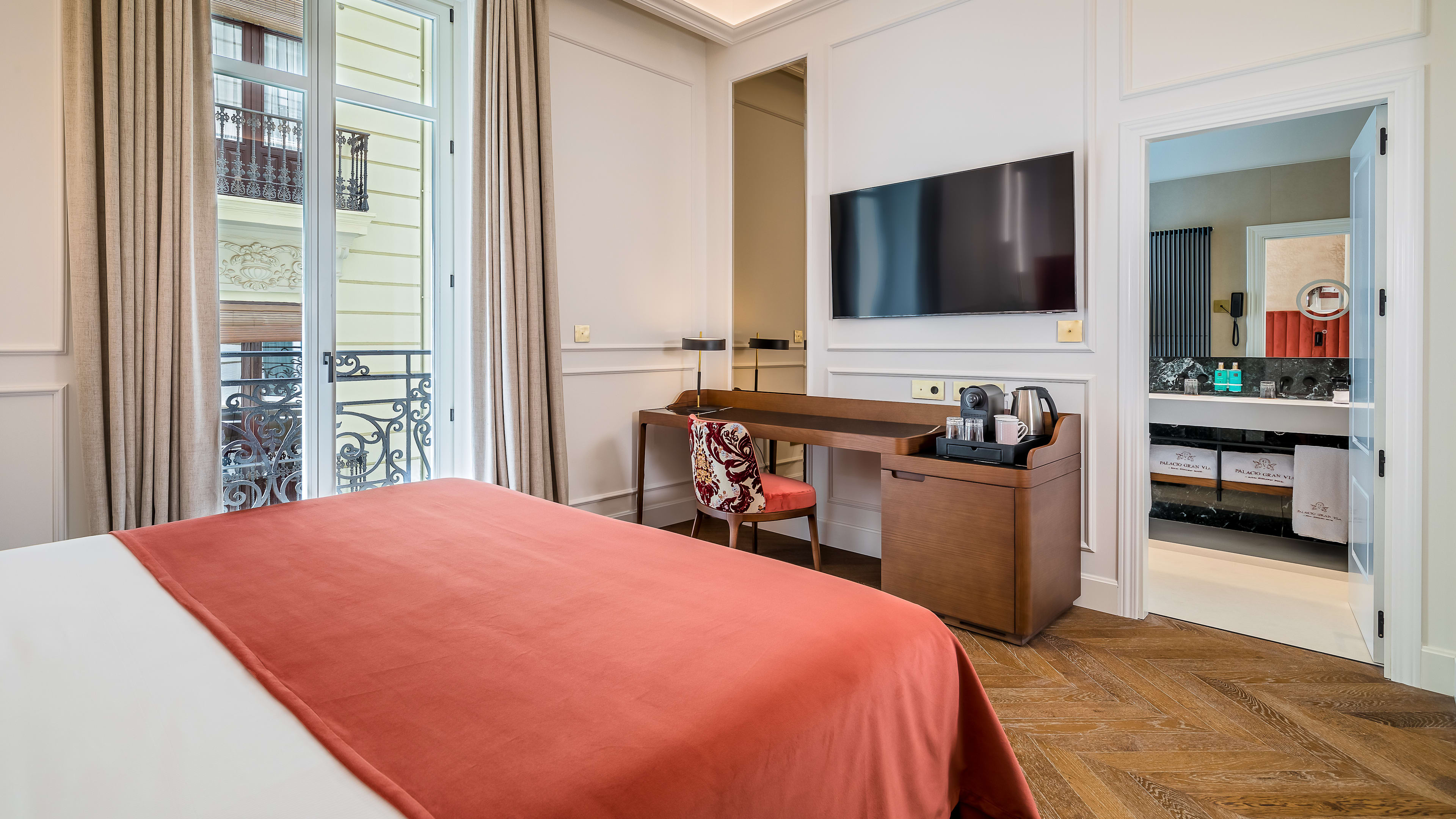 Unless you’re watching a Kubrick movie, hotel corridors aren’t normally something to shout about, but each floor here has a different style of gloriously colourful and detailed tiling. And more nods to the Alhambra are found in the room names, with each named after a flower you’ll find in the complex’s lush gardens. Each is elegantly outfitted, but we like the Suite, which hoards more original features than most and has the city’s knack for flair; it has a gallery with stained-glass windows, an ornate ceiling, flouncy mouldings and more. And the Deluxe Room with Balcony gives you dual-aspect views of the Gran Vía.