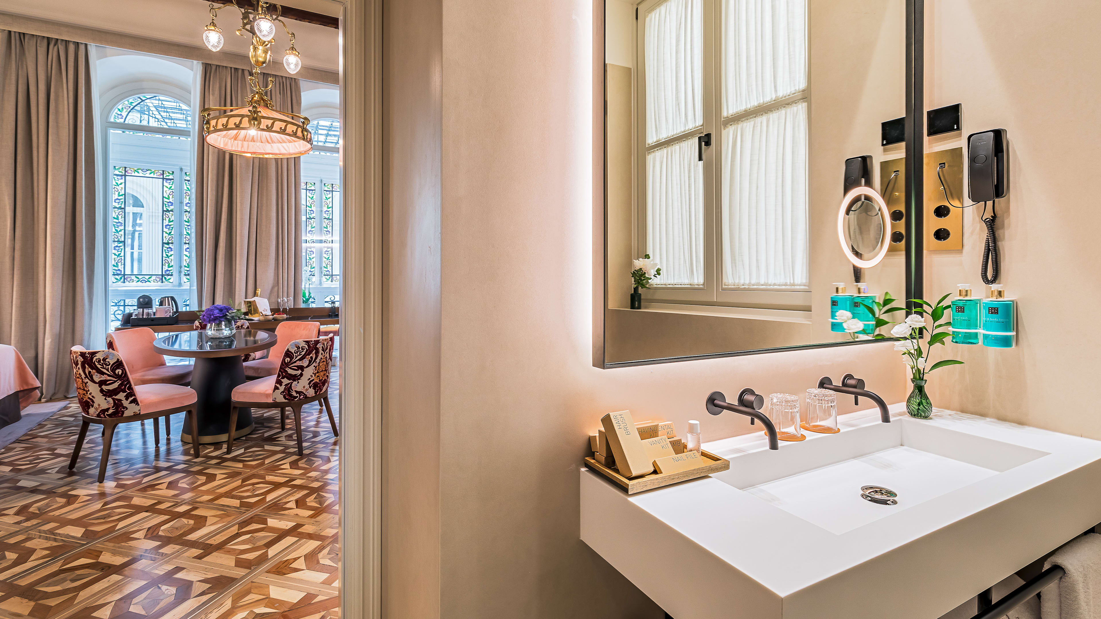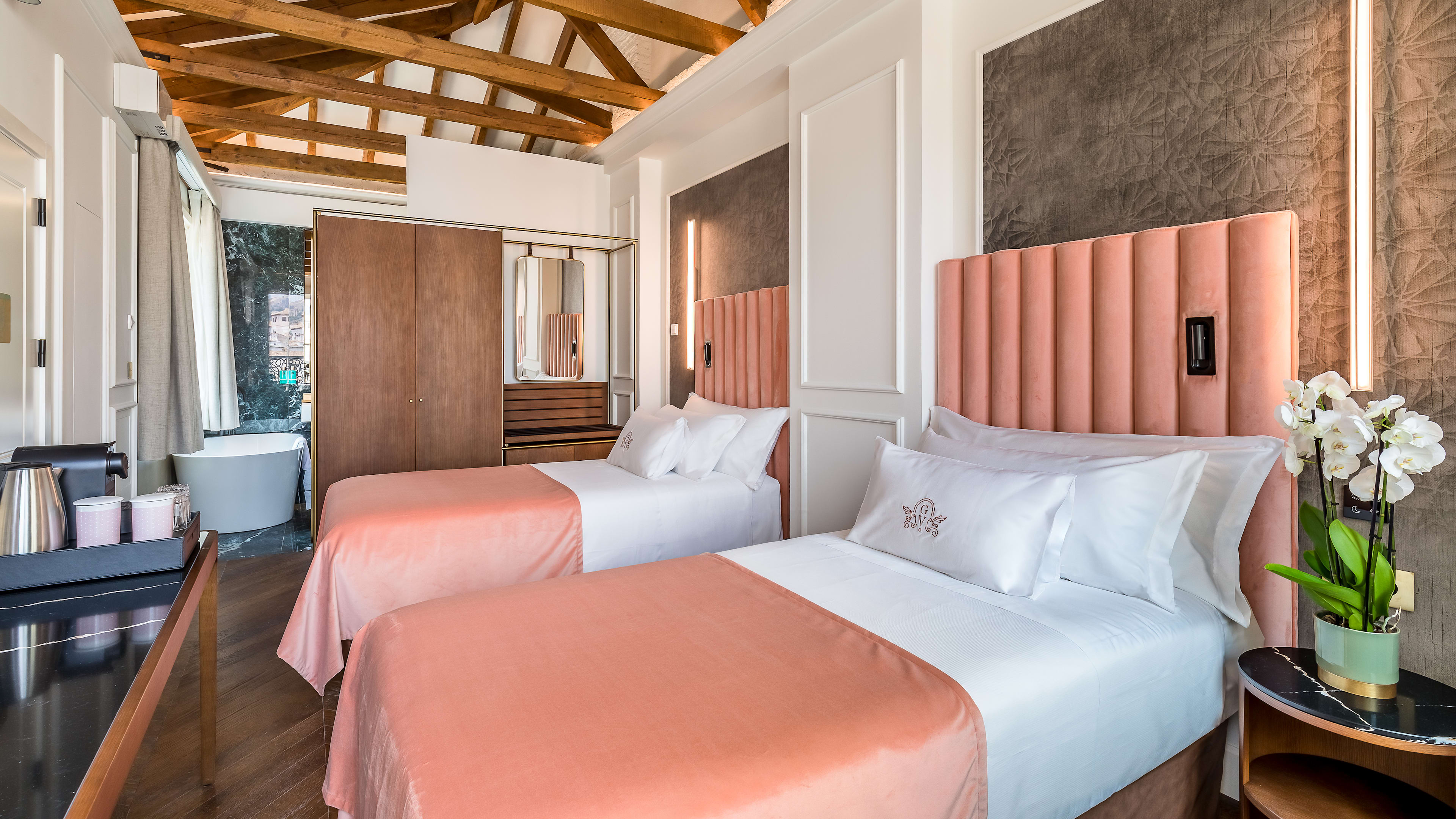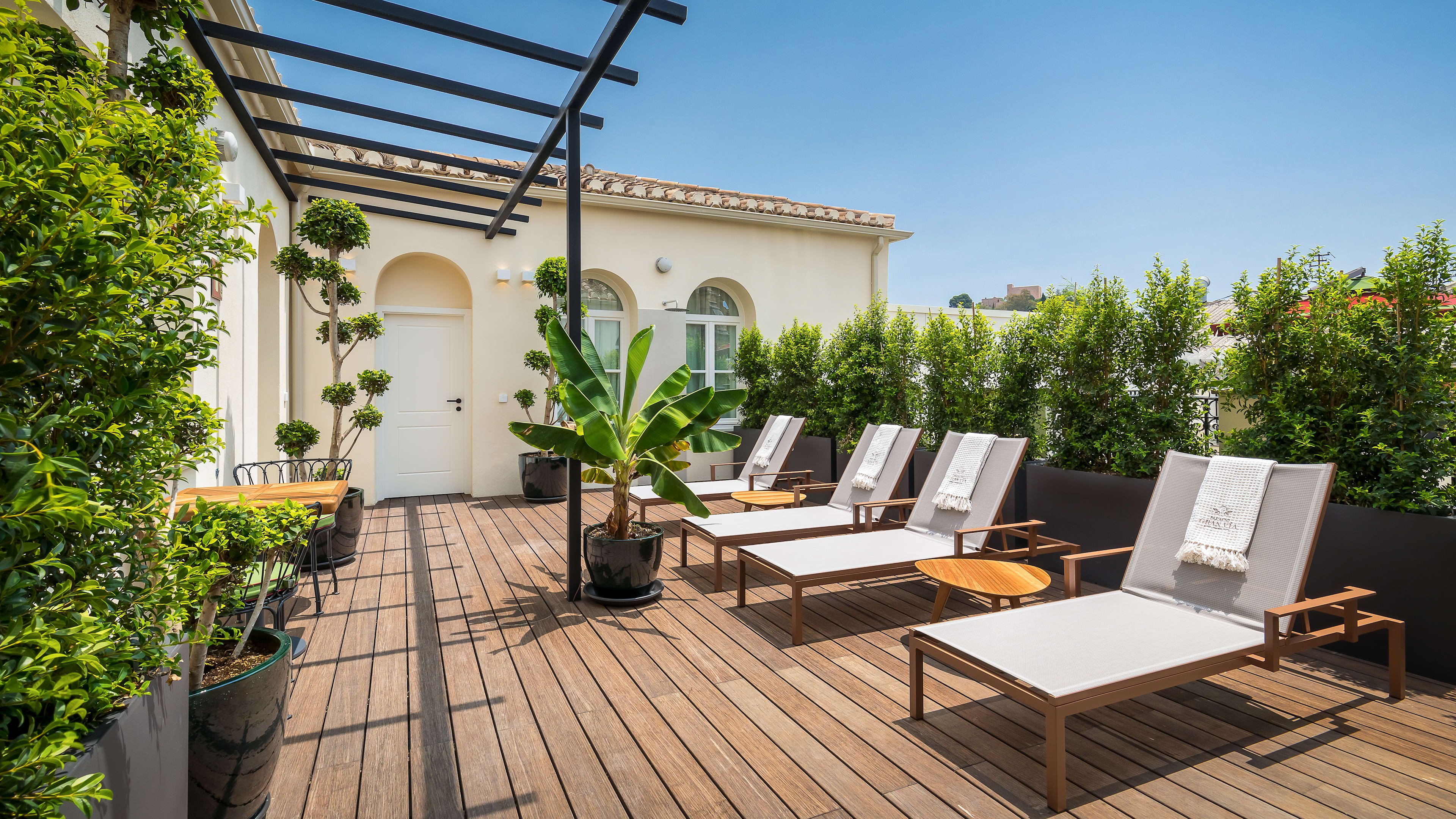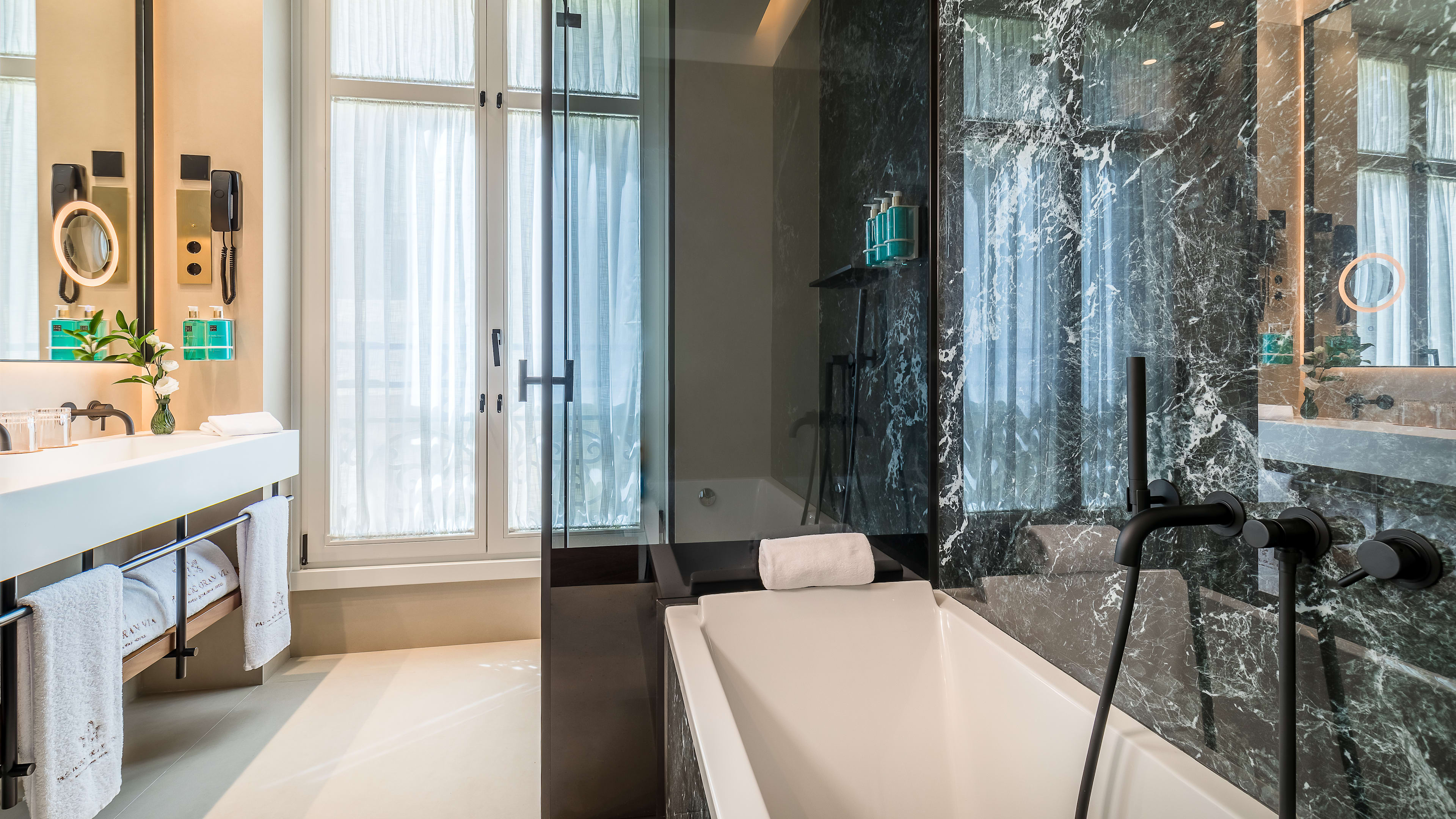 Roof terrace with solarium, gym, hammam, library lounge, charged laundry service, concierge, and free WiFi. In rooms: TV, Nespresso coffee machine, tea-making kit, minibar, air-conditioning, bathrobes and slippers, and Rituals bath products.