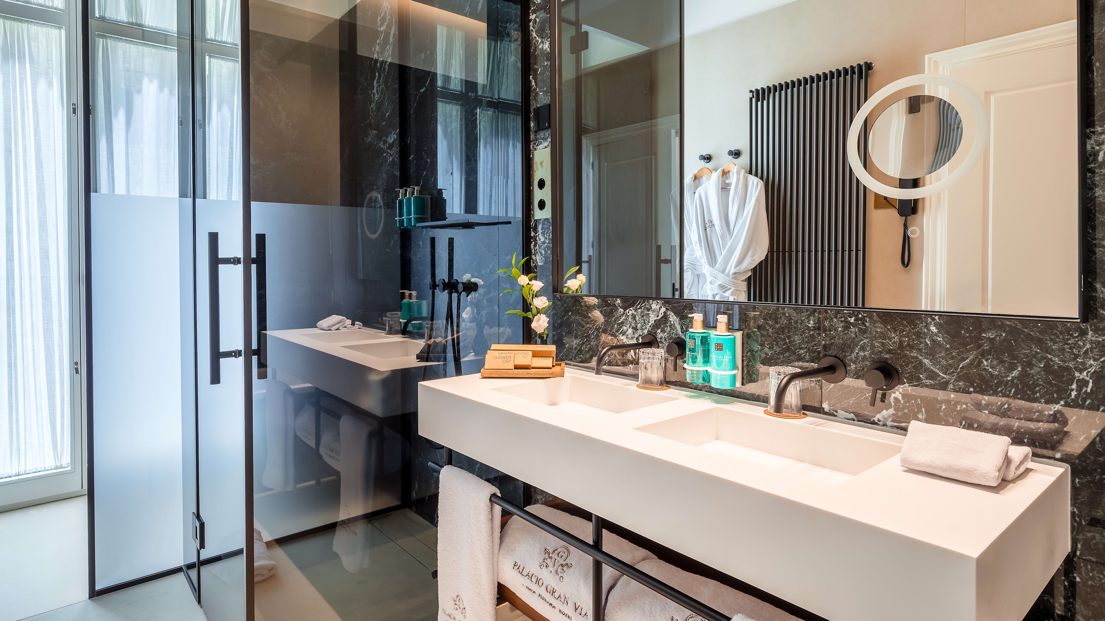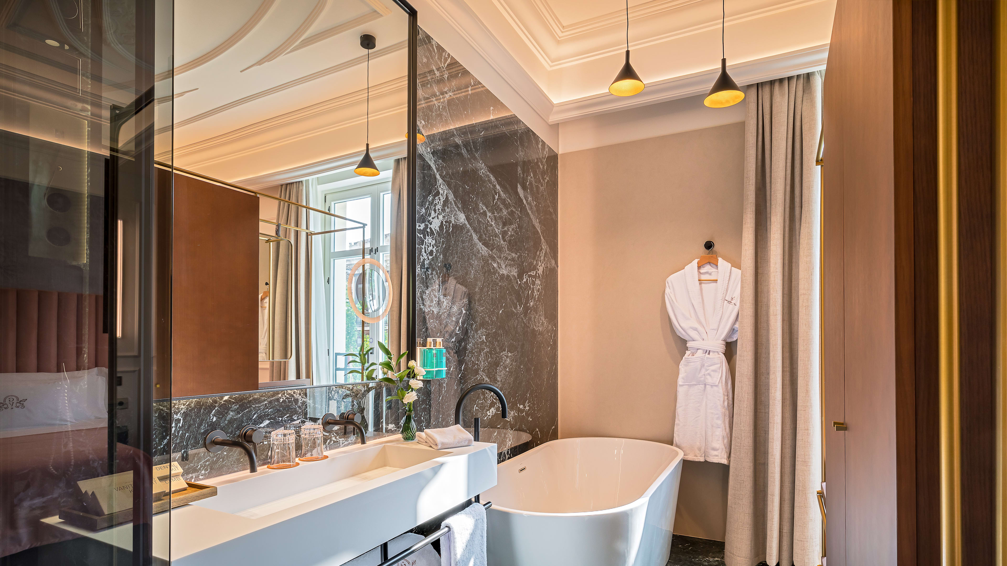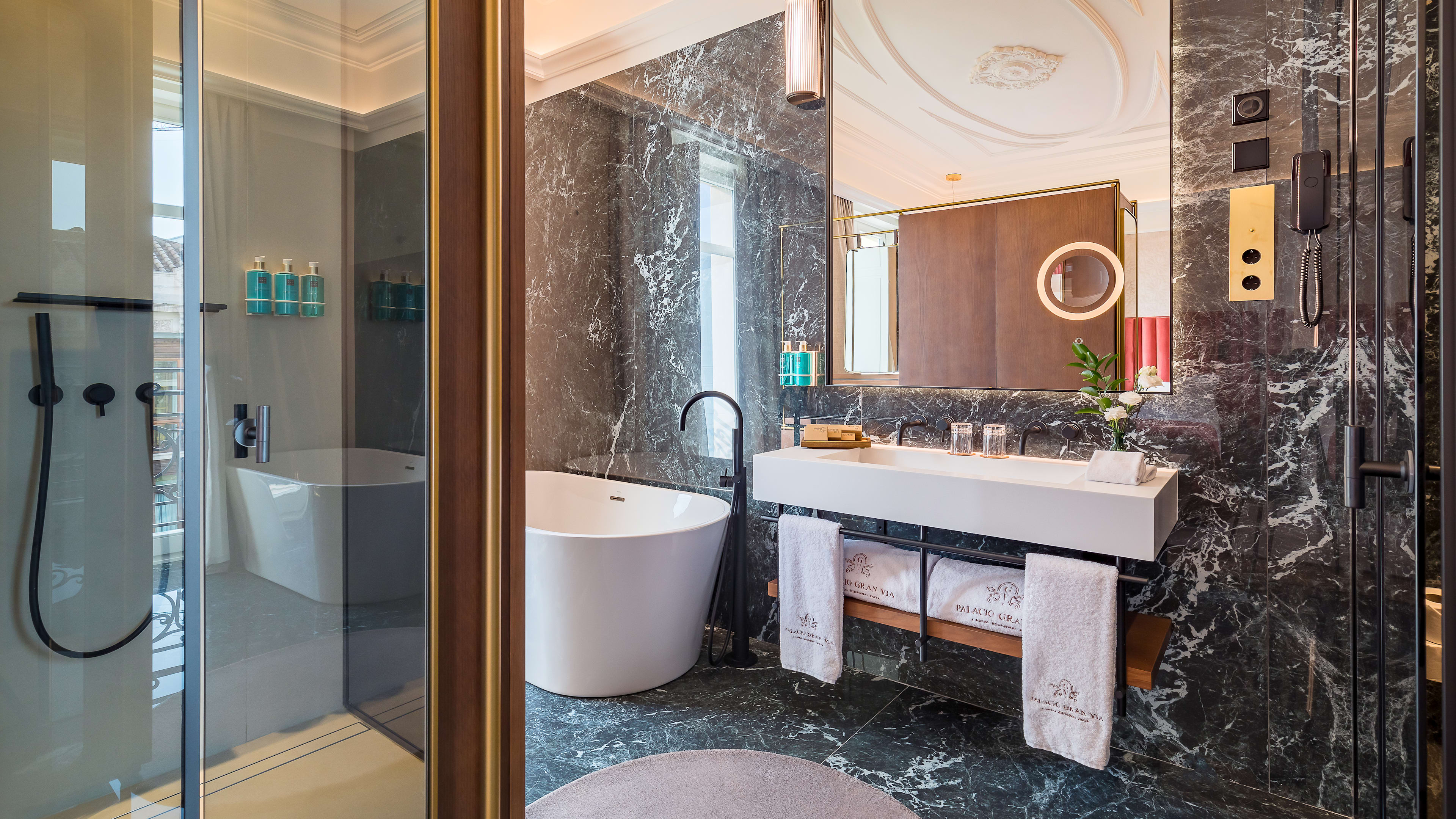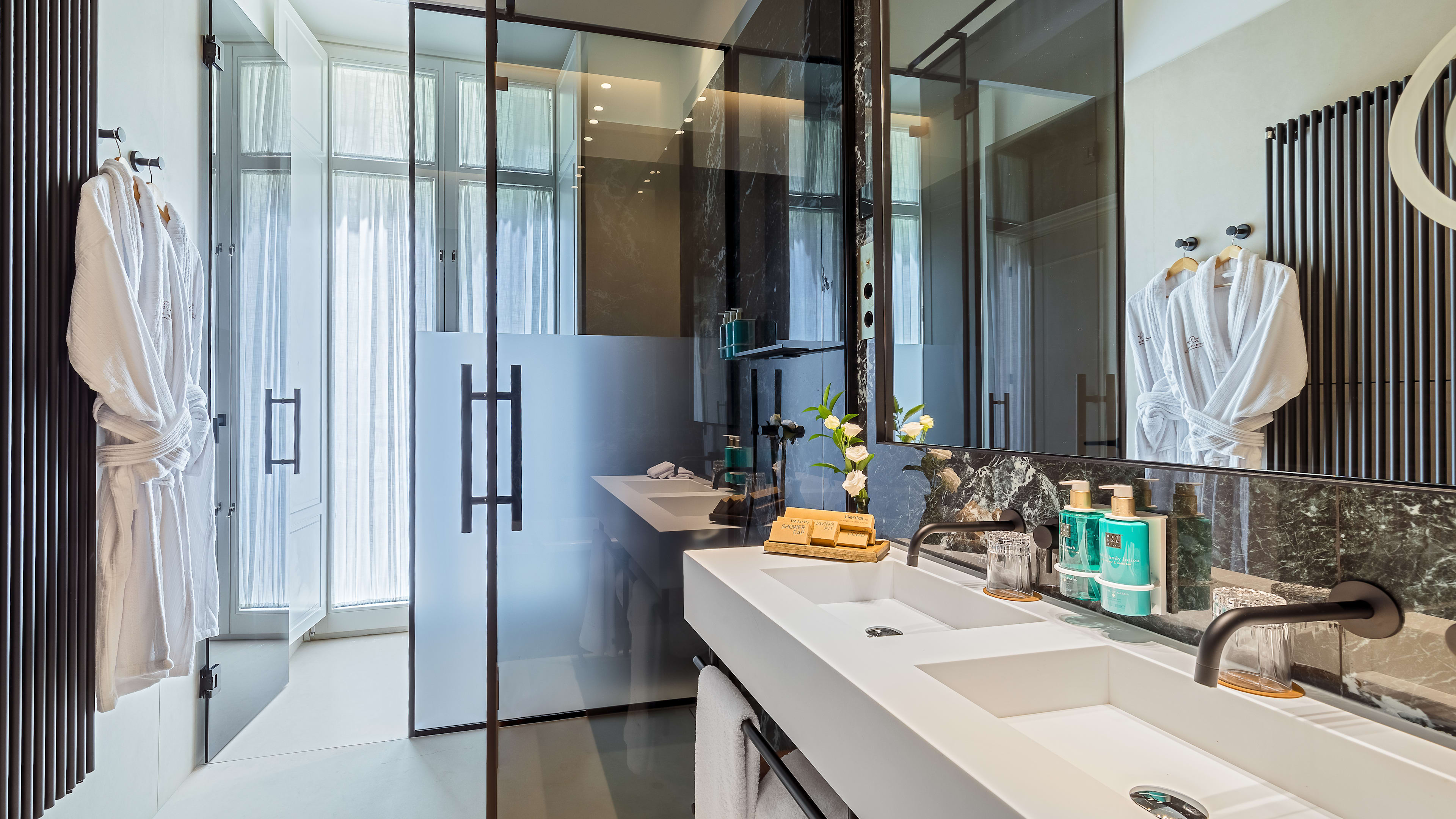 Roof terrace with solarium, gym, hammam, library lounge, charged laundry service, concierge, and free WiFi. In rooms: TV, Nespresso coffee machine, tea-making kit, minibar, air-conditioning, bathrobes and slippers, and Rituals bath products.