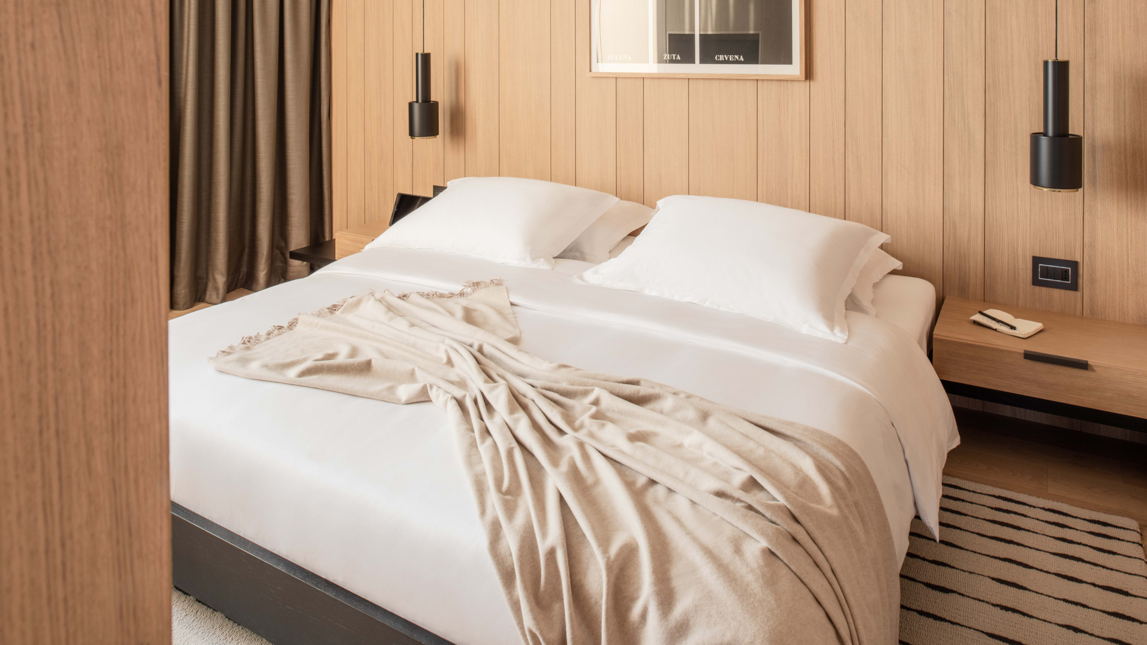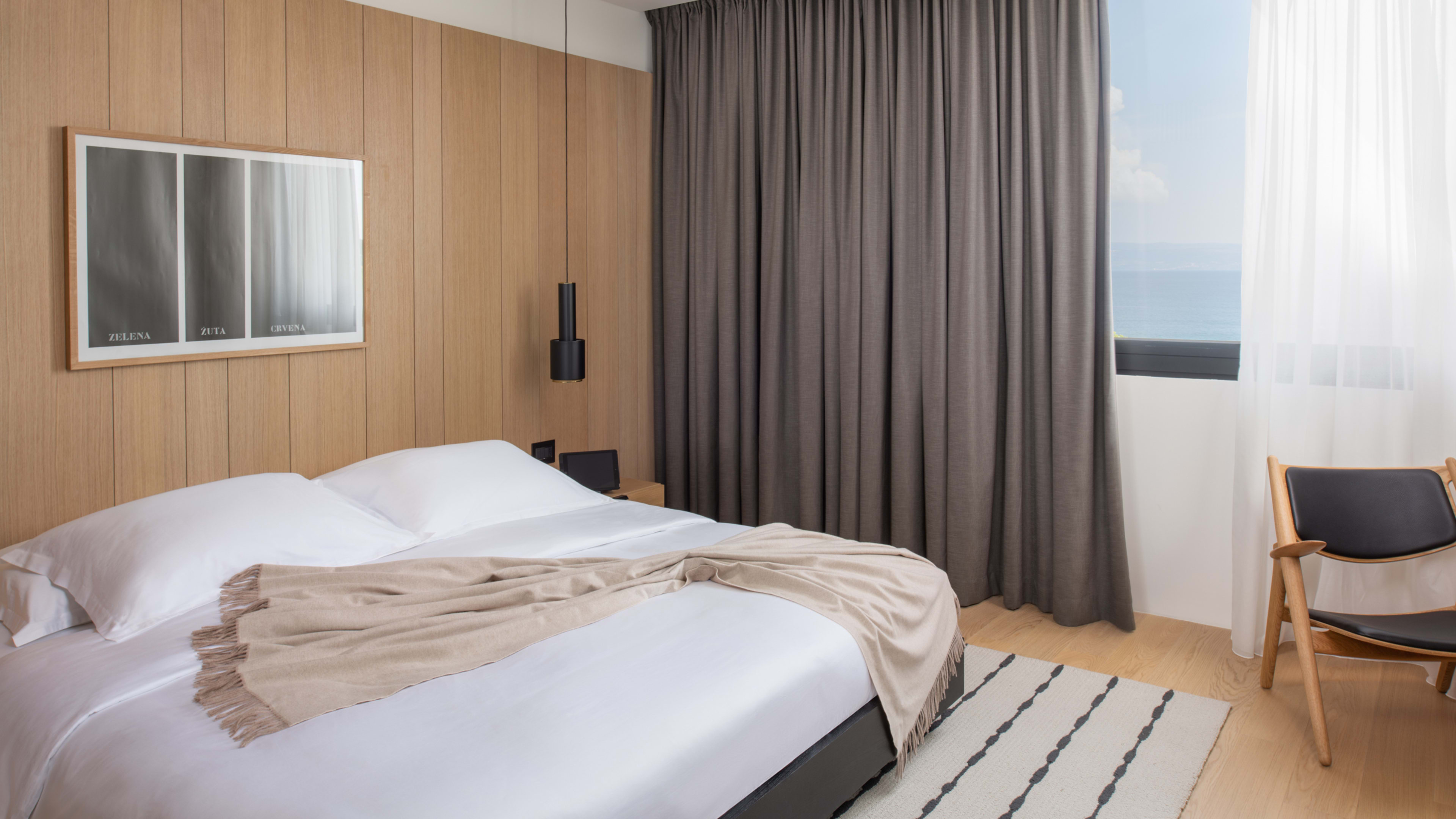 There’s a sky-high swimming pool (open 9am to 9pm) up on the hotel’s sun-soaked rooftop, lined with minimalist loungers which face the shimmering Adriatic Sea.