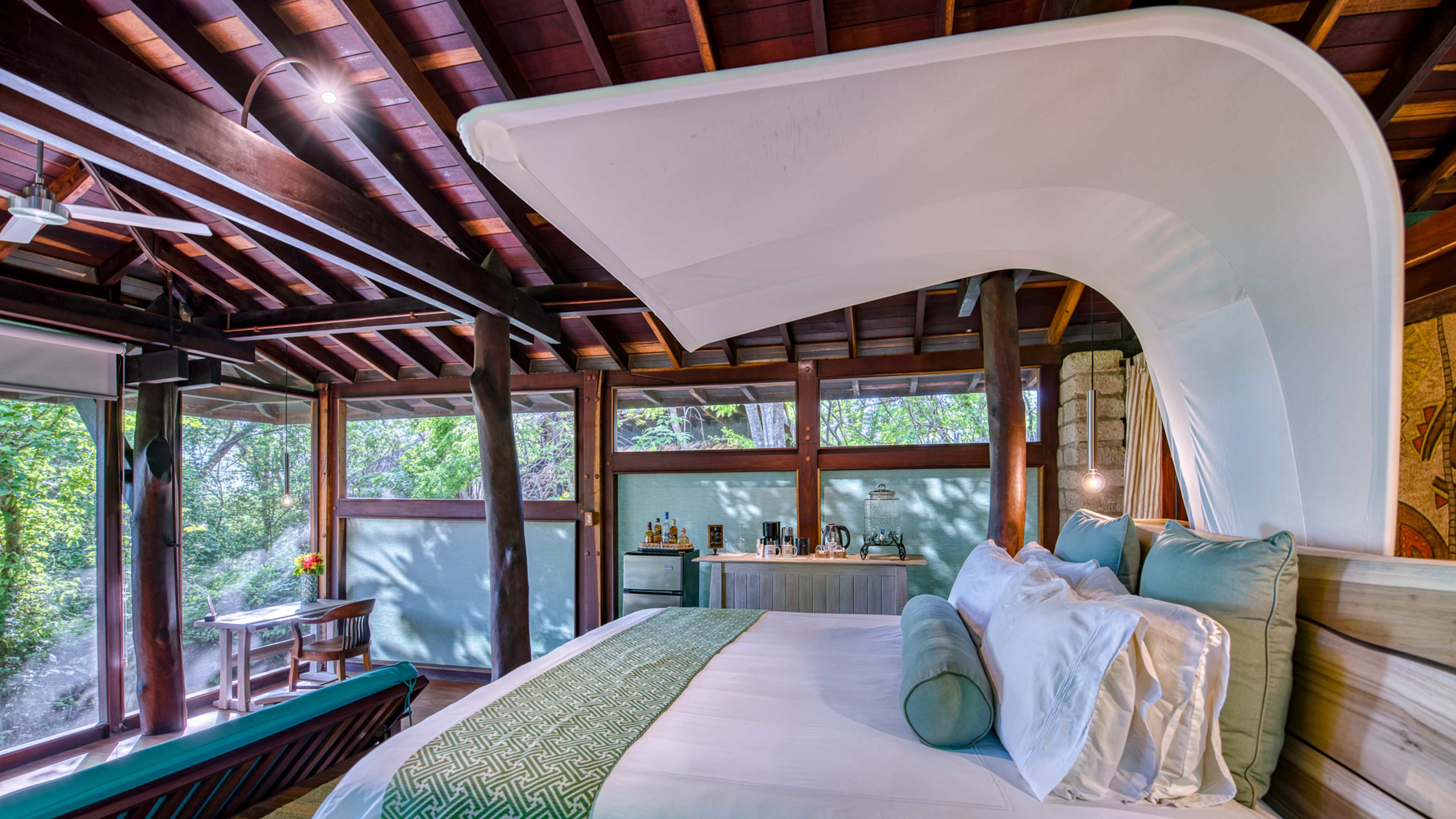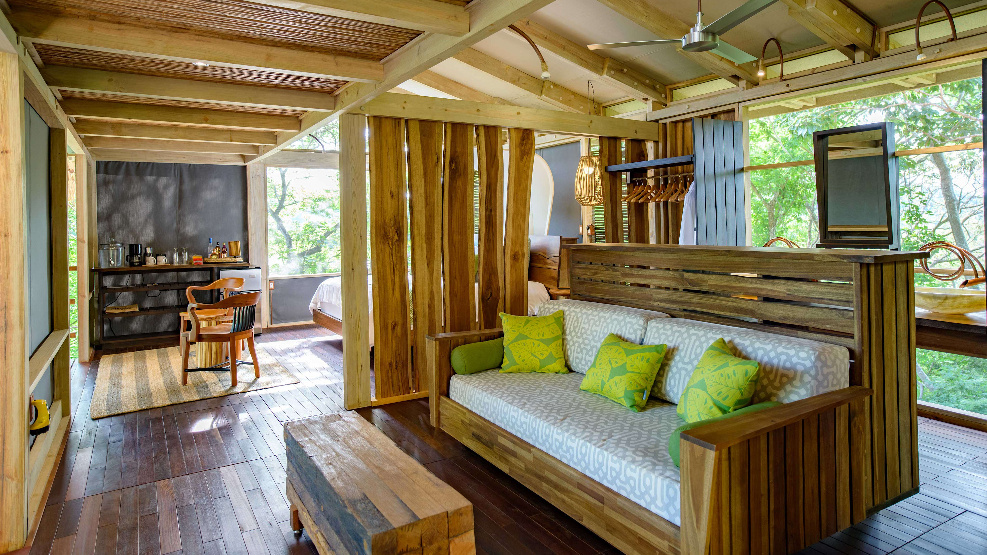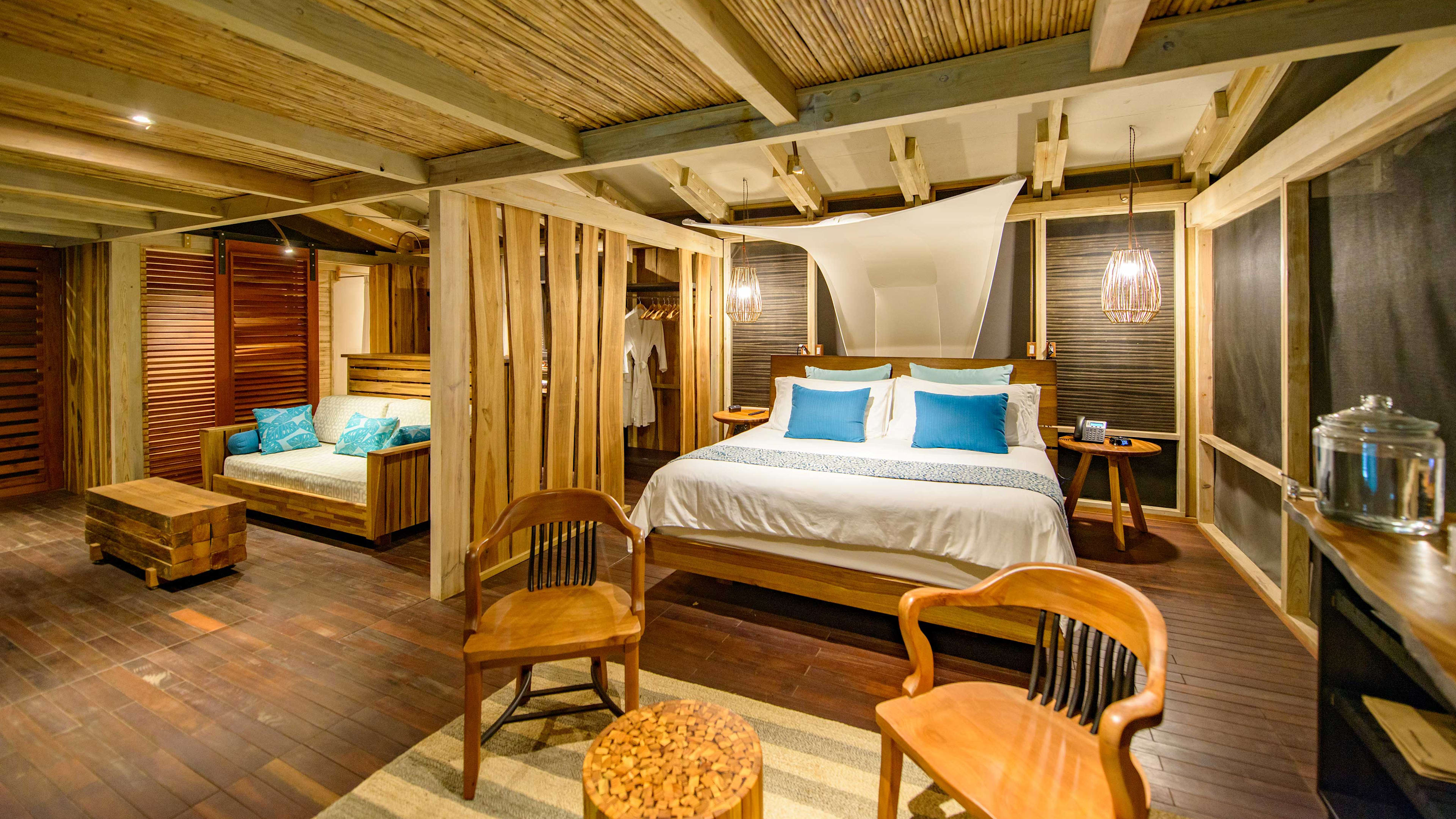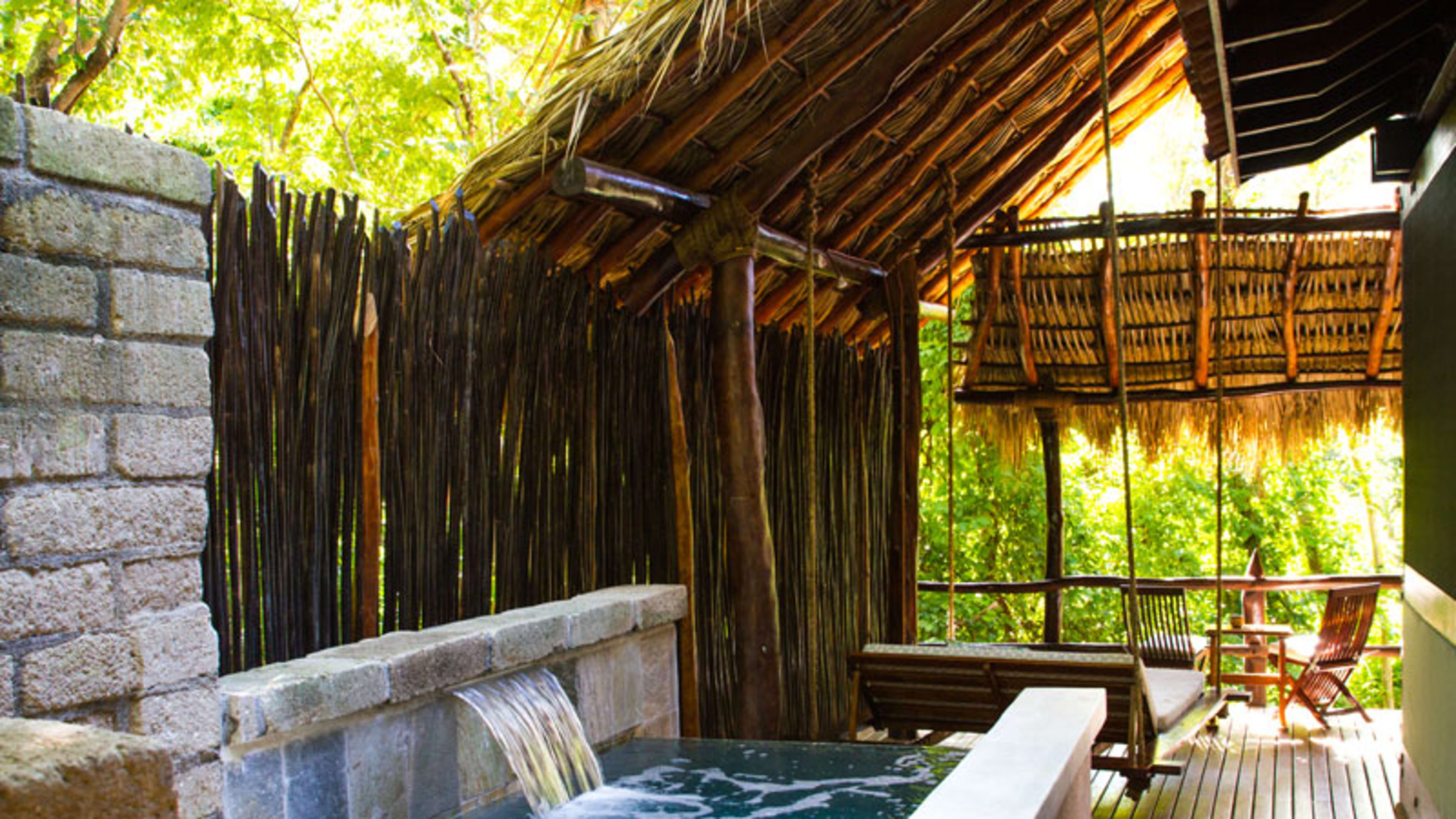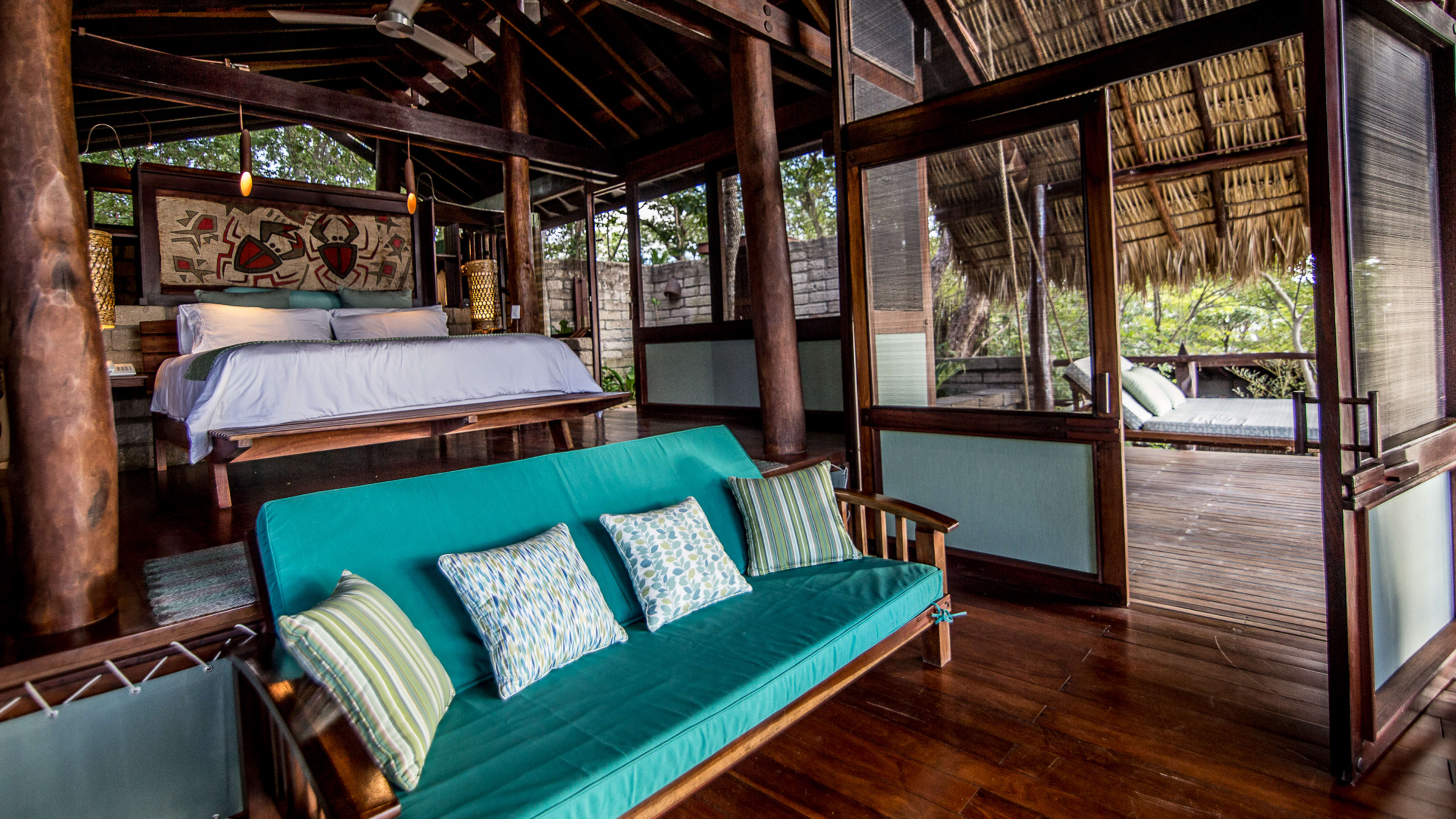 The forest-flanked chlorinated pool is petite, but just-right for sunset watching. There’s a smattering of wooden sunloungers for some post-swim R ‘n’ R; wave over snacks and drinks from the bar as needed. There’s a small child-friendly pool, too. Alternatively, hit the beach to splash in the surf, rock in a hammock or recline on pavilion-shaded lounger and order a couple of coconut cocktails from Mike’s Beach Bar.