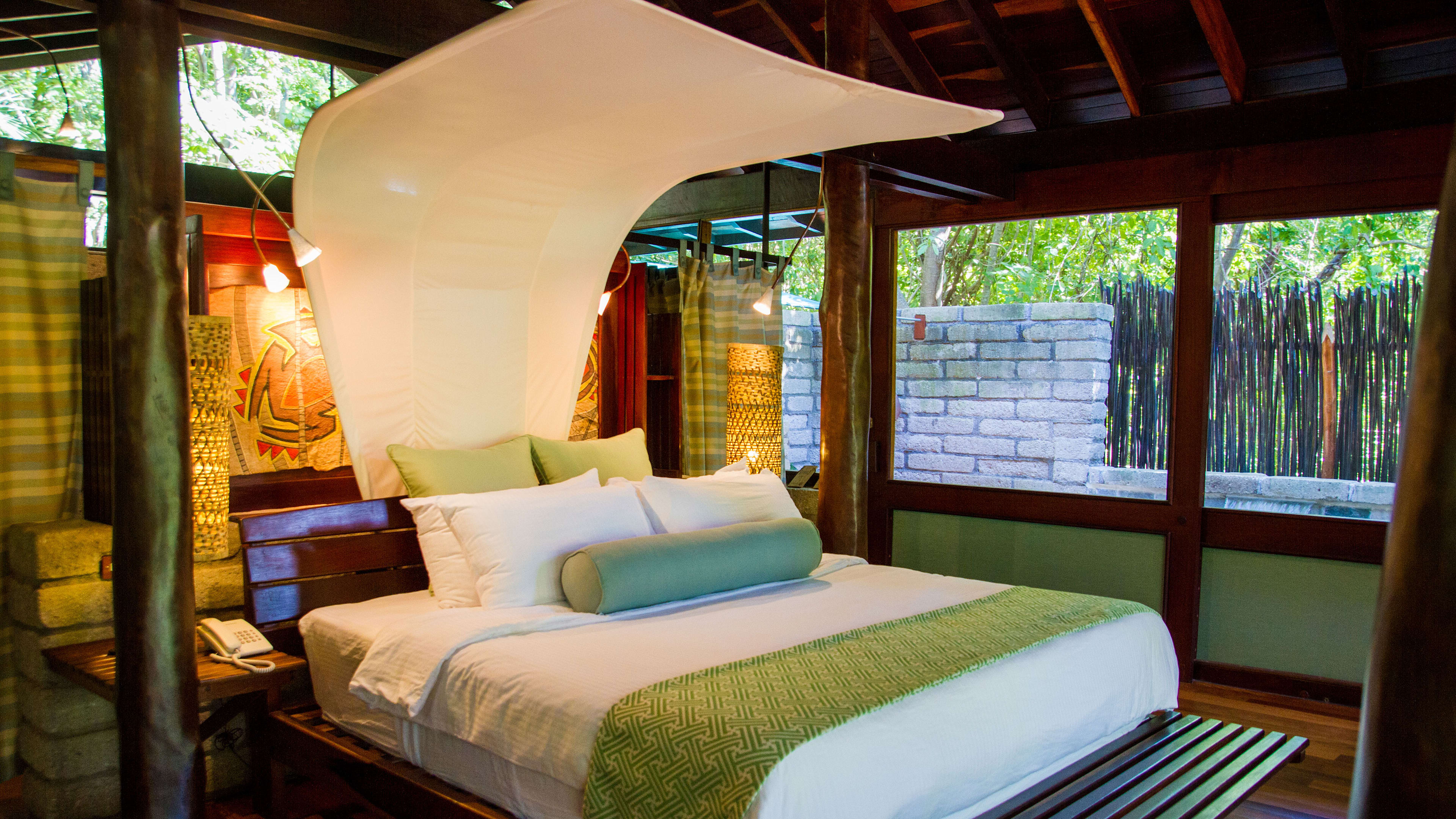 The lodge resides deep in the rural Rivas department; beyond its ley-lines sprawl sugar-cane fields and mango orchards, and to the east Concepción and Maderas volcanoes rise from Lake Nicaragua to form Ometepe Island. With hotel staff’s help, the intrepid and stamina-blessed can climb these behemoths, but it’s a round trip of up to 10 hours and rocks near the top get a little toasty. The grounds offer gentler pursuits: biking, horse riding, monkey- and sloth-spotting trips, jungle walks by day and night, shrimping… Watersports (surfing, kayaking, boogie-boarding and paddle-boarding) are included in your room rate, and the cove’s sandy beach is a postcard-ready vision; for an added splash of romance, watch the sunset from a hired boat. Come summer, watch the fruits of the hacienda’s conservation efforts, when turtle hatchlings scurry from egg to sea. Twitchers should pack binoculars to up the chance of seeing scarlet macaws, herons, egrets and other graceful birds. Take to the canopy to get a closer look.