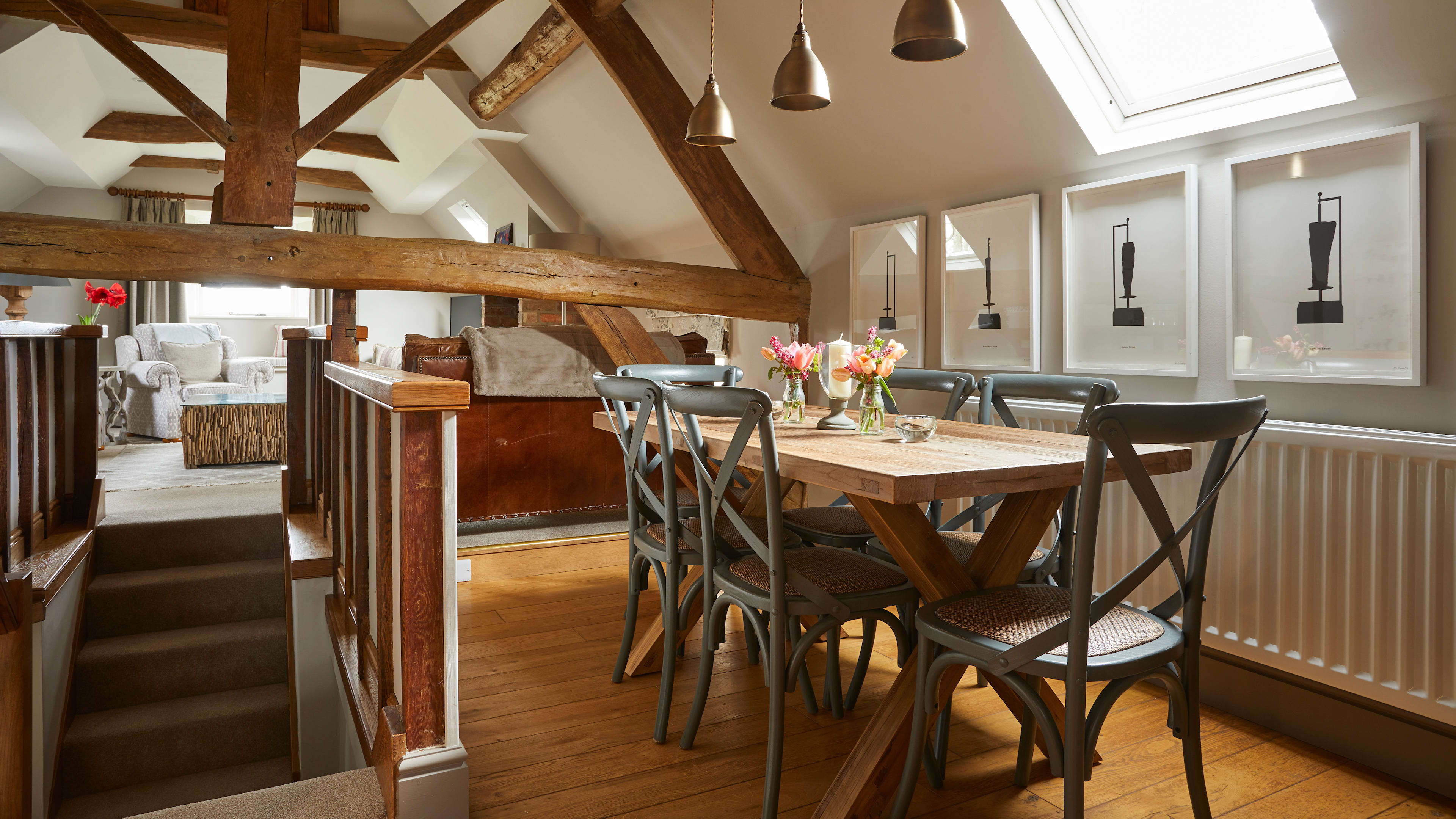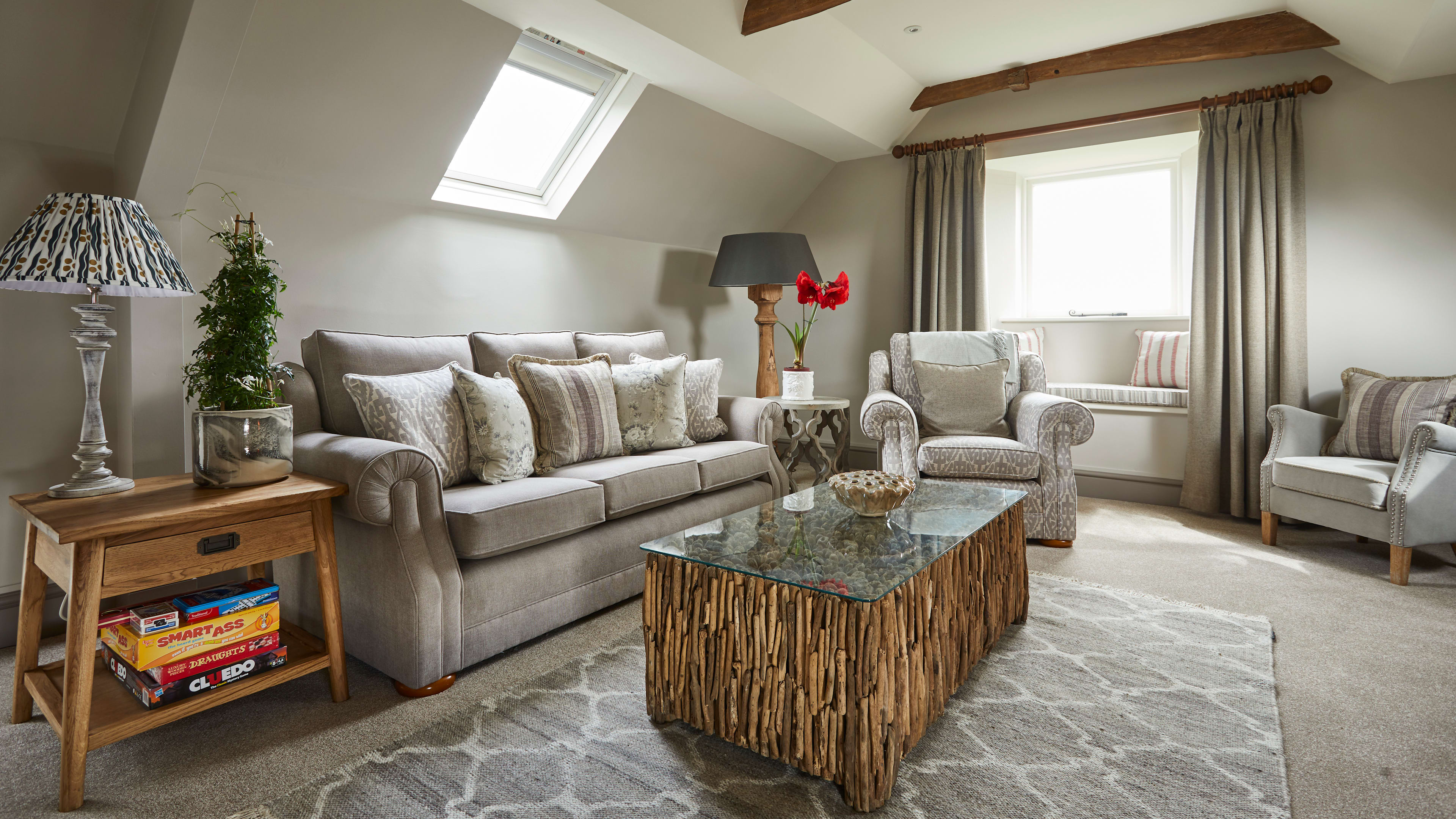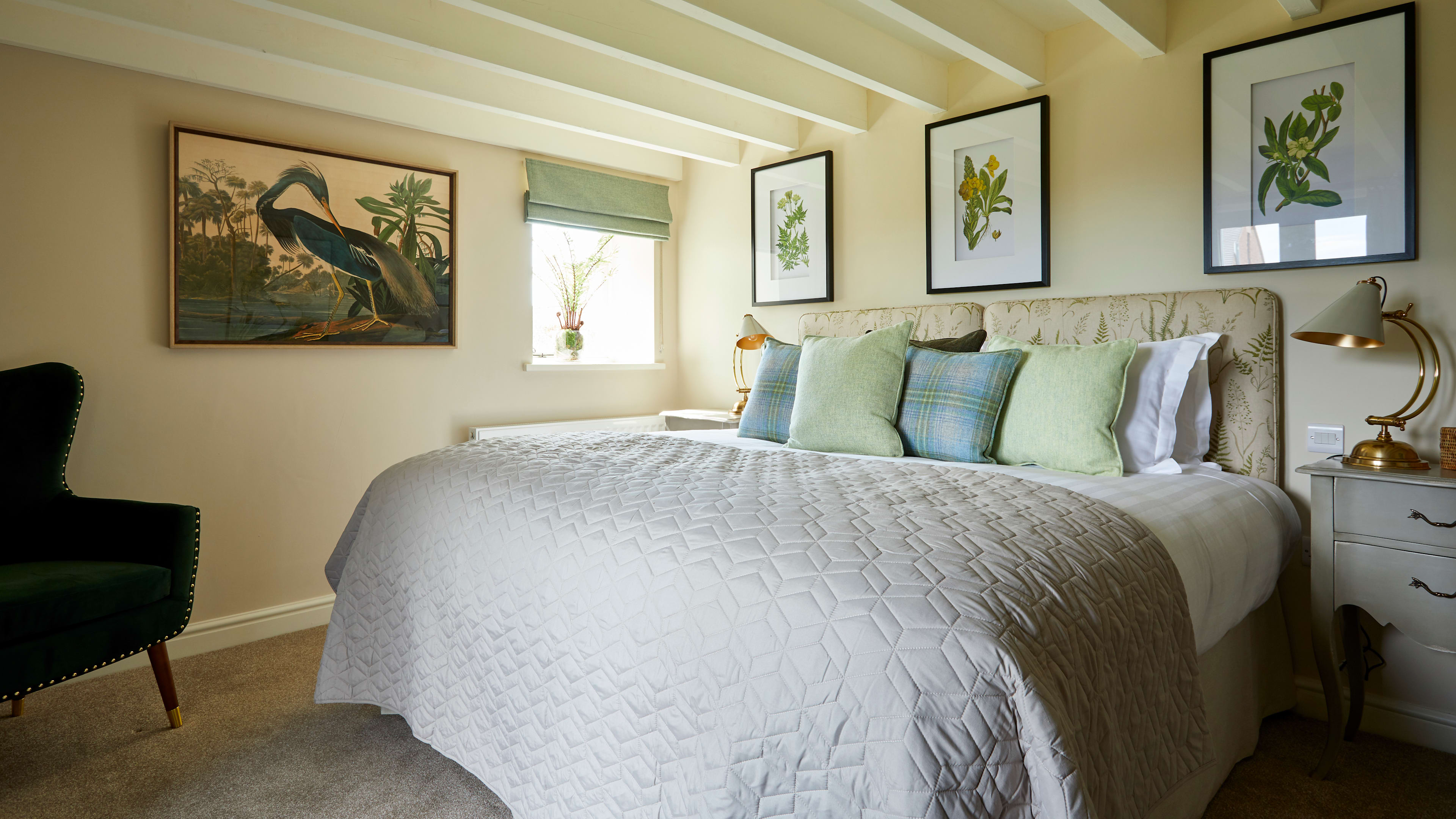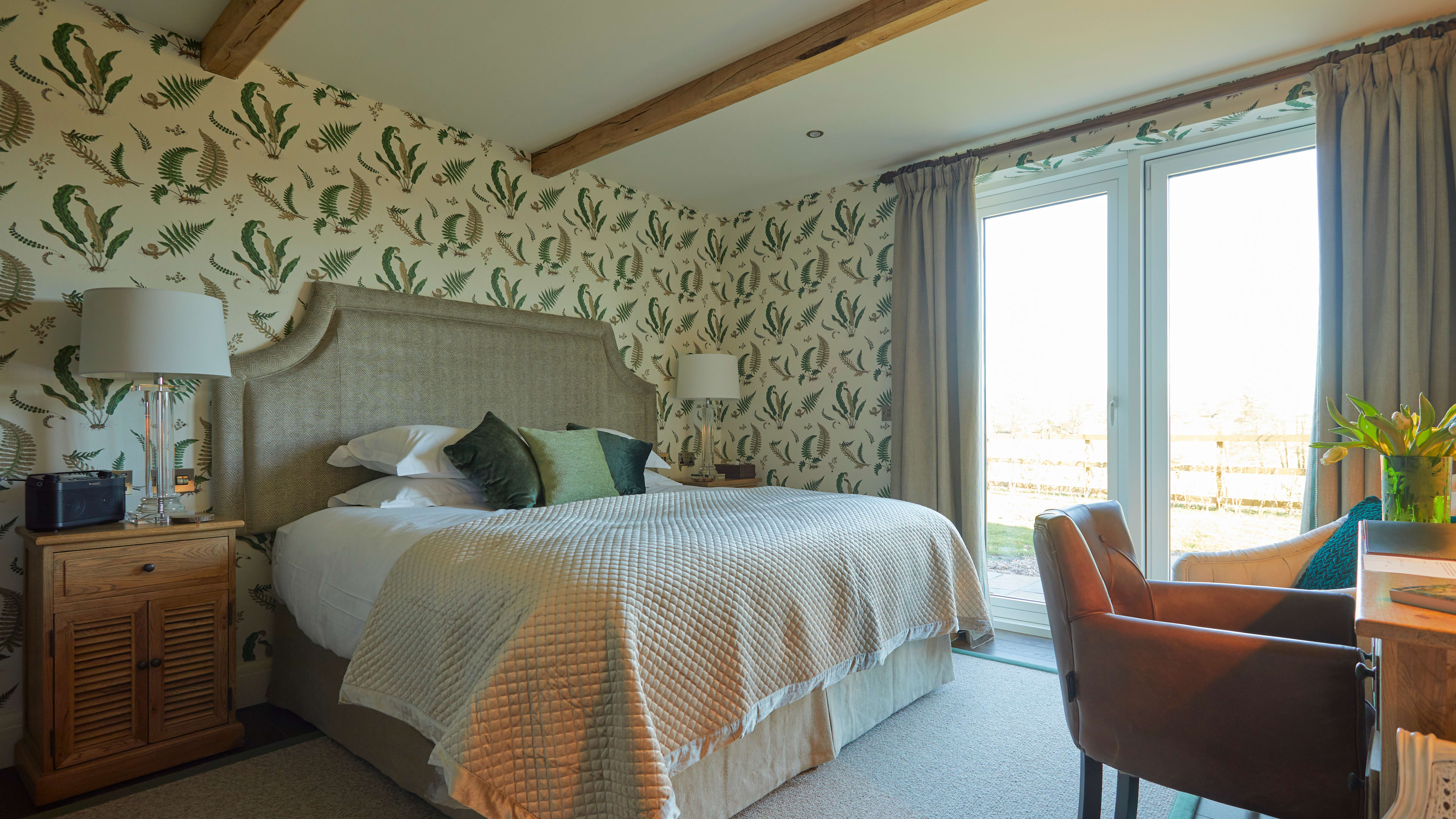 Walnut House is the modern addition to the pub with 10 rooms. These offer a refined take on the rustic surrounds, with nature-inspired names, botanical wallpapers, fresh flowers, and wood flooring and furnishings, each with a bespoke Farrow and Ball-ed colour scheme. The two family rooms are larger with a pull-out sofa and a bath tub; rooms upstairs have a slightly more alluring aspect of the Staffordshire countryside, although having a ground-floor patio to sit out on is rather lovely too. But the Duncombe Arms brings your cottagecore fantasies to life. Next to Walnut House is a skipping-stone path leading up to the 19th-century Old Barn, once part of the Calwich Estate, where the Duncombe family entertained Darwin, Rousseau and Handel (no biggie); you could easily imagine yourself in this dreamily beamed hideaway, writing at the desk, reading a book by the log-burner and hosting erudite gatherings using the kitchen and dining space. Or, there’s the Garden Cottage, on the owners’ spectacular Wootton Hall Estate – you’ll need a car for the five-minute drive there and back, but it’s worth it to snake up the long rhododendron-lined drive, past a babbling stream, valley of flowering trees, and farm enclosures; once there, you’re in your own world, one with a verdant view that goes on and on, with rabbits and pheasants darting furtively across as you take your sundowners.