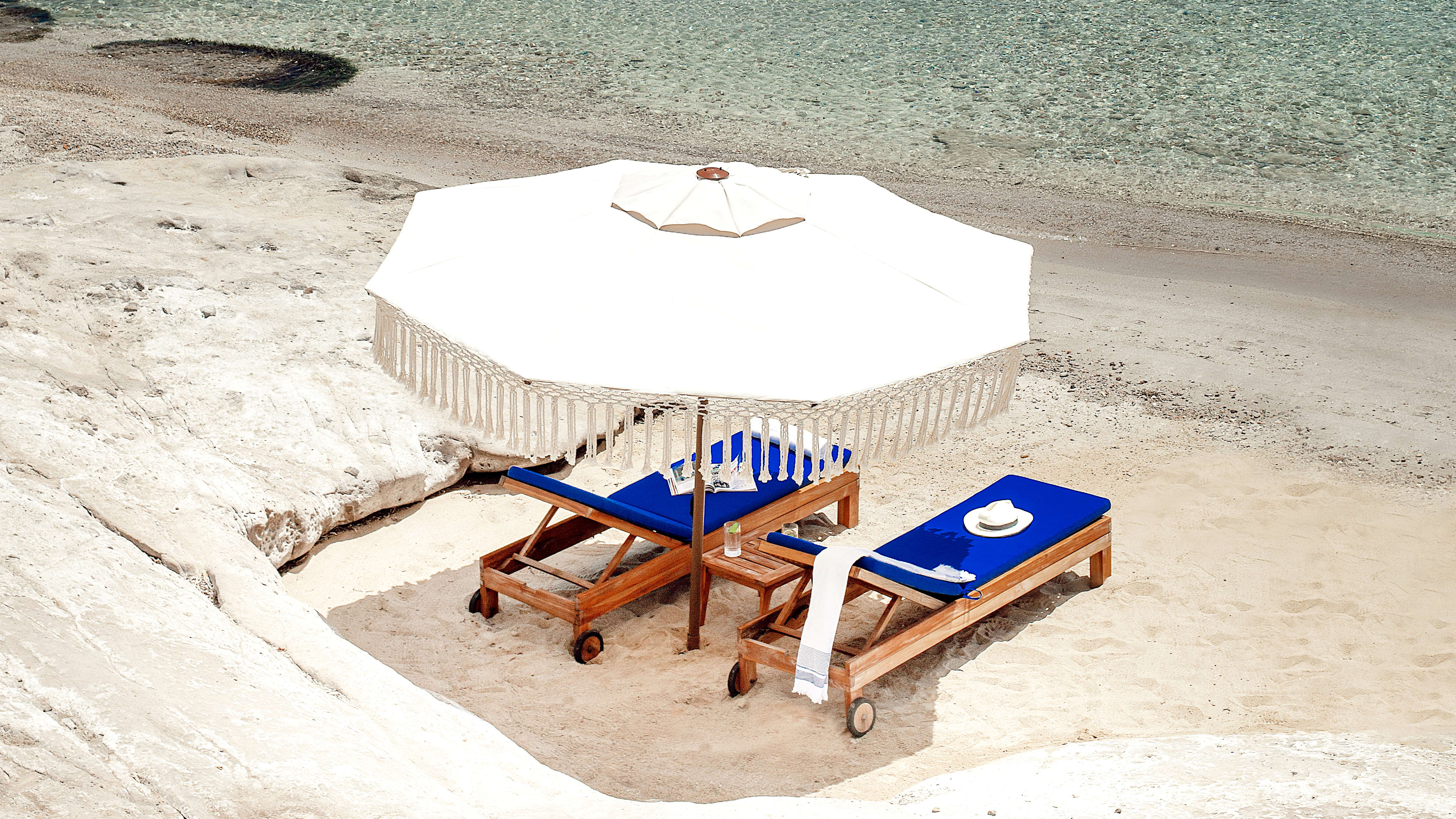 Folie’s open-air shoreline setting, flanked by loungers and cabanas, lends a Mediterranean beach club ambience to proceedings. A small strip of perfect golden sand separates the restaurant from the Aegean, from where the gleaming seabream you just chose for dinner was so recently plucked. Cocktail glasses clink in the cabanas as the sun sets and the party starts, with regular live bands and DJs spinning ambient and Balearic house until late in the evening.