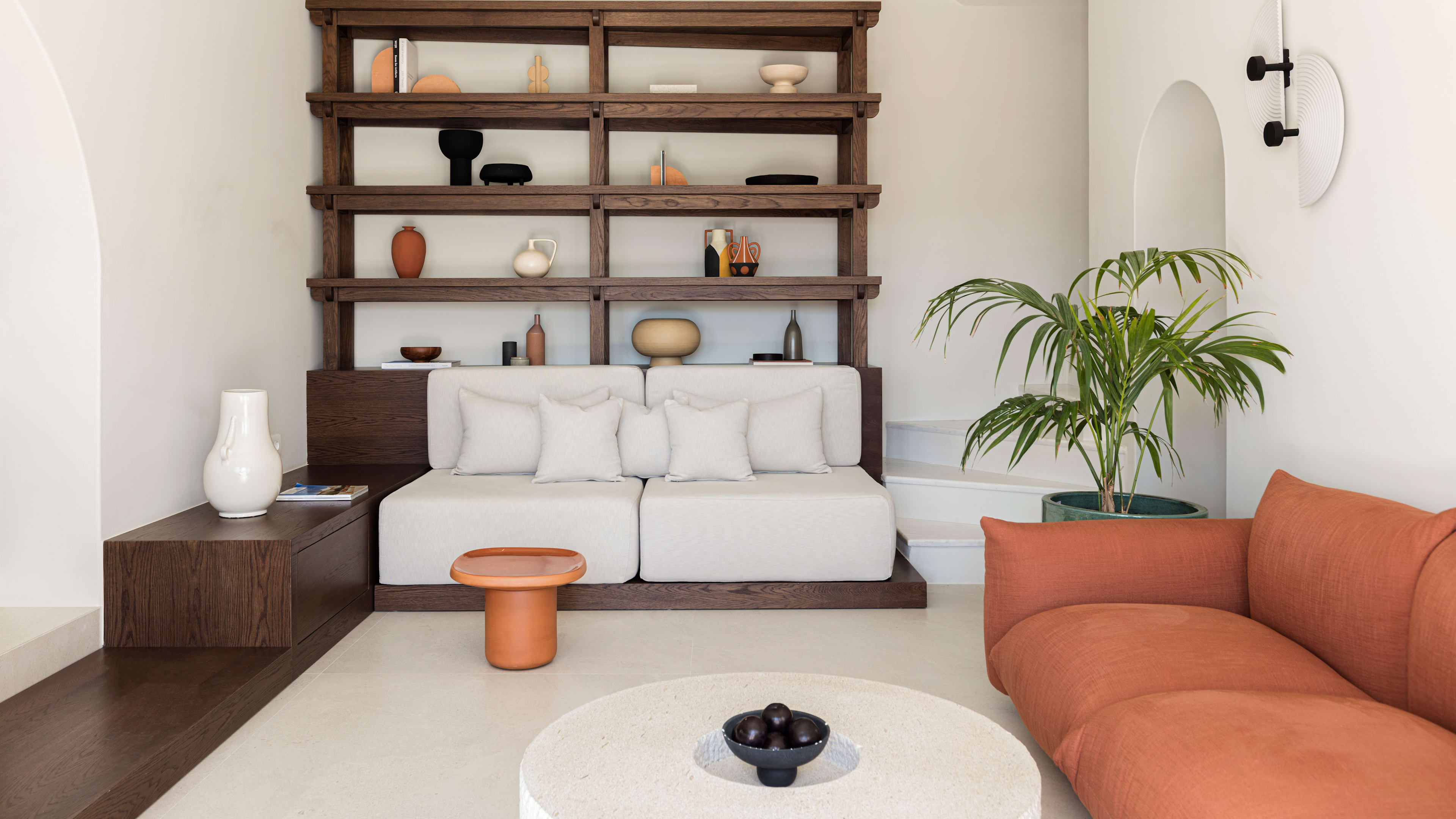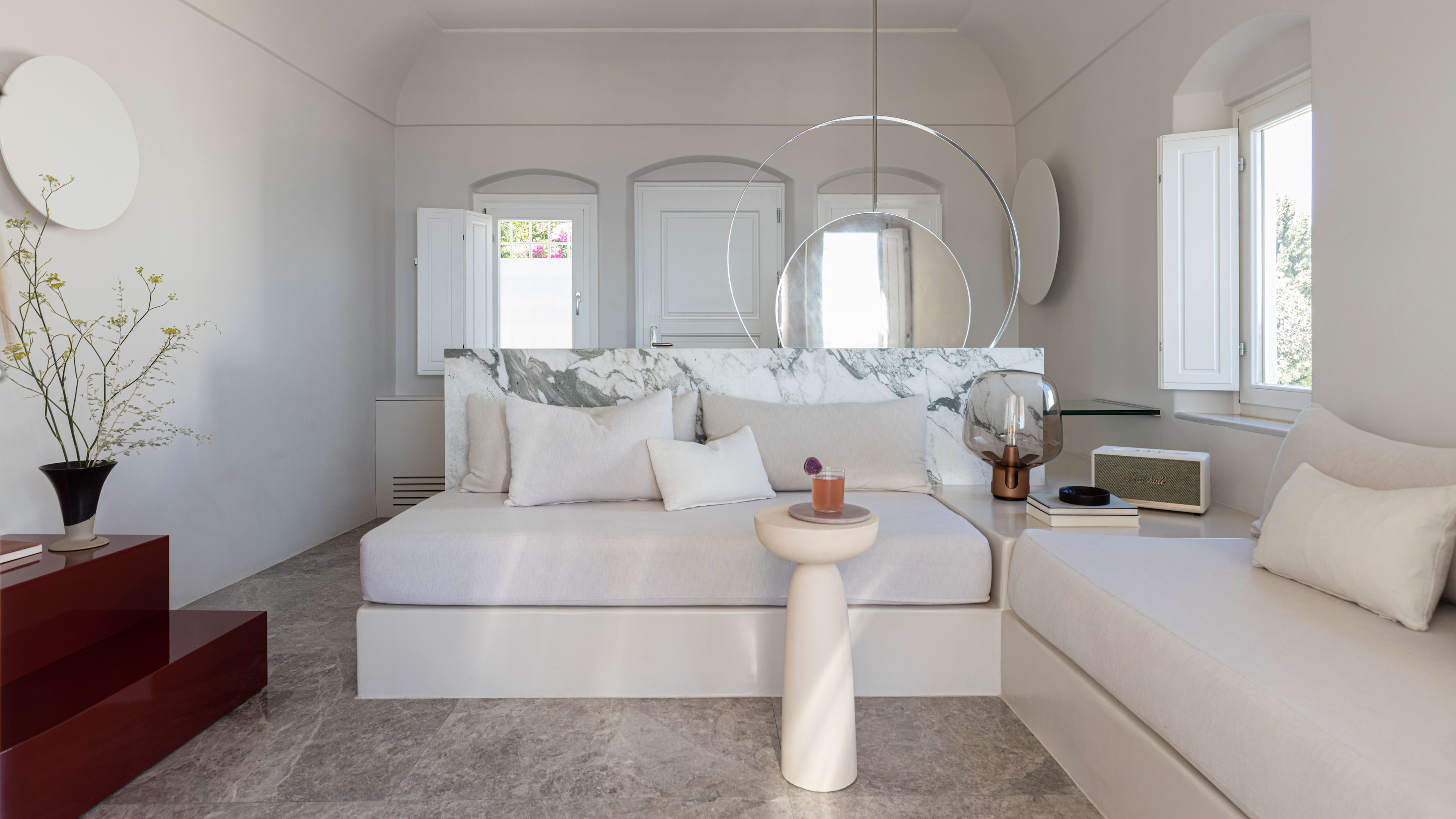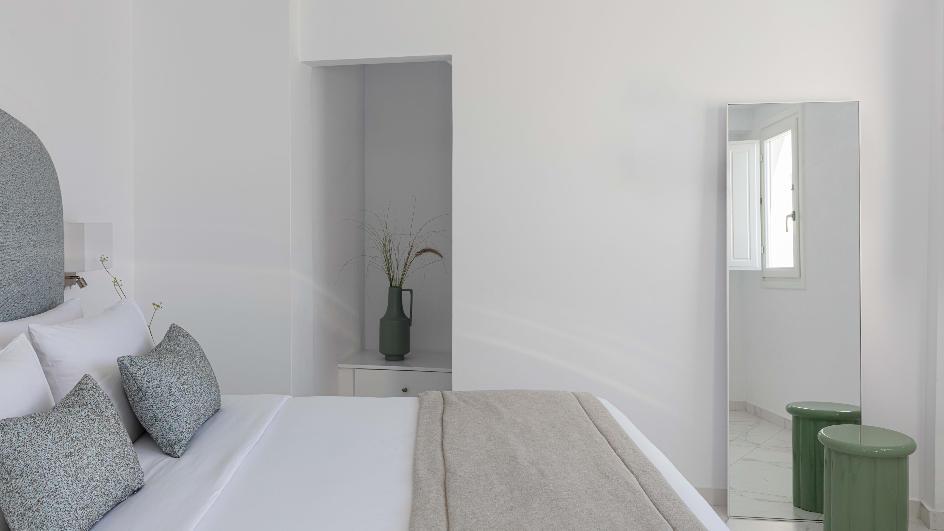 These suites are spacious and airy, with marble floors, big bathrooms and their own sea-facing terrace and hot tub (or pool). Waterbabies will love the River Pool Suite for obvious reasons; if it’s views you’re after, Junior Suite 24 has a quiet terrace that surveys the caldera; just above it, the Honeymoon Suite has a (very) private terrace and sea views that you can enjoy from bed. With its square plunge pool hovering above the Aegean waters below, the Infinity Pool Suite is made for self-satisfied selfies.