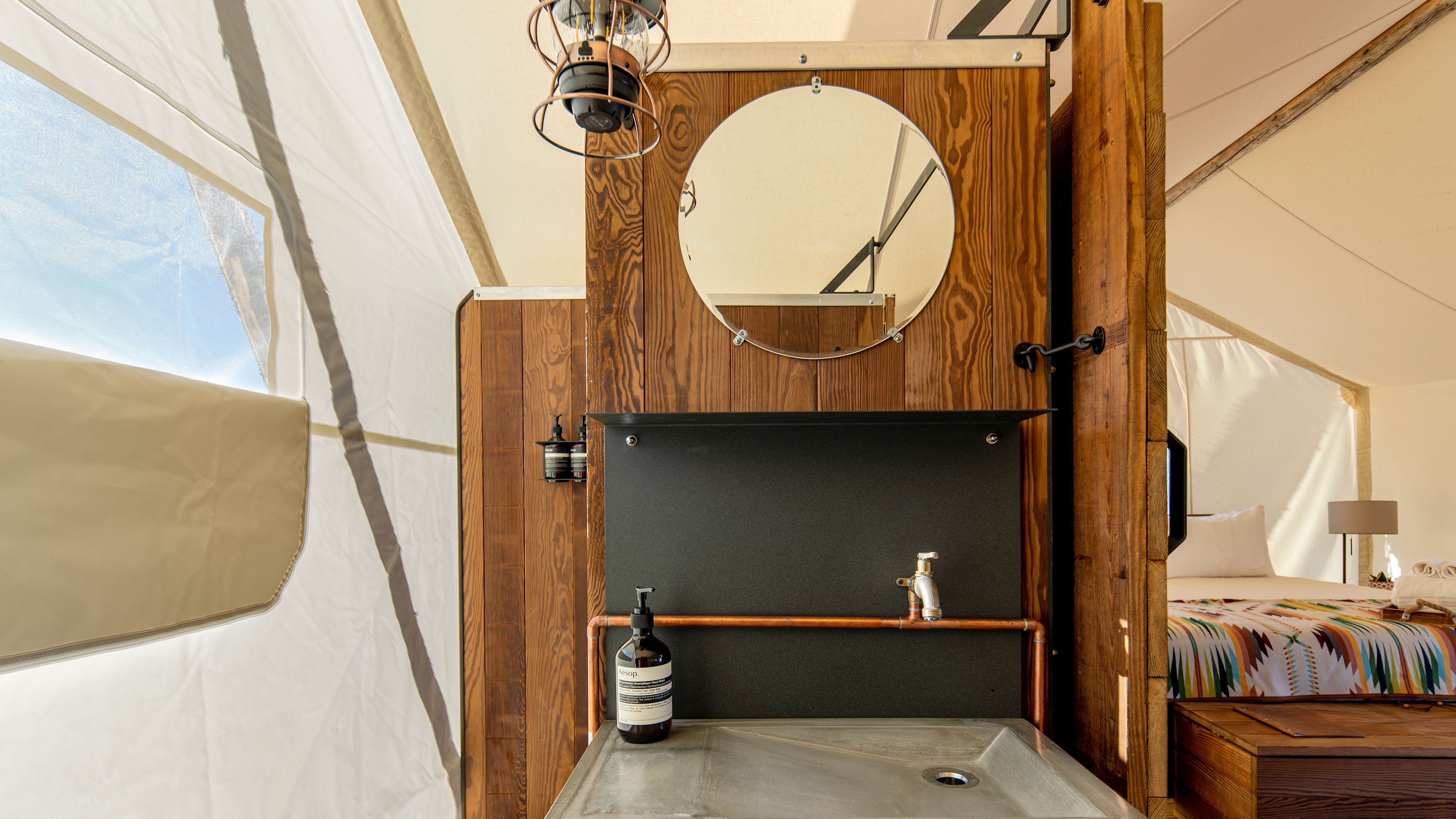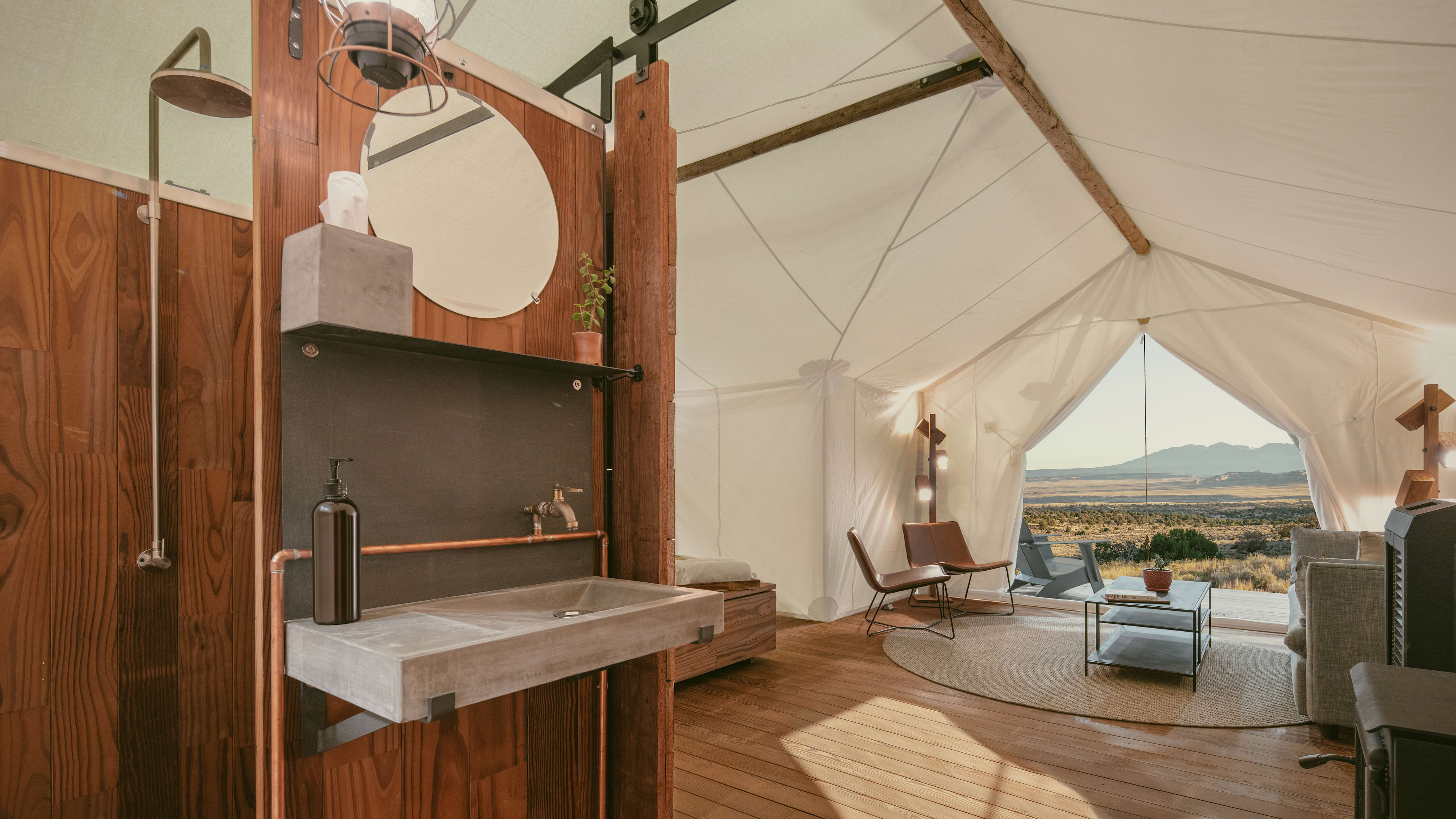 Walking trails, yoga deck with Vuori mats and blocks to borrow, nightly campfires with s’mores, refillable aluminum water bottles, water refill stations, free hot drinks, guest experience coordinators and a small boutique. In tents: power outlets, evaporative cooling fan, wood-burning stoves, lanterns, coffee- and tea-making kit, hairdryer, bathrobes and Aesop bath products.