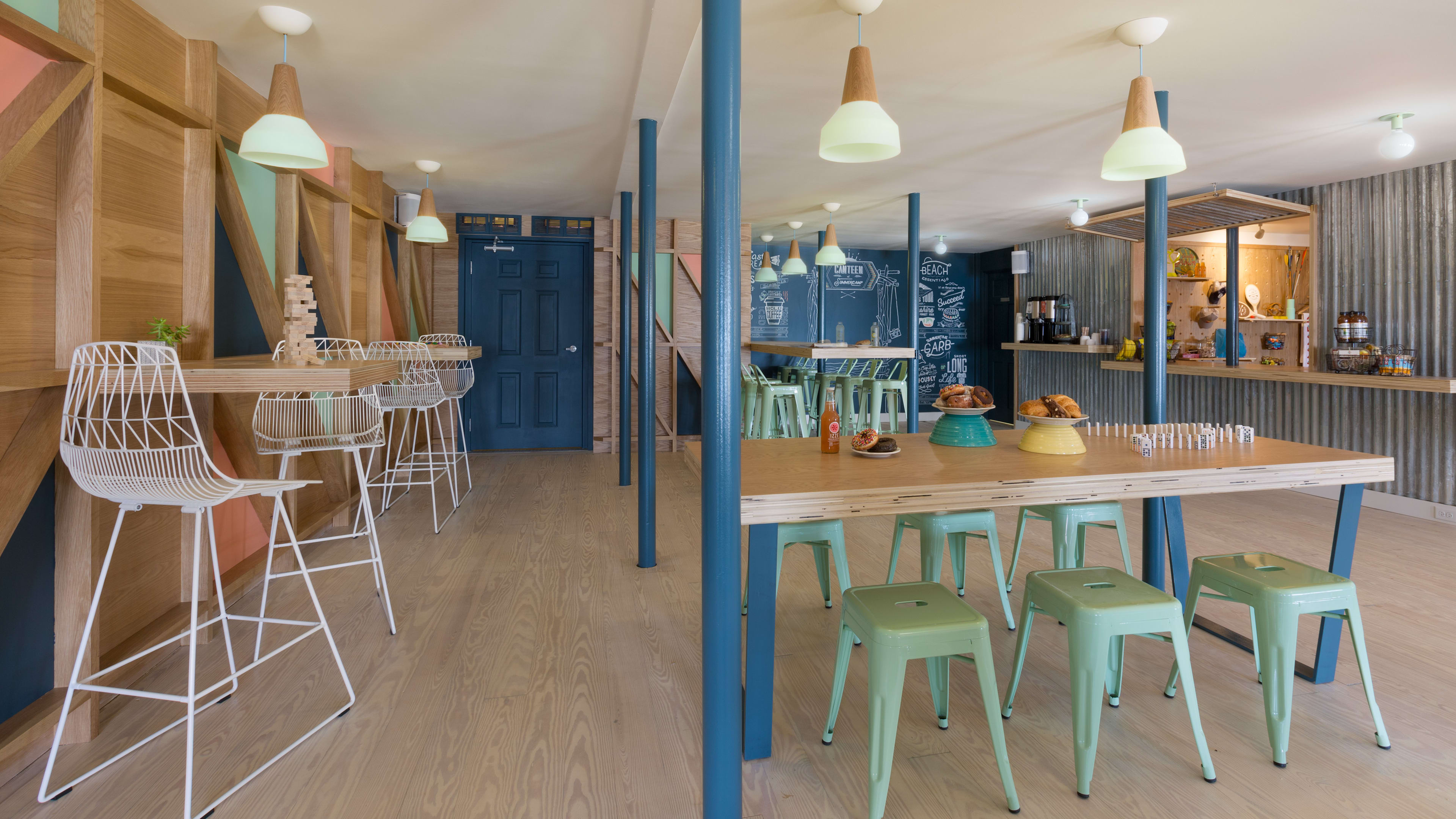 There’s no formal restaurant, but you’ll find Camp Canteen next to reception, which serves round-the-clock light bites. Grab a bagel, muffin or yogurt parfait on your way out, kick back with a coffee or hot chocolate, sip a soda on the sunset-facing porch or relive your own camp days and sneak down for a (nostalgic) midnight snack of Cracker Jacks or Dreamsicles.