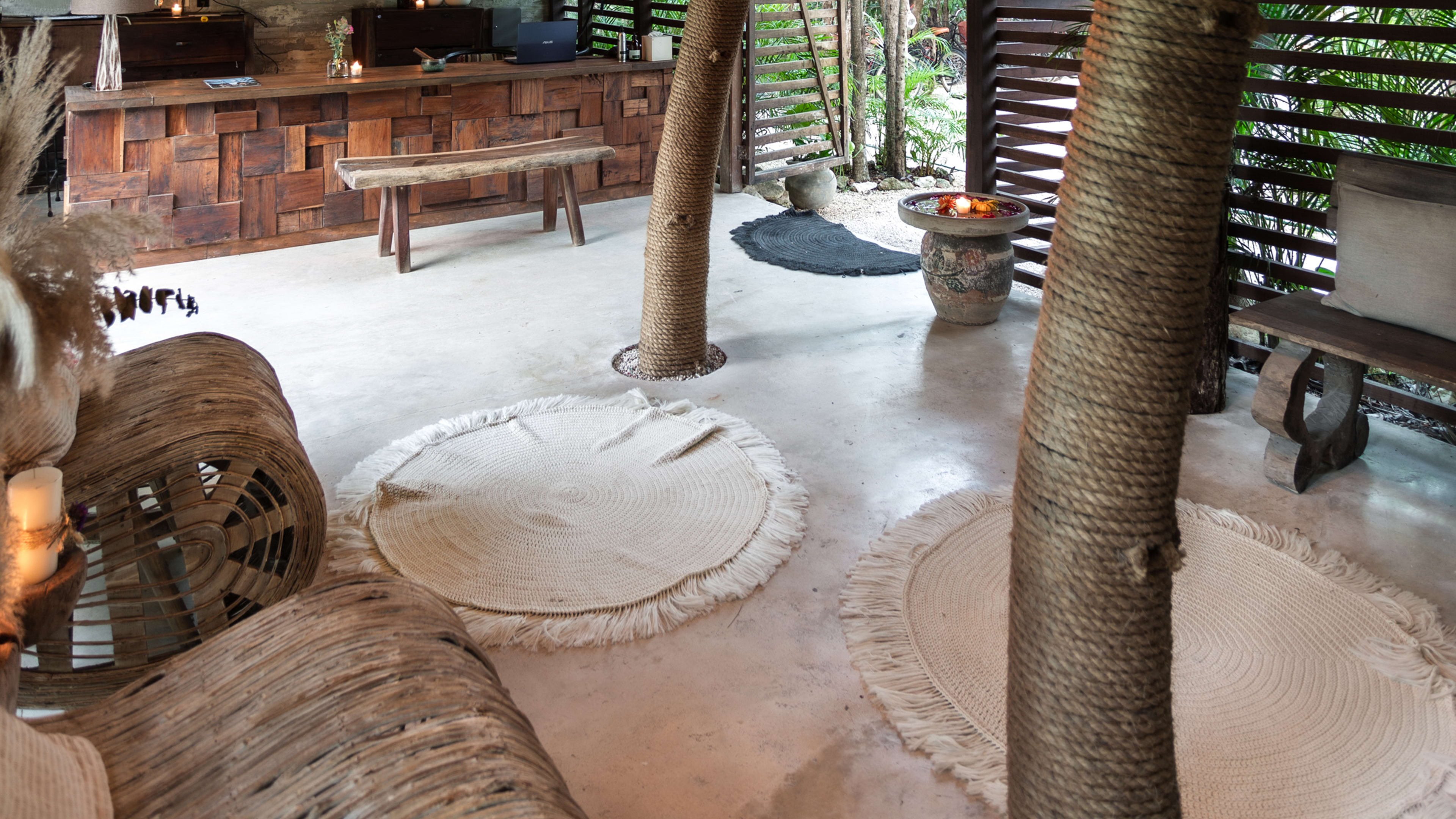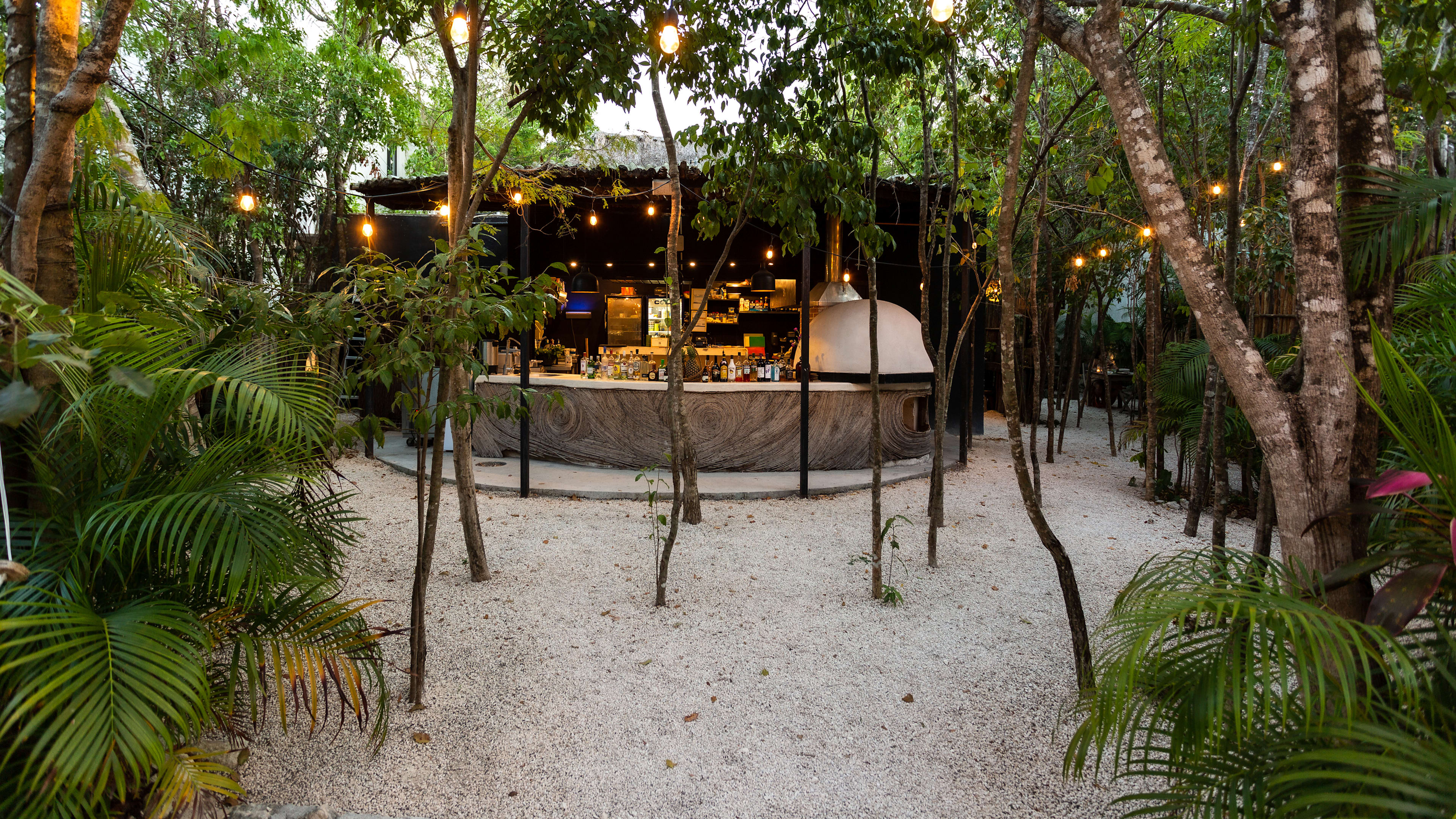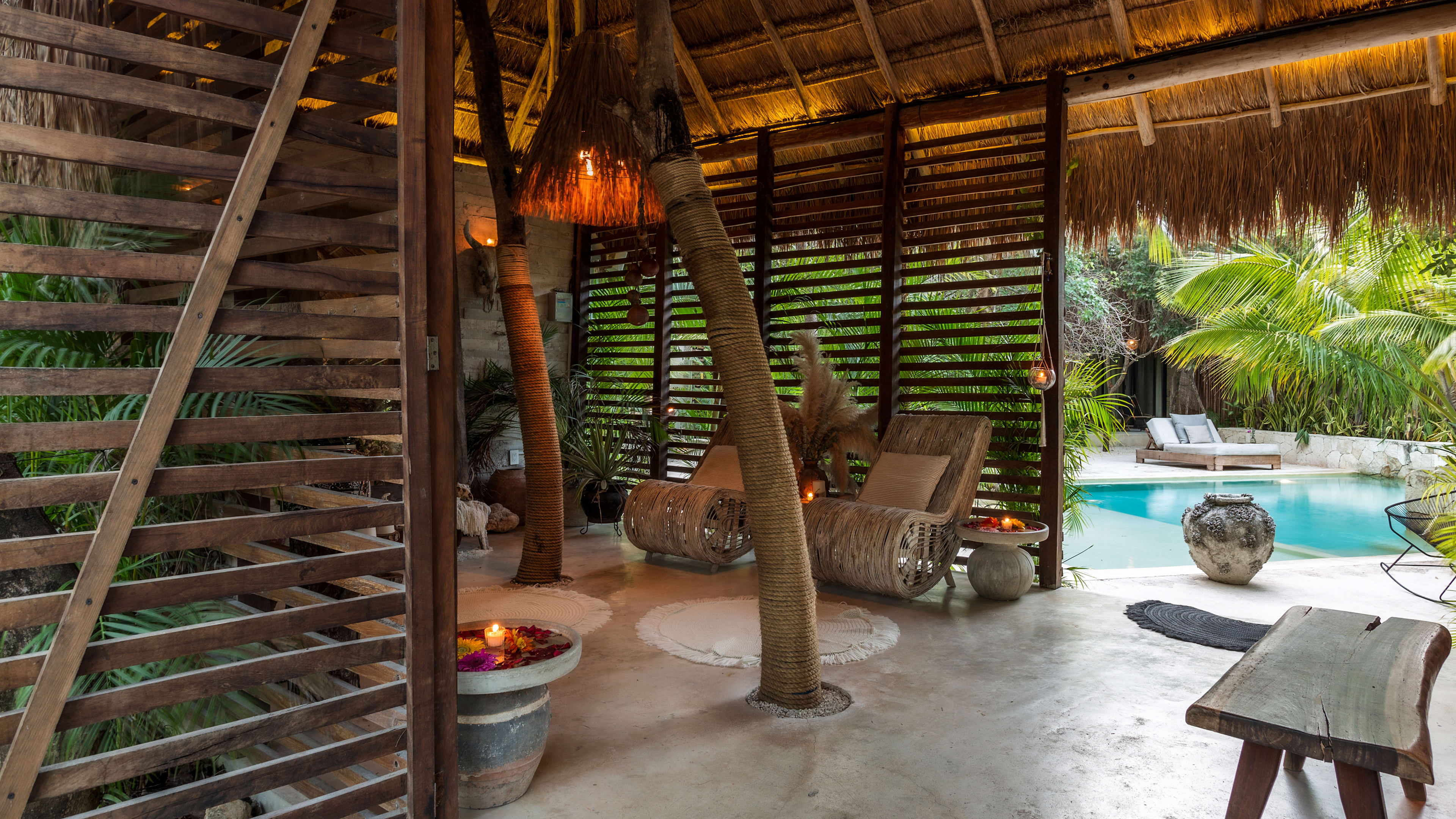 The thatched palapa bar at Una Vida faces the pool and has high stools beside its polished-wood counter, as well as lounge seating and takeaways to your poolside day-bed. As you’d expect of a Tulum stay, cachaça and tequila feature in its cocktail line-up, and by evening the scene is transformed with ornately paned pendant lights, counter-top candelabras and tea lights twinkling their welcome.