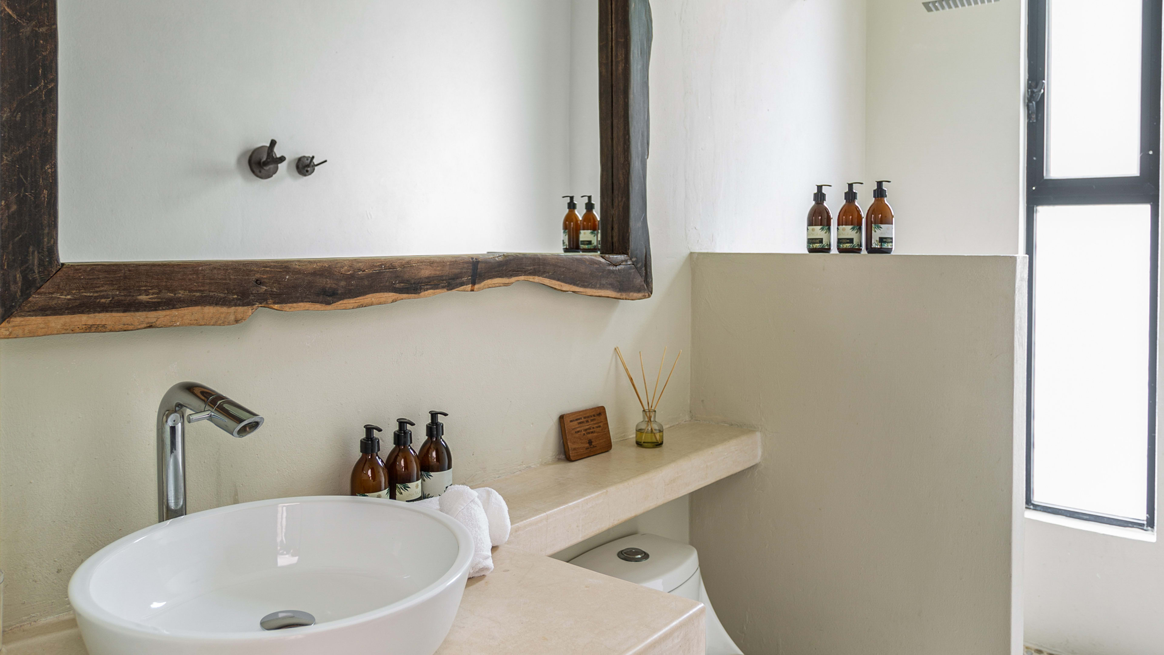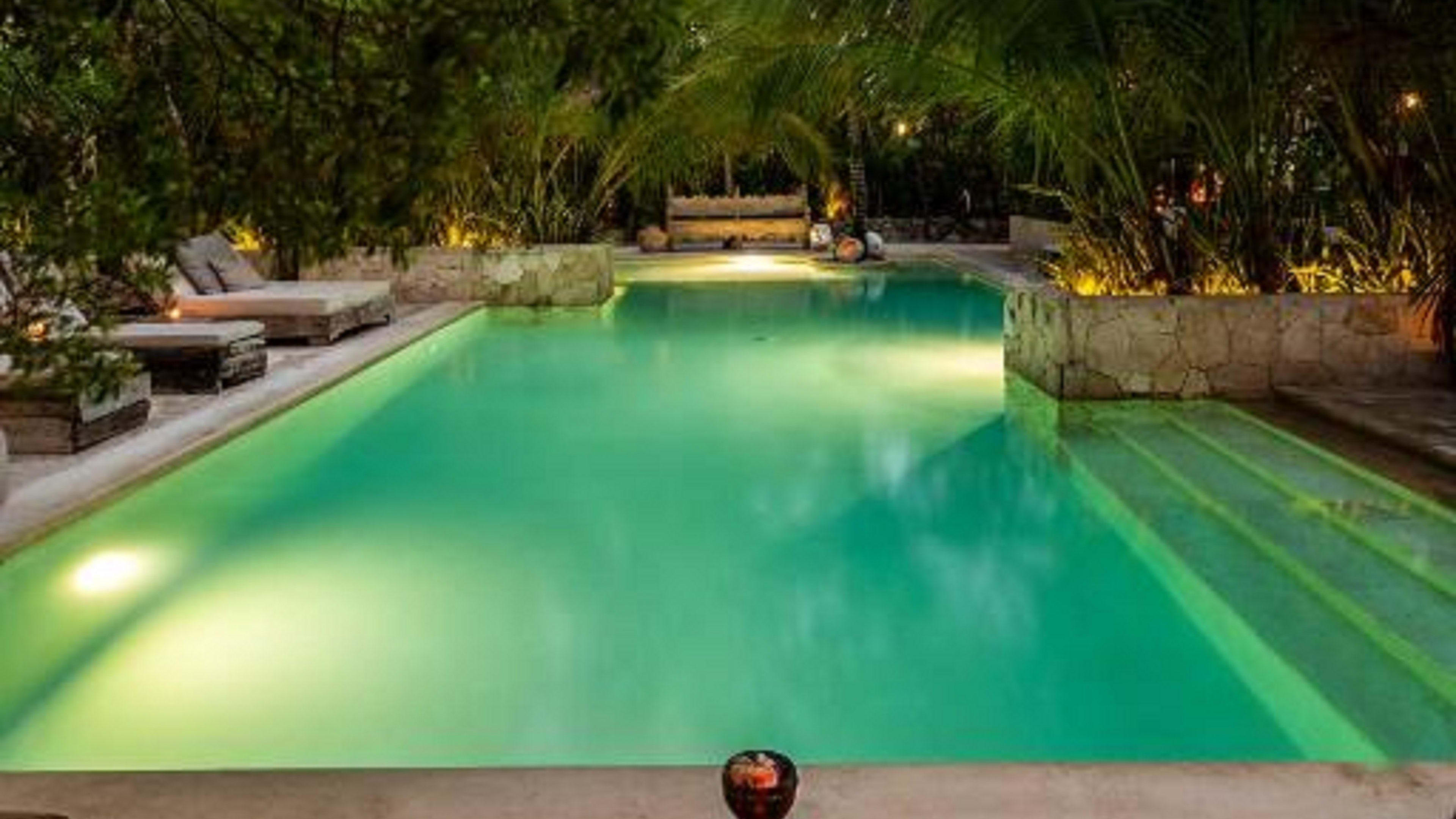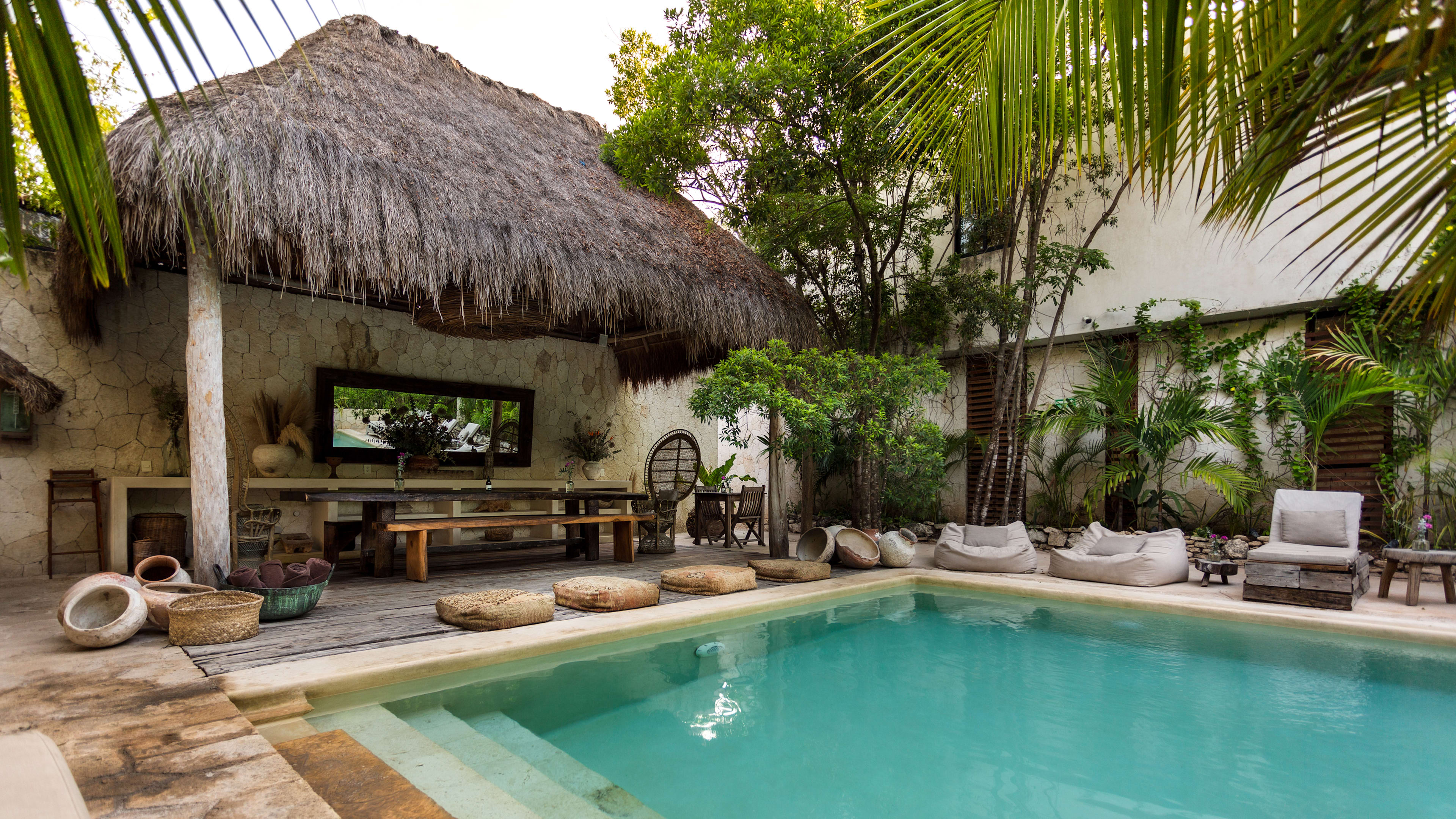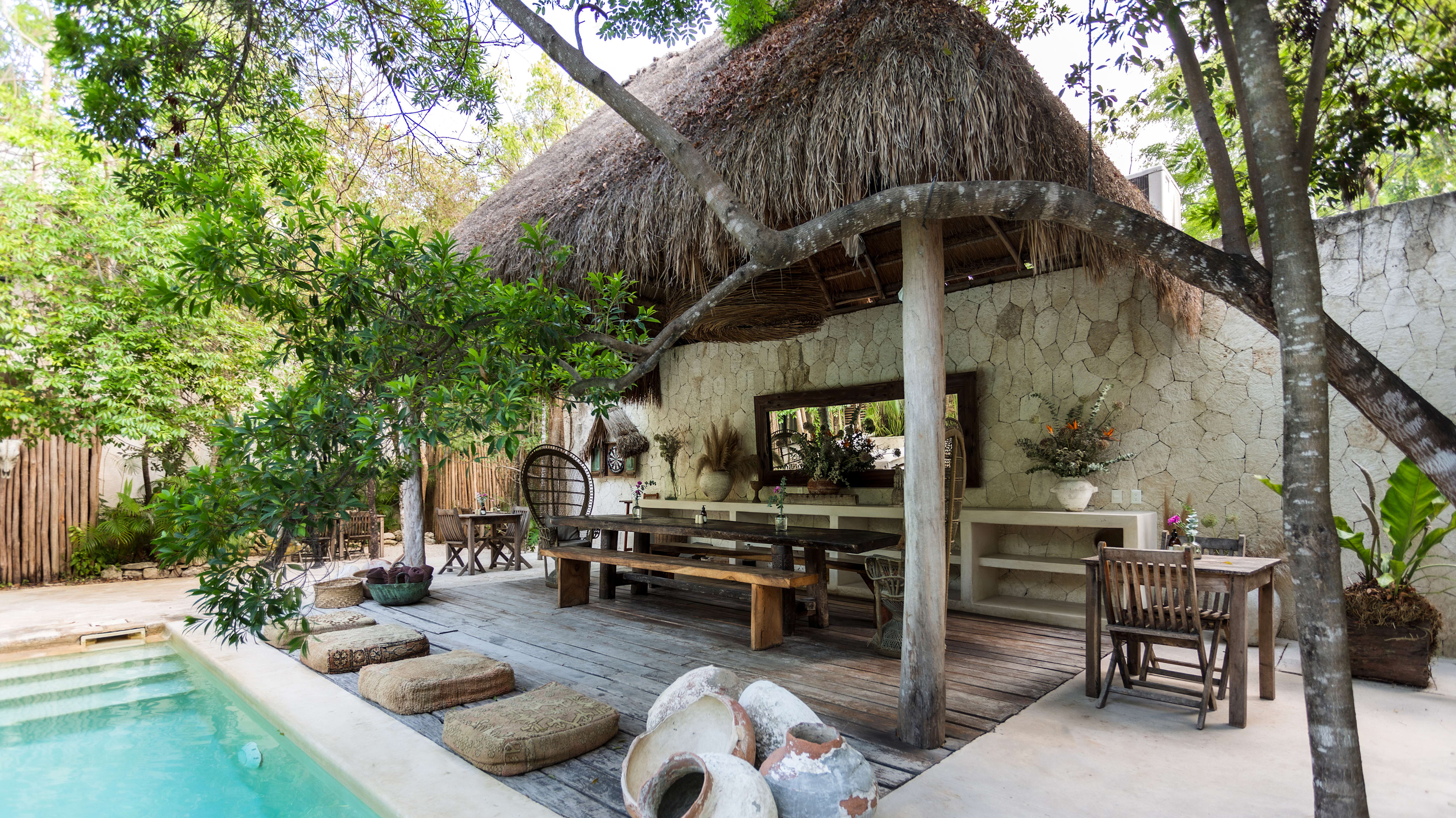 The thatched palapa bar at Una Vida faces the pool and has high stools beside its polished-wood counter, as well as lounge seating and takeaways to your poolside day-bed. As you’d expect of a Tulum stay, cachaça and tequila feature in its cocktail line-up, and by evening the scene is transformed with ornately paned pendant lights, counter-top candelabras and tea lights twinkling their welcome.