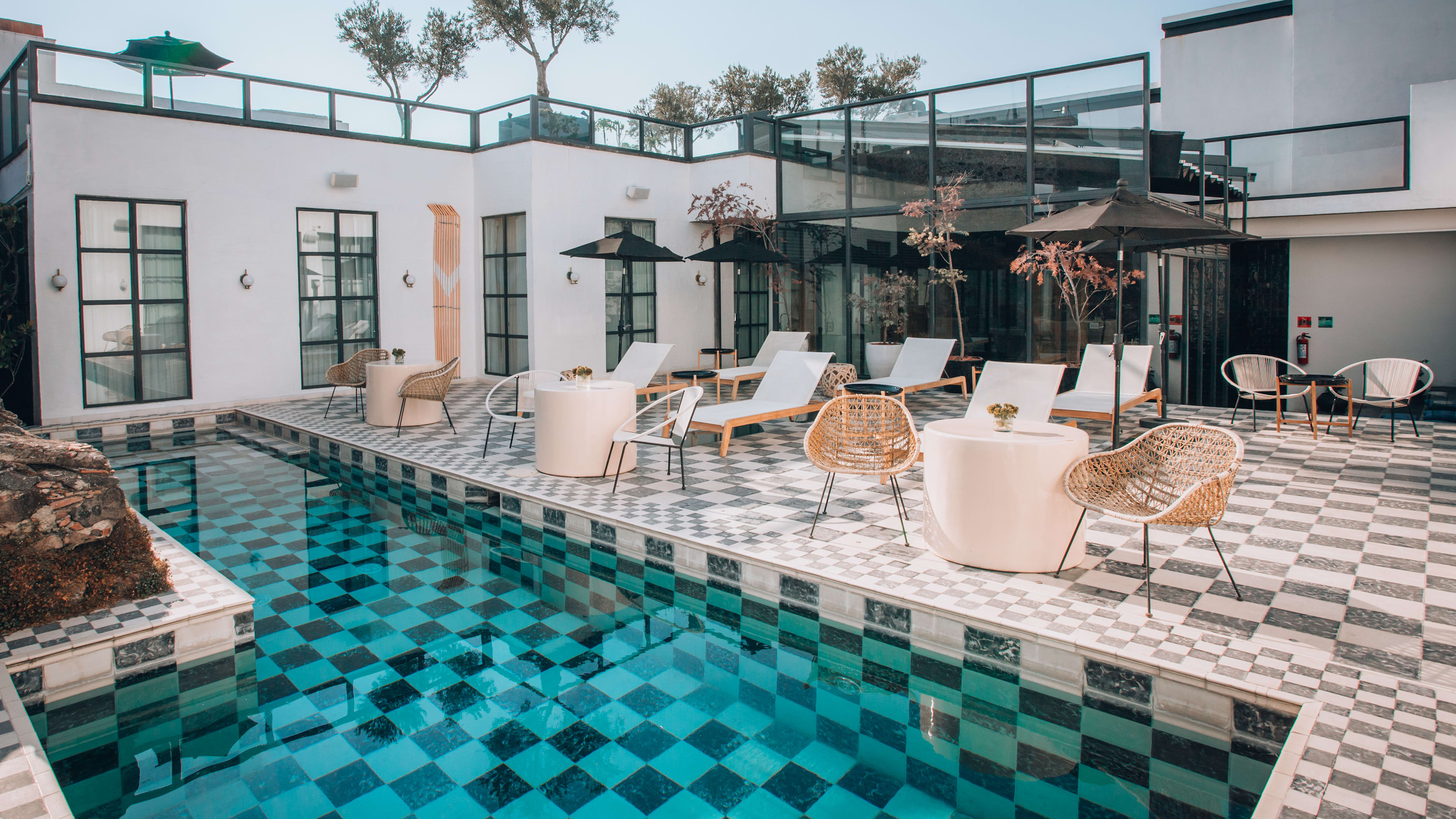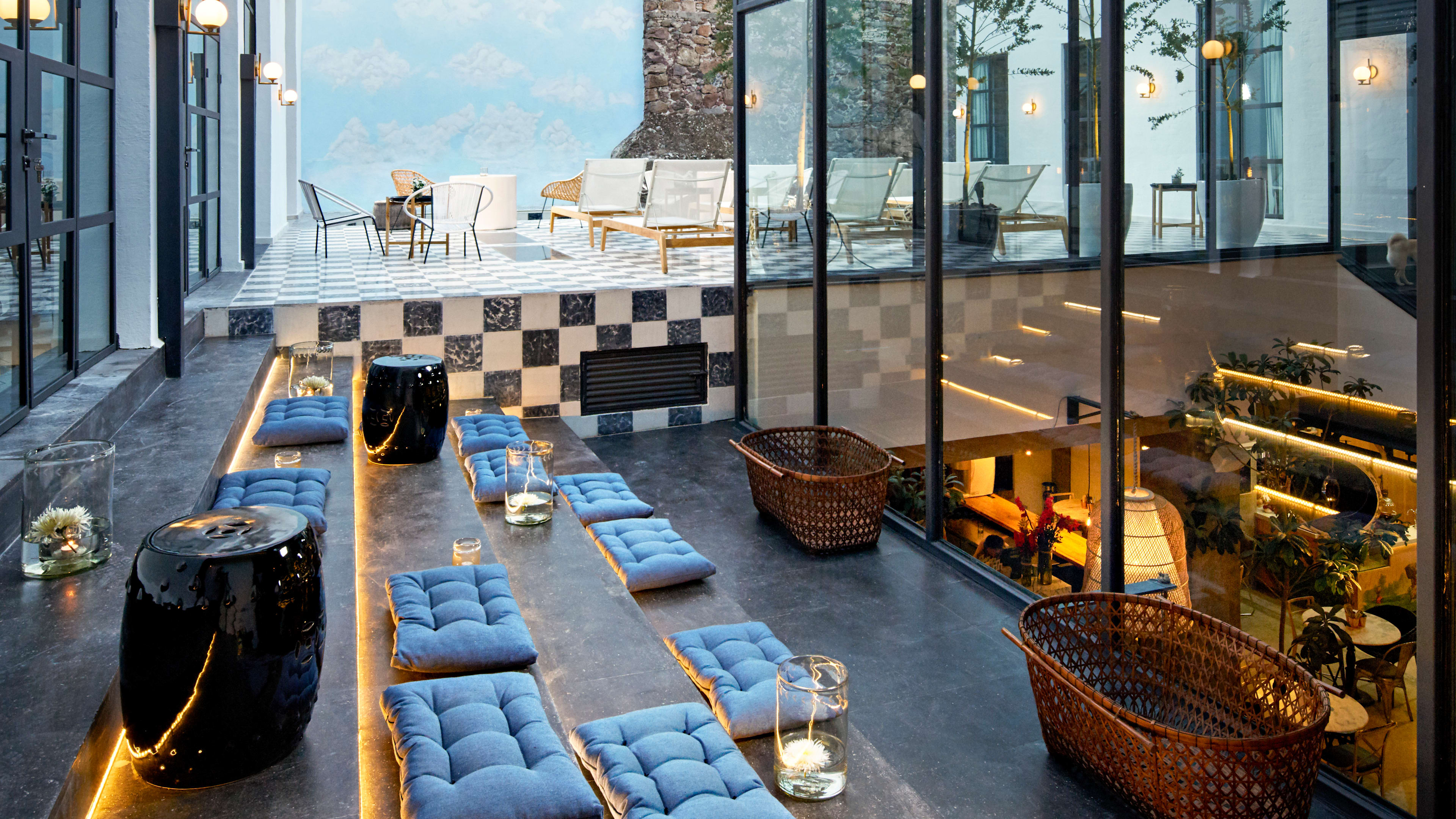 The pool is on the roof terrace, clad in eye-catching checkerboard tiles that make it look like a vast chessboard. It’s surrounded by tall windows, old stonework and a sky-blue wall flecked with painted clouds, protecting it from the bustle of the streets. Sip your drink on one of the sunloungers or small tables arranged along the terrace, or catch rays from the cushions strewn across the set of oversized steps.