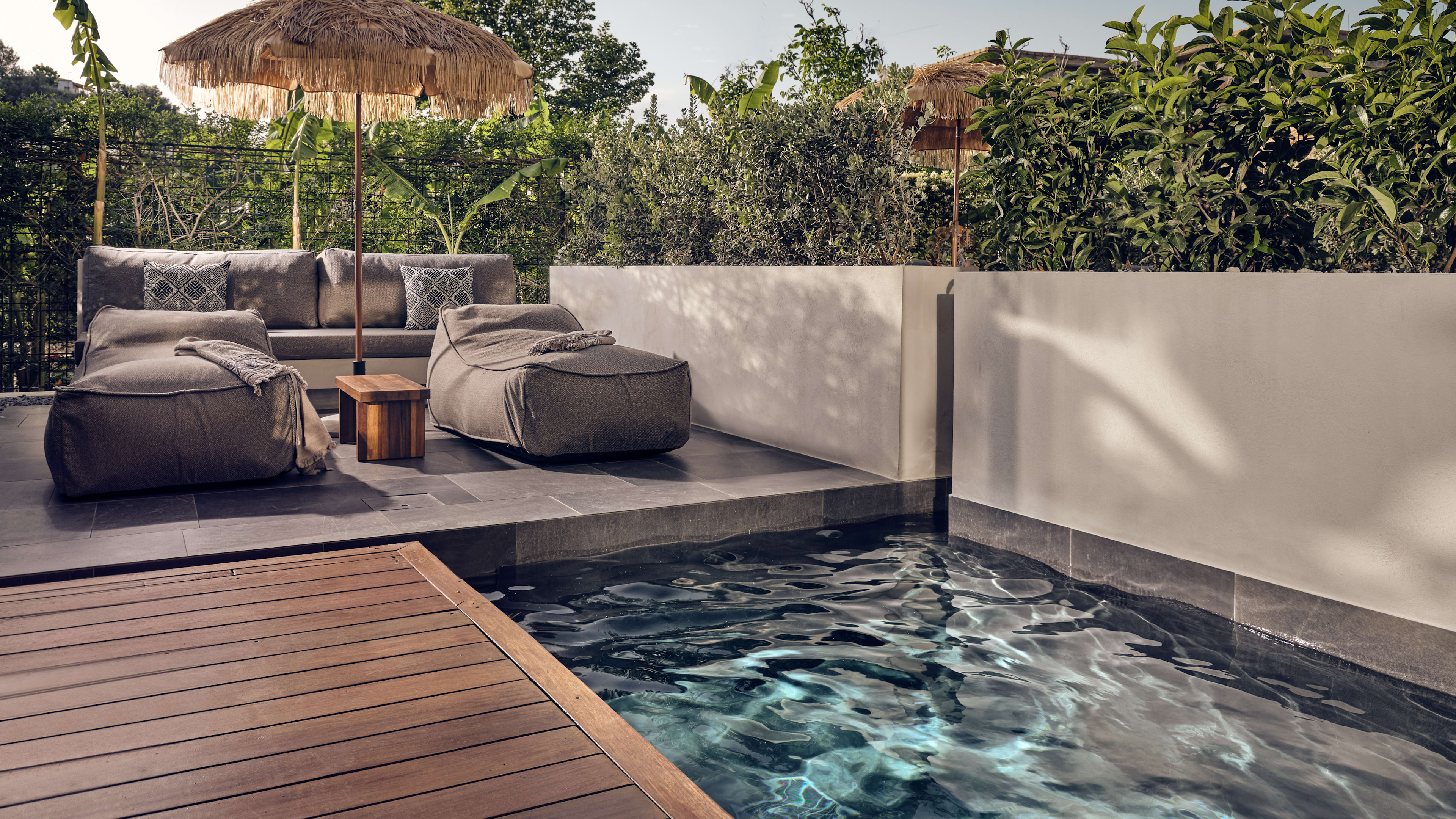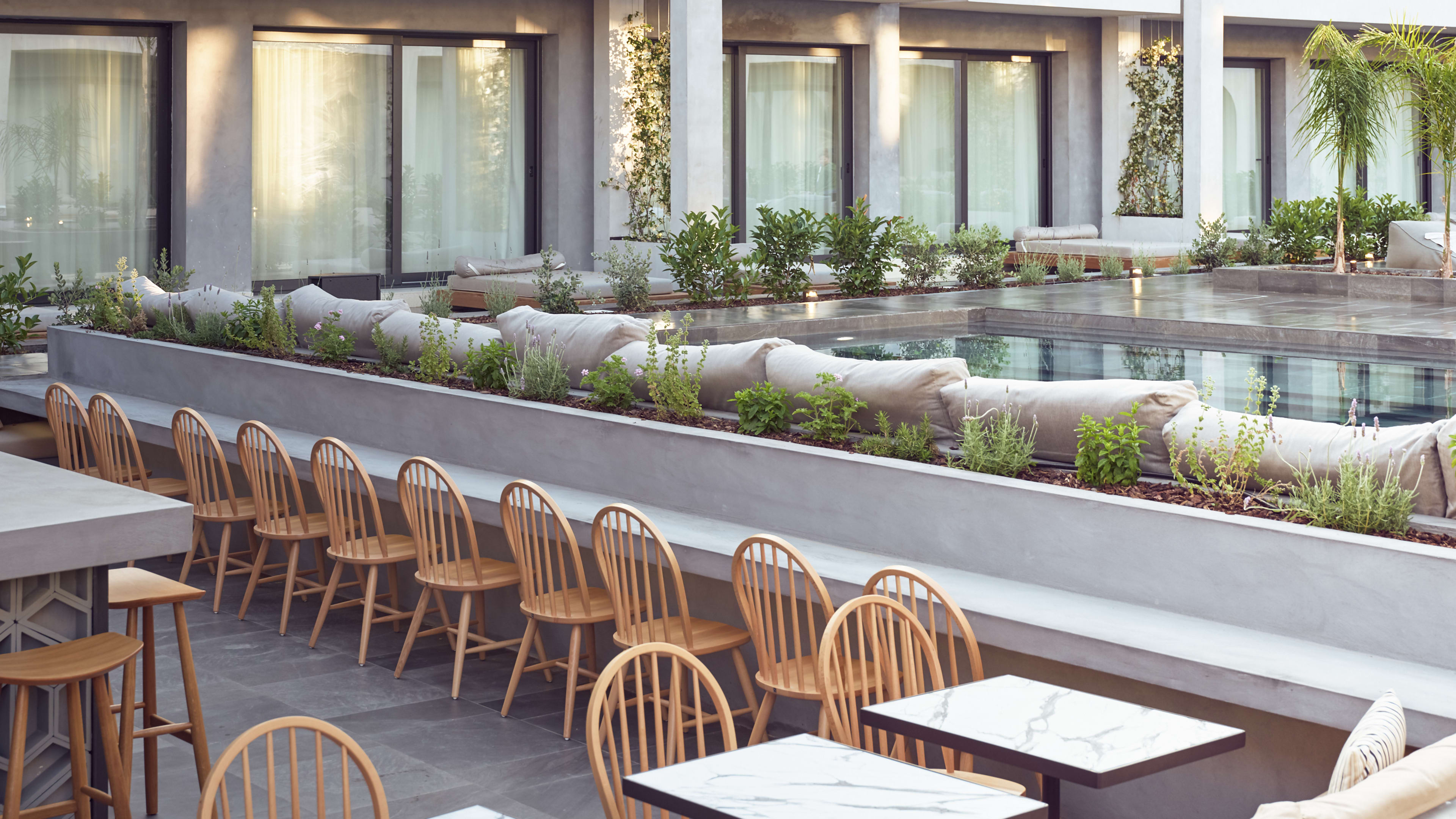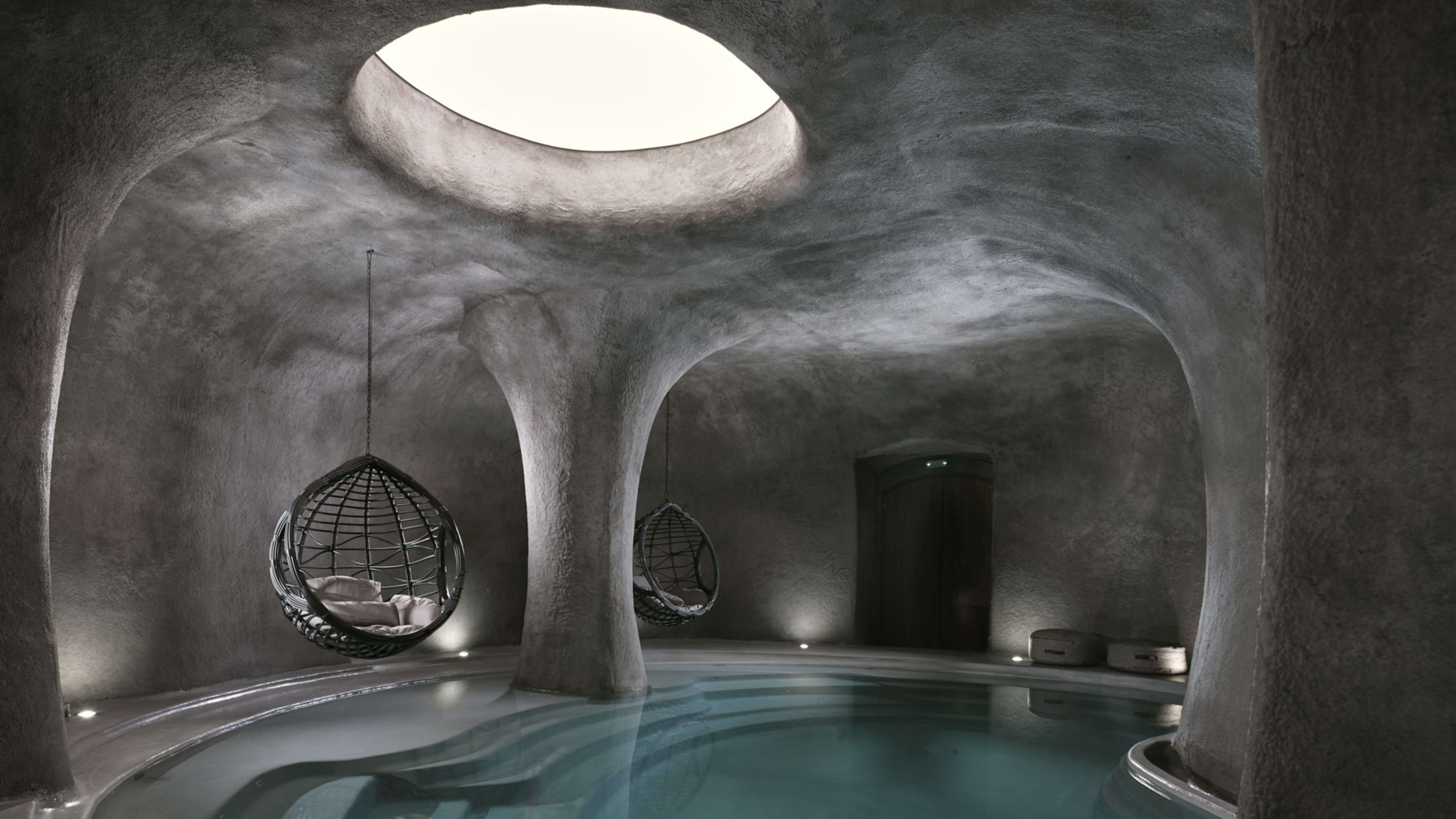 There are three. The indoor spa pool (open 10am to 6pm) has a fantastical setting, a stone grotto with curvaceous walls, a freehand squiggle of a pool, Roman steps to perch on and swing chairs to rock yourself in. The main-event outdoor pool, in the hotel’s interior courtyard, is large enough for uninterrupted laps and is surrounded by oversized bean bags, day-beds sunk into the deck and shaded sunloungers, and there’s a second smaller pool with inlaid greenery next to it (both open from 8am to 8pm).