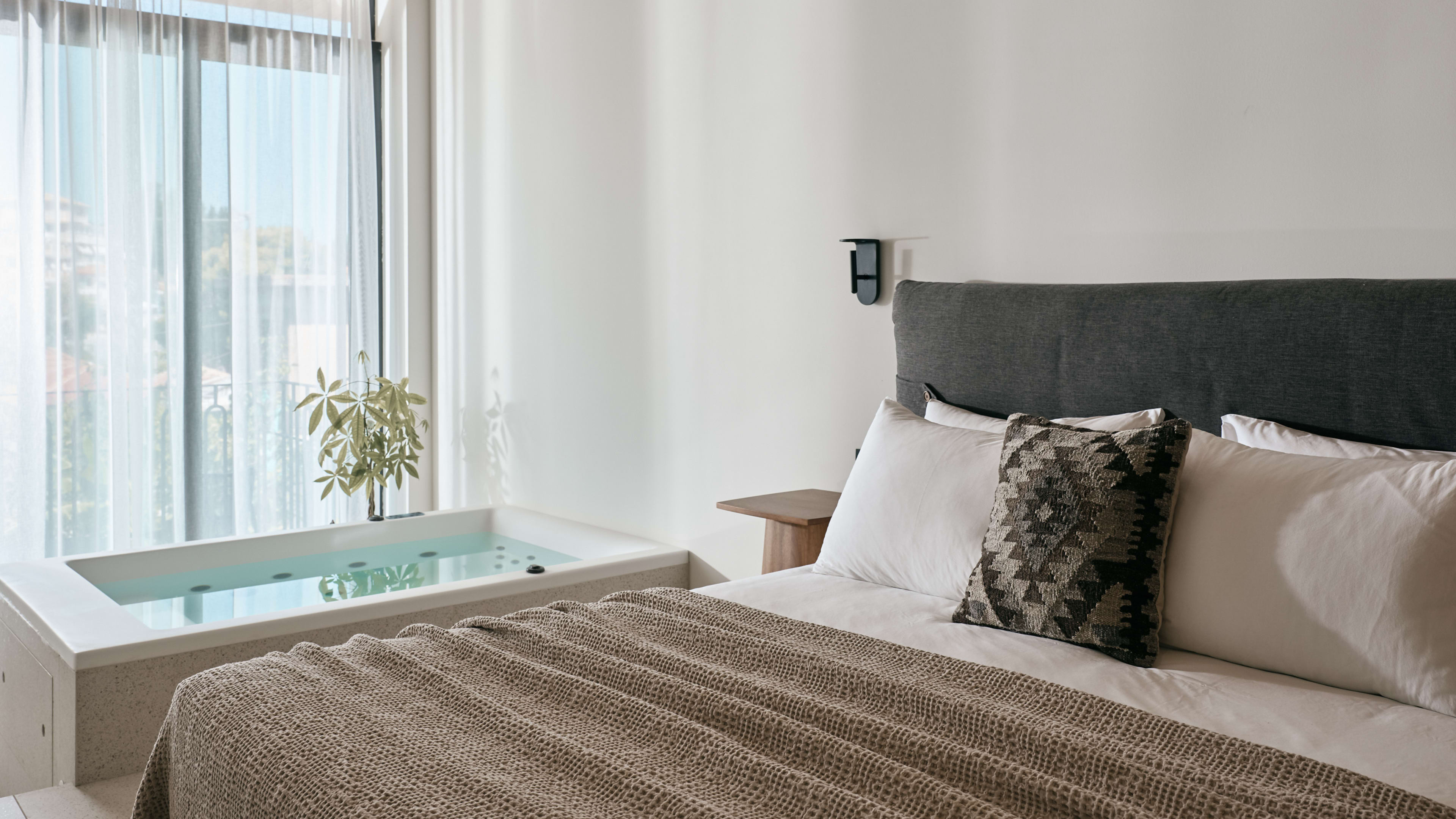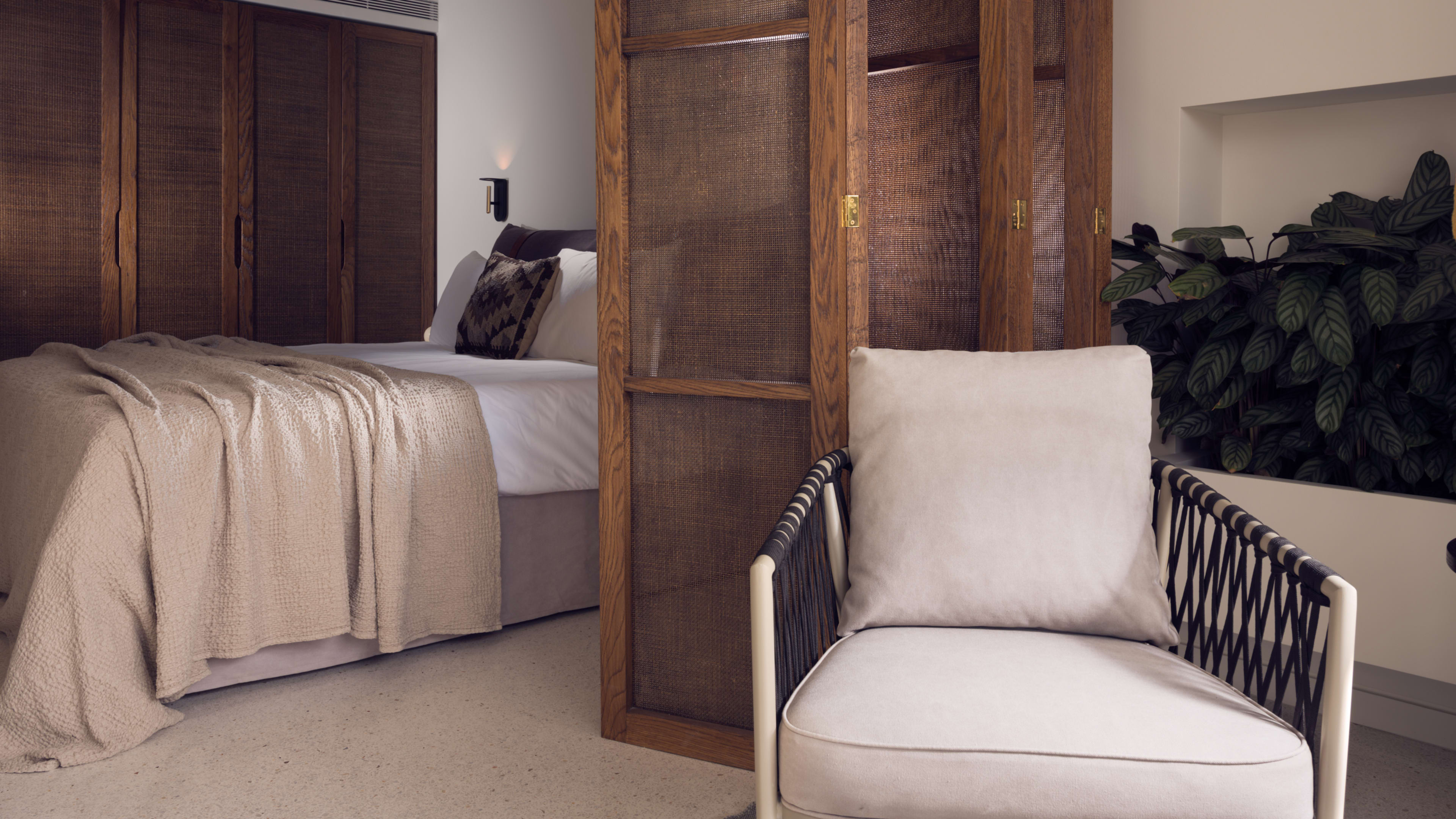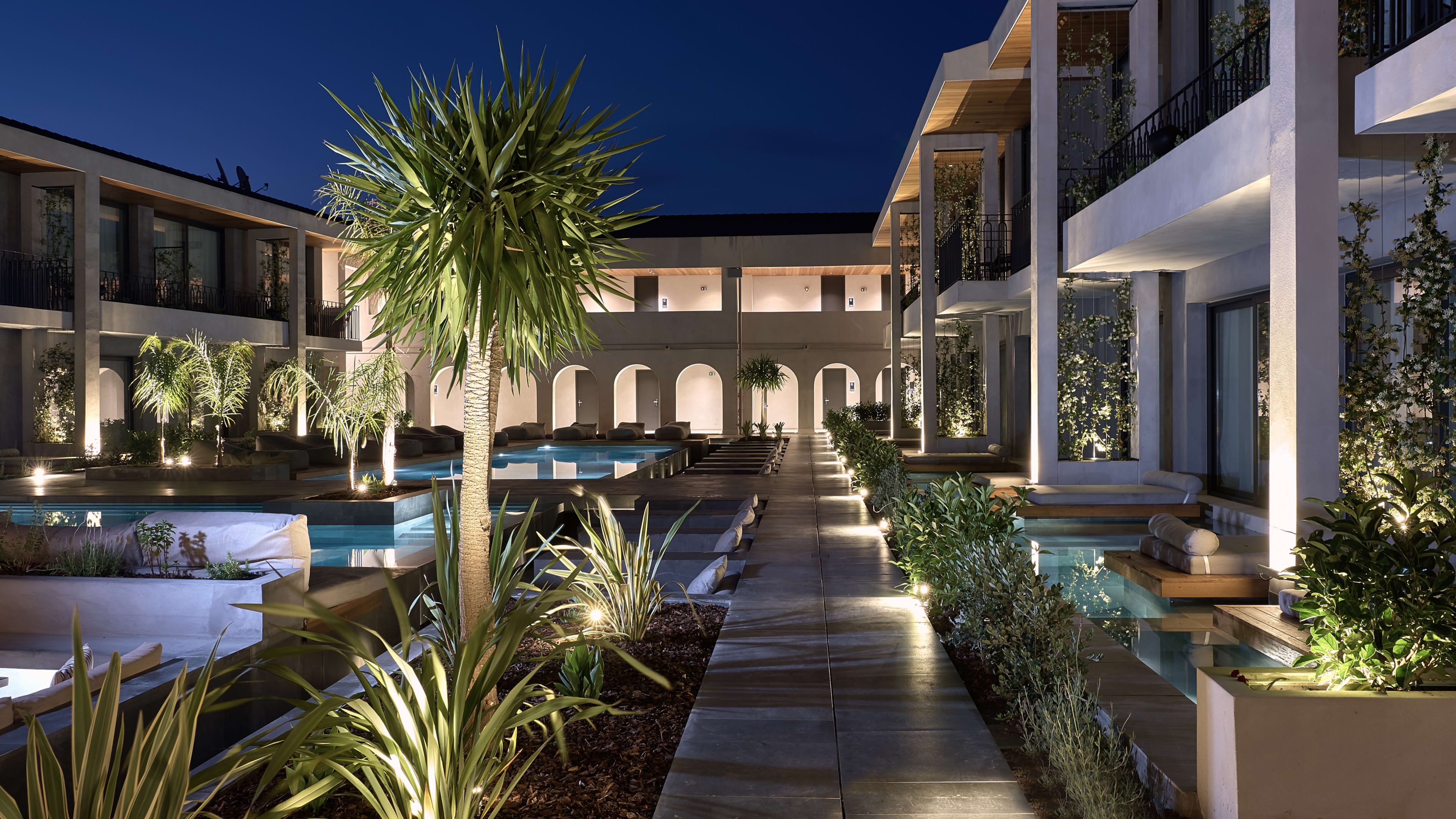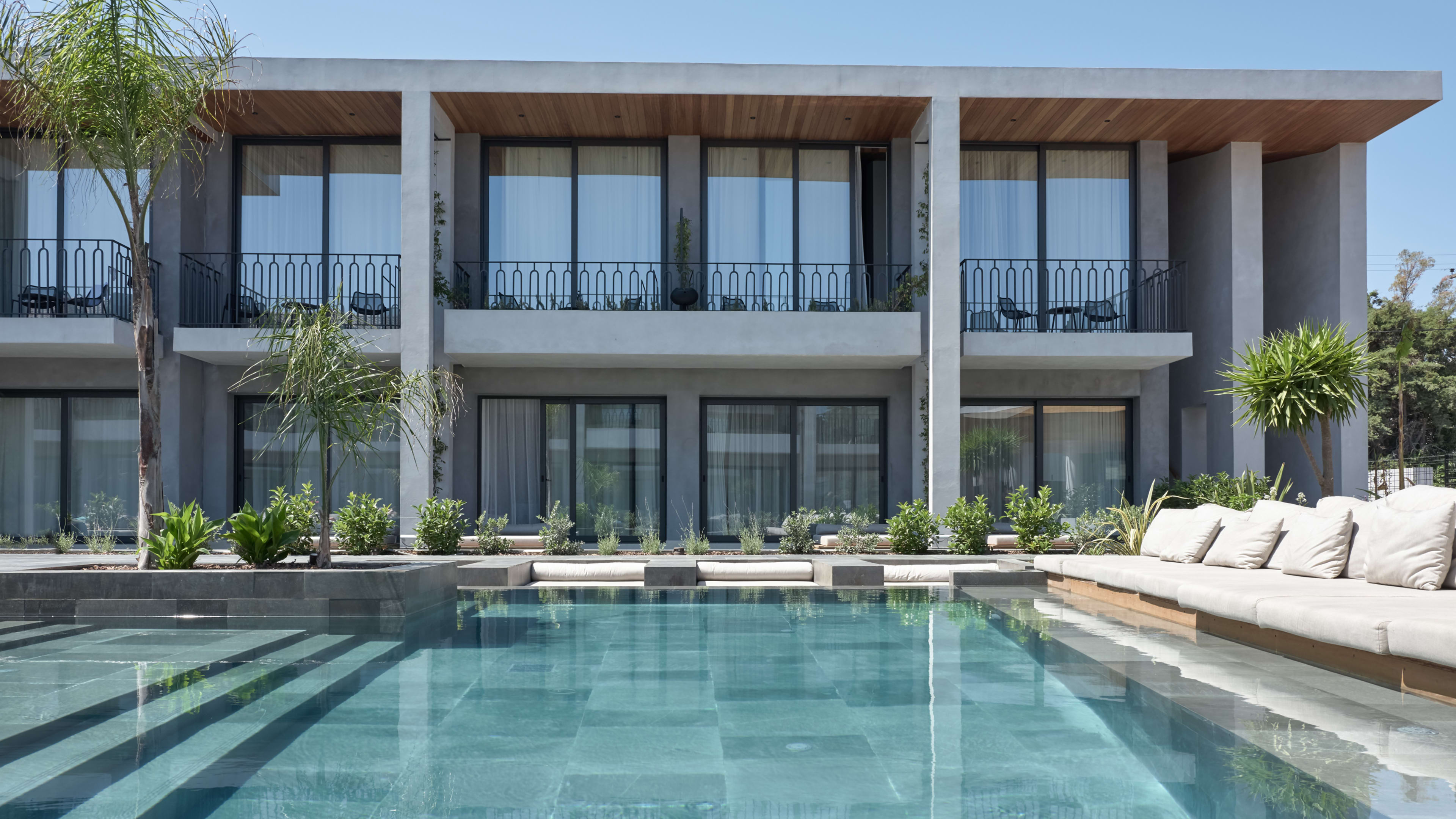There are three. The indoor spa pool (open 10am to 6pm) has a fantastical setting, a stone grotto with curvaceous walls, a freehand squiggle of a pool, Roman steps to perch on and swing chairs to rock yourself in. The main-event outdoor pool, in the hotel’s interior courtyard, is large enough for uninterrupted laps and is surrounded by oversized bean bags, day-beds sunk into the deck and shaded sunloungers, and there’s a second smaller pool with inlaid greenery next to it (both open from 8am to 8pm).